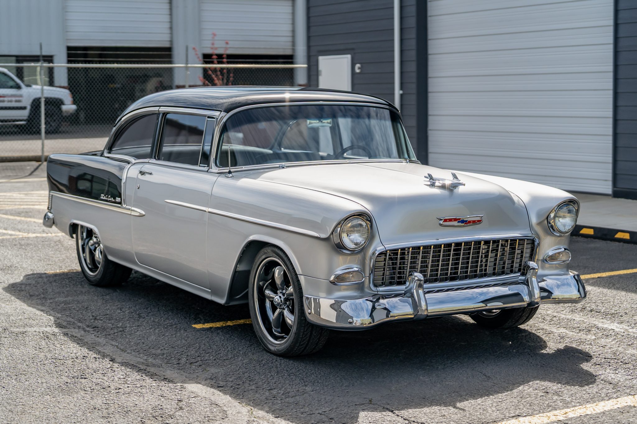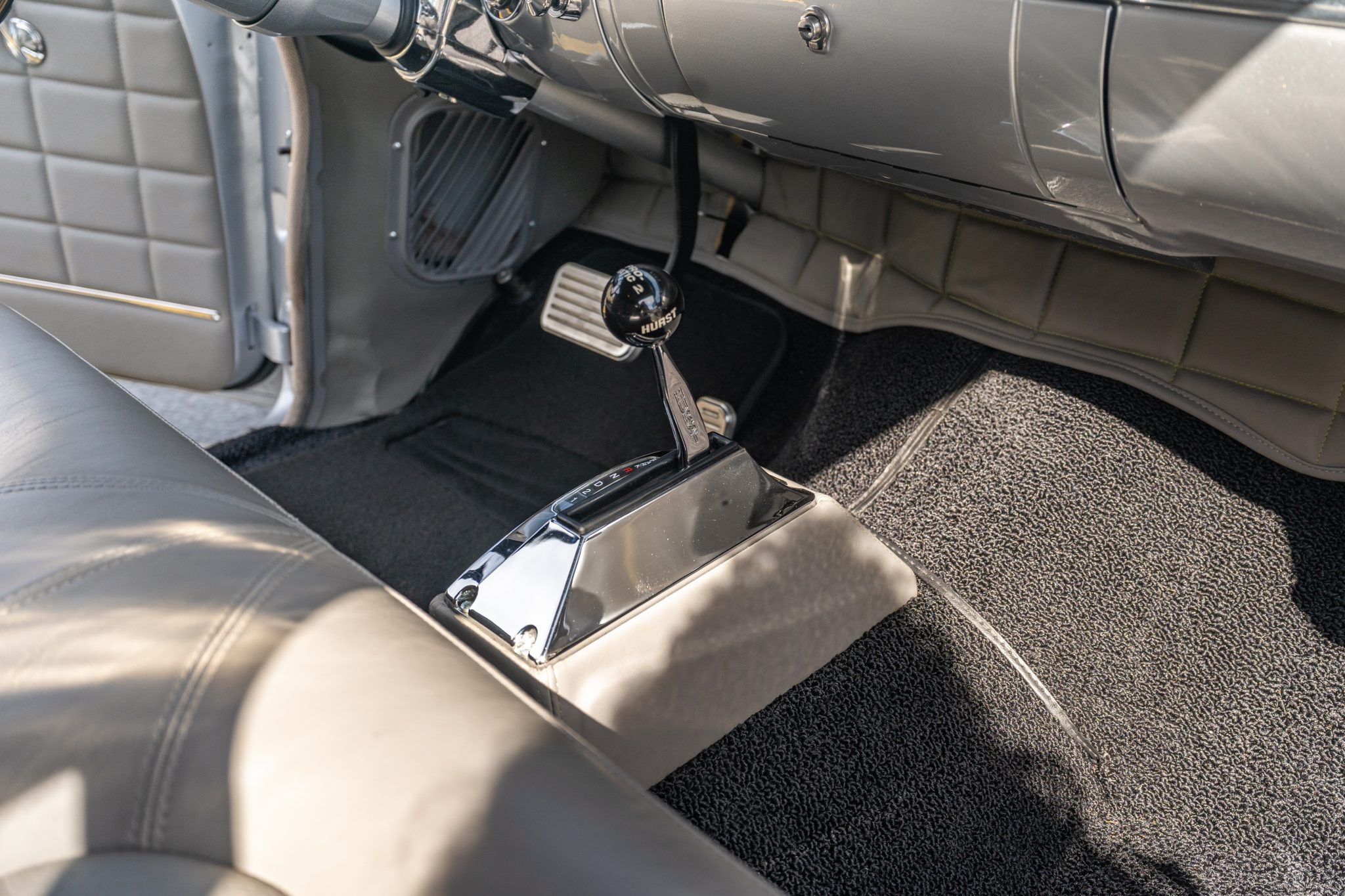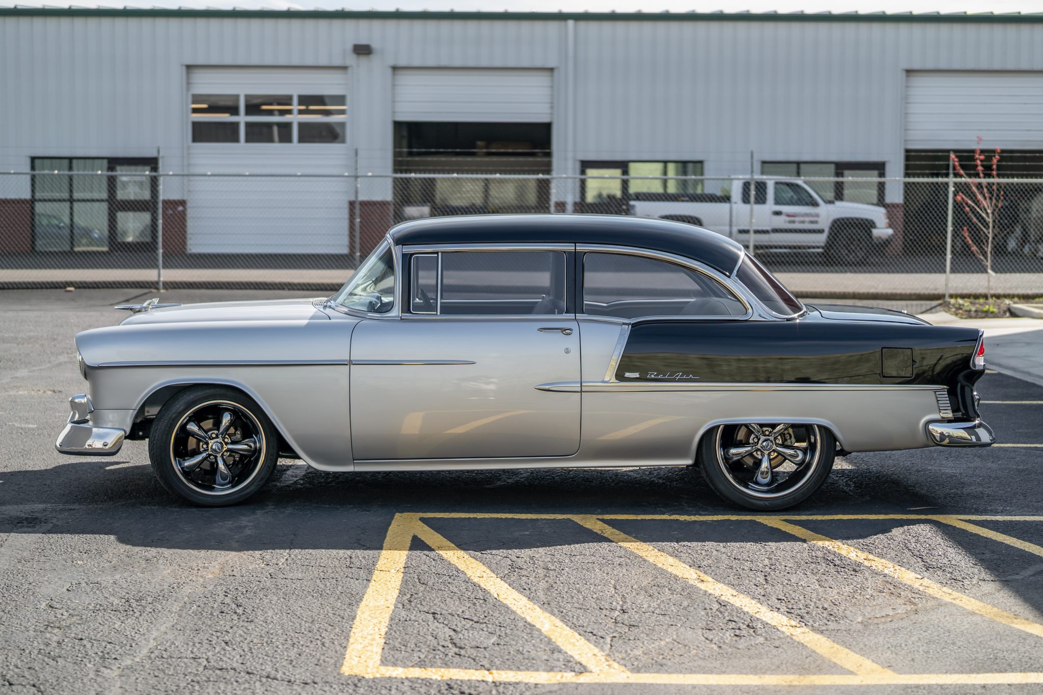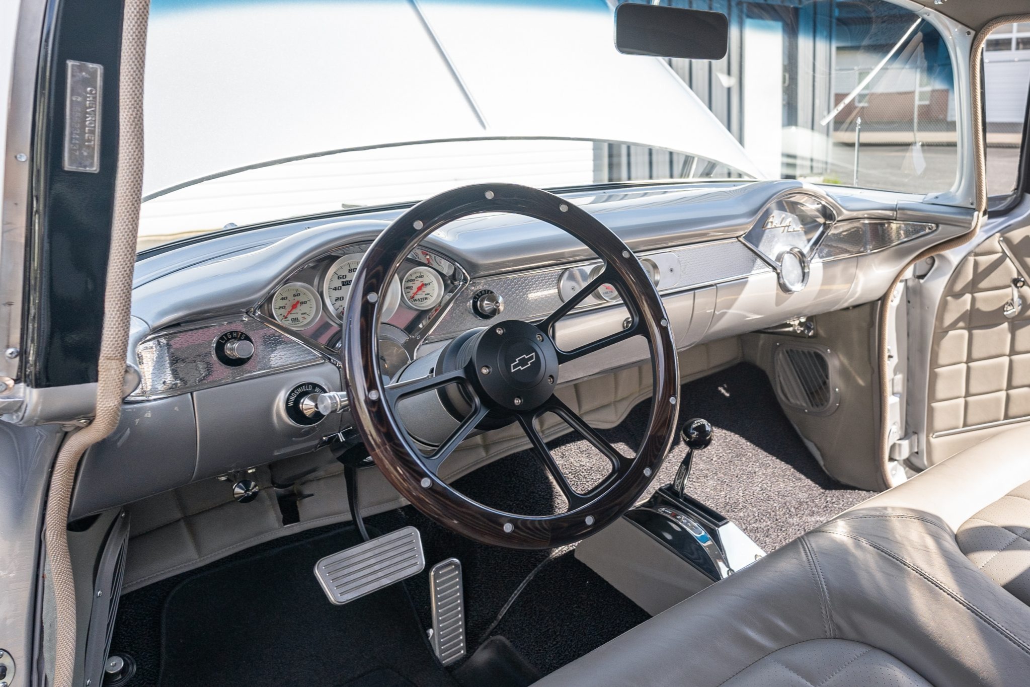 This 1955 Chevrolet Bel Air two-door sedan was the subject of a custom build in 2012 with work that included a repaint in black and gray as well as the installation of a 489ci stroker V8 and a TH400 three-speed automatic transmission. The suspension was overhauled and the ride height was lowered by 2″, and four-wheel disc brakes were fitted along with full-length exhaust headers, an Edelbrock intake manifold and cylinder heads, an aluminum radiator, an MSD distributor, and power steering. Inside, the bench seats have been re-upholstered in gray leather, and a Hurst floor shifter is installed along with a tilting steering column, an aftermarket steering wheel, and white aftermarket gauges.
