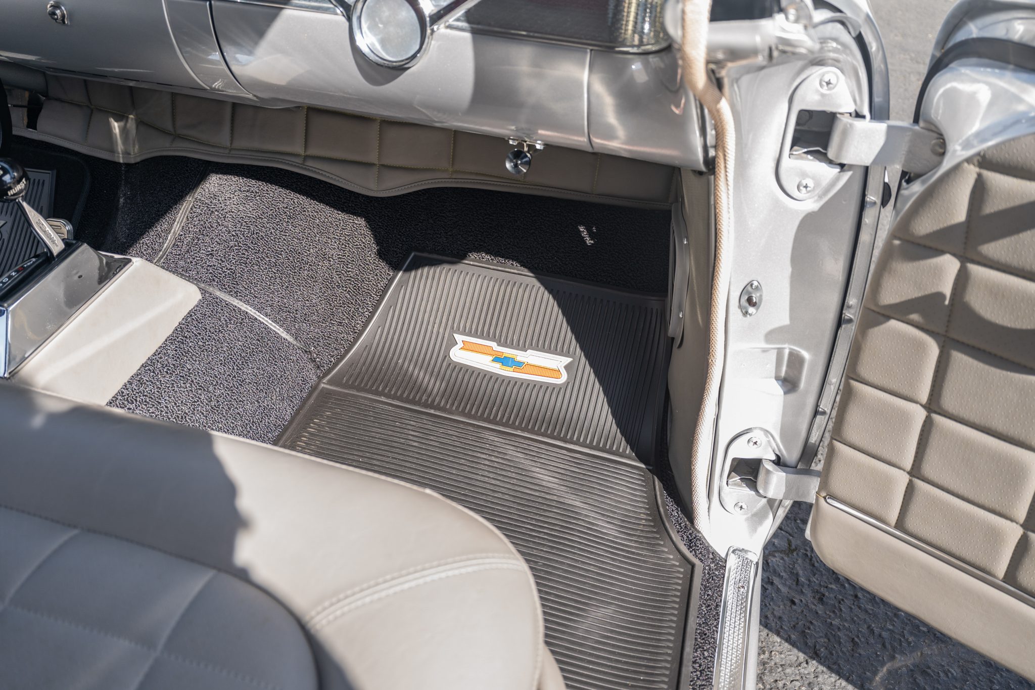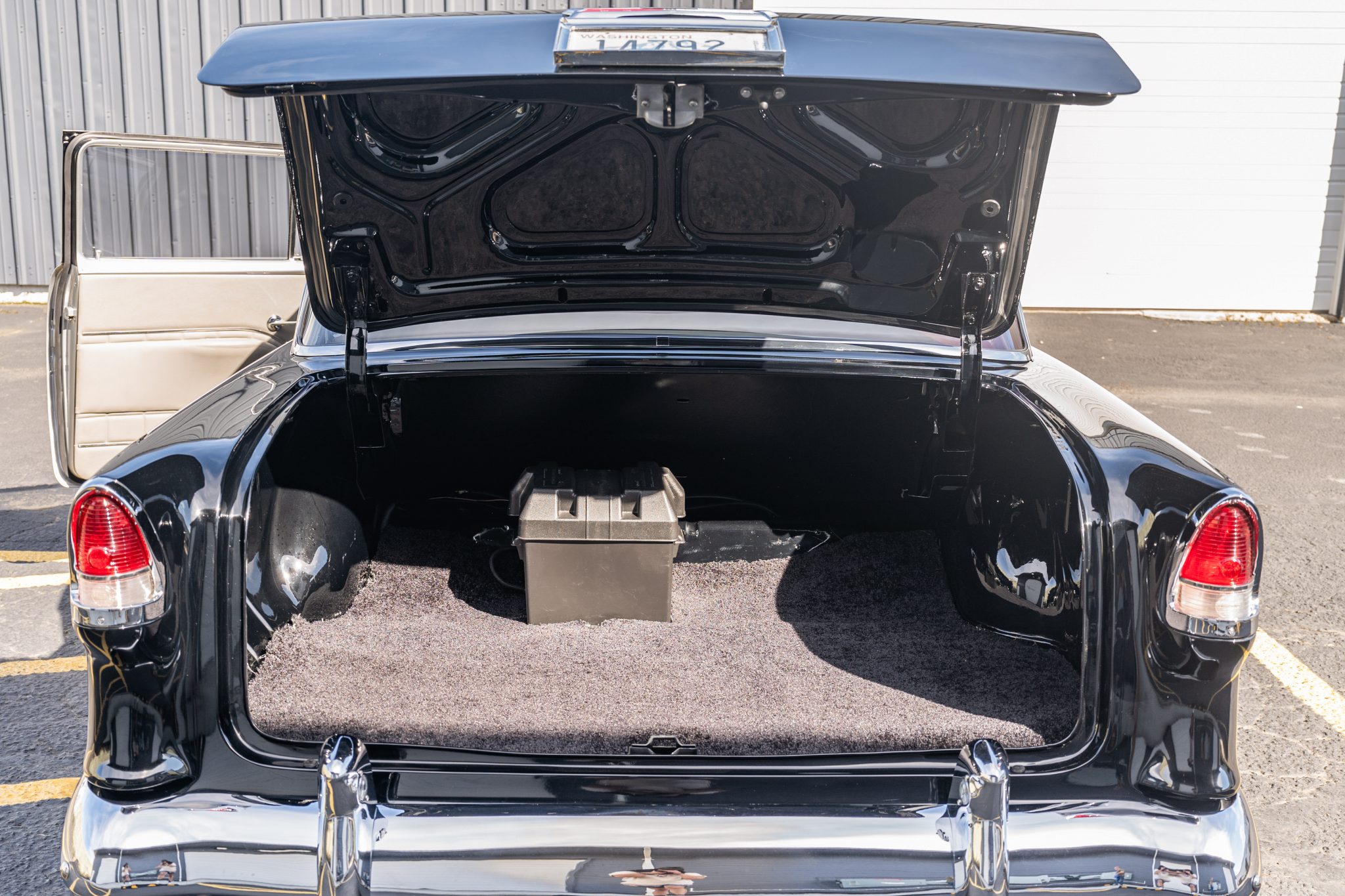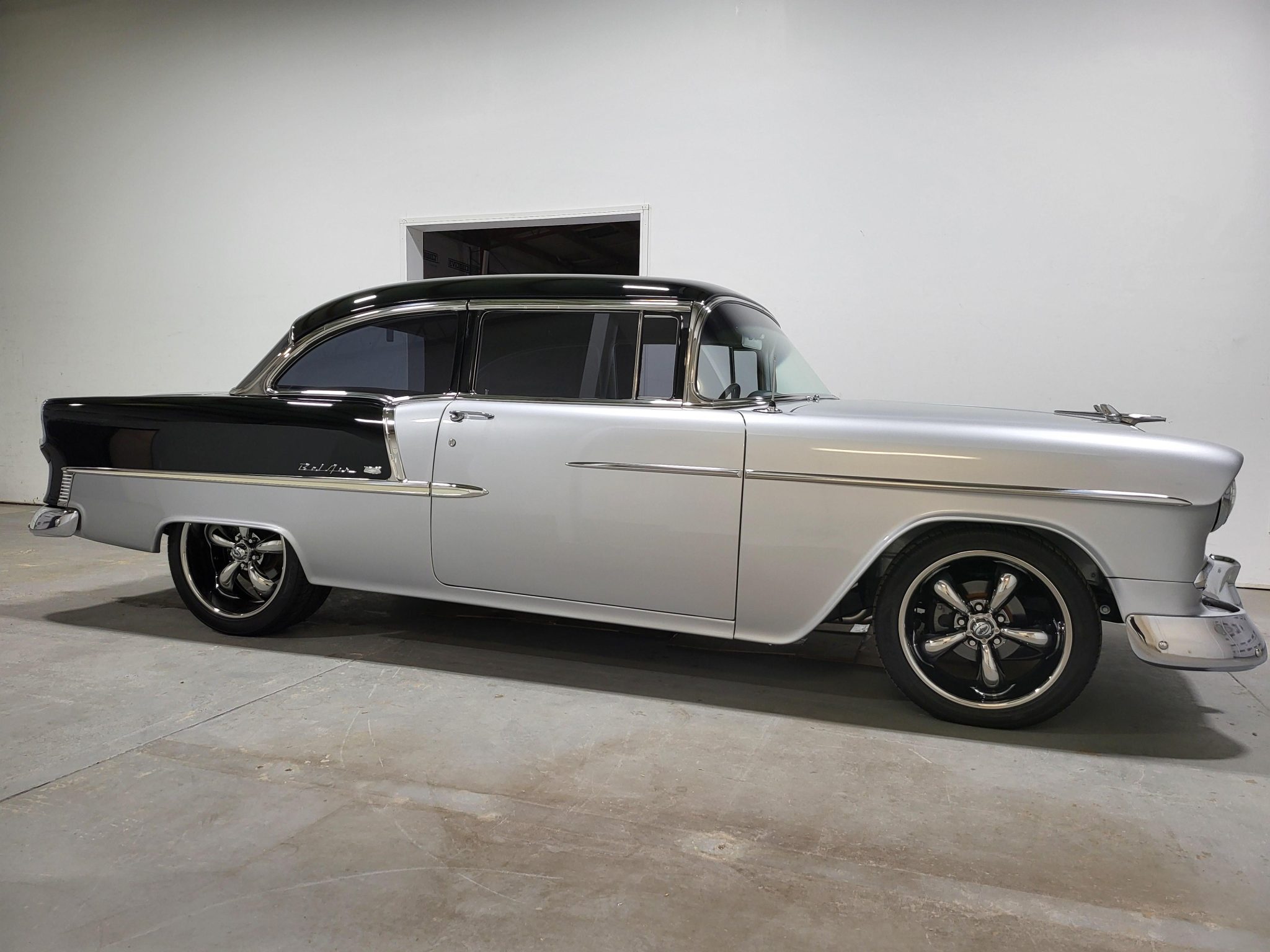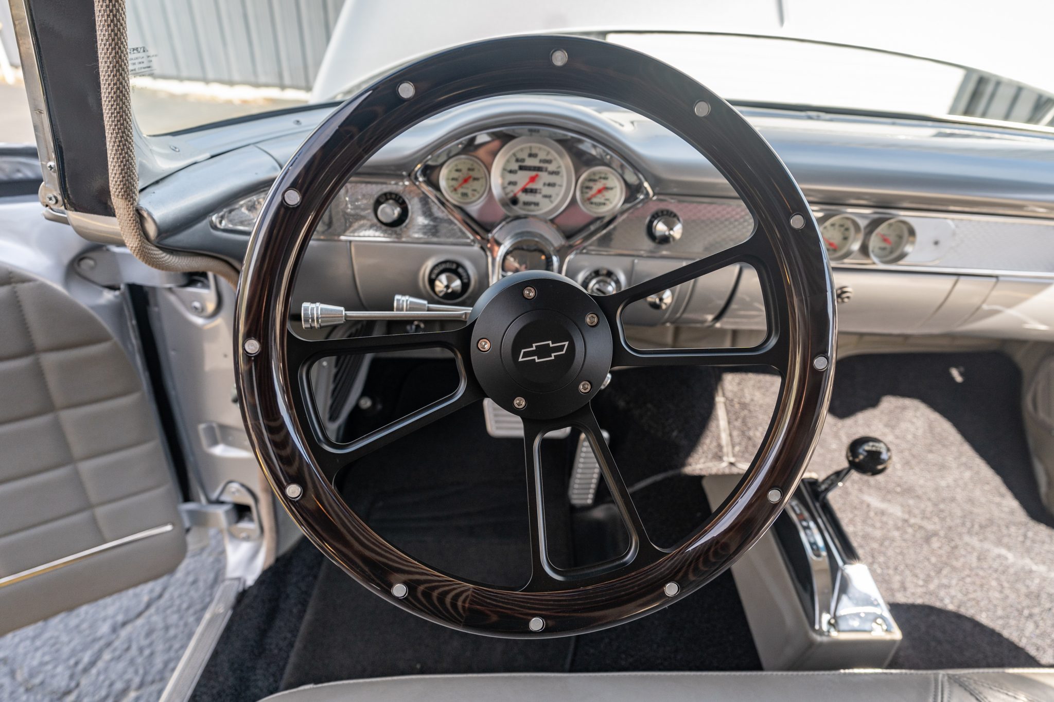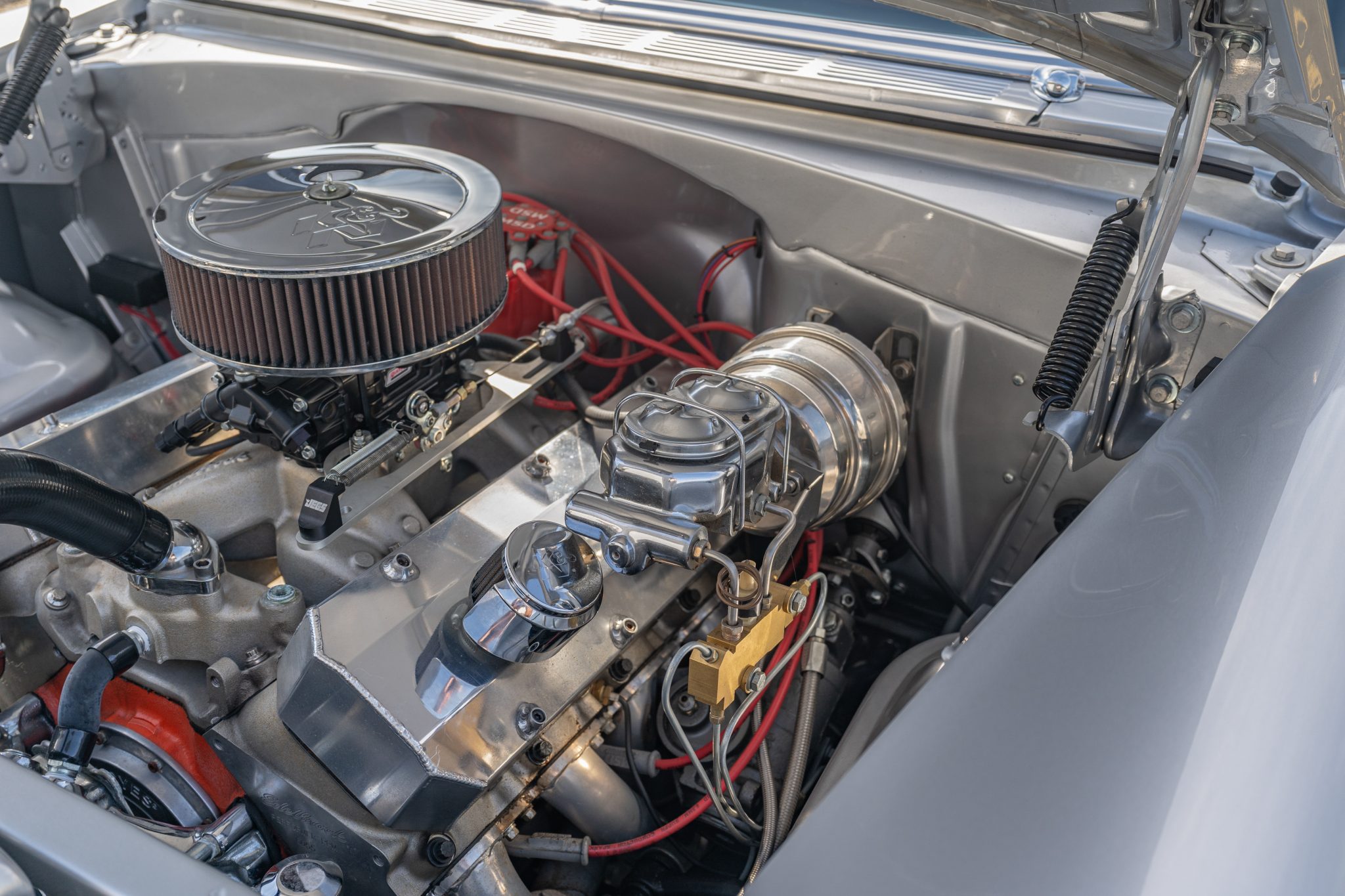 This 1955 Chevrolet Bel Air two-door sedan was the subject of a custom build in 2012 with work that included a repaint in black and gray as well as the installation of a 489ci stroker V8 and a TH400 three-speed automatic transmission. The suspension was overhauled and the ride height was lowered by 2″, and four-wheel disc brakes were fitted along with full-length exhaust headers, an Edelbrock intake manifold and cylinder heads, an aluminum radiator, an MSD distributor, and power steering. Inside, the bench seats have been re-upholstered in gray leather, and a Hurst floor shifter is installed along with a tilting steering column, an aftermarket steering wheel, and white aftermarket gauges.