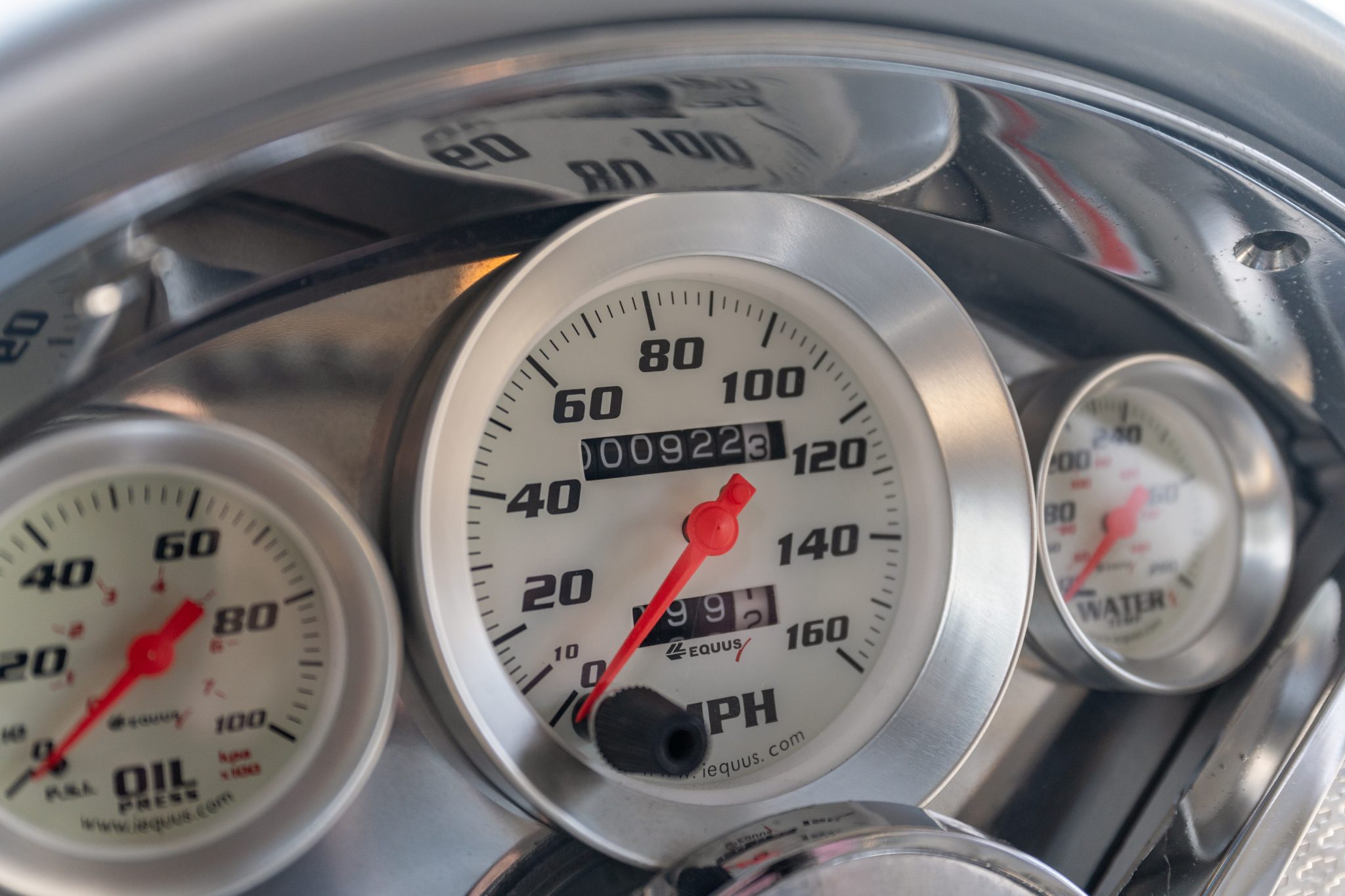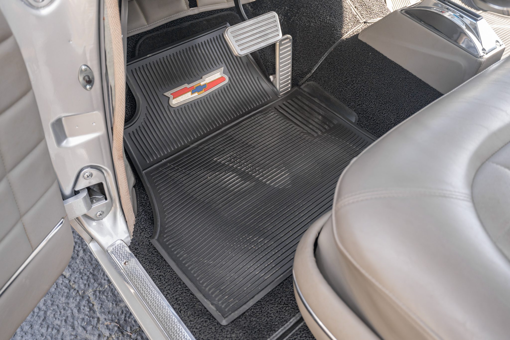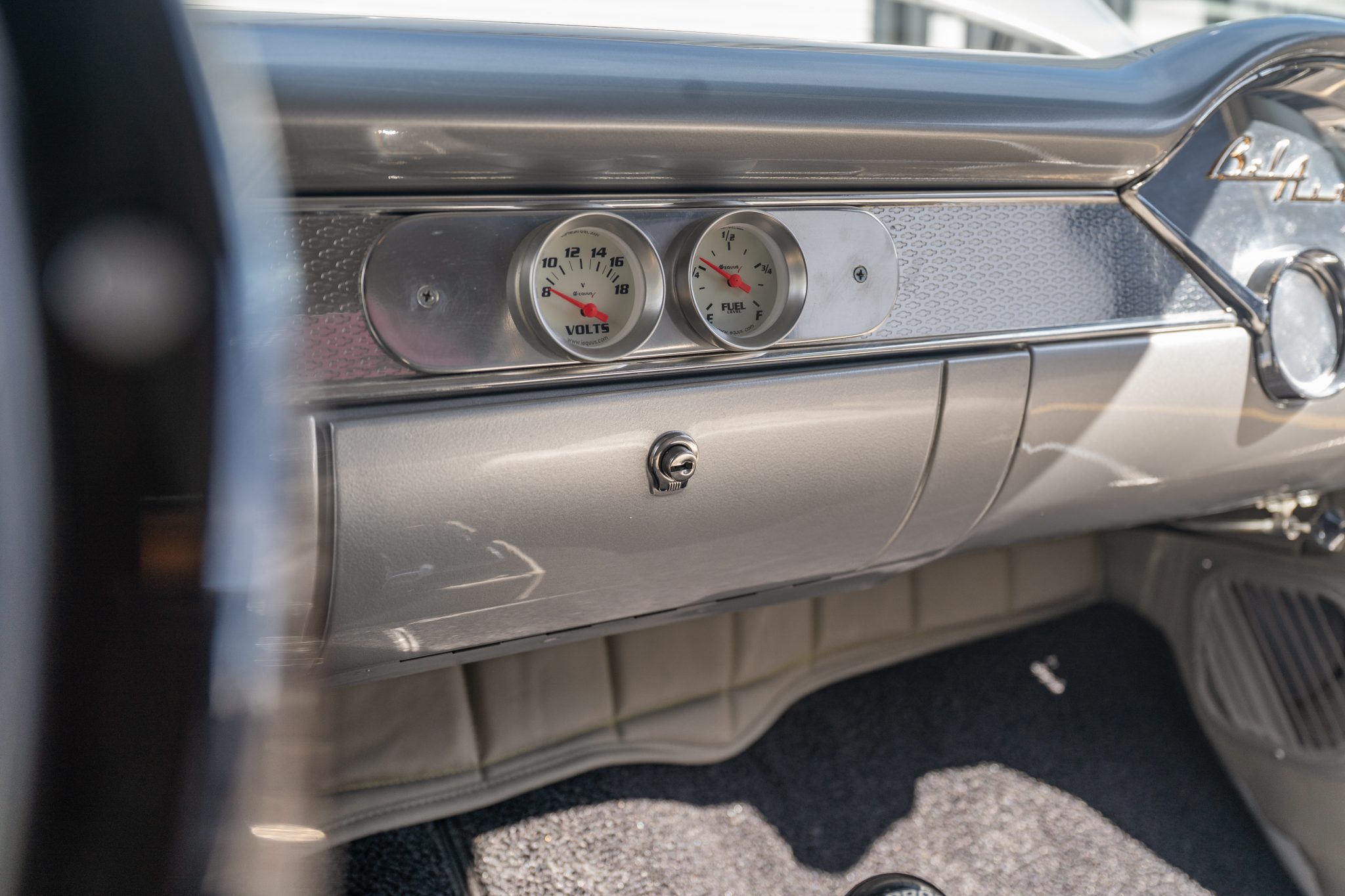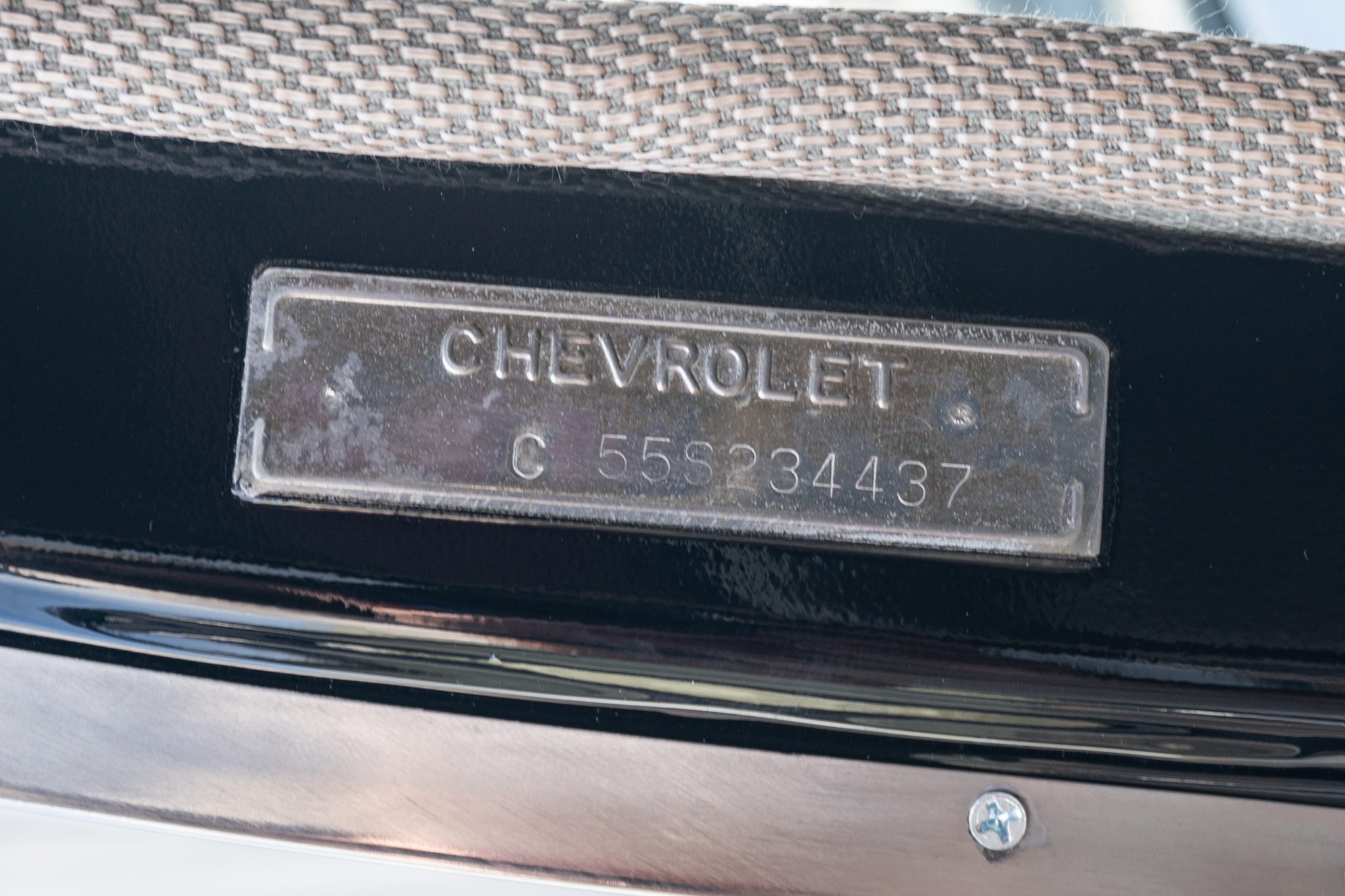 This 1955 Chevrolet Bel Air two-door sedan was the subject of a custom build in 2012 with work that included a repaint in black and gray as well as the installation of a 489ci stroker V8 and a TH400 three-speed automatic transmission. The suspension was overhauled and the ride height was lowered by 2″, and four-wheel disc brakes were fitted along with full-length exhaust headers, an Edelbrock intake manifold and cylinder heads, an aluminum radiator, an MSD distributor, and power steering. Inside, the bench seats have been re-upholstered in gray leather, and a Hurst floor shifter is installed along with a tilting steering column, an aftermarket steering wheel, and white aftermarket gauges.
