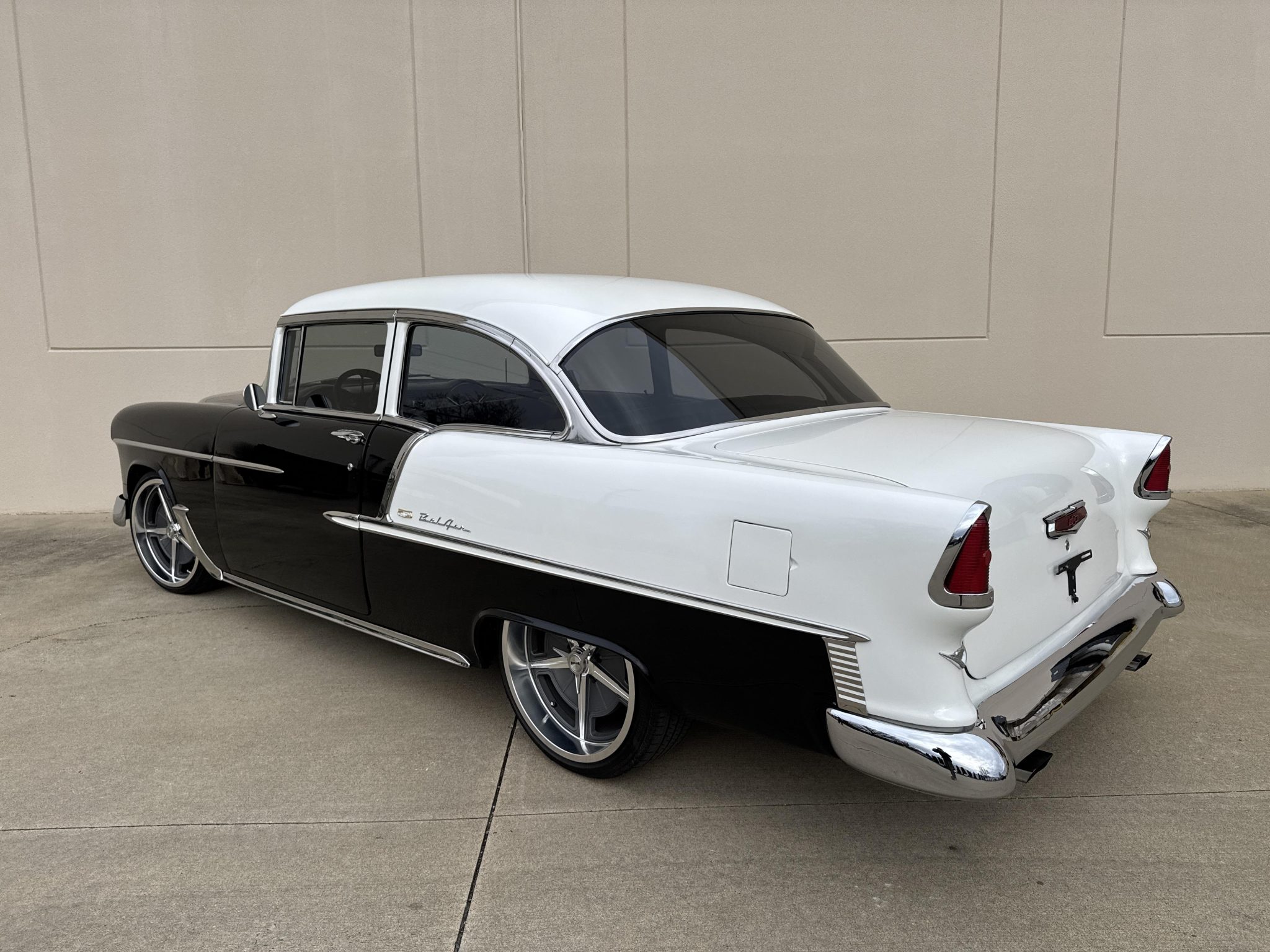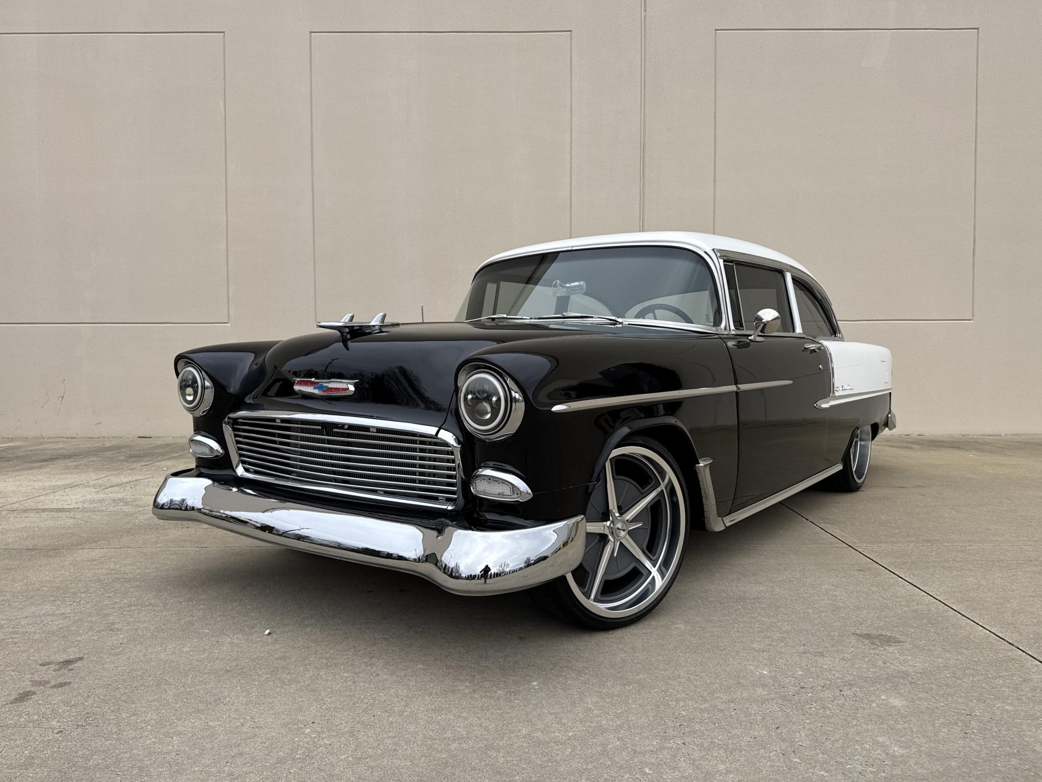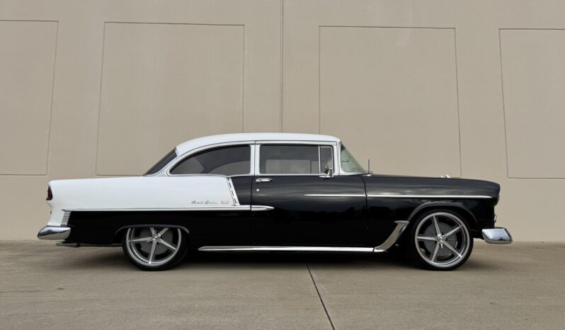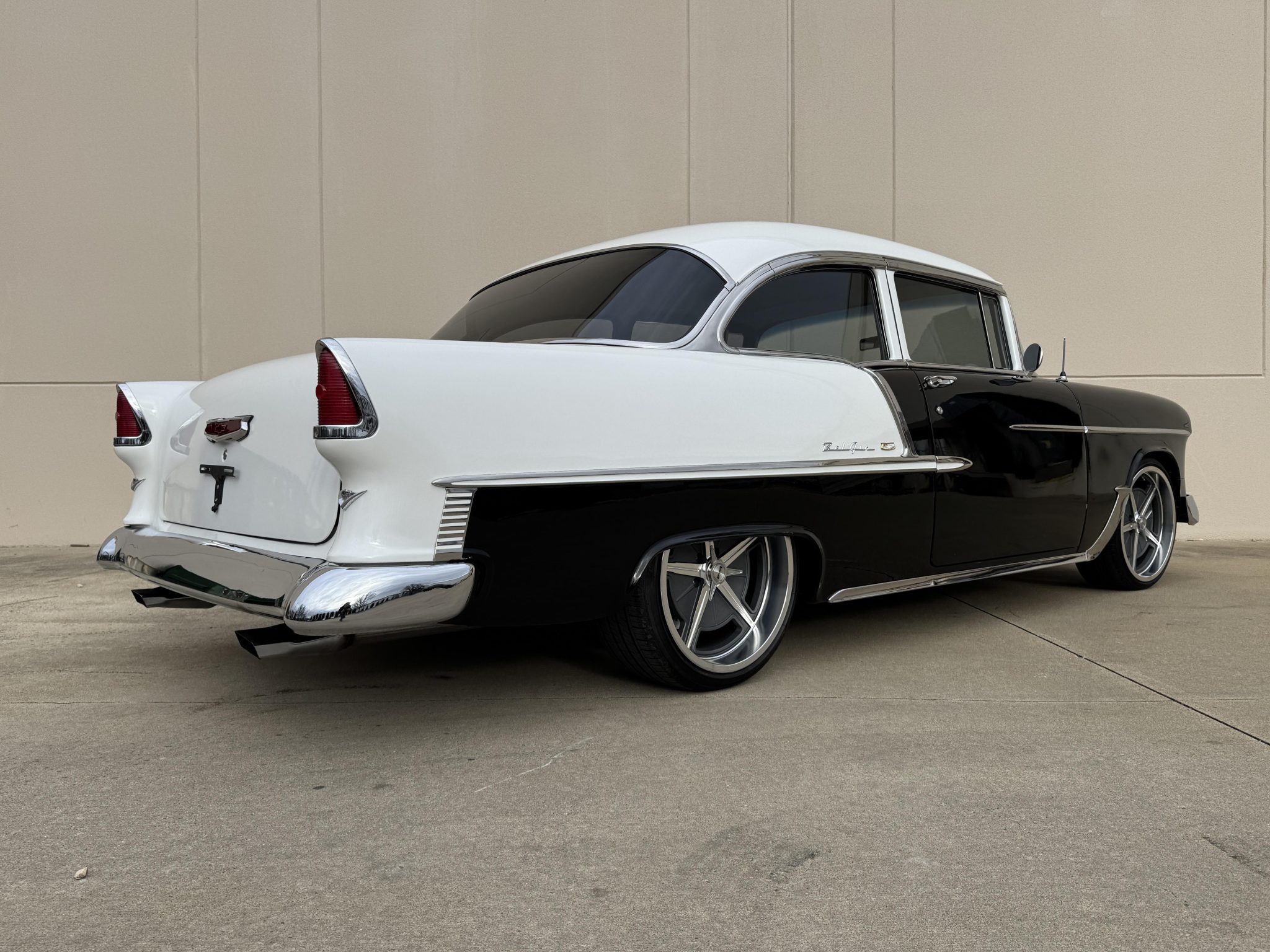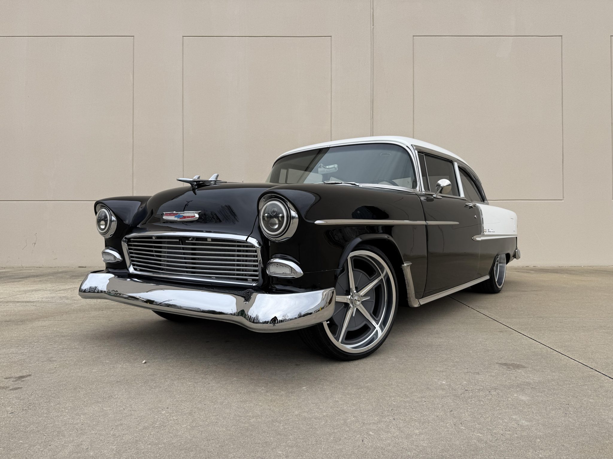 This 1955 Chevrolet Bel Air two-door sedan is powered by a Magnuson-supercharged 6.2-liter LS3 V8 linked to a Tremec six-speed manual transmission and a Dana 60 rear axle, and it is finished in white and black over black leather upholstery. The car was modified under previous ownership with an alcohol injection system, Ridetech four-link rear suspension, front and rear adjustable coilovers, tubular front control arms, and power steering as well as Wilwood four-wheel disc brakes, 20″ Ridler wheels, LED lighting, air conditioning, power windows, a Hurst shifter, Dakota Digital instrumentation, and a custom audio system.