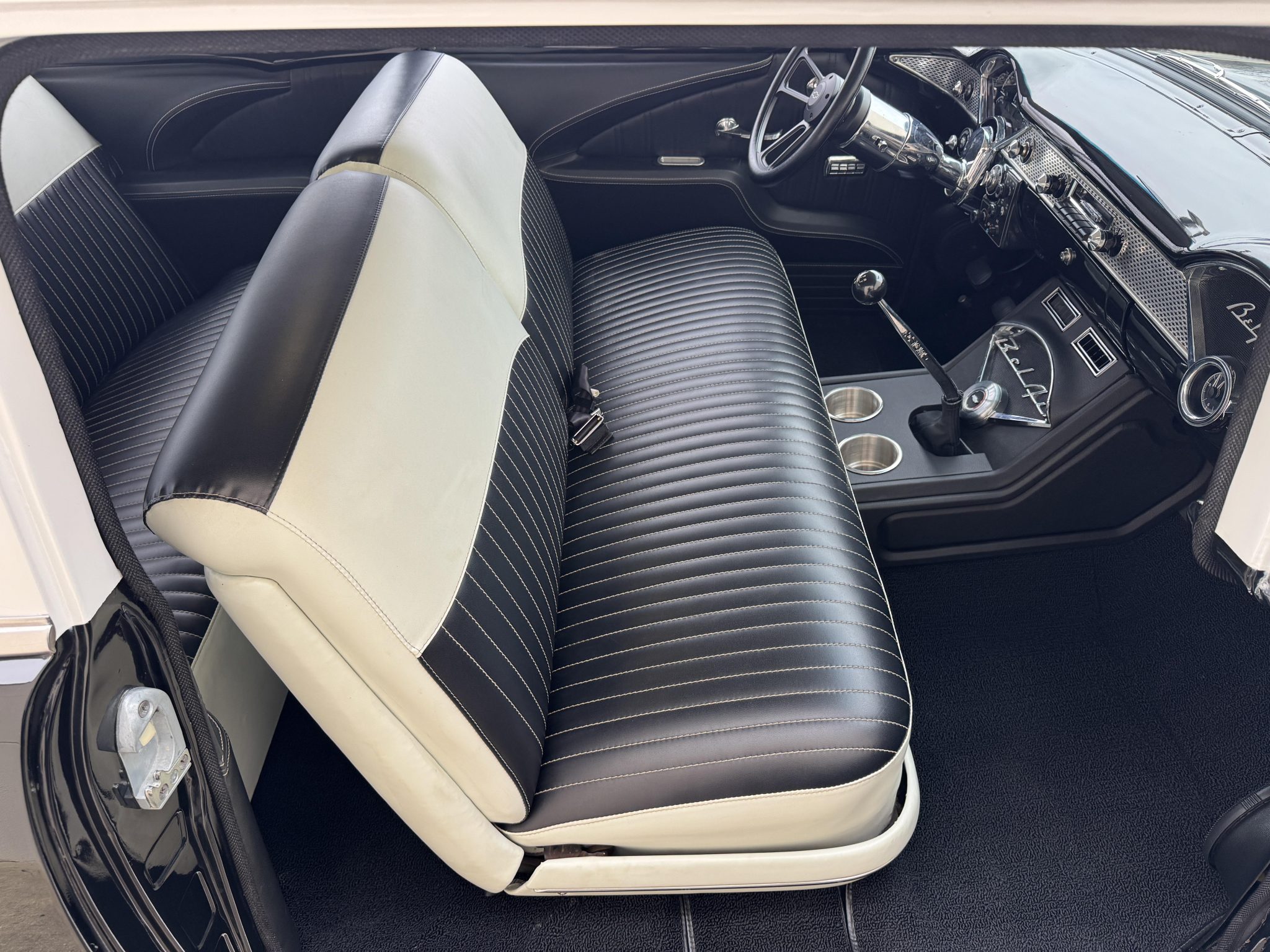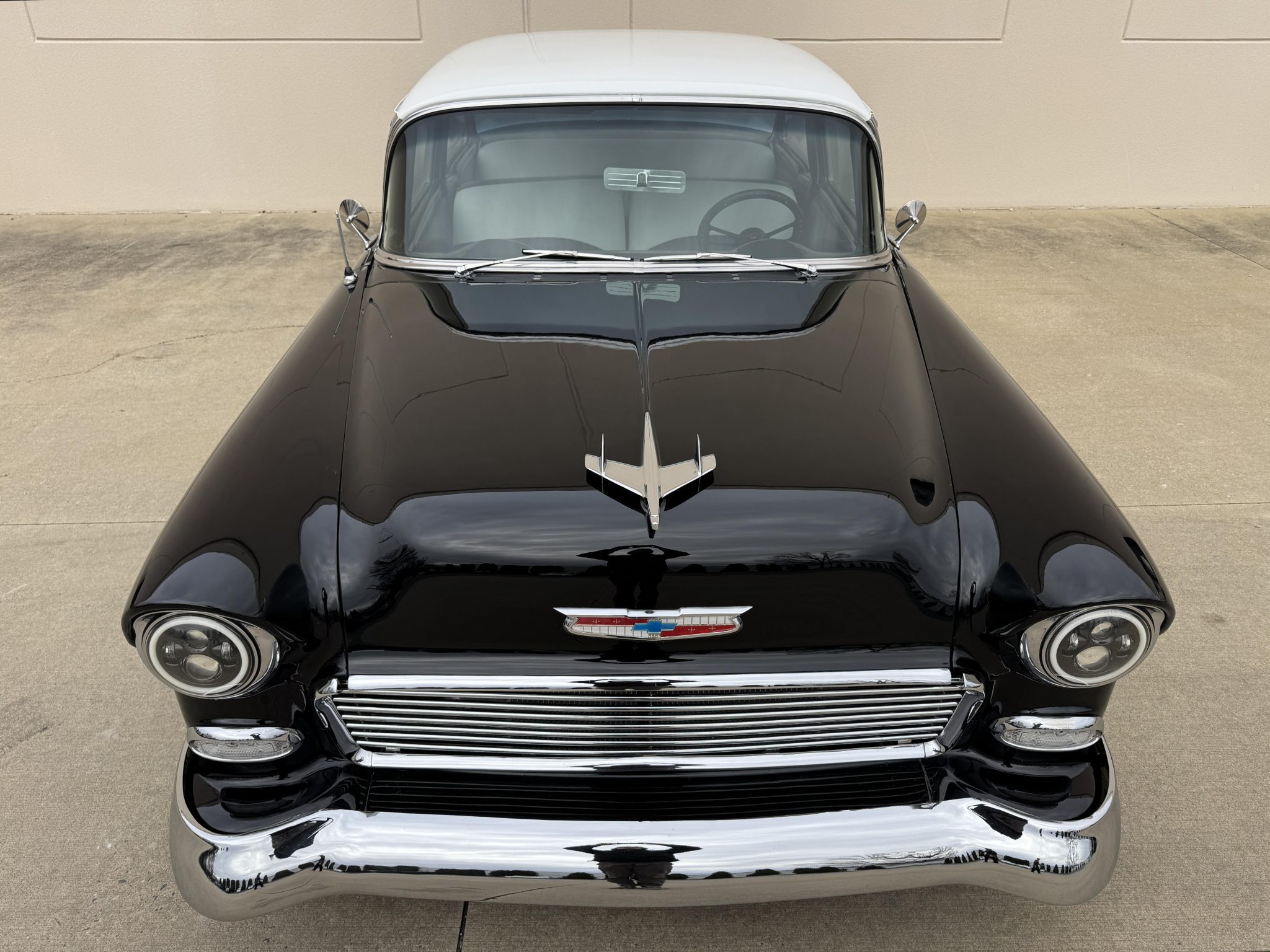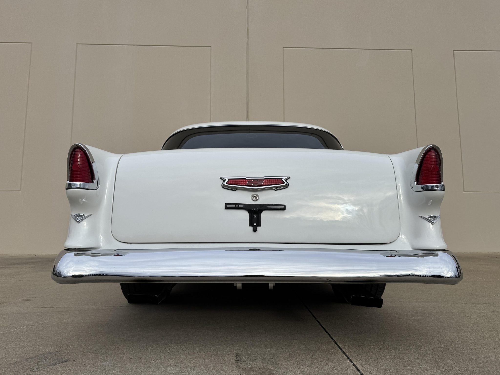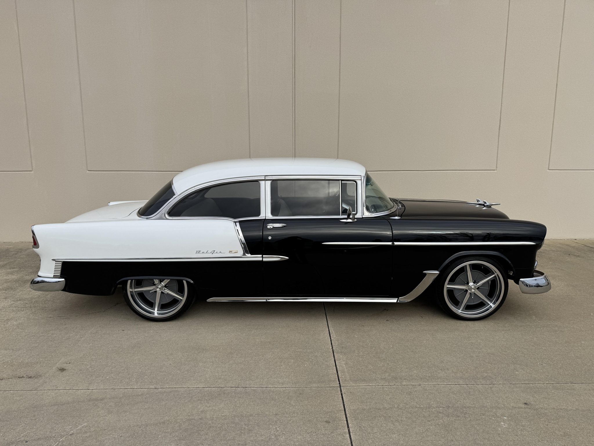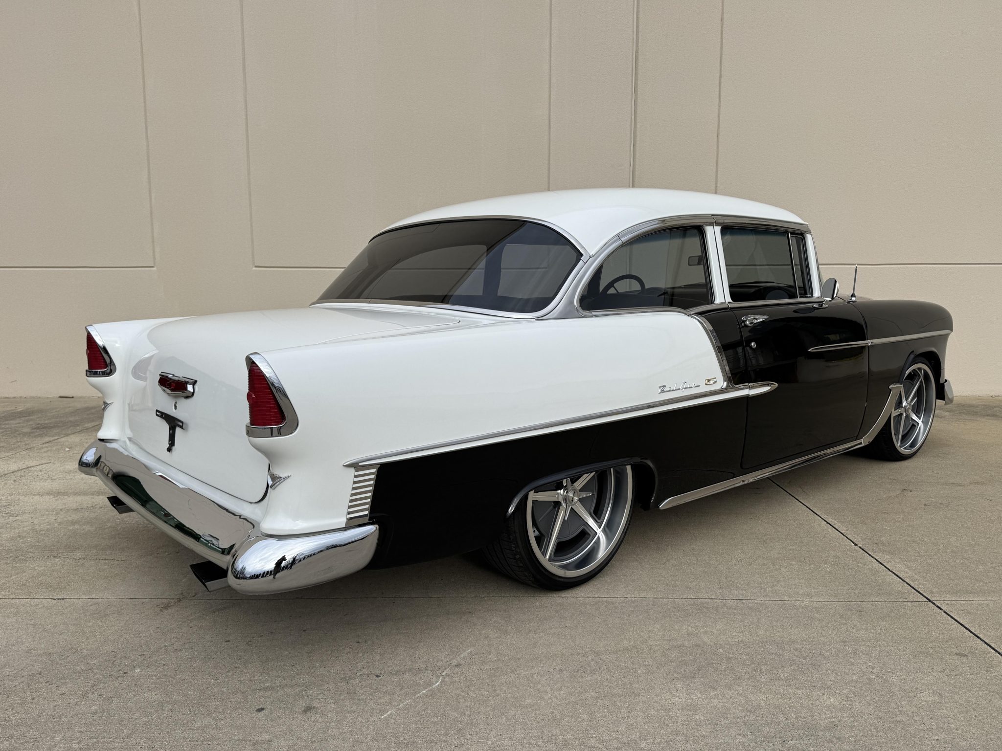 This 1955 Chevrolet Bel Air two-door sedan is powered by a Magnuson-supercharged 6.2-liter LS3 V8 linked to a Tremec six-speed manual transmission and a Dana 60 rear axle, and it is finished in white and black over black leather upholstery. The car was modified under previous ownership with an alcohol injection system, Ridetech four-link rear suspension, front and rear adjustable coilovers, tubular front control arms, and power steering as well as Wilwood four-wheel disc brakes, 20″ Ridler wheels, LED lighting, air conditioning, power windows, a Hurst shifter, Dakota Digital instrumentation, and a custom audio system.