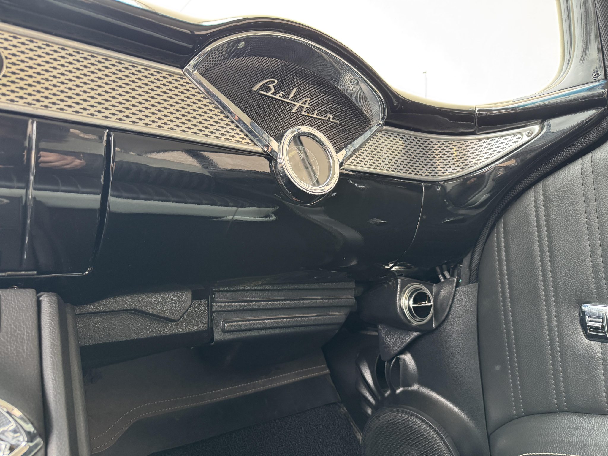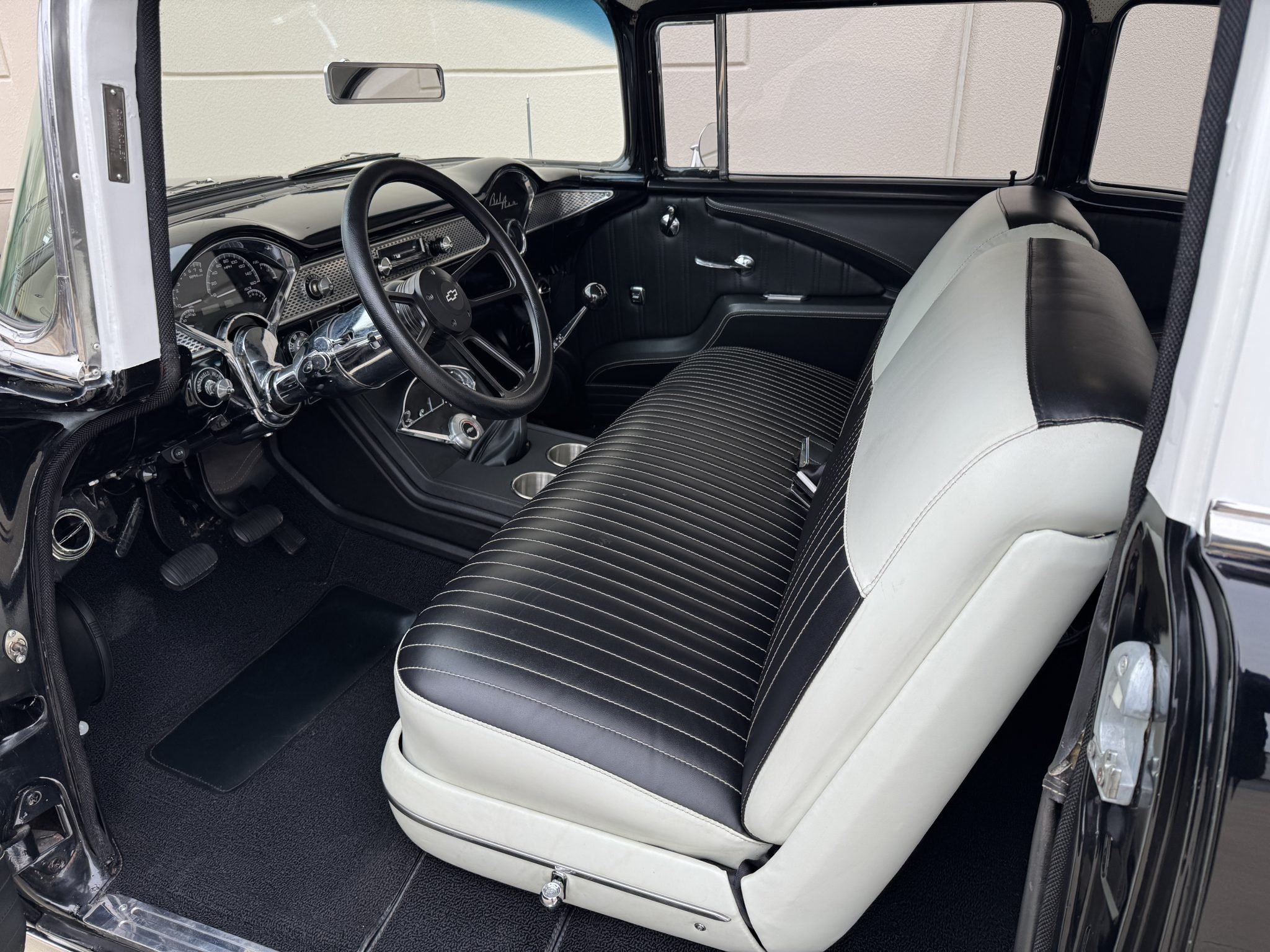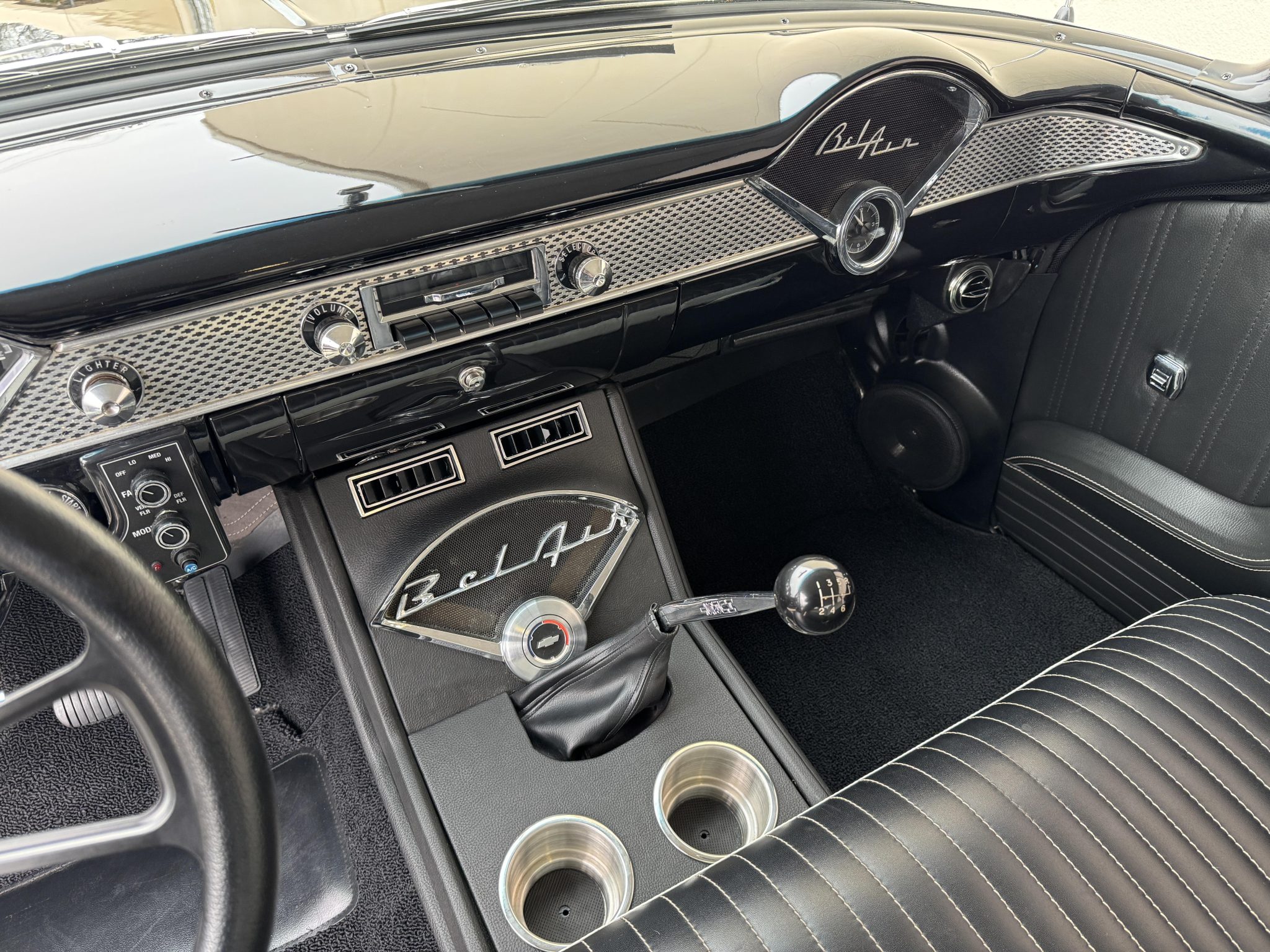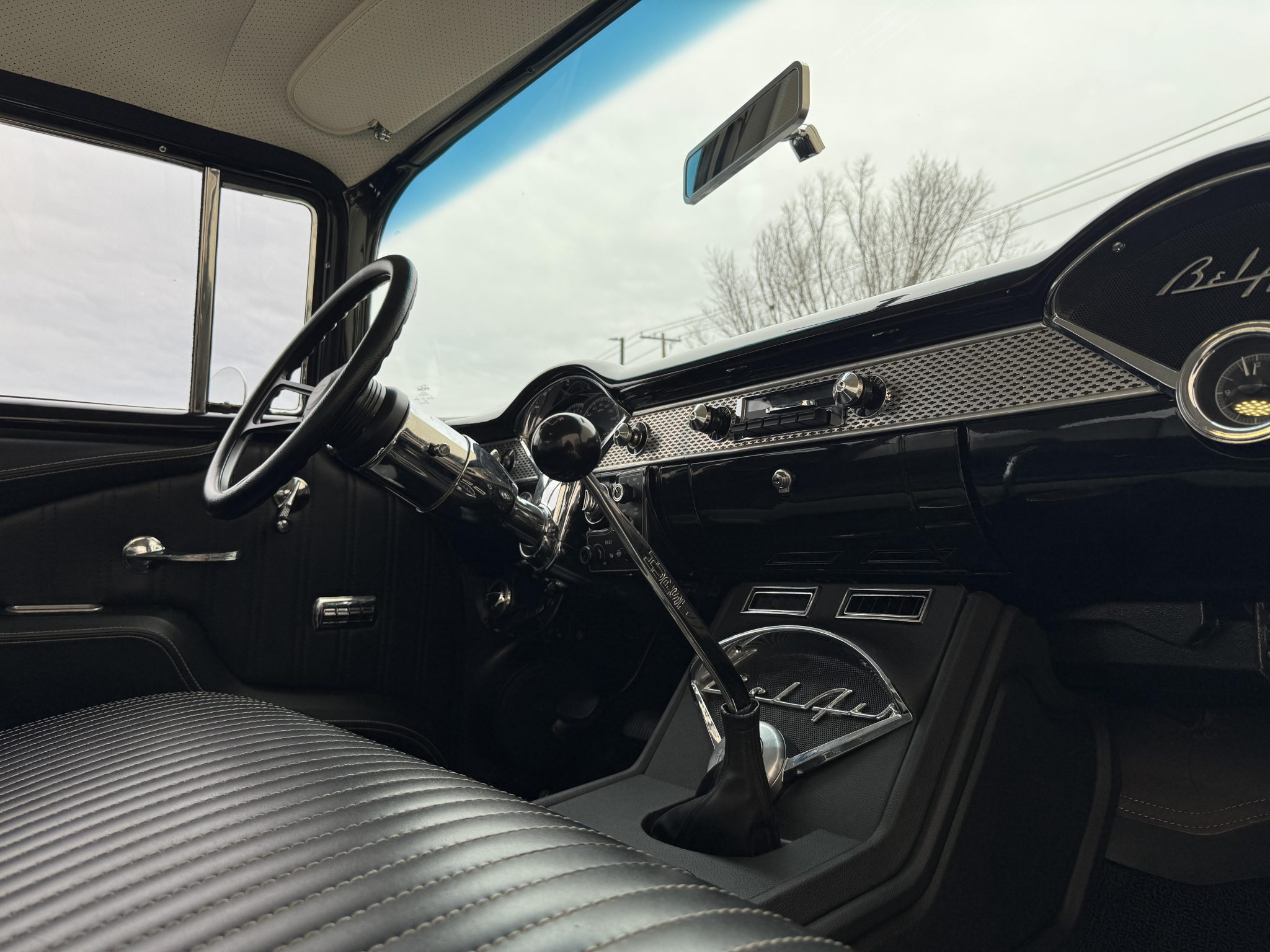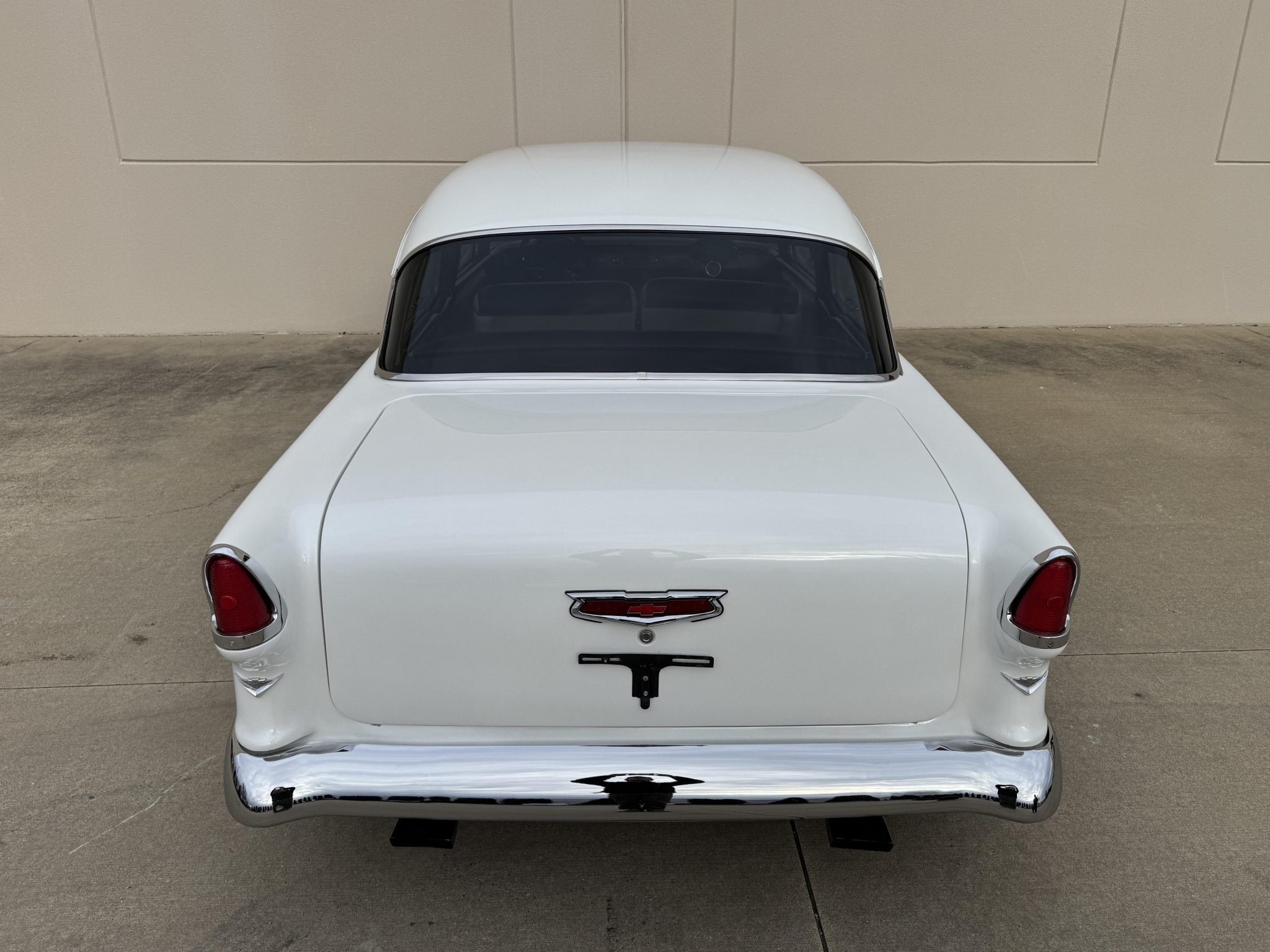 This 1955 Chevrolet Bel Air two-door sedan is powered by a Magnuson-supercharged 6.2-liter LS3 V8 linked to a Tremec six-speed manual transmission and a Dana 60 rear axle, and it is finished in white and black over black leather upholstery. The car was modified under previous ownership with an alcohol injection system, Ridetech four-link rear suspension, front and rear adjustable coilovers, tubular front control arms, and power steering as well as Wilwood four-wheel disc brakes, 20″ Ridler wheels, LED lighting, air conditioning, power windows, a Hurst shifter, Dakota Digital instrumentation, and a custom audio system.