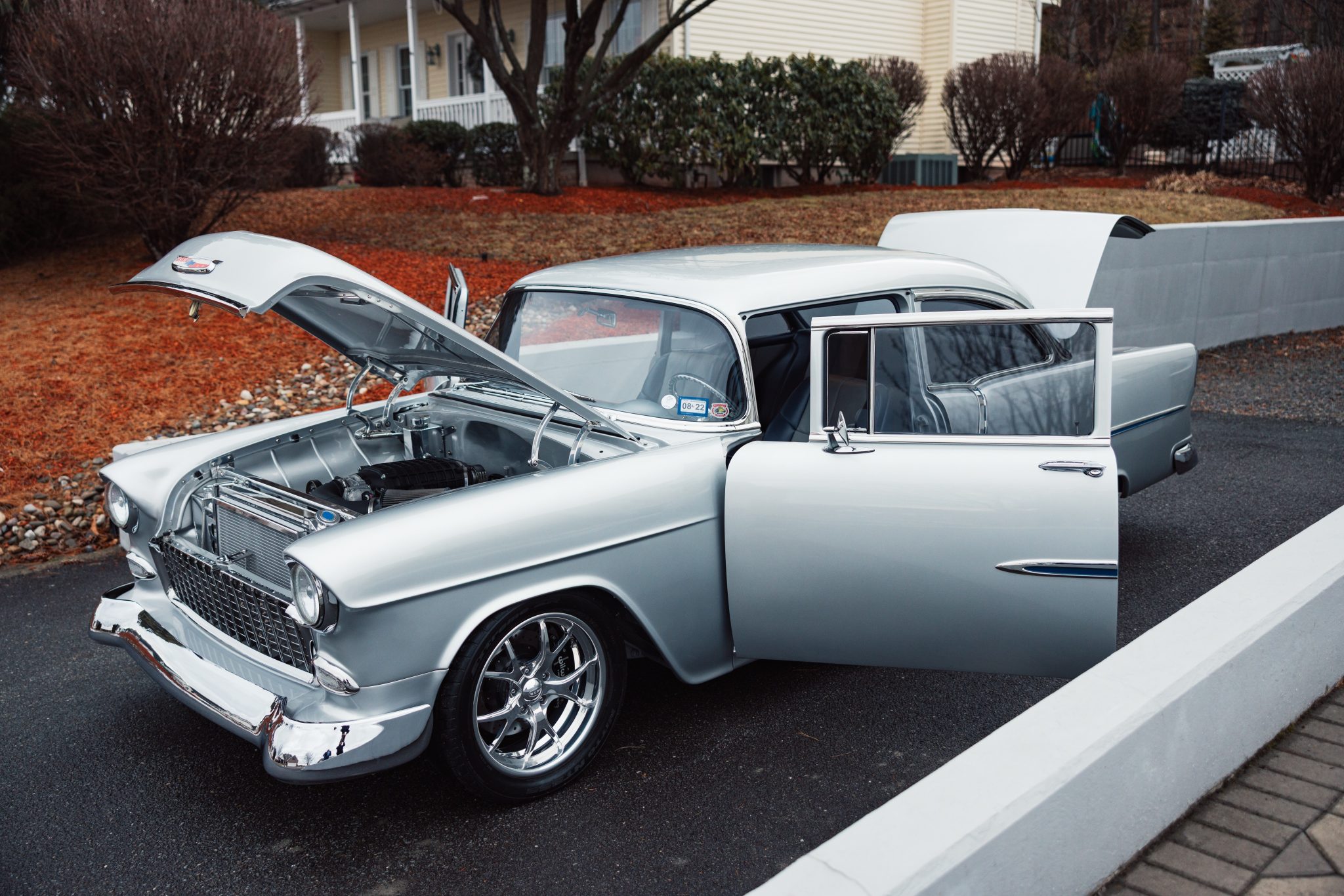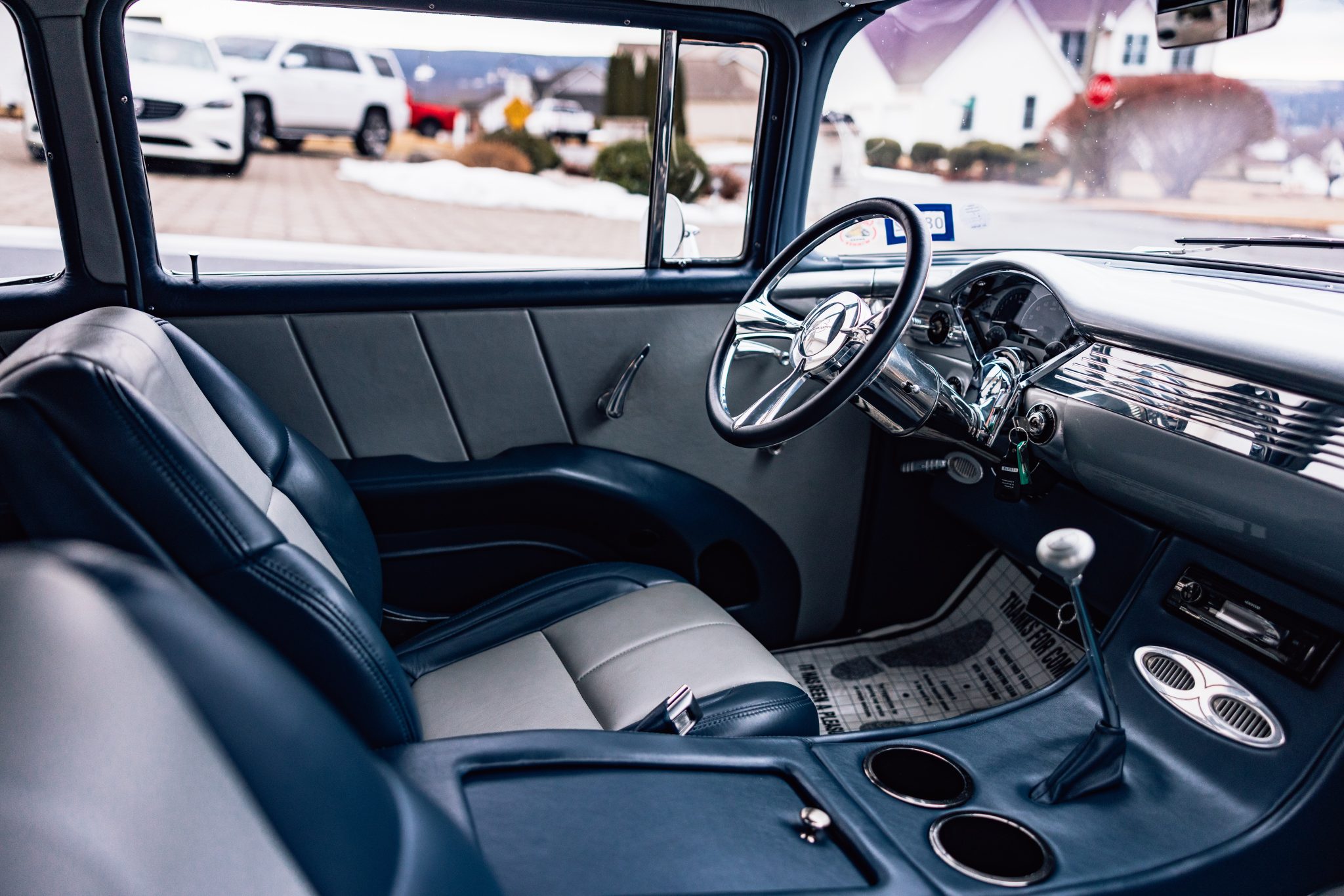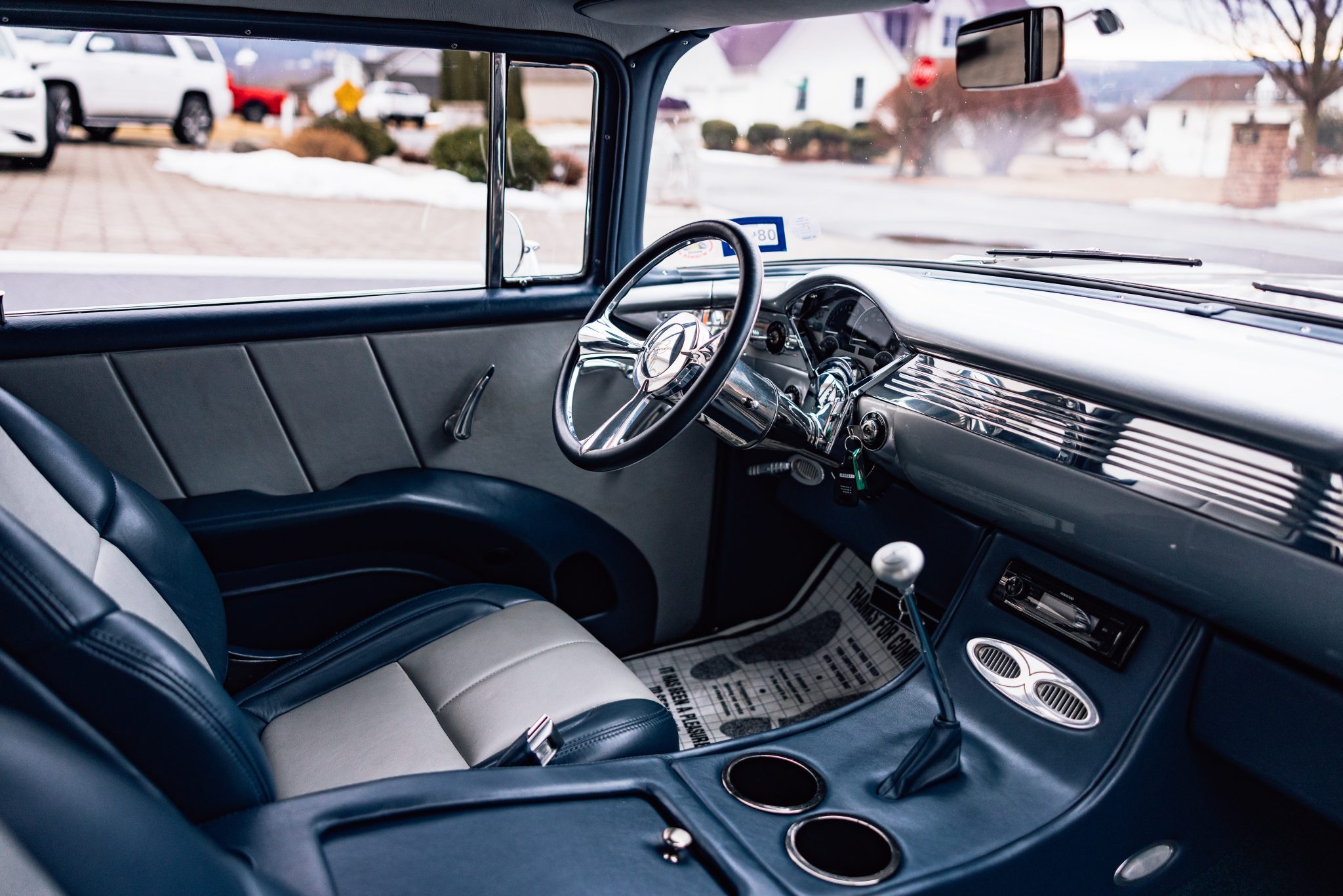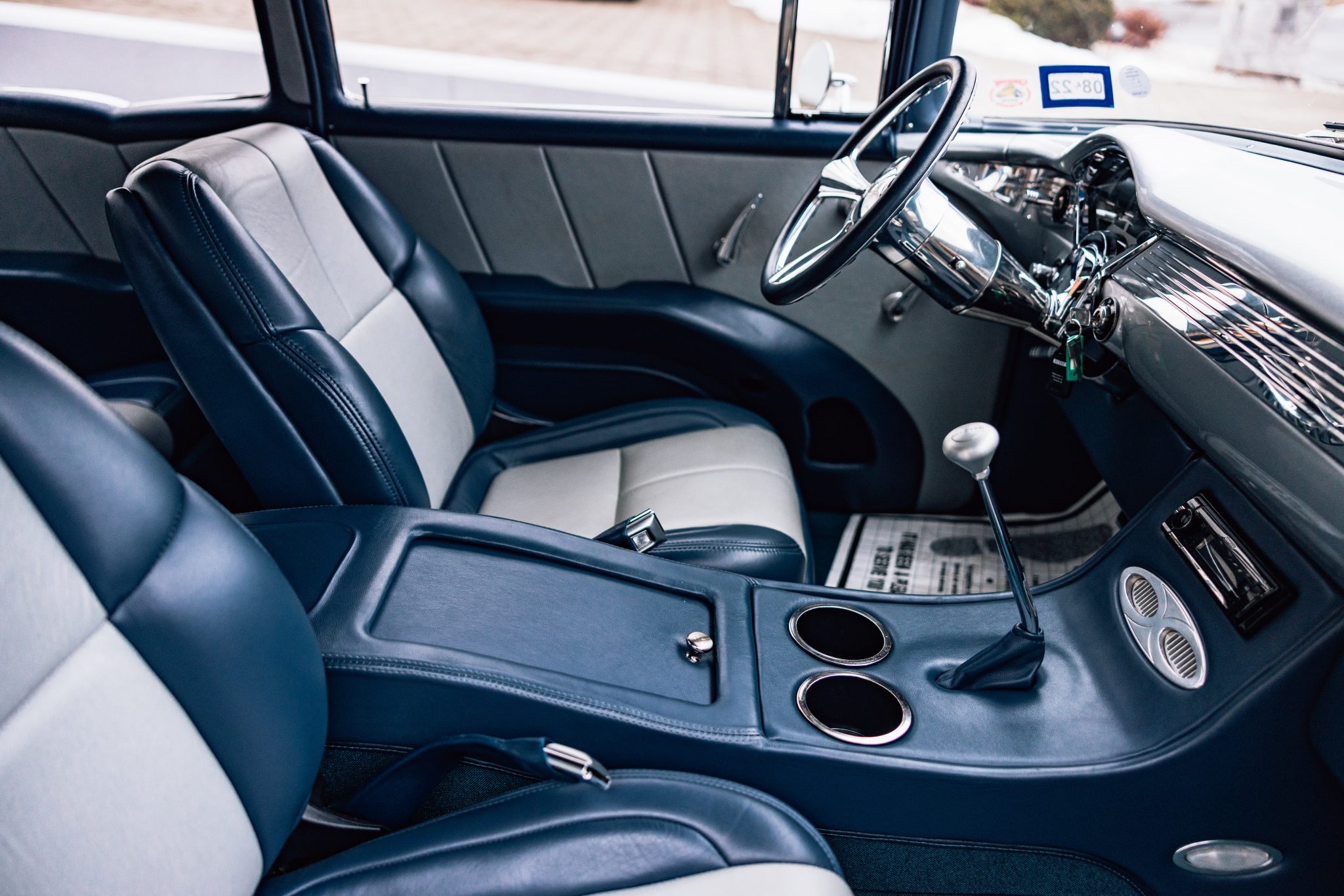 A Magnuson-supercharged 6.2-liter LS3 V8 was installed along with a four-speed automatic transmission and a 9″ rear end, and the body was refinished in silver. The chassis was modified with tubular front control arms, a rear four-link setup, adjustable coilovers, rack-and-pinion steering, and Wilwood disc brakes as well as Boze Alloys 18″ wheels. Inside, power-assisted bucket seats are trimmed in blue and gray leather and accompanied by a custom-fabricated center console and door panels, a Kenwood stereo, aftermarket air conditioning, a Billet Specialties steering wheel, and Dakota Digital gauges.