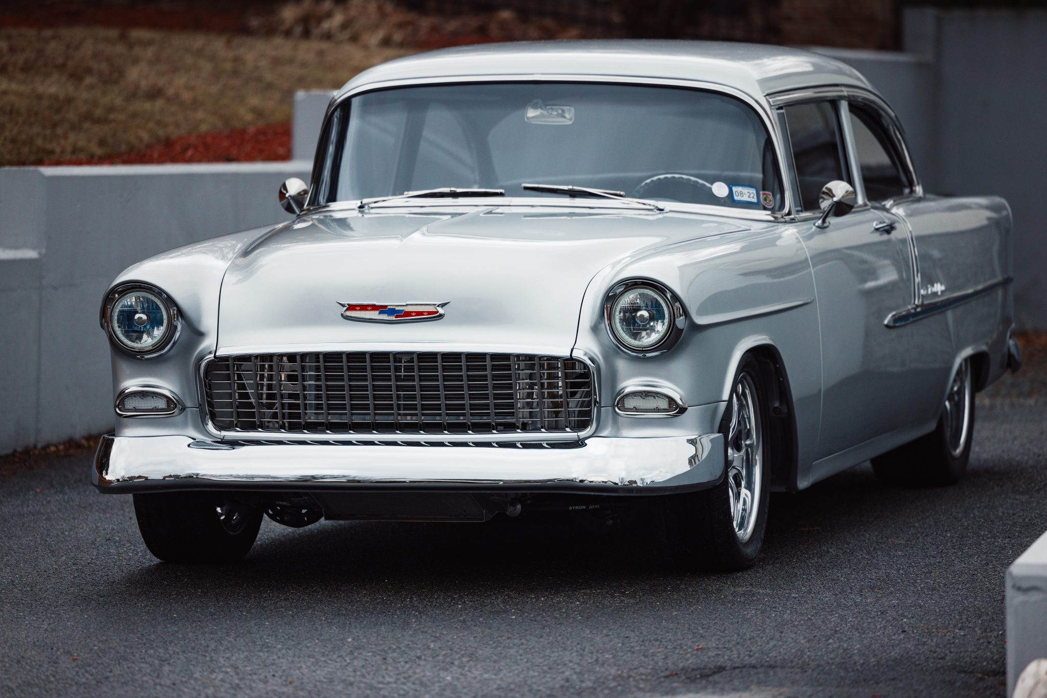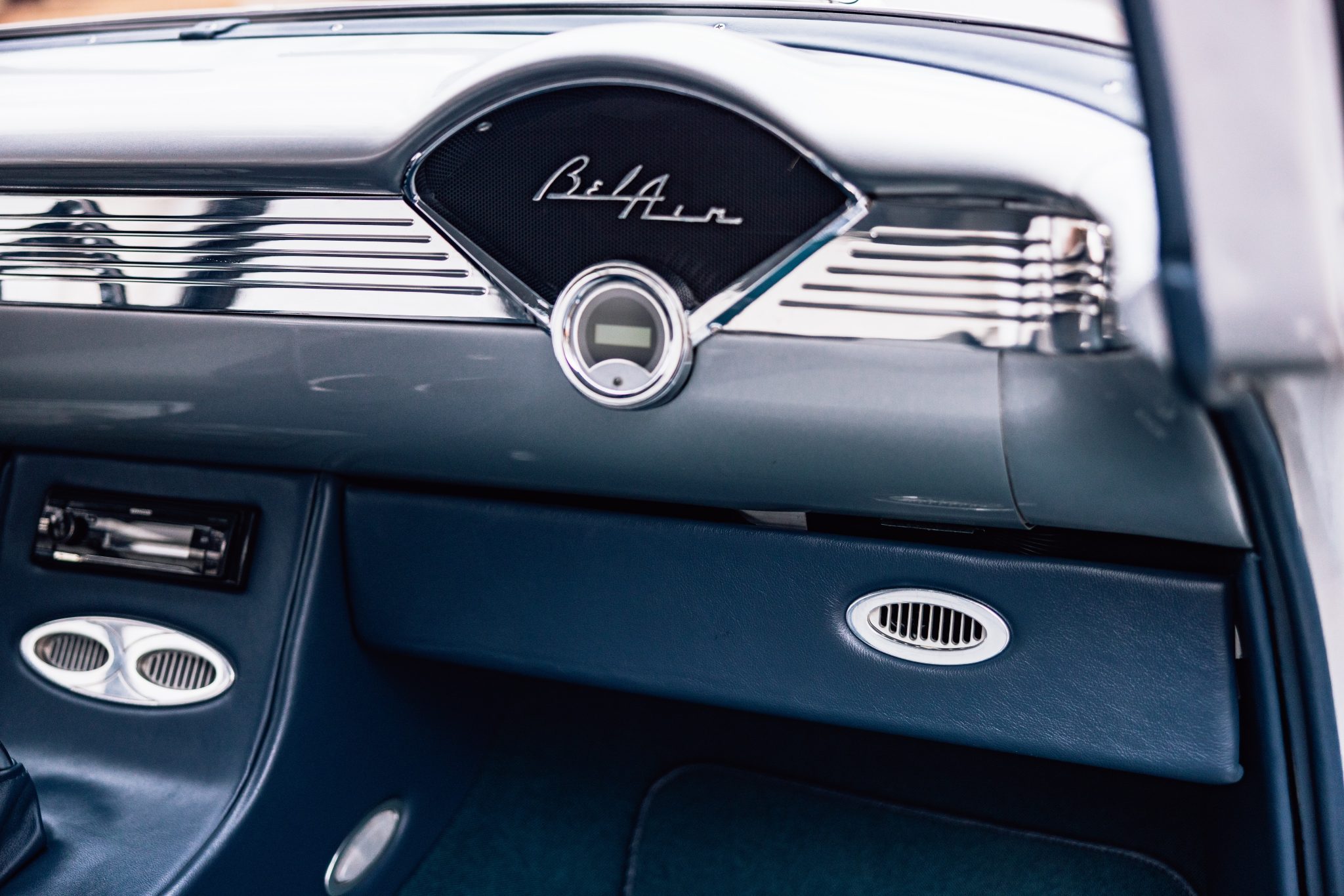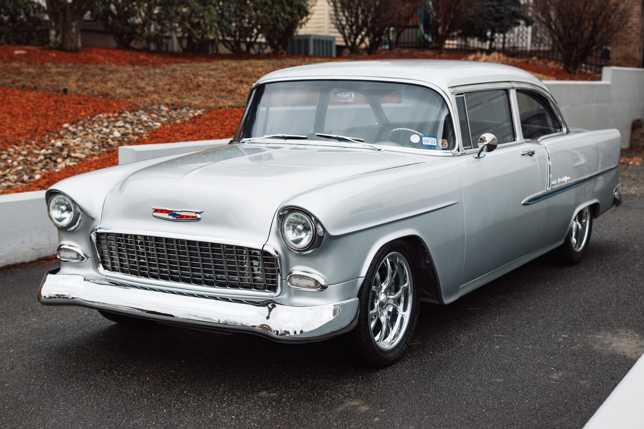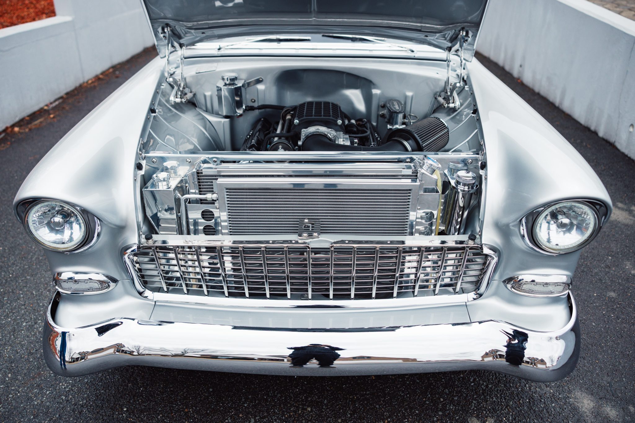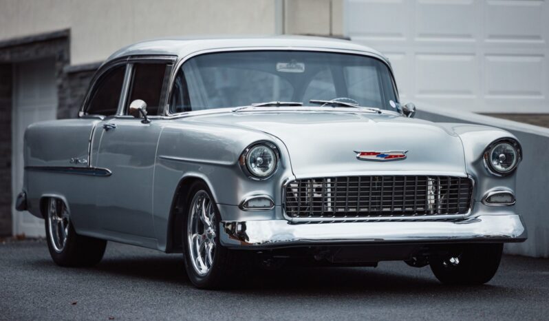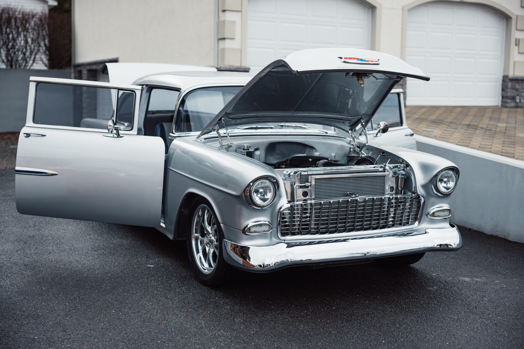 A Magnuson-supercharged 6.2-liter LS3 V8 was installed along with a four-speed automatic transmission and a 9″ rear end, and the body was refinished in silver. The chassis was modified with tubular front control arms, a rear four-link setup, adjustable coilovers, rack-and-pinion steering, and Wilwood disc brakes as well as Boze Alloys 18″ wheels. Inside, power-assisted bucket seats are trimmed in blue and gray leather and accompanied by a custom-fabricated center console and door panels, a Kenwood stereo, aftermarket air conditioning, a Billet Specialties steering wheel, and Dakota Digital gauges.