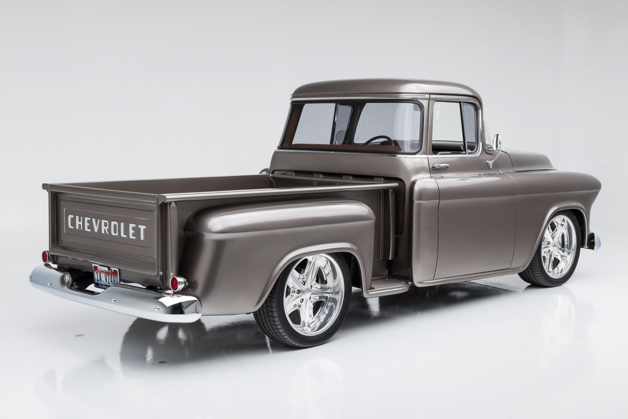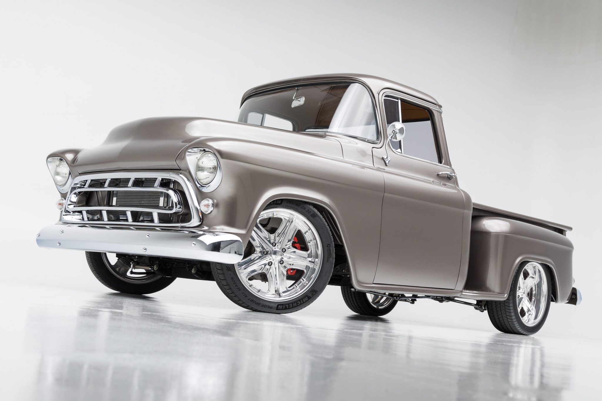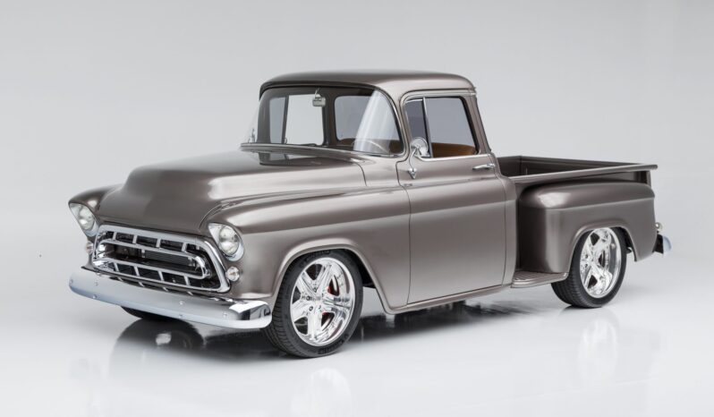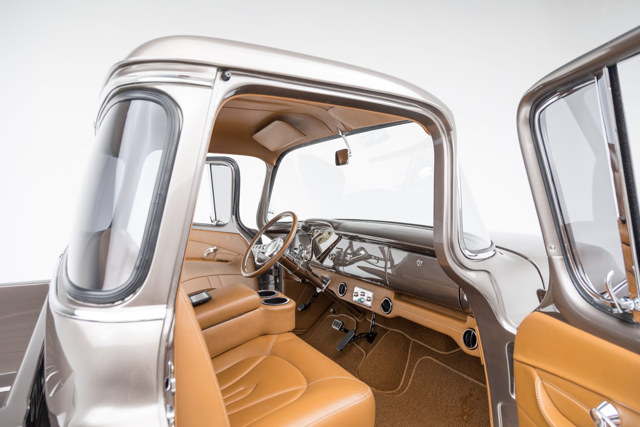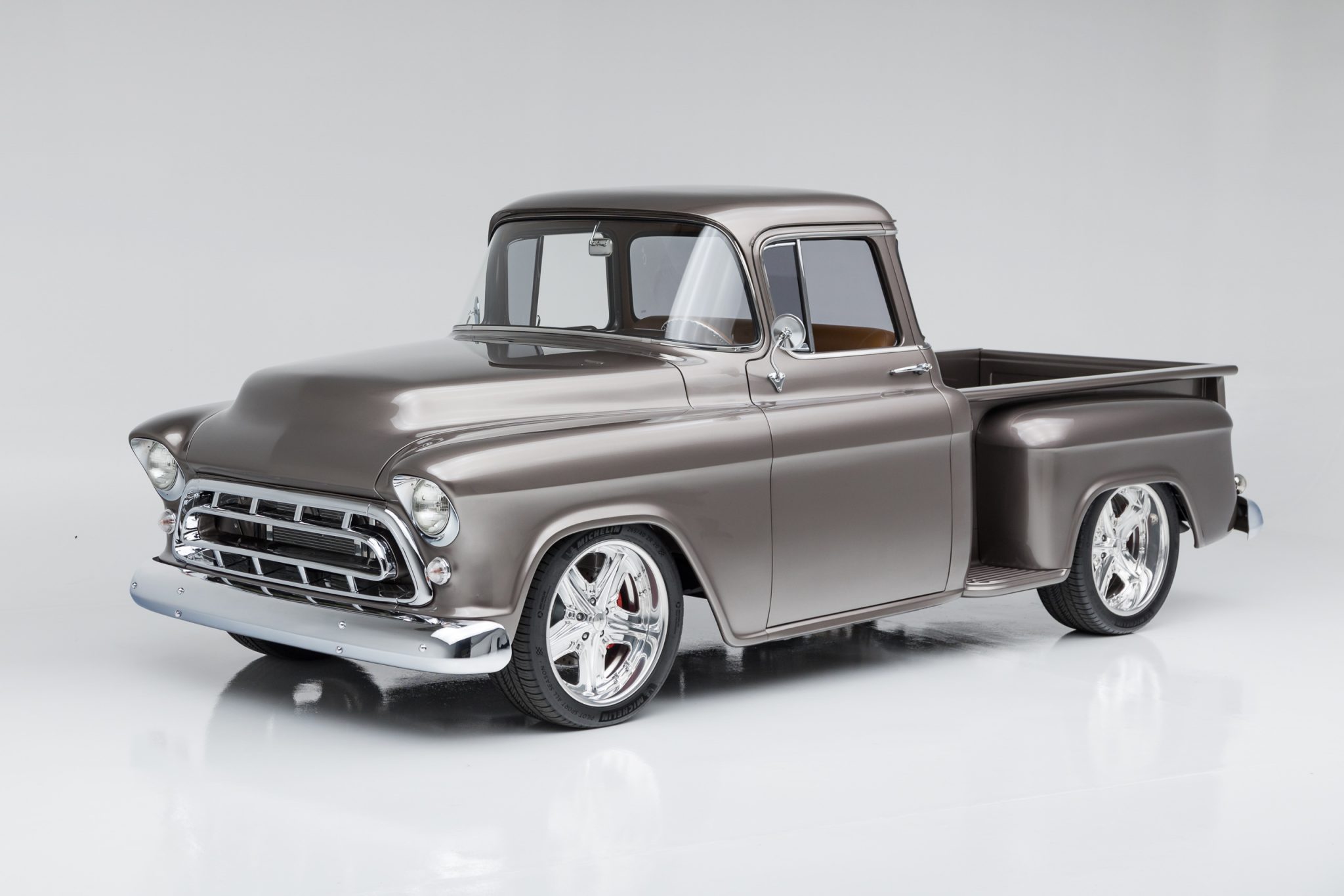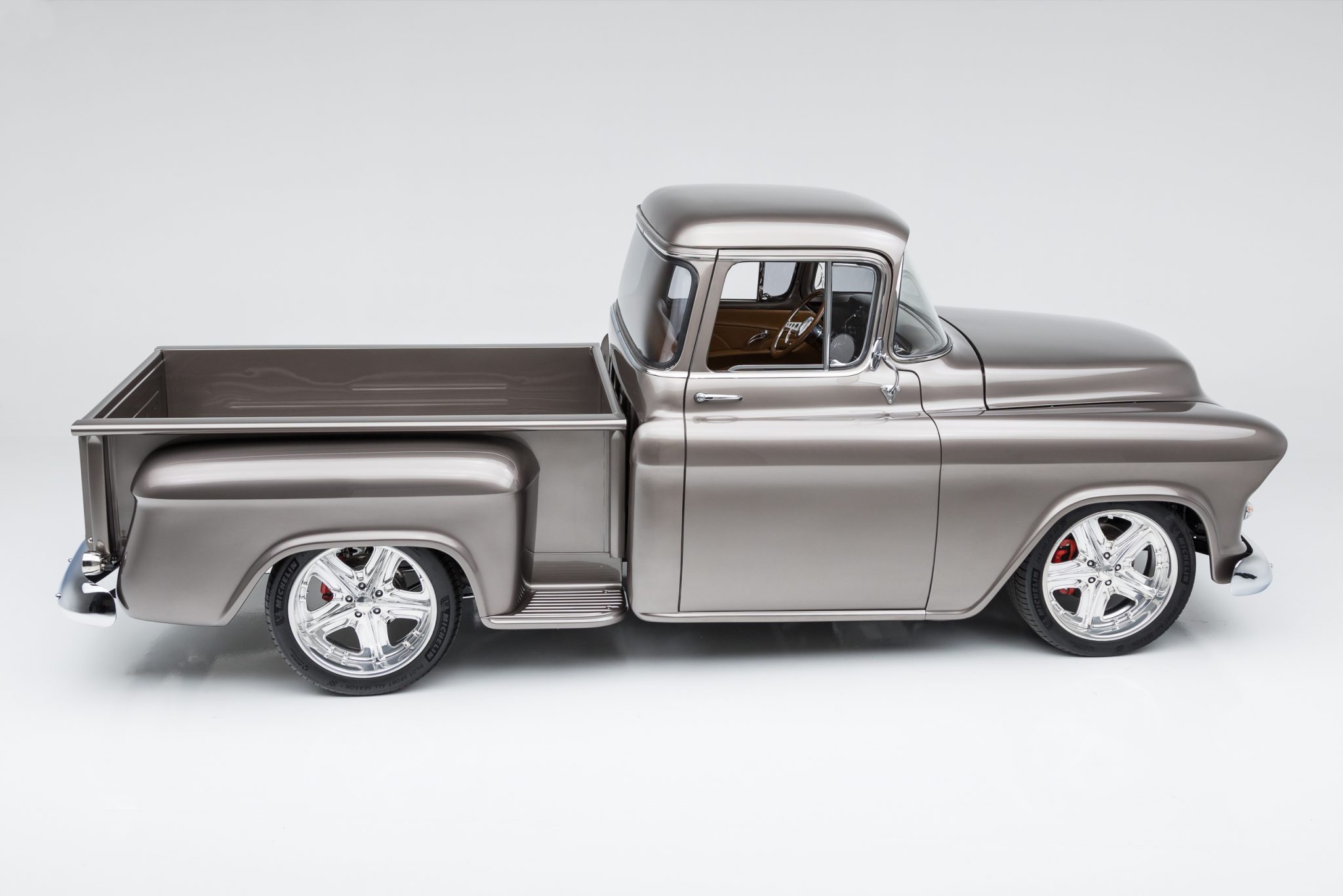 This 1955 GMC 100 pickup is a refurbished and modified The truck is powered by a 502ci V8 with electronic fuel injection paired with a Hughes-built 700R4 four-speed automatic transmission and has been refinished in Magnum Moca Metallic over custom saddle brown leather. Features include a tailgate and front sheet metal from a 1957 Chevrolet, chrome 20″ Foose wheels, four-wheel power disc brakes, a 4-link rear suspension with coilovers, Edelbrock cylinder heads, power steering, air conditioning, power windows, a painted bed floor, and a Bluetooth audio system with two Kicker subwoofers.