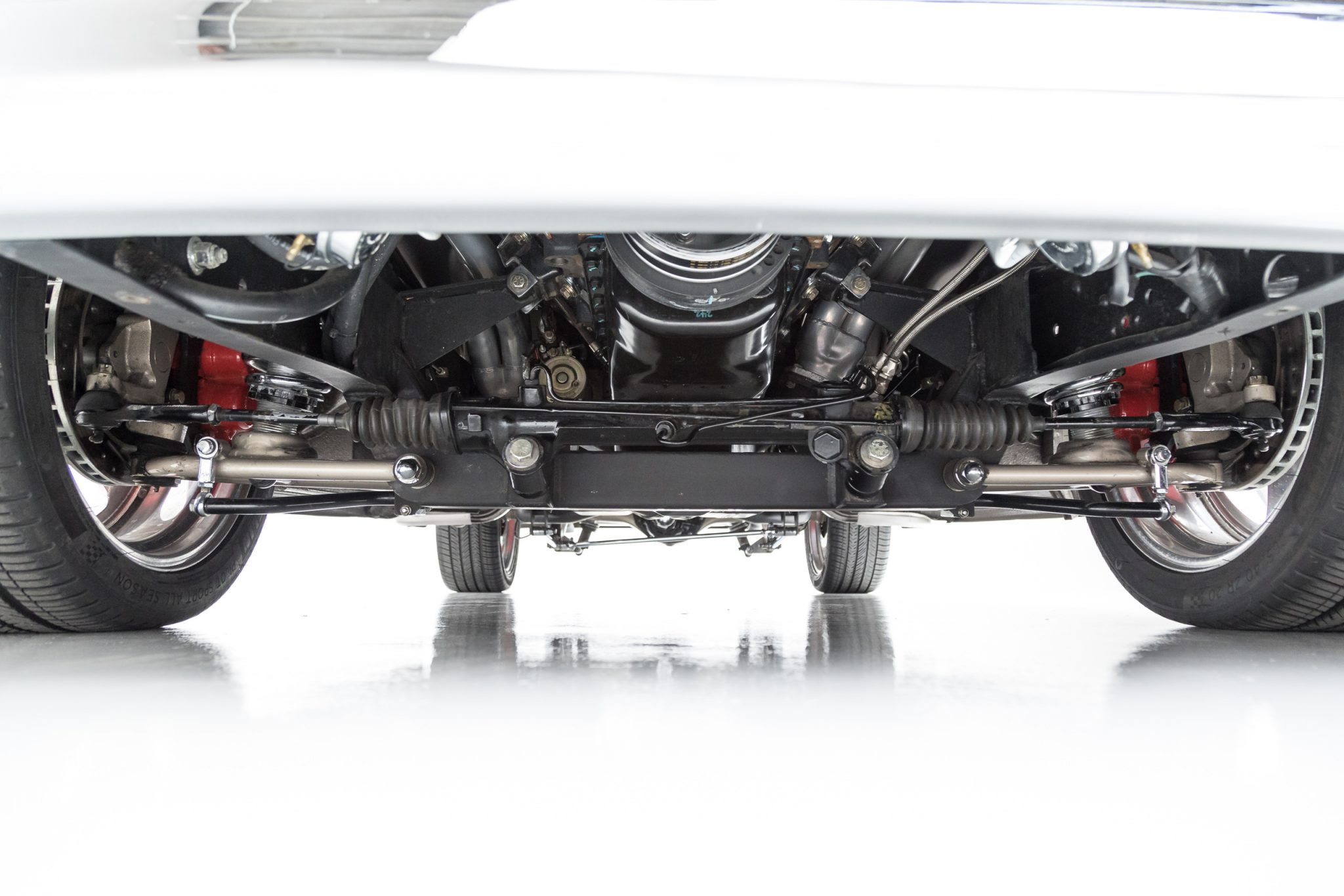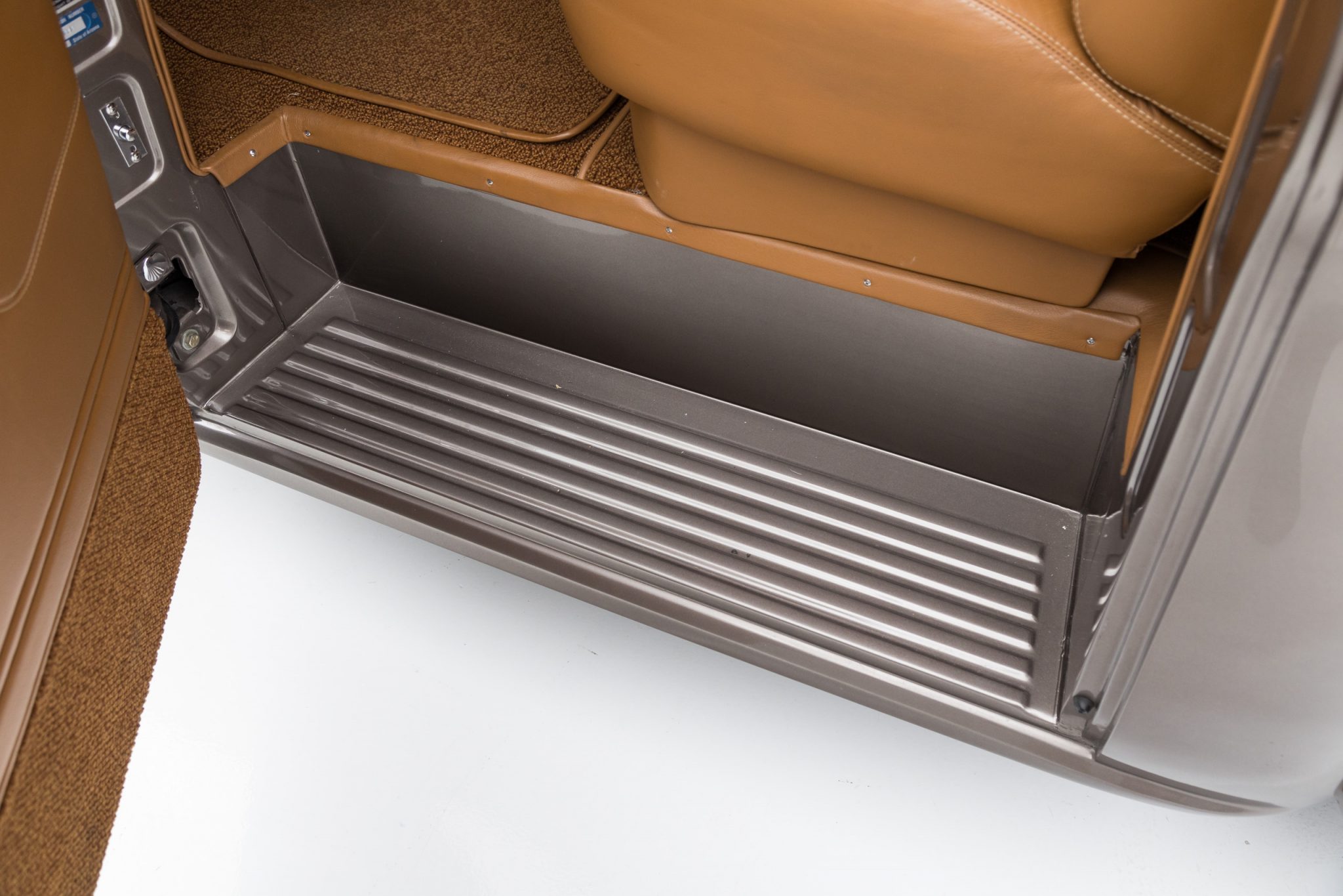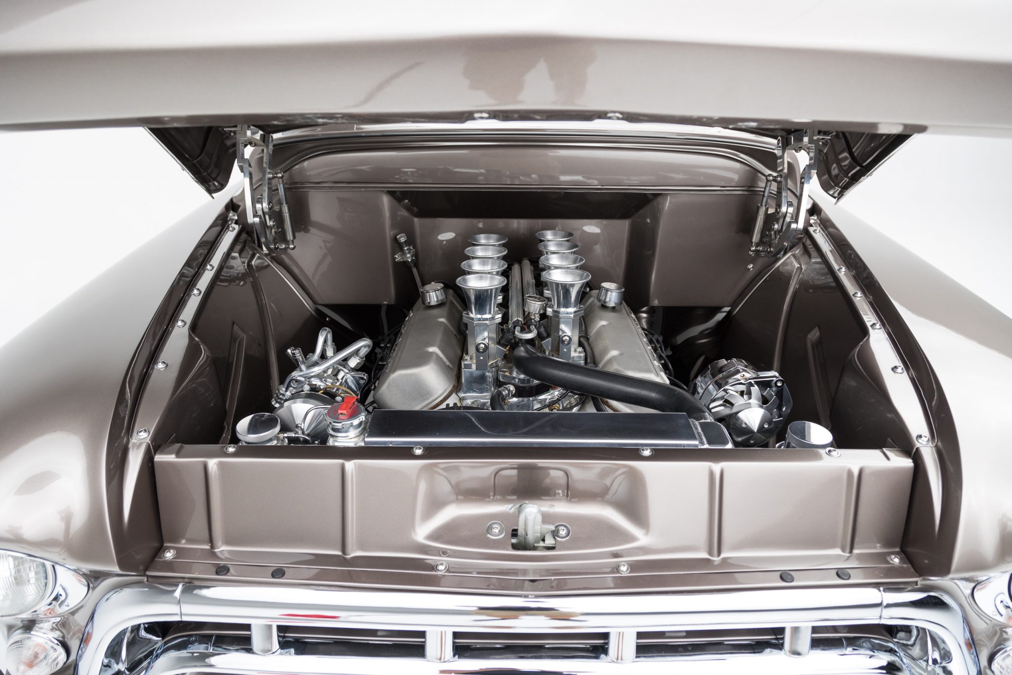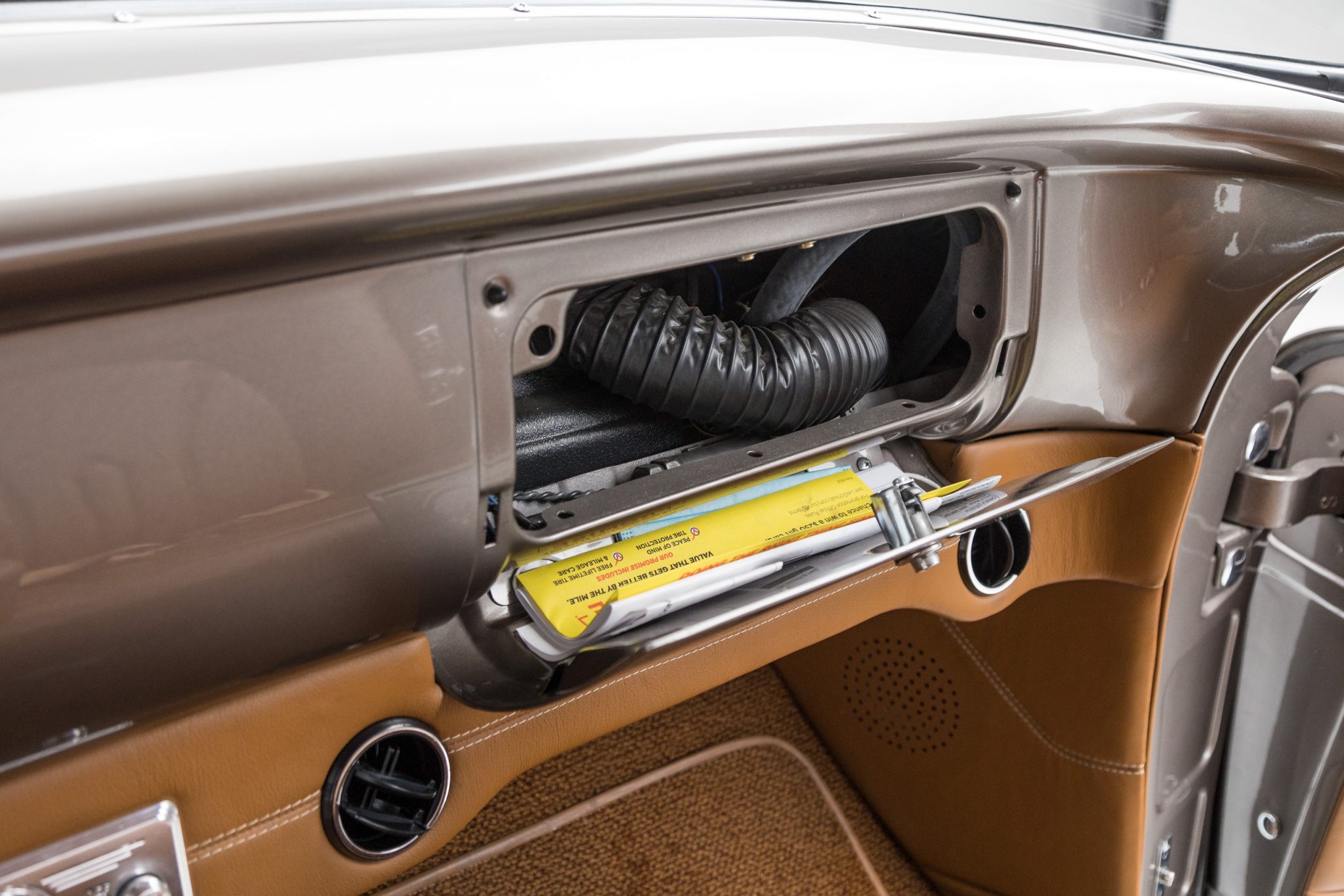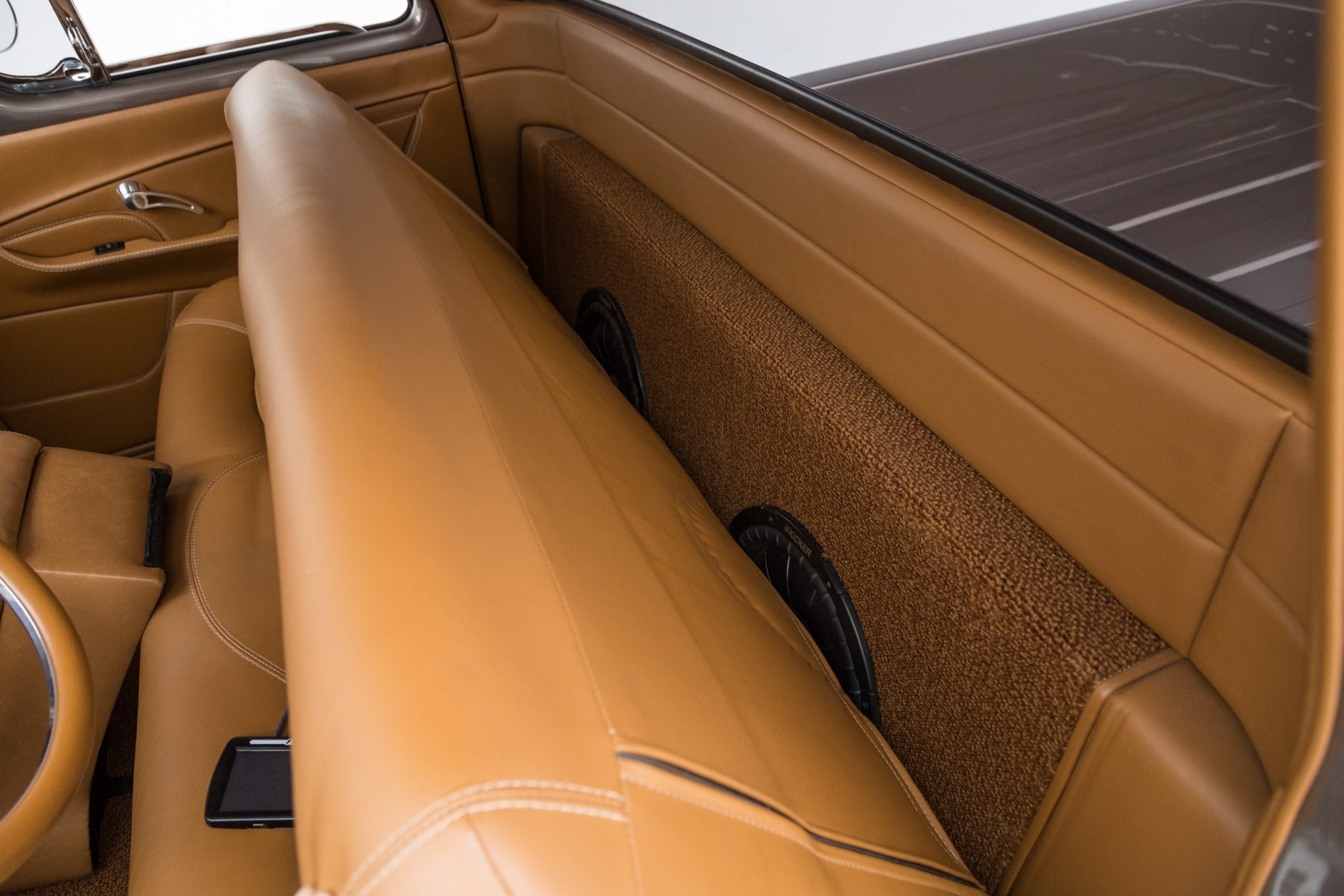 This 1955 GMC 100 pickup is a refurbished and modified The truck is powered by a 502ci V8 with electronic fuel injection paired with a Hughes-built 700R4 four-speed automatic transmission and has been refinished in Magnum Moca Metallic over custom saddle brown leather. Features include a tailgate and front sheet metal from a 1957 Chevrolet, chrome 20″ Foose wheels, four-wheel power disc brakes, a 4-link rear suspension with coilovers, Edelbrock cylinder heads, power steering, air conditioning, power windows, a painted bed floor, and a Bluetooth audio system with two Kicker subwoofers.