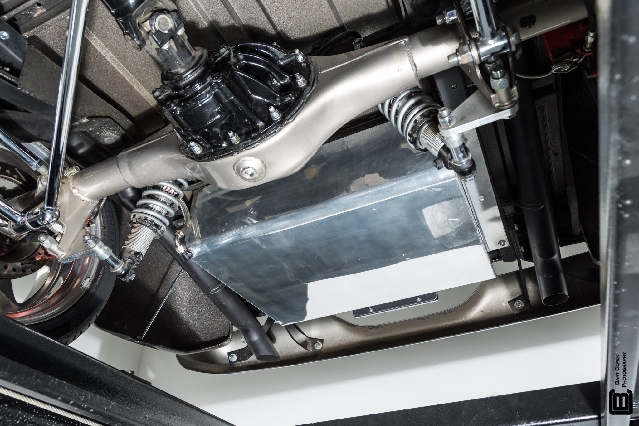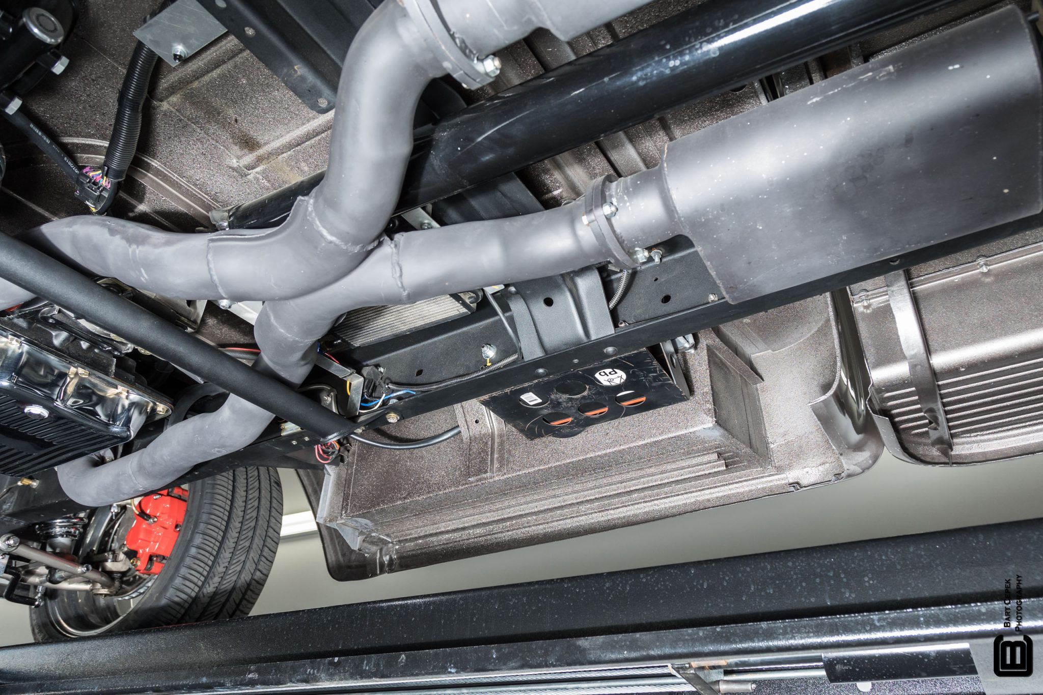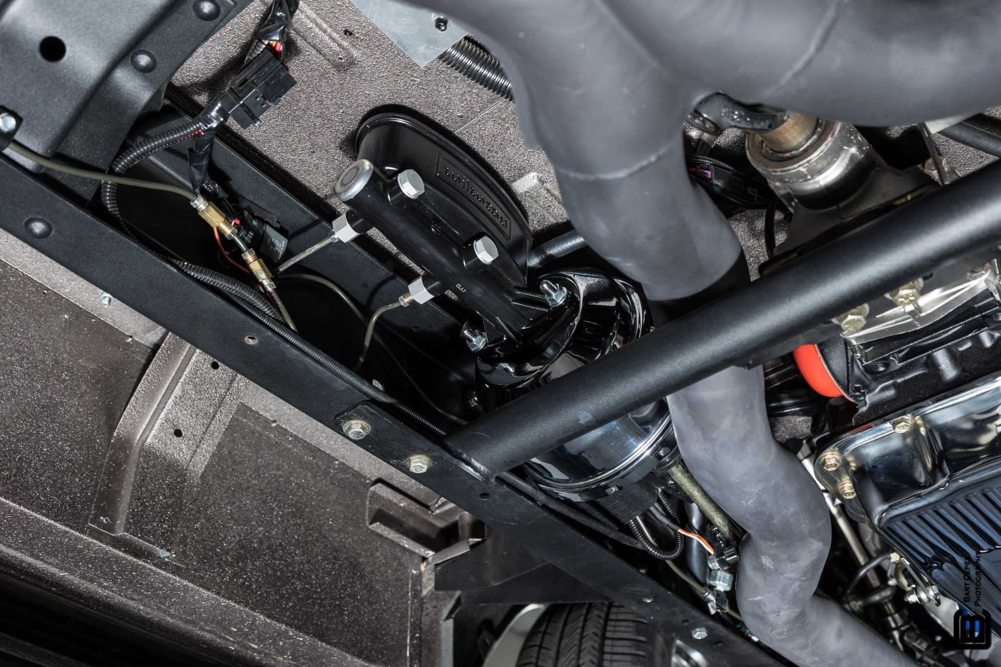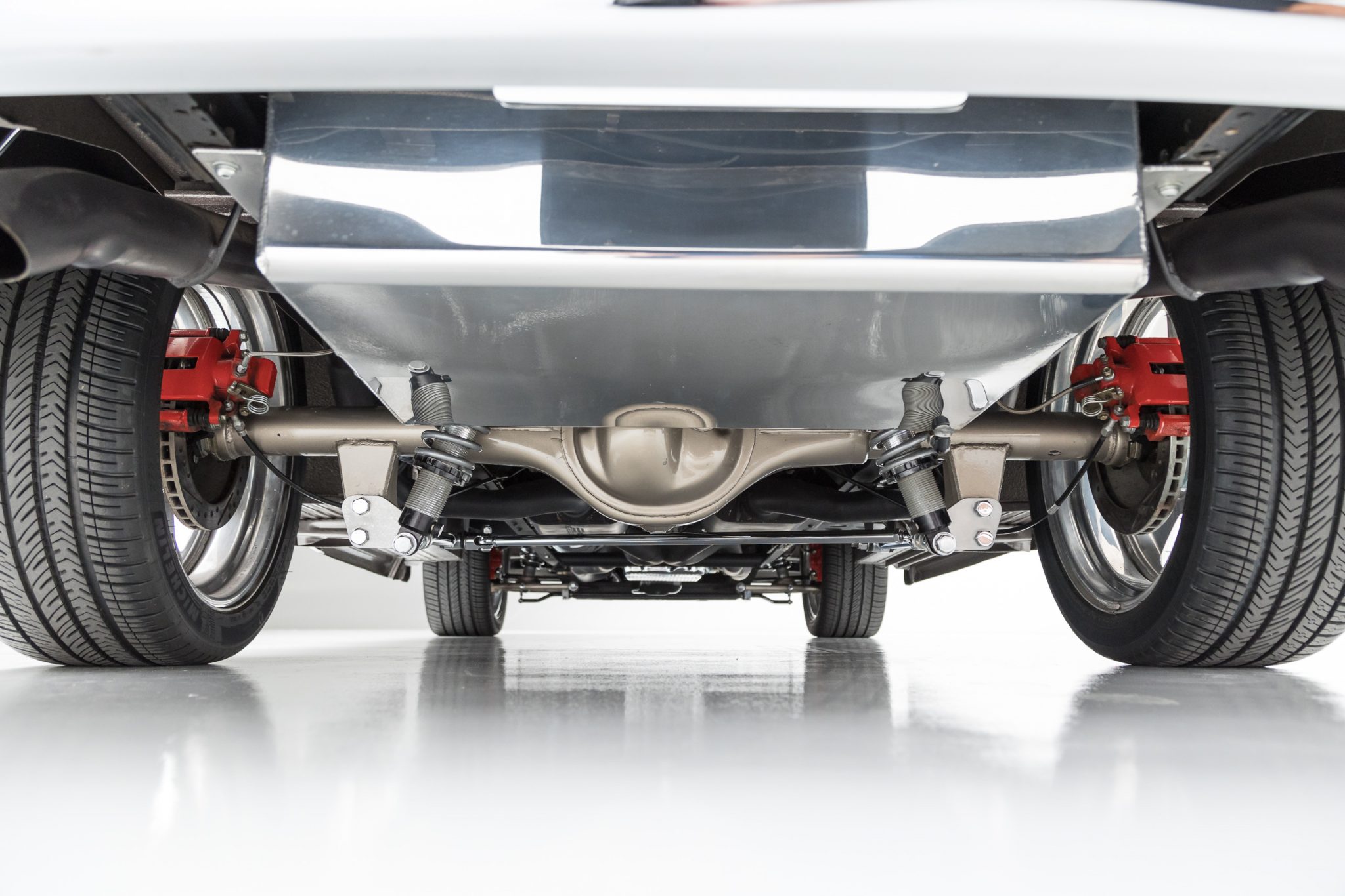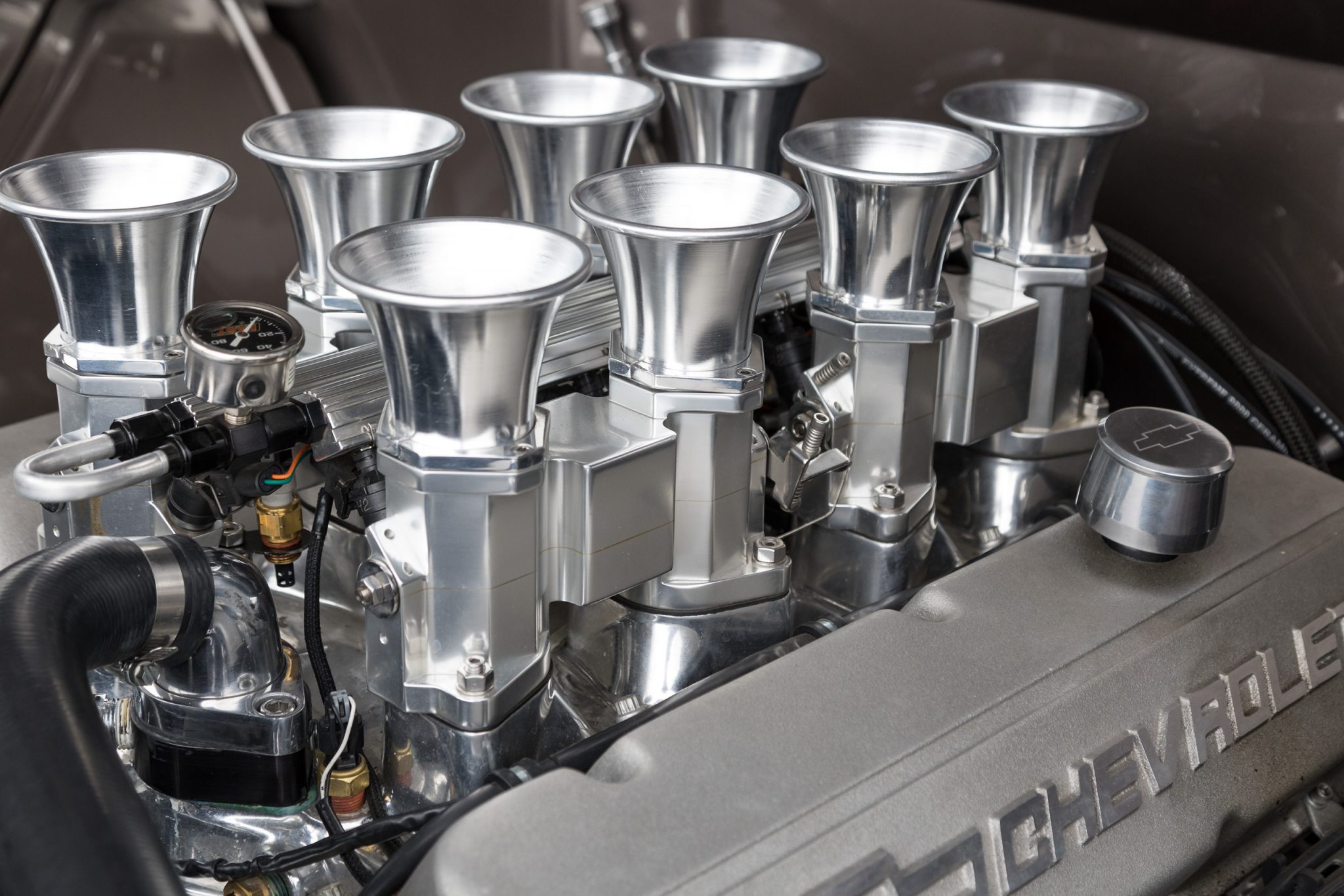 This 1955 GMC 100 pickup is a refurbished and modified The truck is powered by a 502ci V8 with electronic fuel injection paired with a Hughes-built 700R4 four-speed automatic transmission and has been refinished in Magnum Moca Metallic over custom saddle brown leather. Features include a tailgate and front sheet metal from a 1957 Chevrolet, chrome 20″ Foose wheels, four-wheel power disc brakes, a 4-link rear suspension with coilovers, Edelbrock cylinder heads, power steering, air conditioning, power windows, a painted bed floor, and a Bluetooth audio system with two Kicker subwoofers.