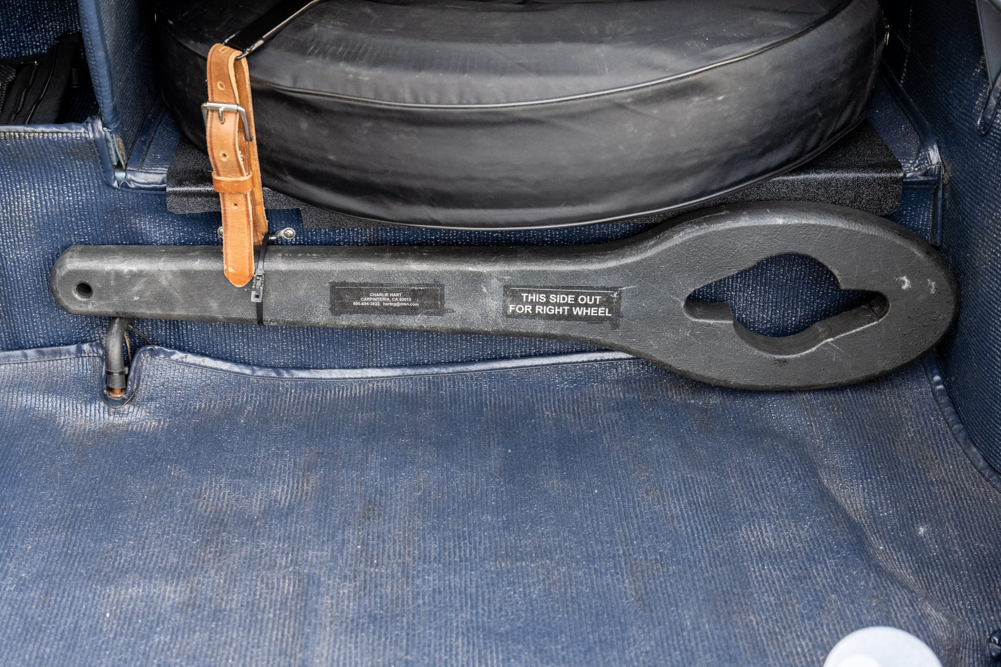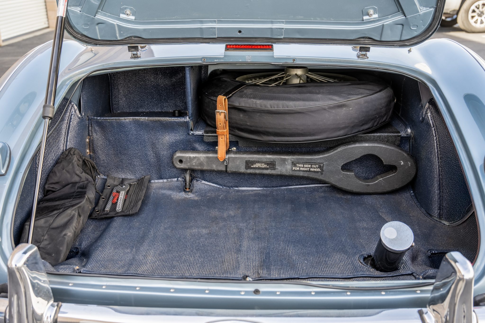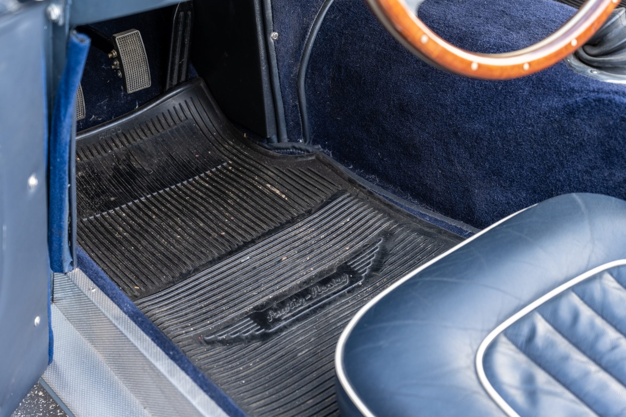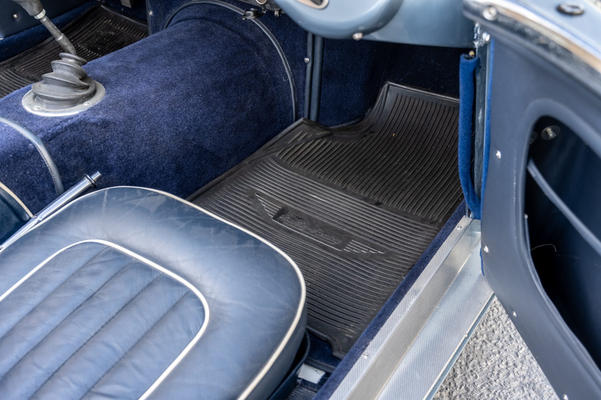 Work included a repaint in blue, an overhaul of the 2.7-liter inline-four, installation of a Toyota five-speed manual transmission, and refreshment of the interior, electrical system, instrumentation, and brakes. The car is equipped with a white soft top, an adjustable reclining windshield, a Derrington steering wheel, electronic ignition, twin SU carburetors, fog lamps, and Dayton knock-off wire wheels.