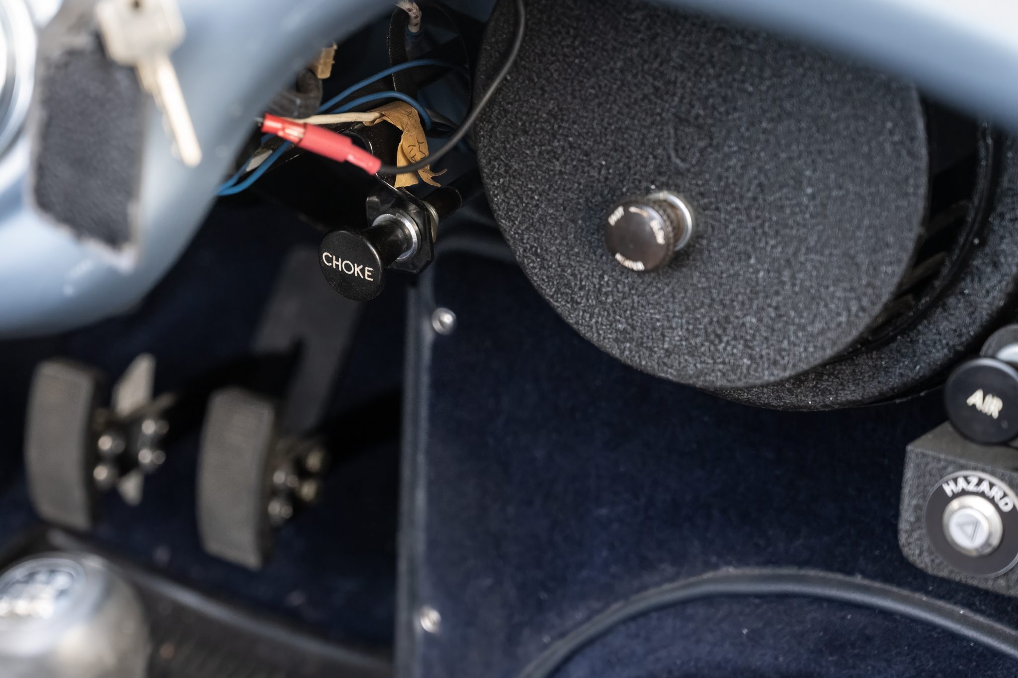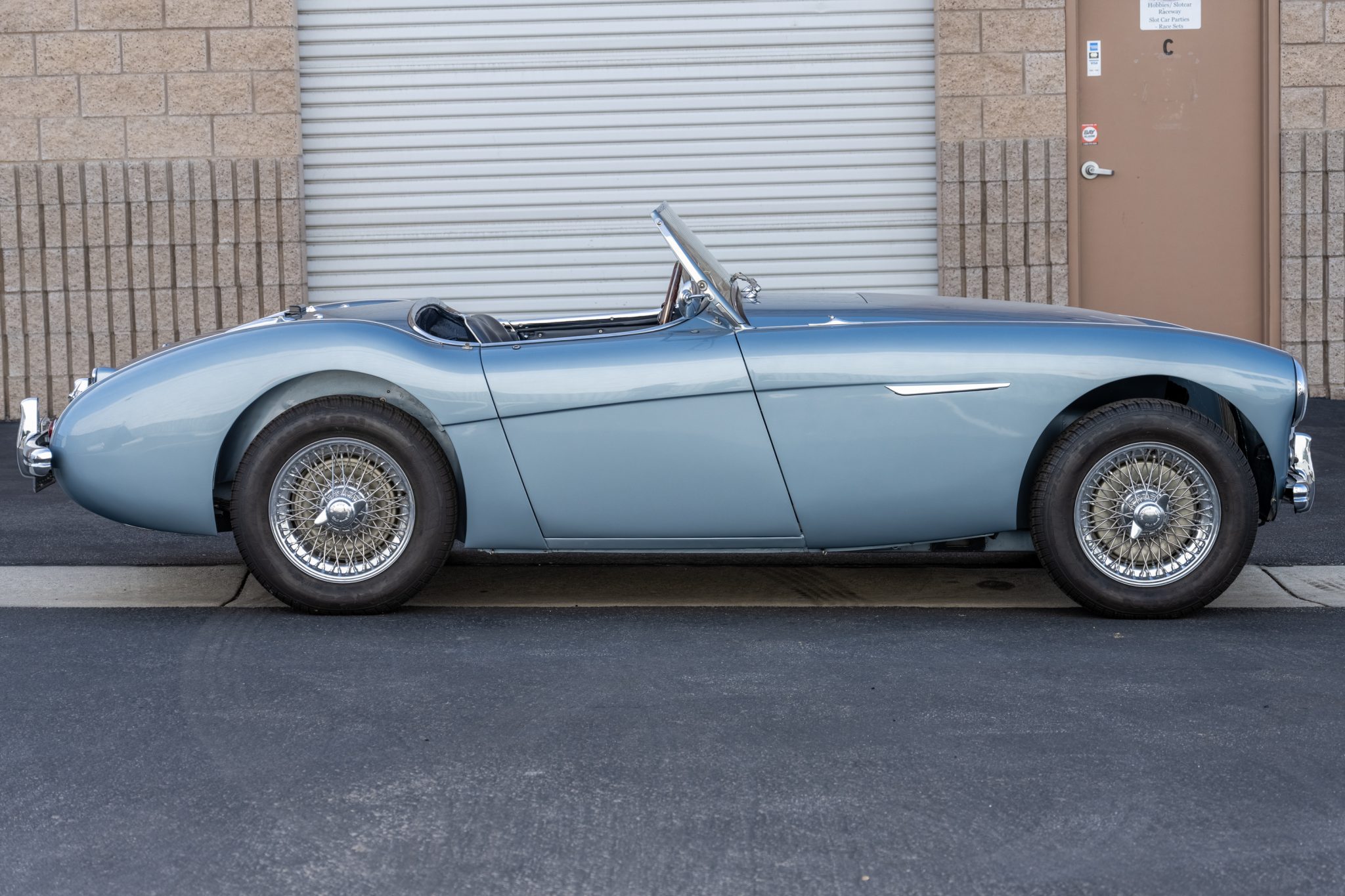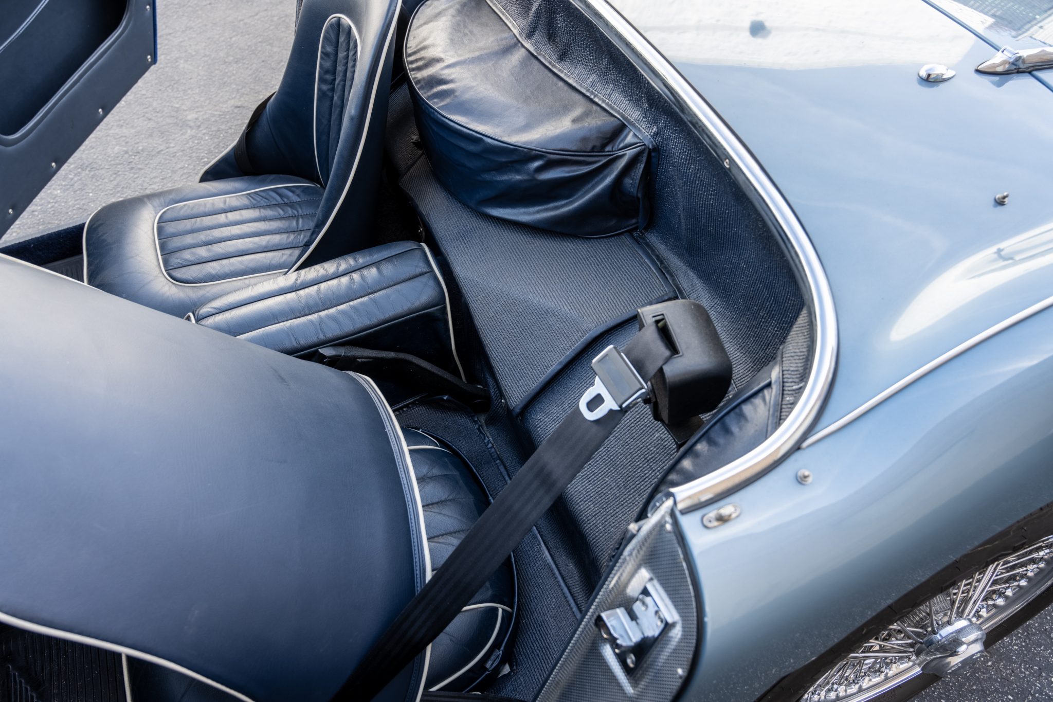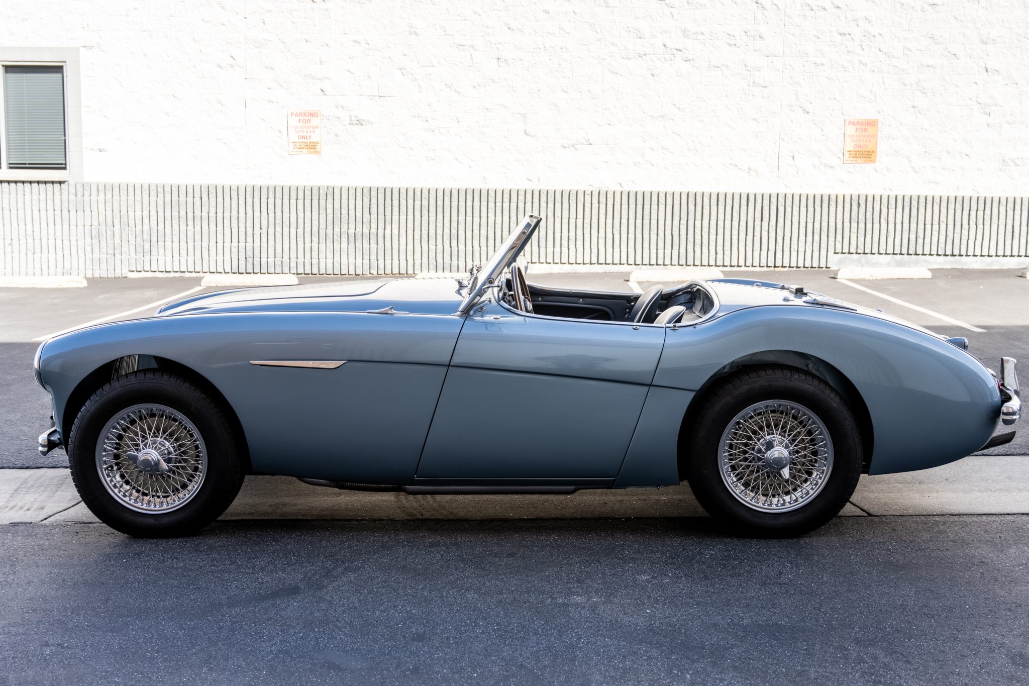 Work included a repaint in blue, an overhaul of the 2.7-liter inline-four, installation of a Toyota five-speed manual transmission, and refreshment of the interior, electrical system, instrumentation, and brakes. The car is equipped with a white soft top, an adjustable reclining windshield, a Derrington steering wheel, electronic ignition, twin SU carburetors, fog lamps, and Dayton knock-off wire wheels.