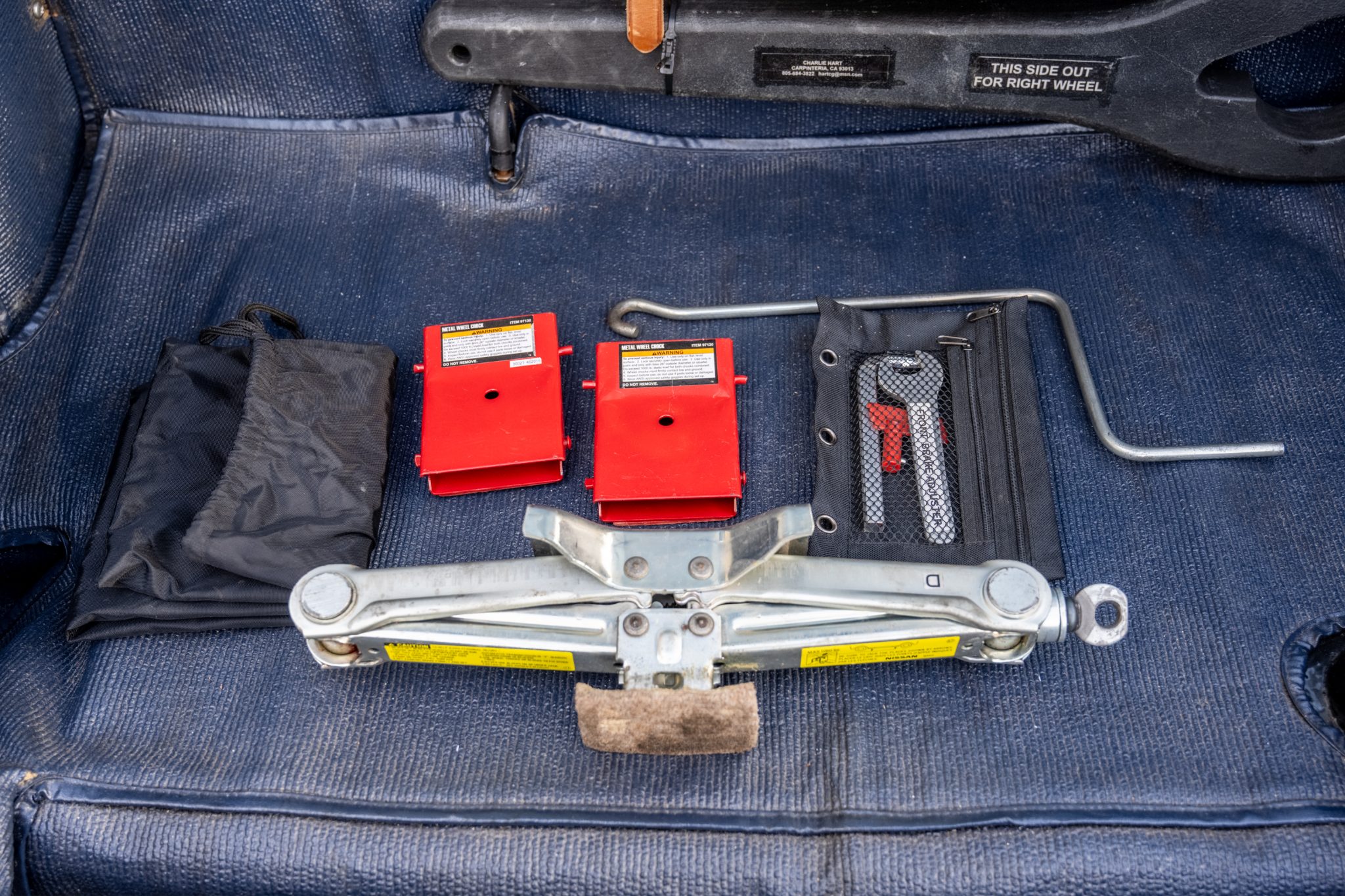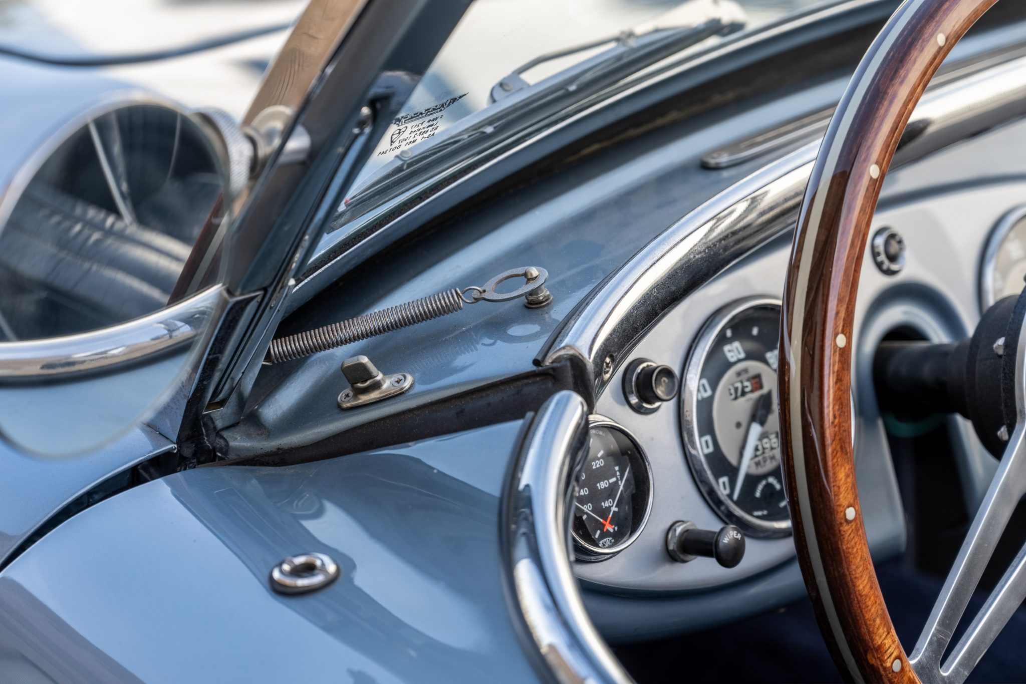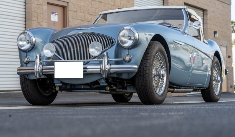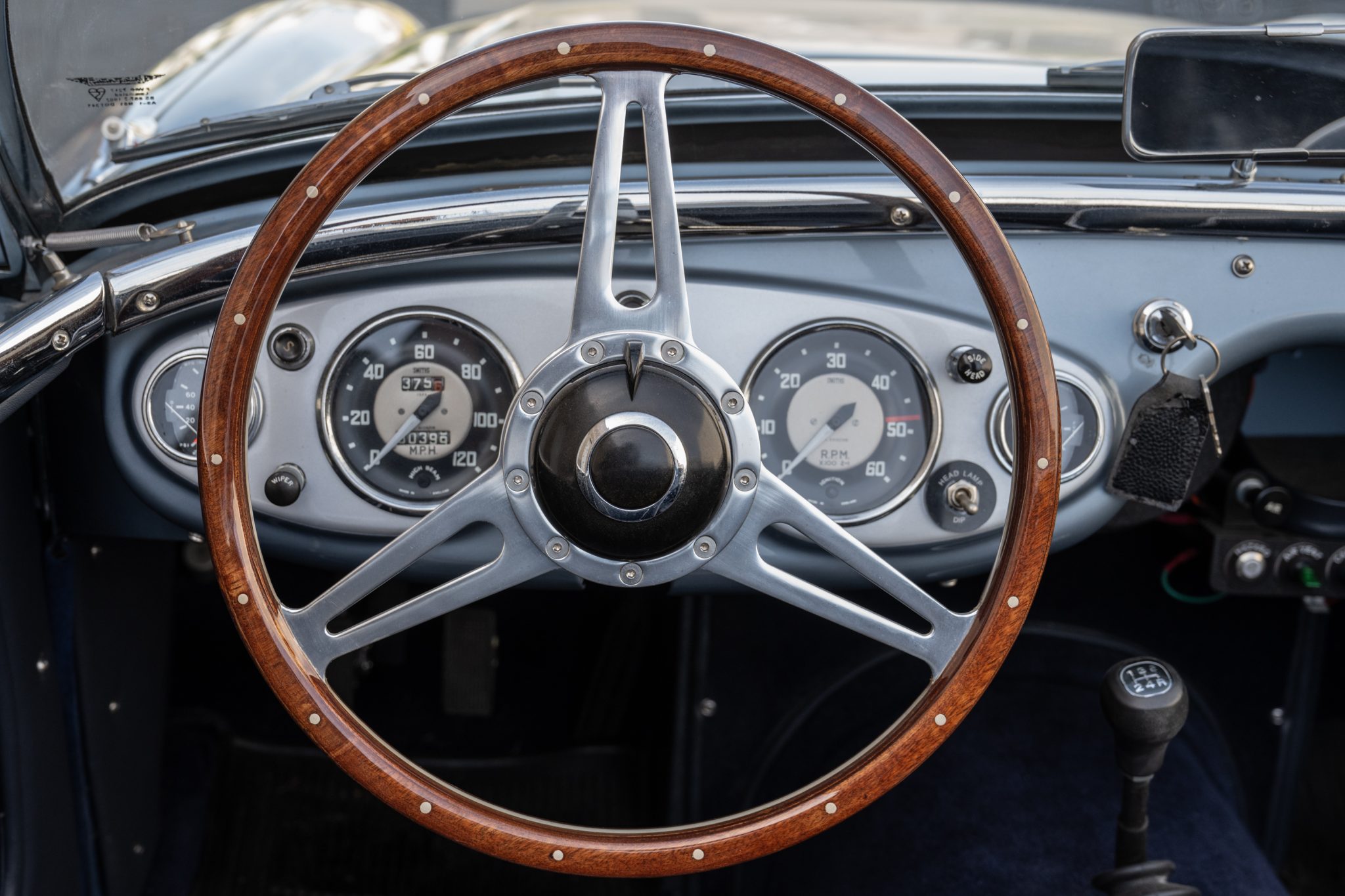 Work included a repaint in blue, an overhaul of the 2.7-liter inline-four, installation of a Toyota five-speed manual transmission, and refreshment of the interior, electrical system, instrumentation, and brakes. The car is equipped with a white soft top, an adjustable reclining windshield, a Derrington steering wheel, electronic ignition, twin SU carburetors, fog lamps, and Dayton knock-off wire wheels.