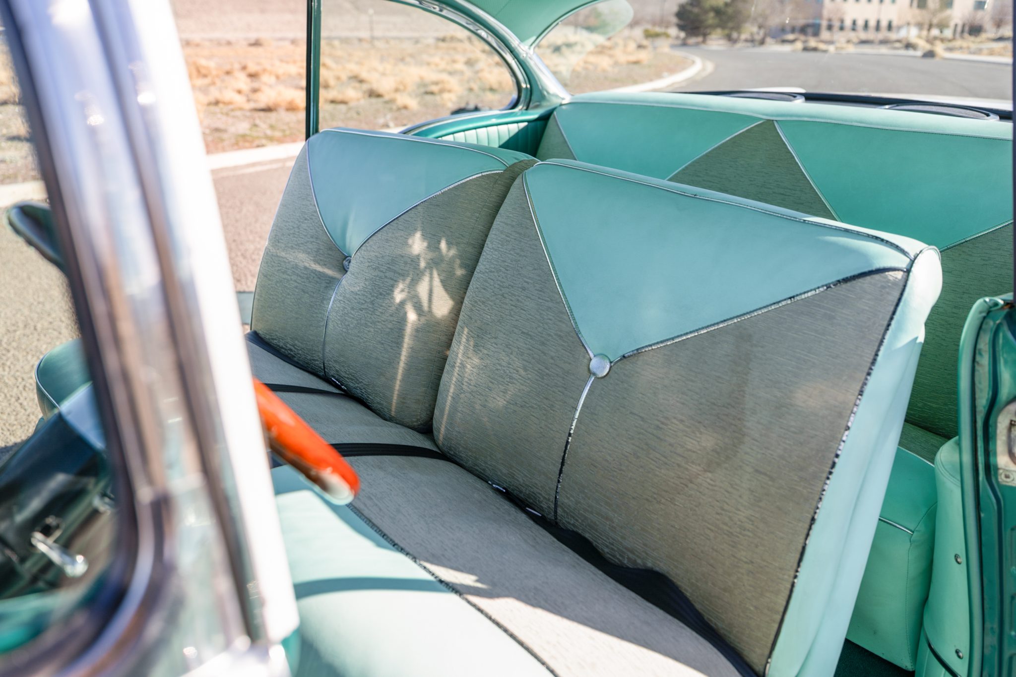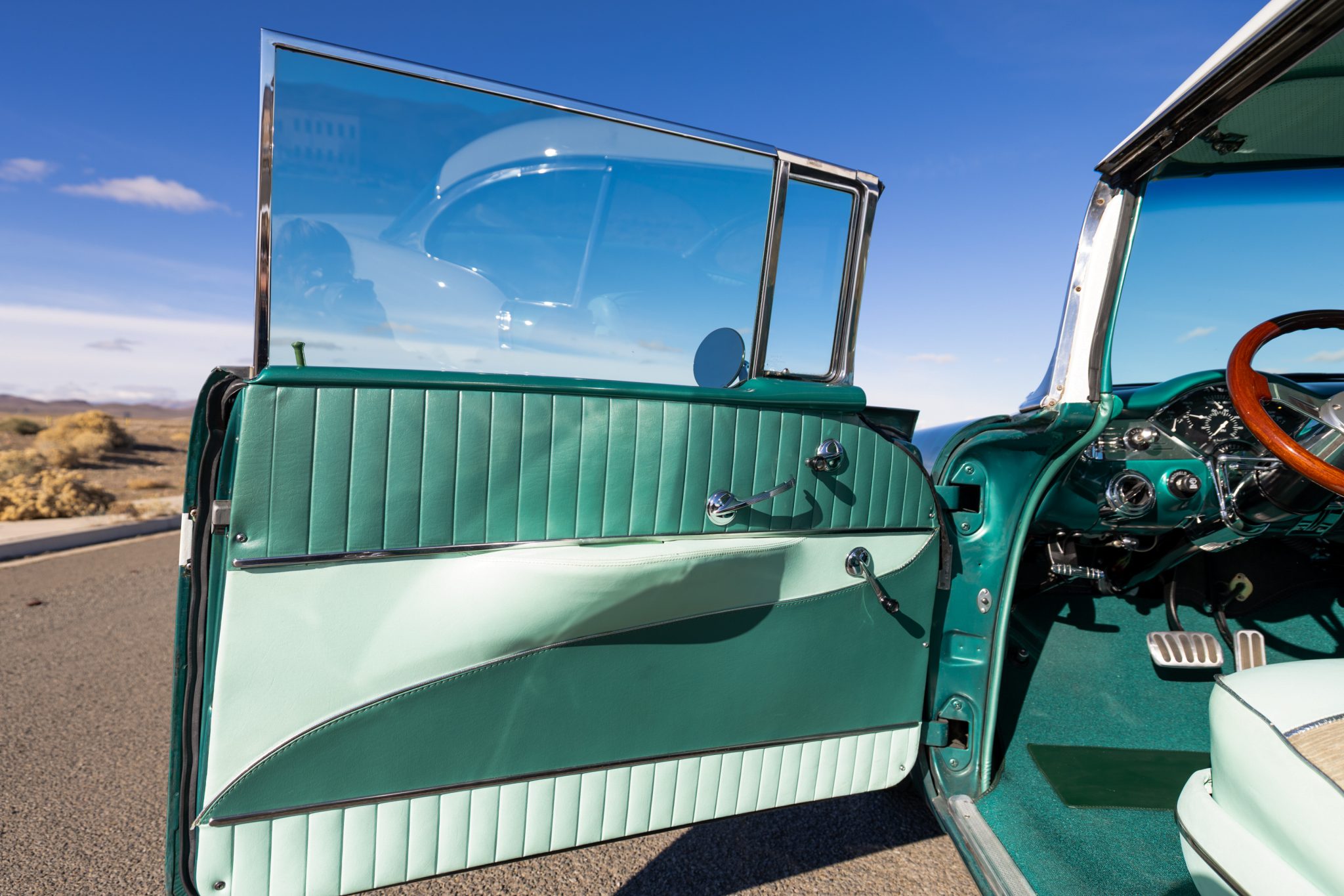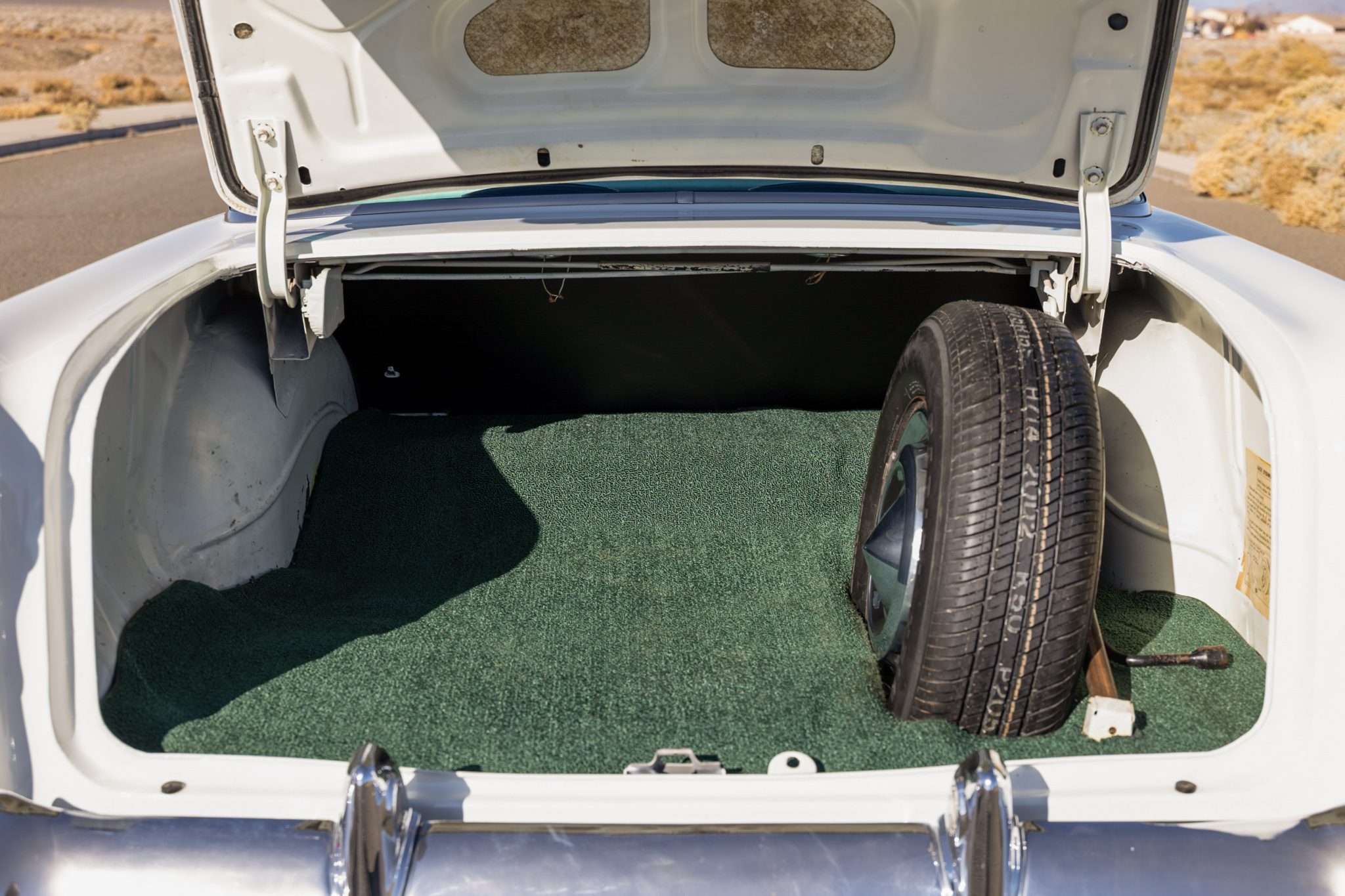 The suspension was overhauled, and a 350ci V8, a TCI 700R4 automatic transmission, and Wilwood front disc brakes were installed at that time. Inside, the cabin was refreshed with green upholstery and fitted with sound-deadening material, aftermarket air conditioning, a Bluetooth stereo, a tilt steering column, and Classic Instruments gauges. Additional equipment includes 15″ Cragar S/S wheels, long-tube headers, power steering, MSD ignition, a March accessory drive setup, and an Edelbrock carburetor and intake.