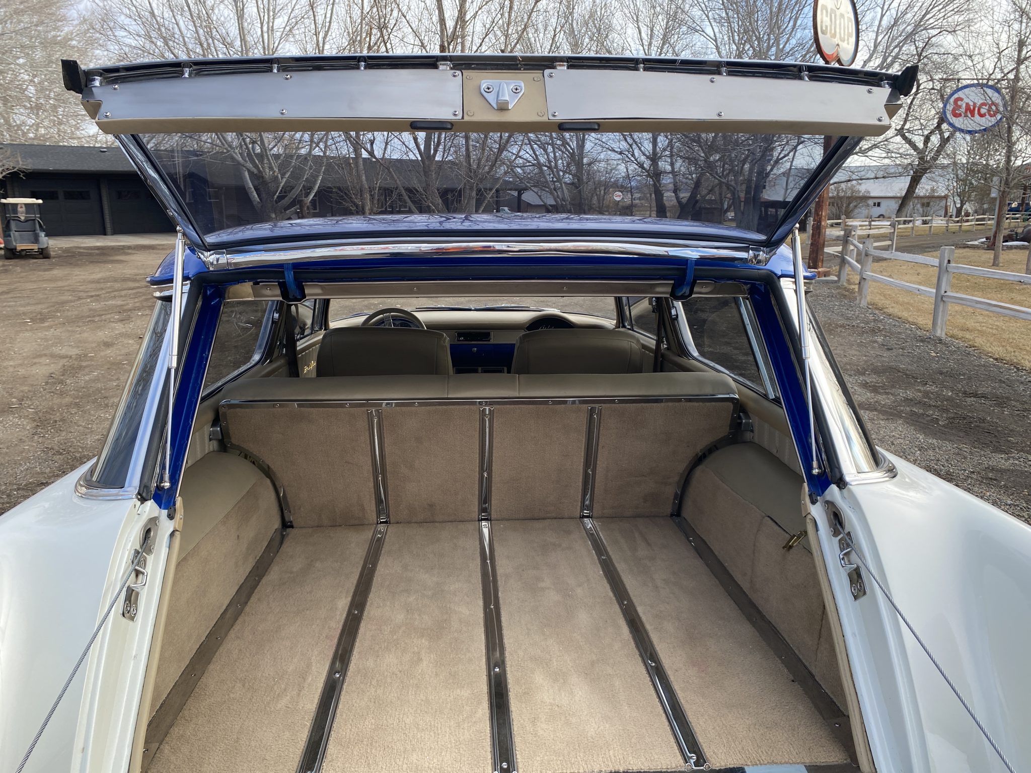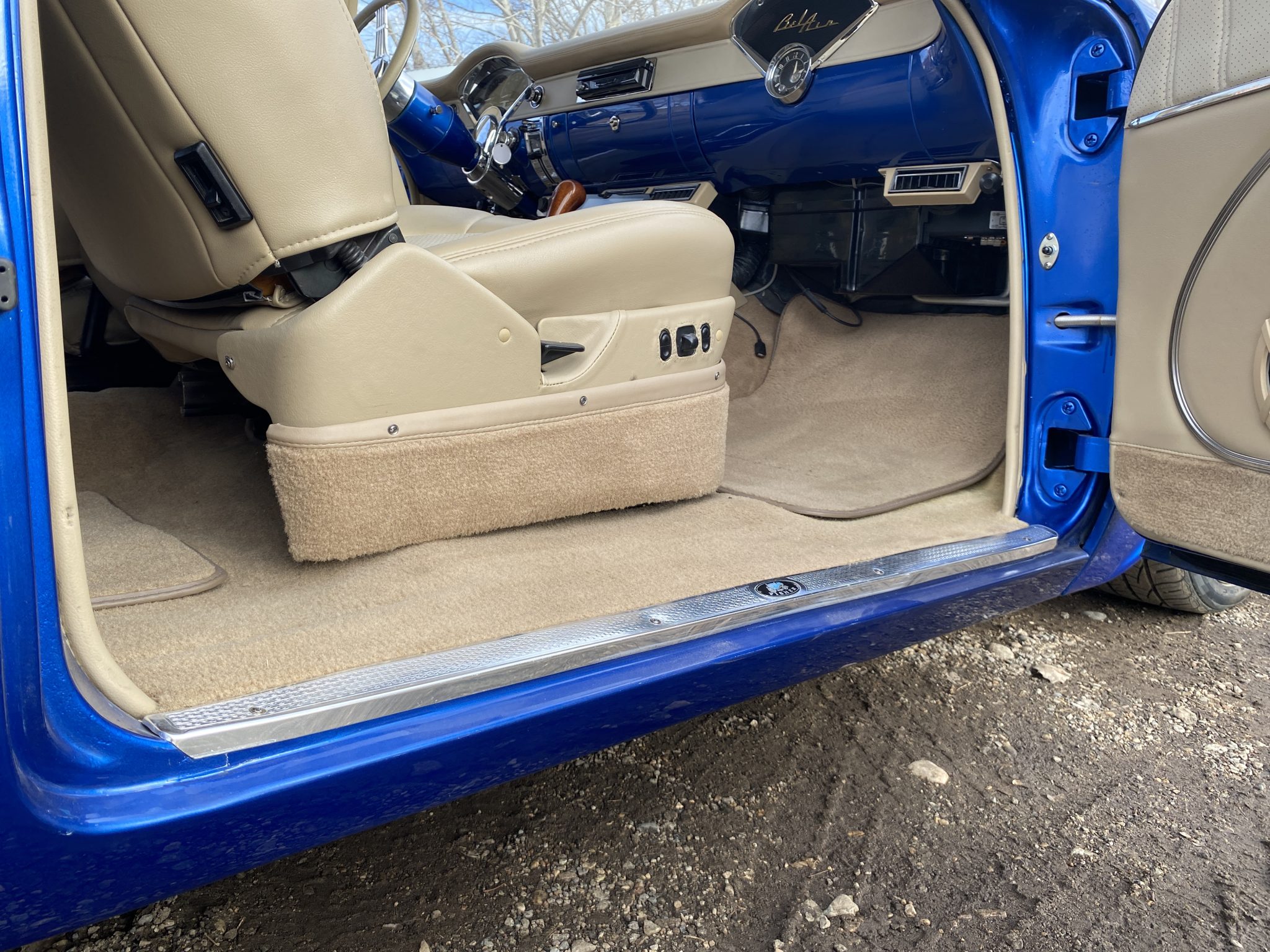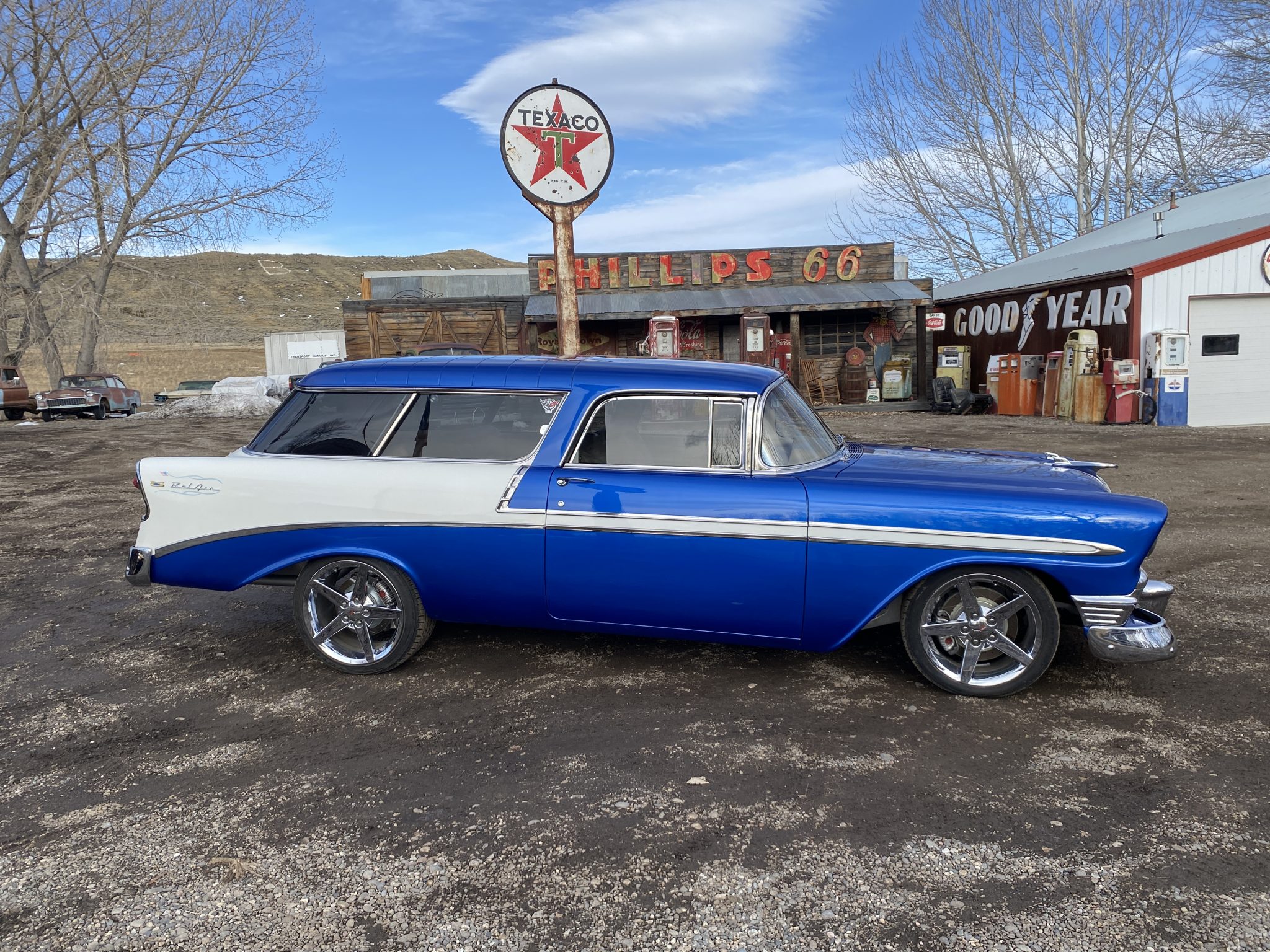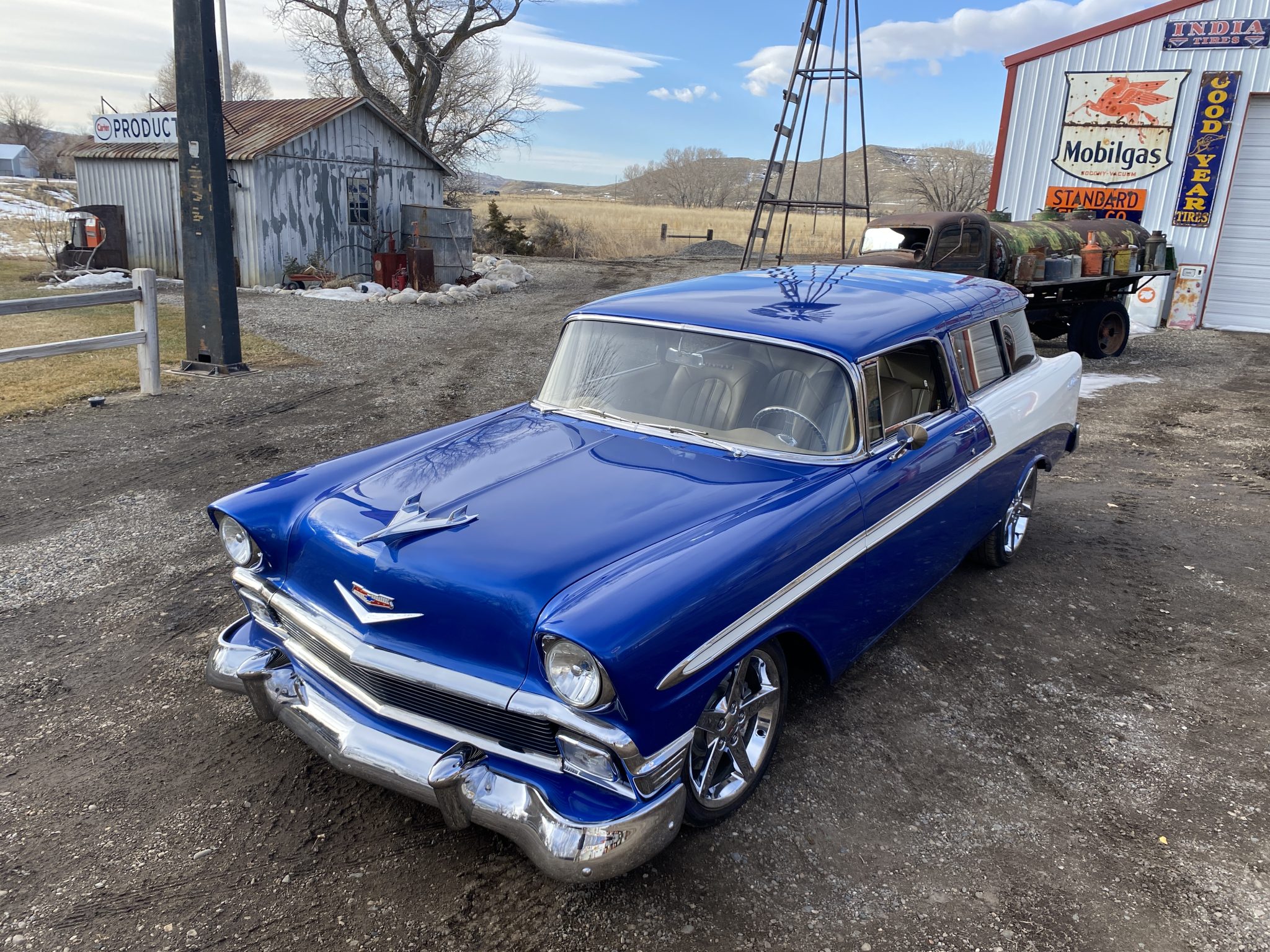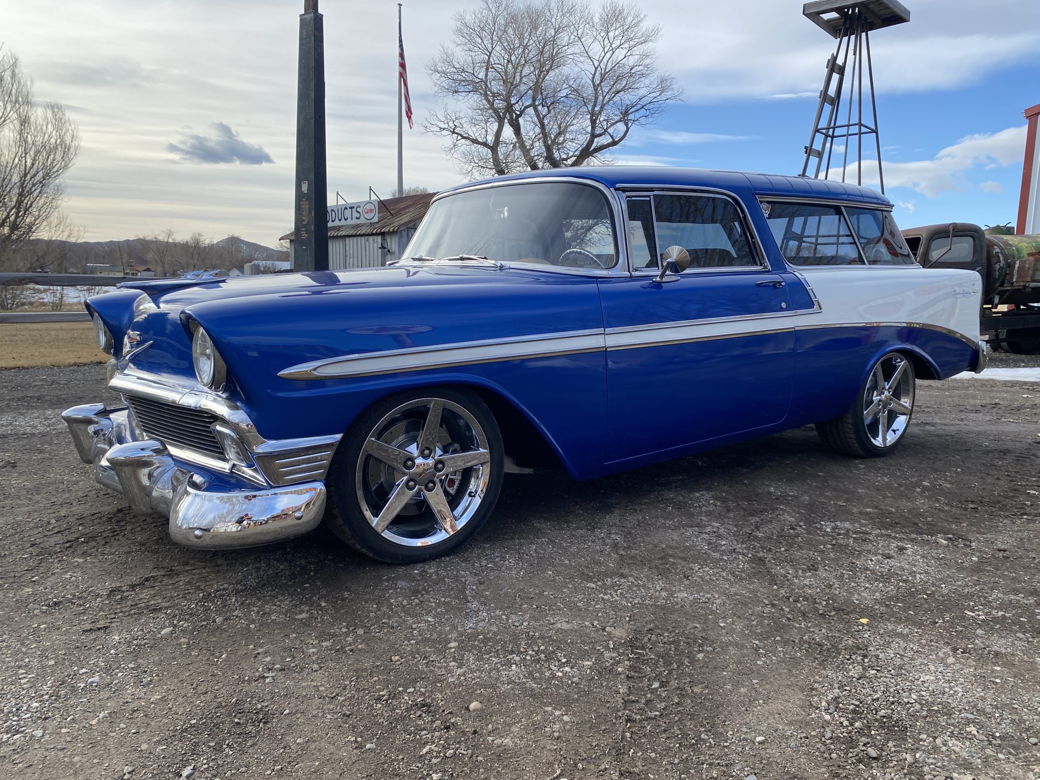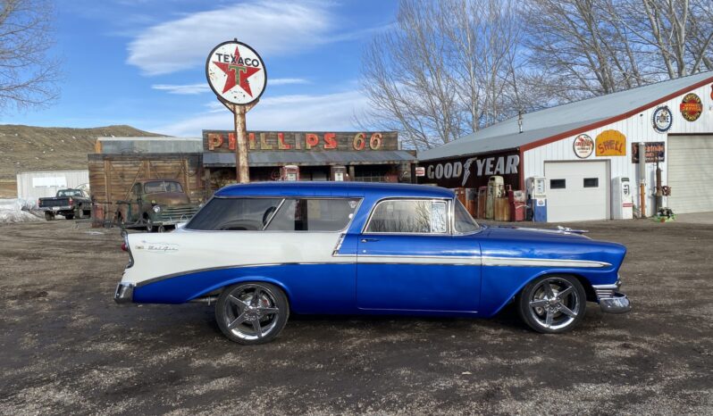 This 1956 Chevrolet Bel Air Nomad was modified with the installation of a 6.0-liter Vortec V8, a 4L65E four-speed automatic transmission, and C4 Corvette suspension, steering, and braking components. The build also utilized a Dana rear end, Edelbrock fuel injection, and a TCI transmission controller. The wagon was painted in a blue and white combination, and it rides on 18″ and 19″ C6 wheels. Inside, the front bucket seats and rear bench are trimmed in tan leather, and features include air conditioning, power windows, cruise control, Dakota Digital gauges, and a Pioneer head unit linked to aftermarket speakers and a back-up camera.