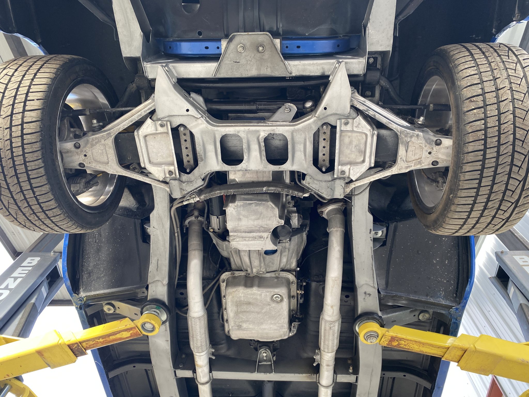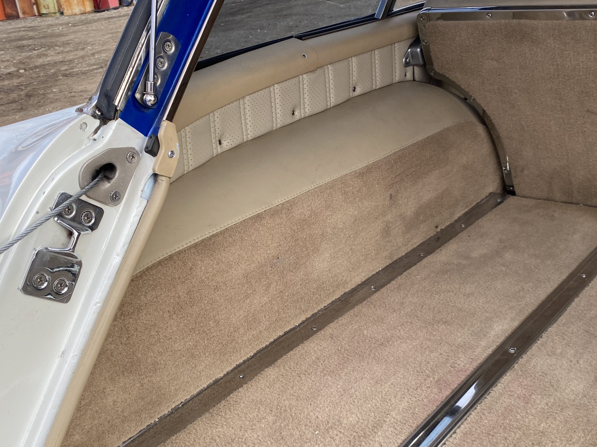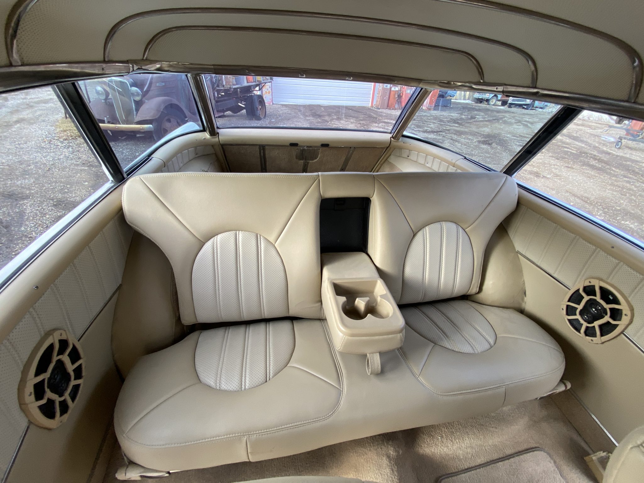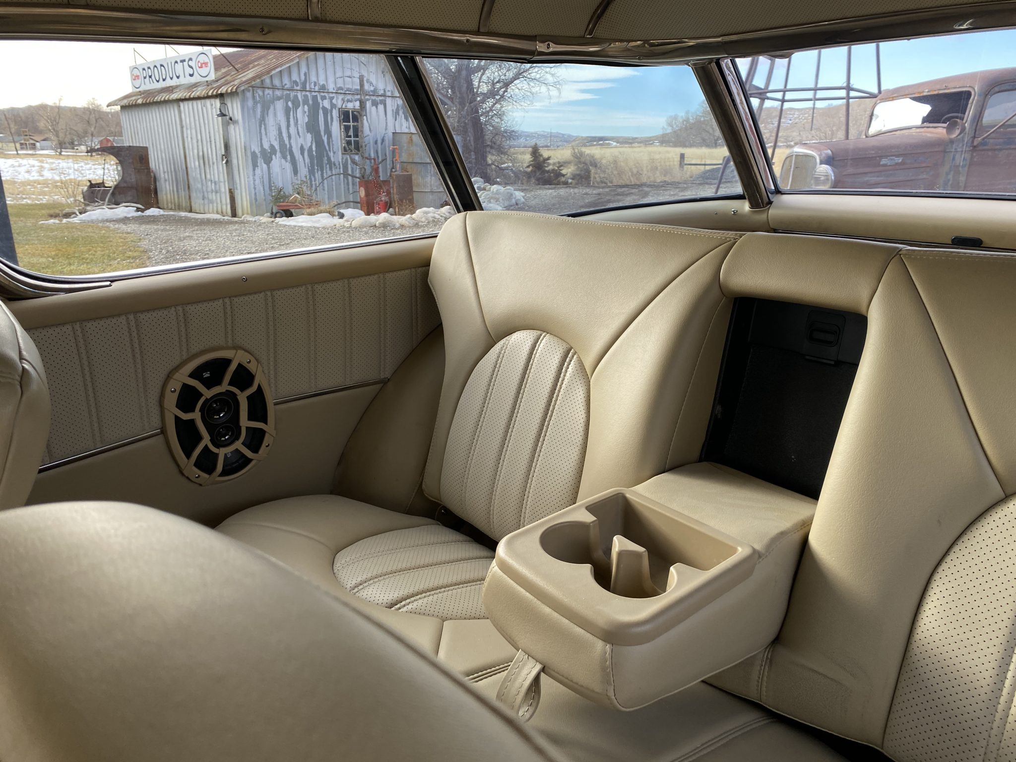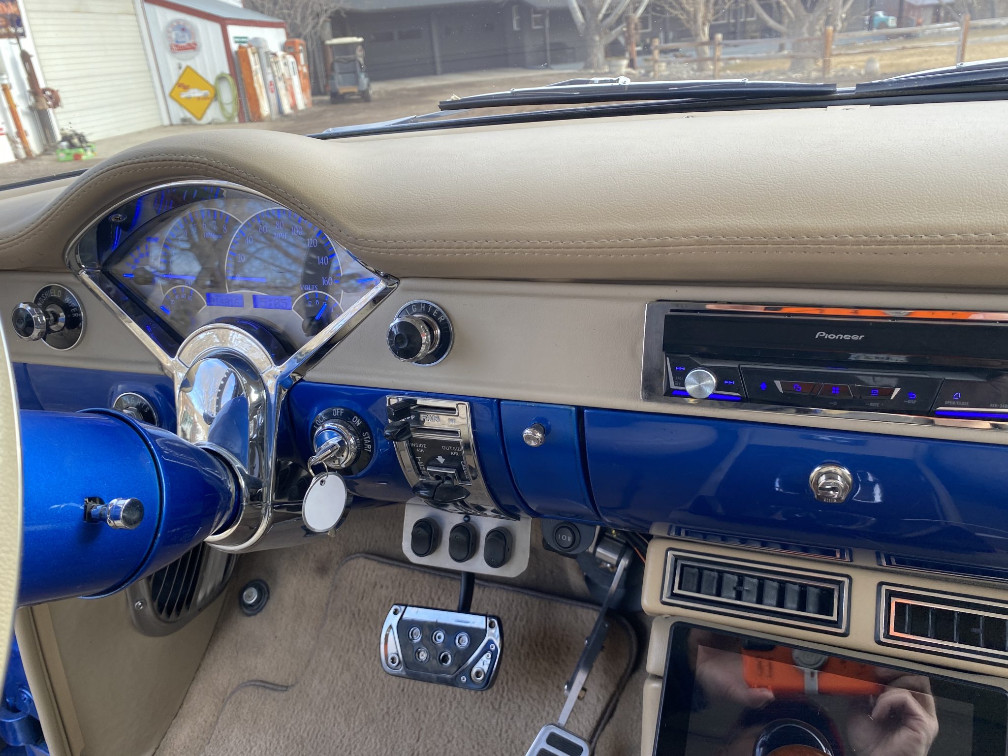 This 1956 Chevrolet Bel Air Nomad was modified with the installation of a 6.0-liter Vortec V8, a 4L65E four-speed automatic transmission, and C4 Corvette suspension, steering, and braking components. The build also utilized a Dana rear end, Edelbrock fuel injection, and a TCI transmission controller. The wagon was painted in a blue and white combination, and it rides on 18″ and 19″ C6 wheels. Inside, the front bucket seats and rear bench are trimmed in tan leather, and features include air conditioning, power windows, cruise control, Dakota Digital gauges, and a Pioneer head unit linked to aftermarket speakers and a back-up camera.