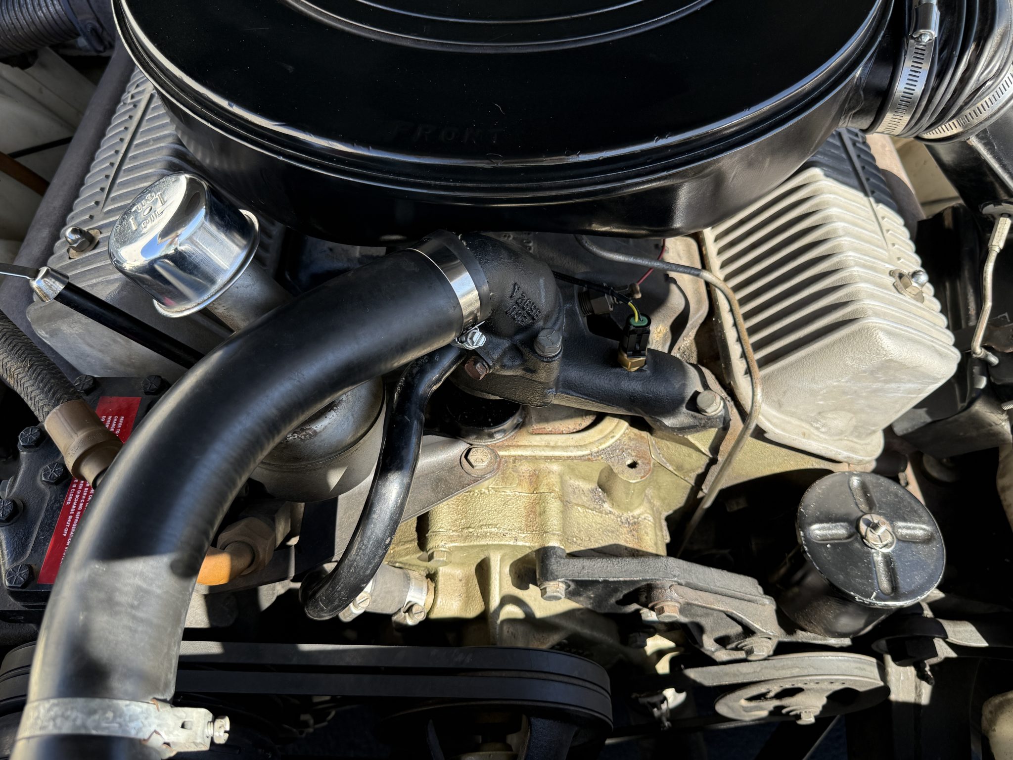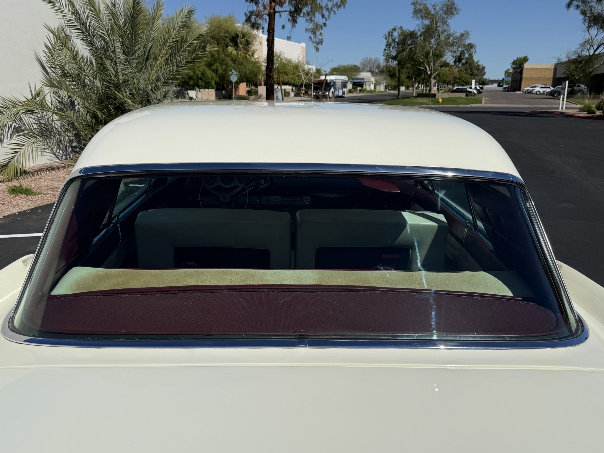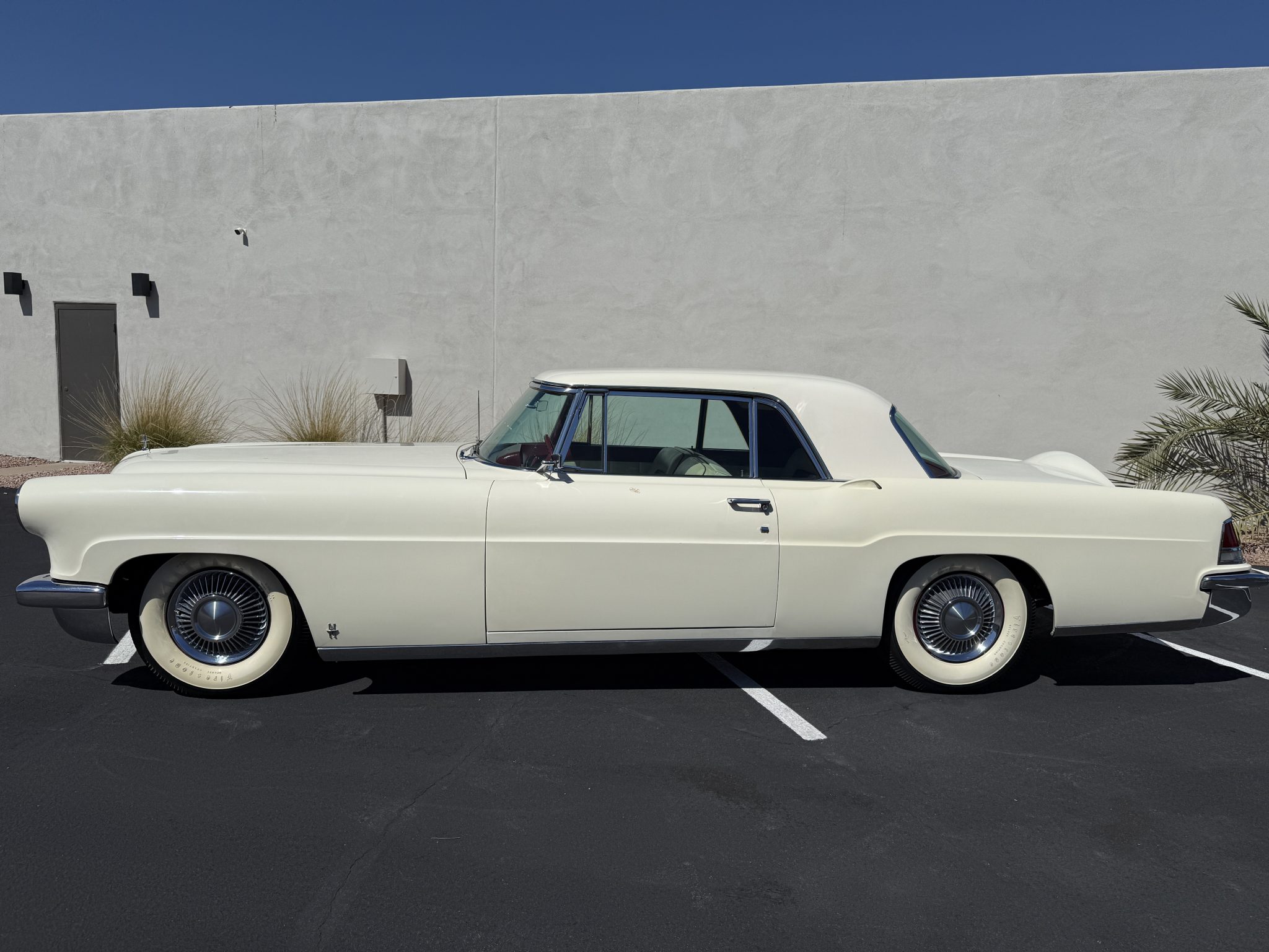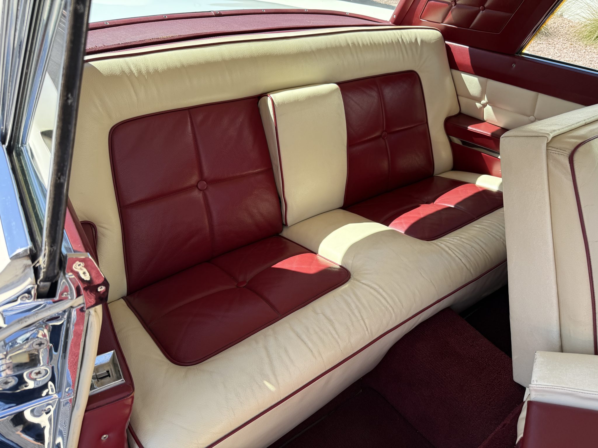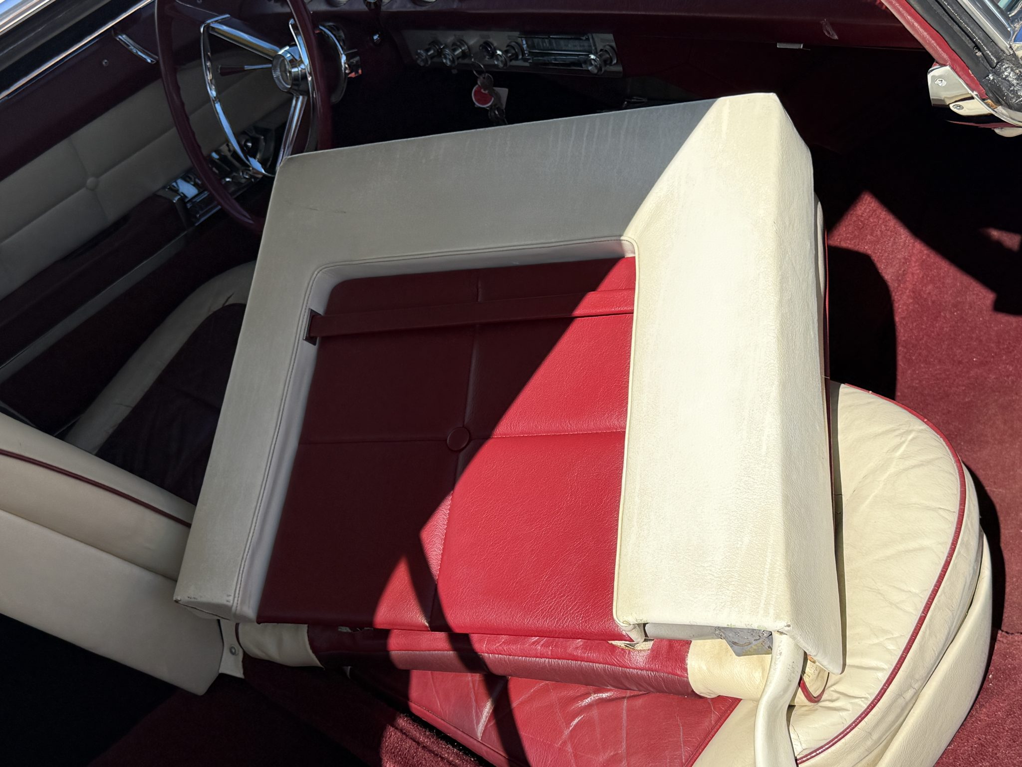It is powered by a 368ci V8 paired with a three-speed automatic transmission and is finished in white over white and red leather upholstery. Air conditioning and red-finished 15″ steel wheels were optioned from the factory, and equipment also includes a limited-slip differential, power steering, an egg-crate grille, a driver-side mirror, an antenna, an AM radio, and a power-adjustable front bench seat.