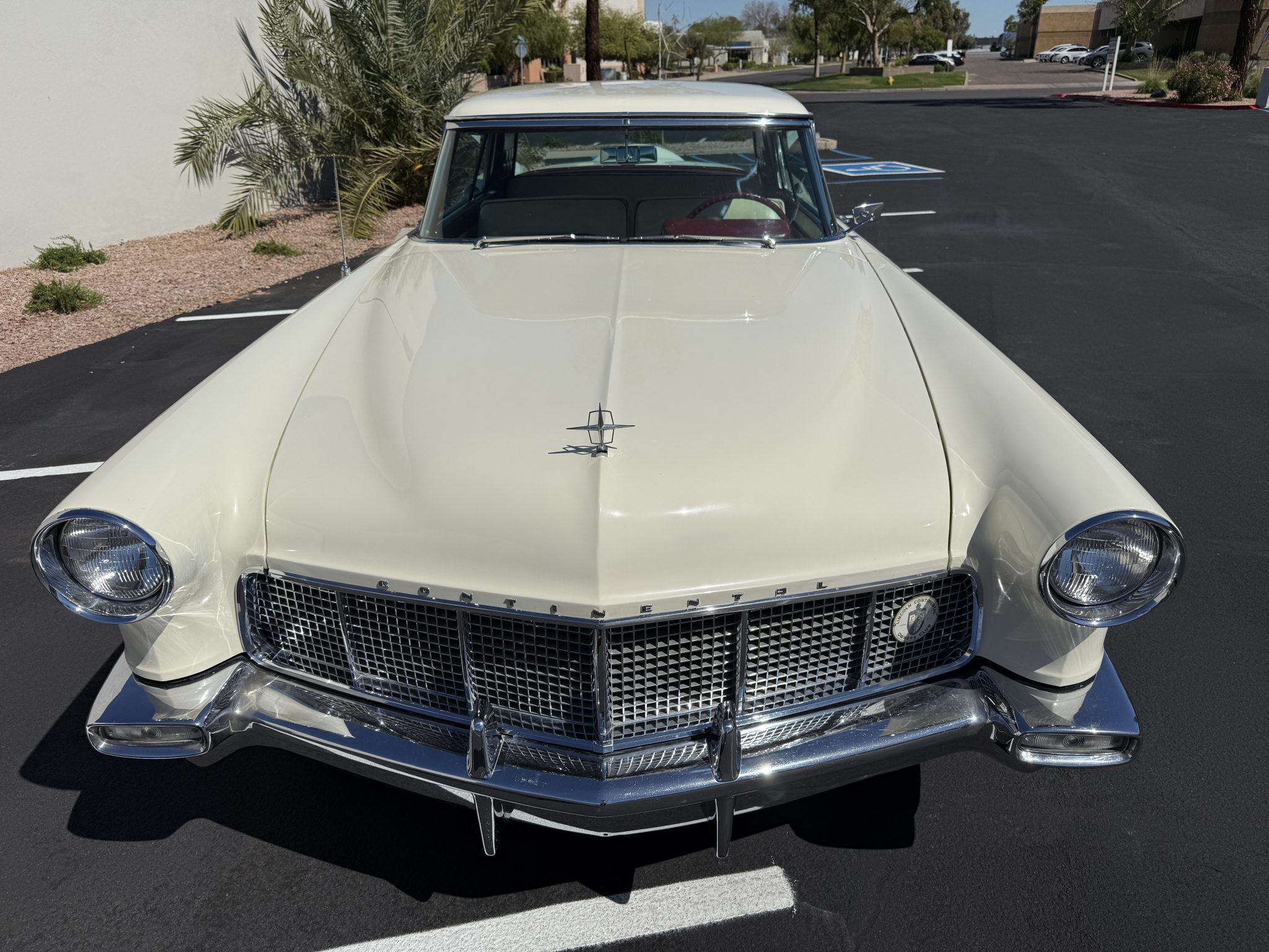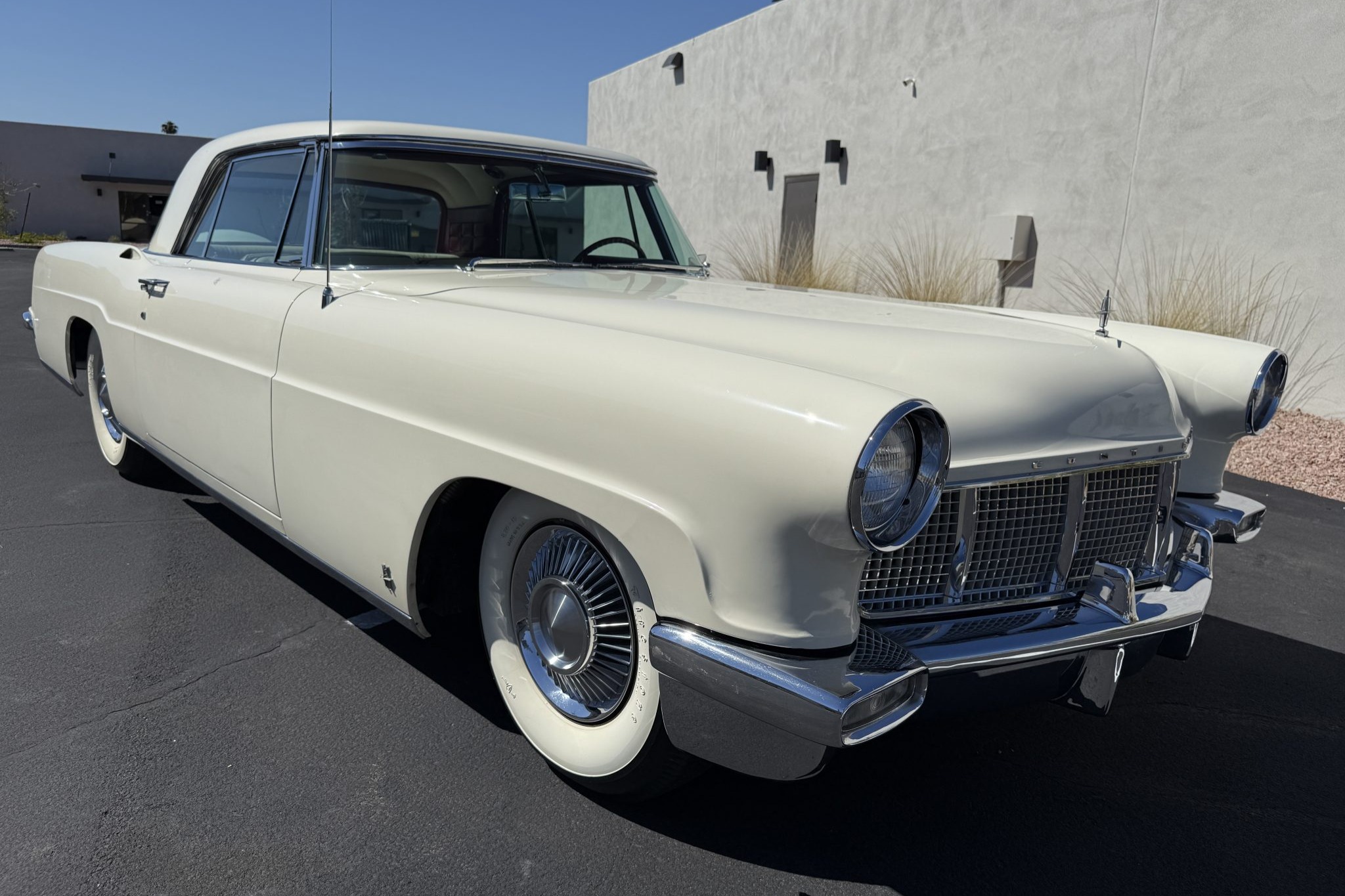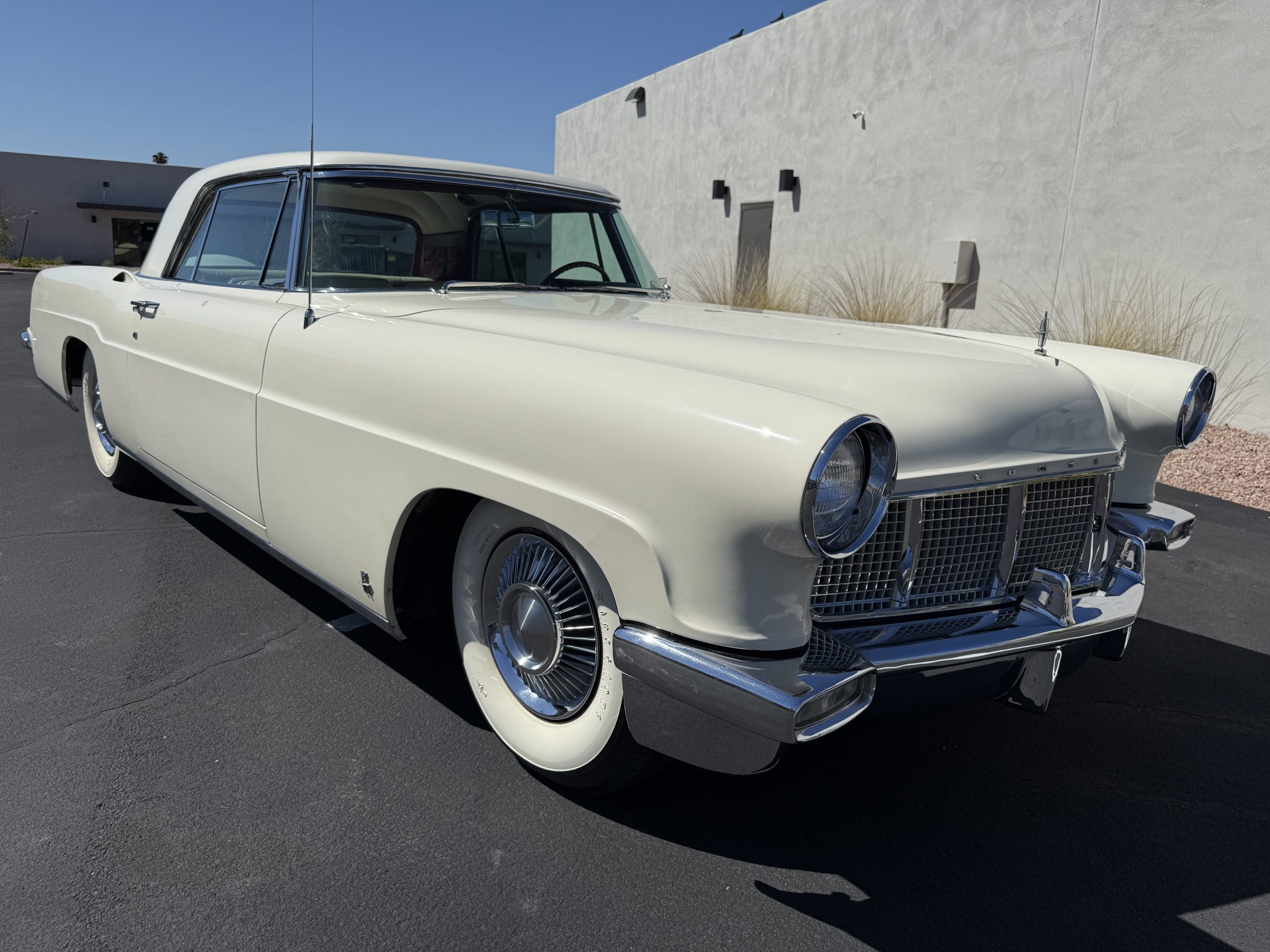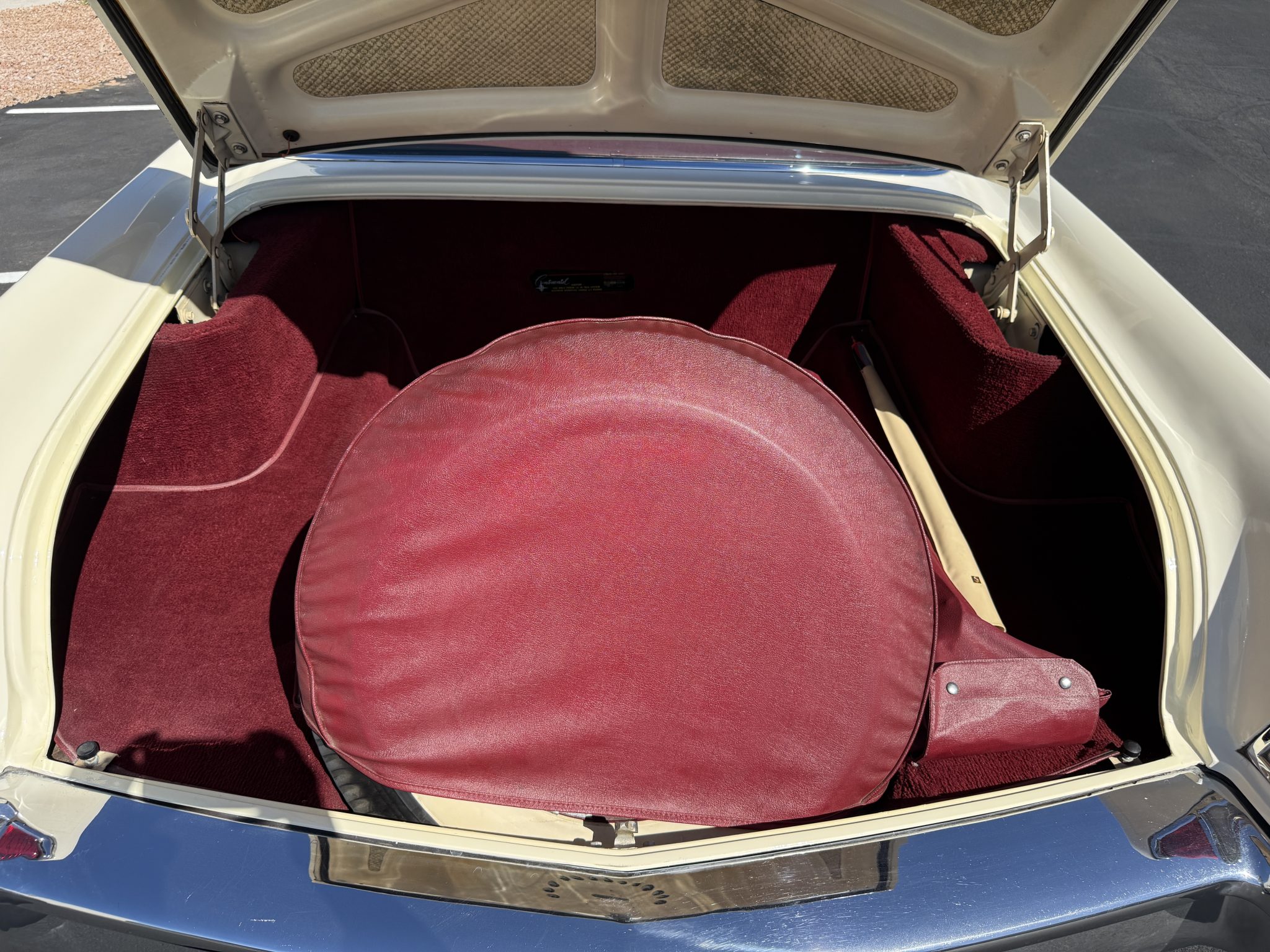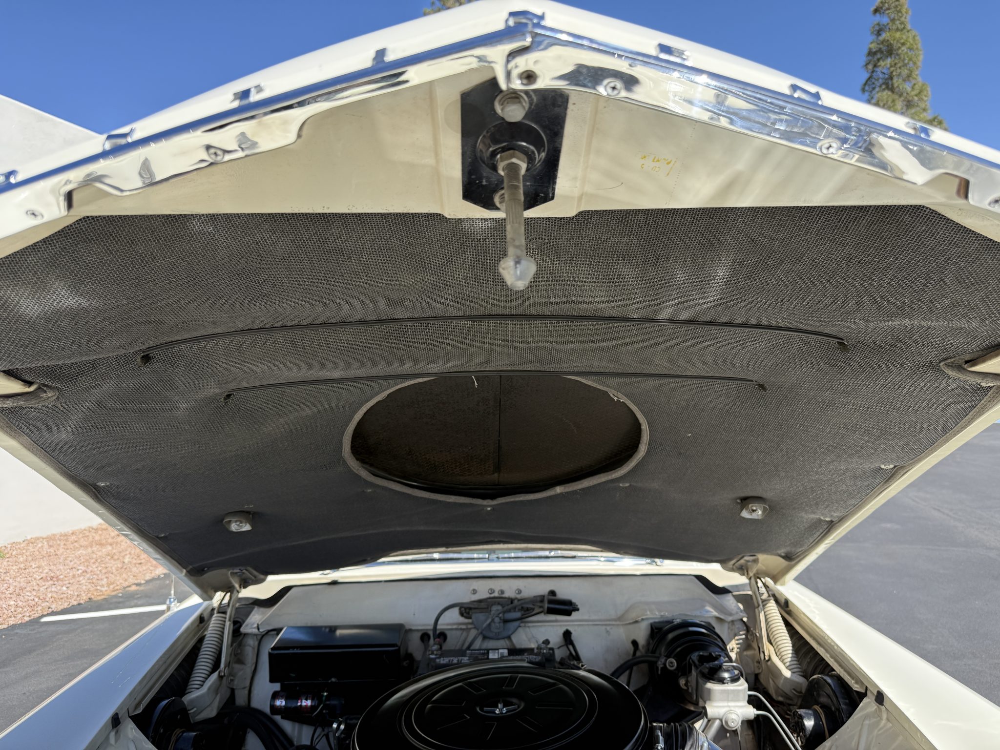 It is powered by a 368ci V8 paired with a three-speed automatic transmission and is finished in white over white and red leather upholstery. Air conditioning and red-finished 15″ steel wheels were optioned from the factory, and equipment also includes a limited-slip differential, power steering, an egg-crate grille, a driver-side mirror, an antenna, an AM radio, and a power-adjustable front bench seat.