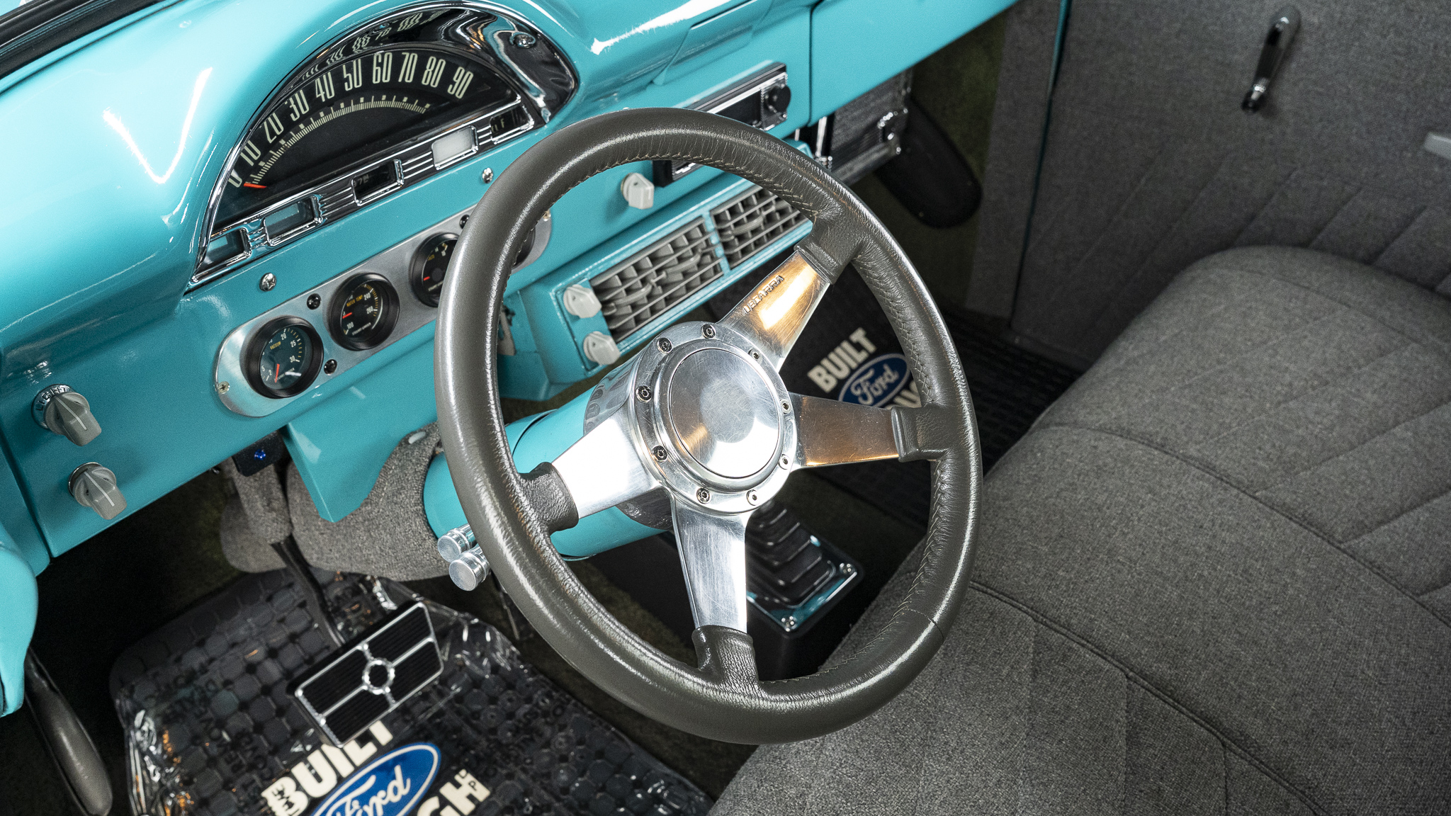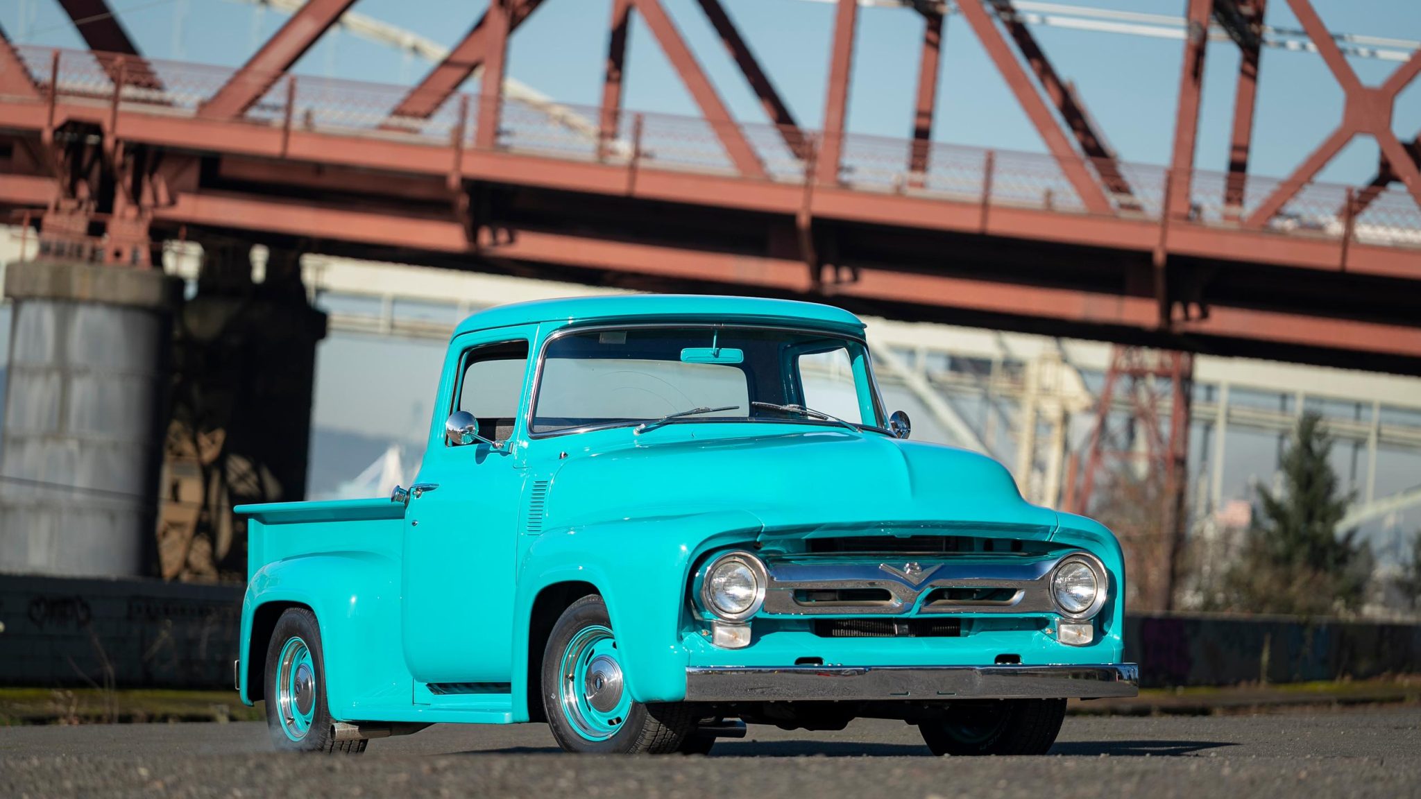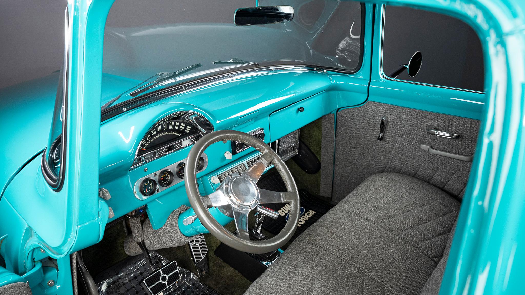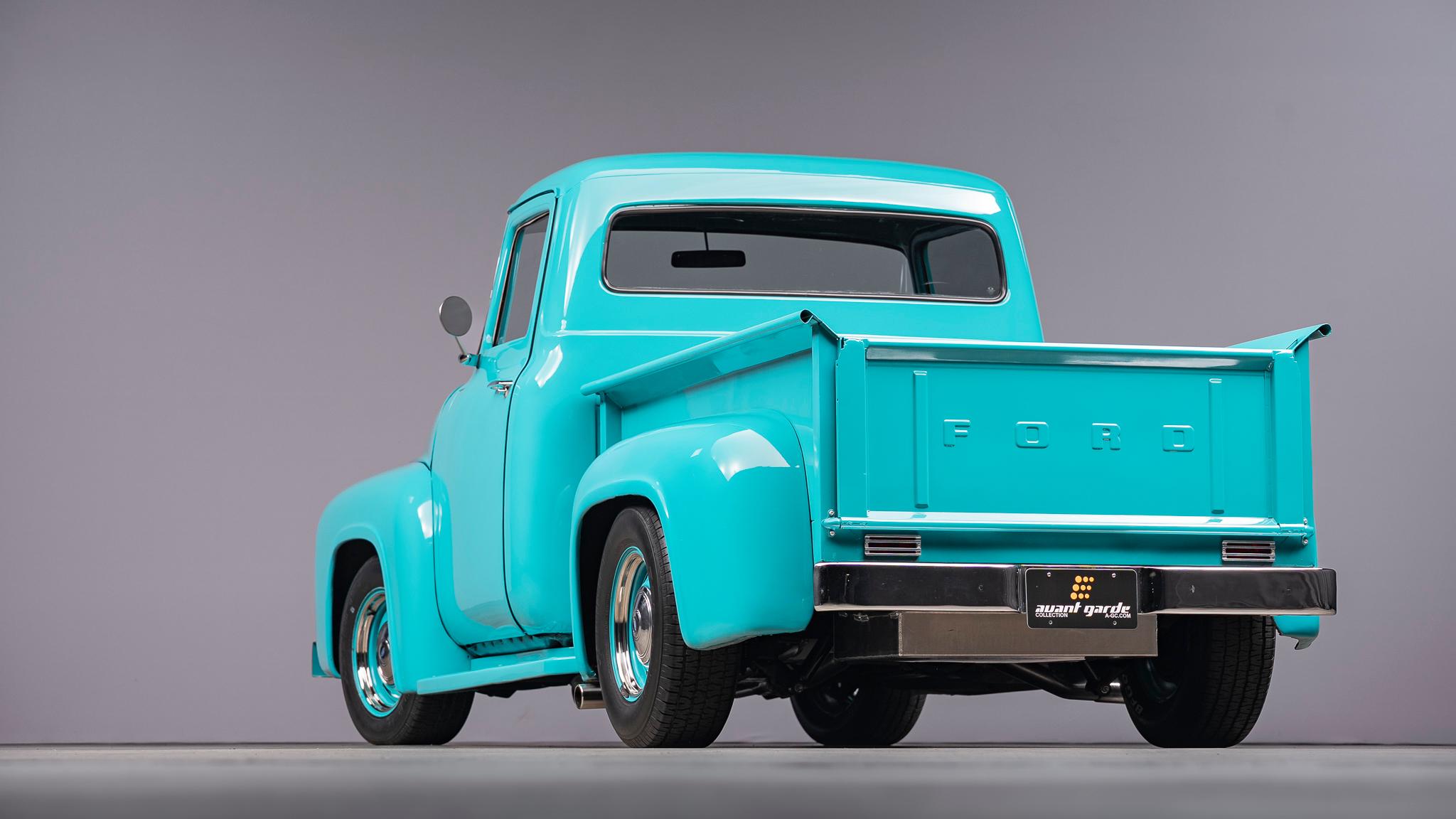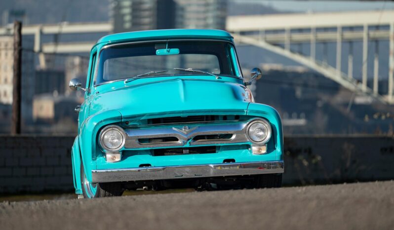 This 1956 Ford F-100 pickup was the subject of a custom build   that involved the installation of a Chevrolet 350ci V8, a TH350 three-speed automatic transmission, and a 10-bolt rear end as well as an independent front suspension assembly from a later GM passenger car. The body is finished in teal and features a tilt hood, smoothed bumpers, running boards, aftermarket taillights, and a wood-lined bed with hidden tailgate latches fashioned from GM seatbelt buckles. Inside the cab, gray cloth upholstery covers the bench seat, headliner, door and trim panels, and appointments include an under-dash air conditioner, a digital stereo unit, a B&M shifter, an alarm system, and power door locks. Additional equipment includes power steering, power-assisted front disc brakes, 15″ Rally wheels, an Edelbrock intake manifold and carburetor, and a dual exhaust system with coated headers and Flowmaster mufflers.