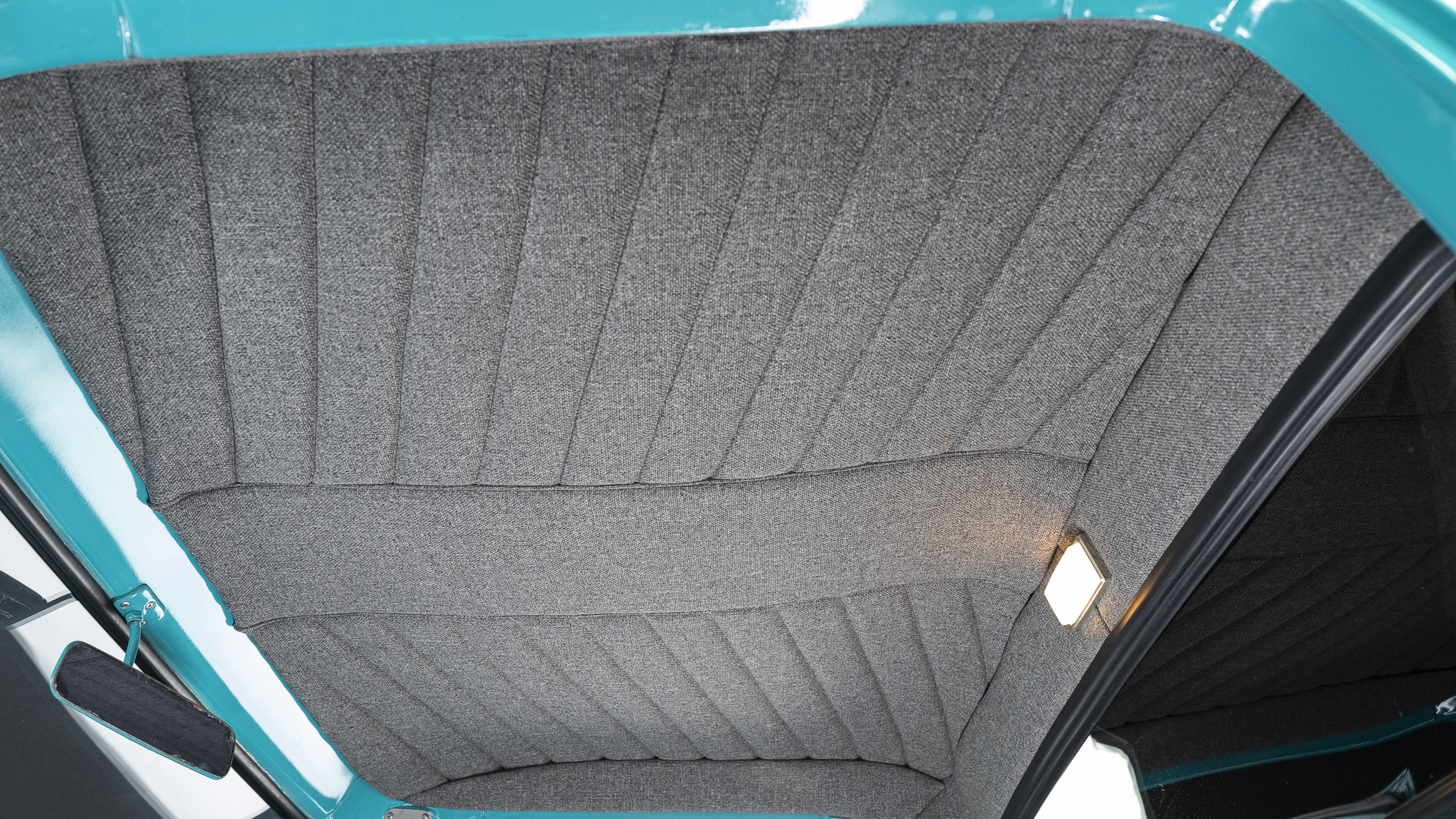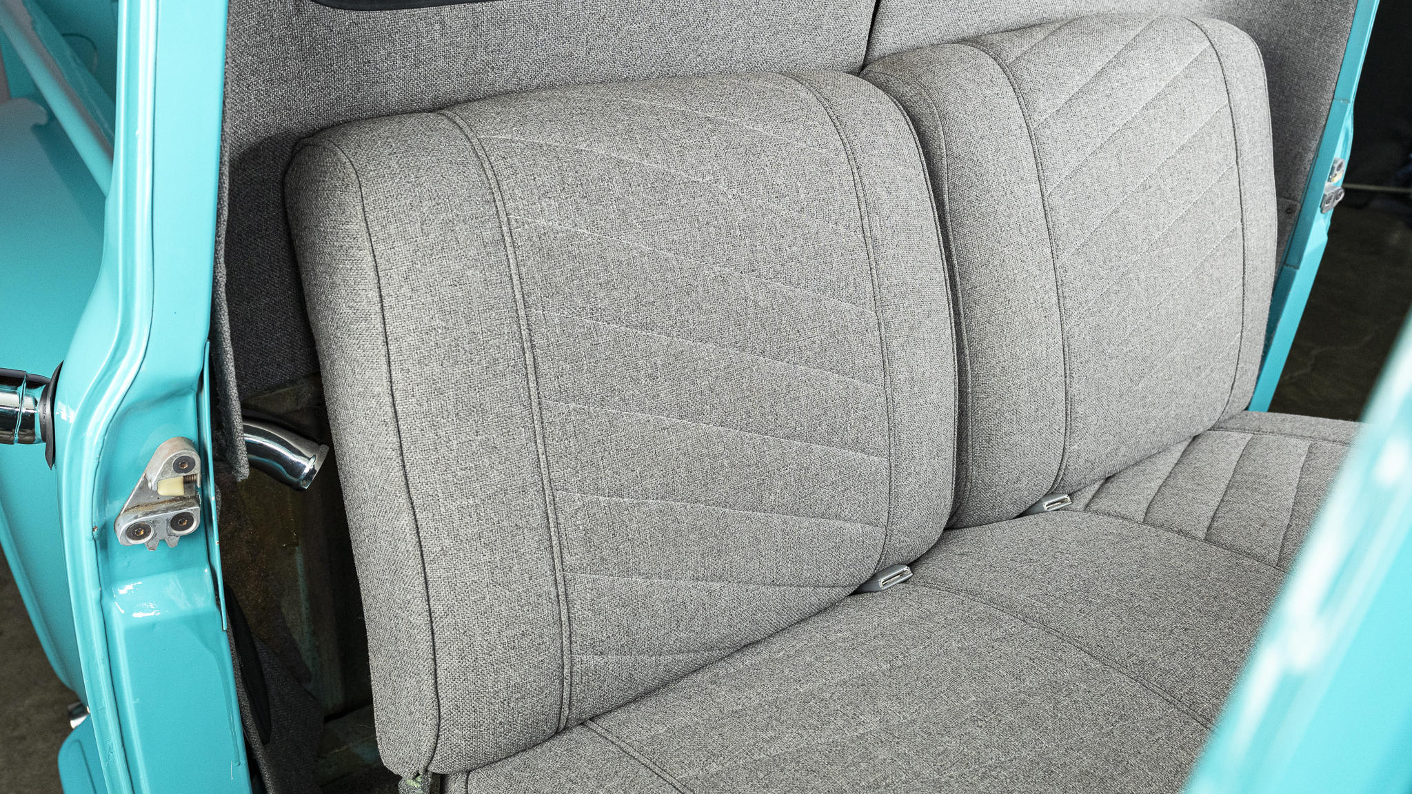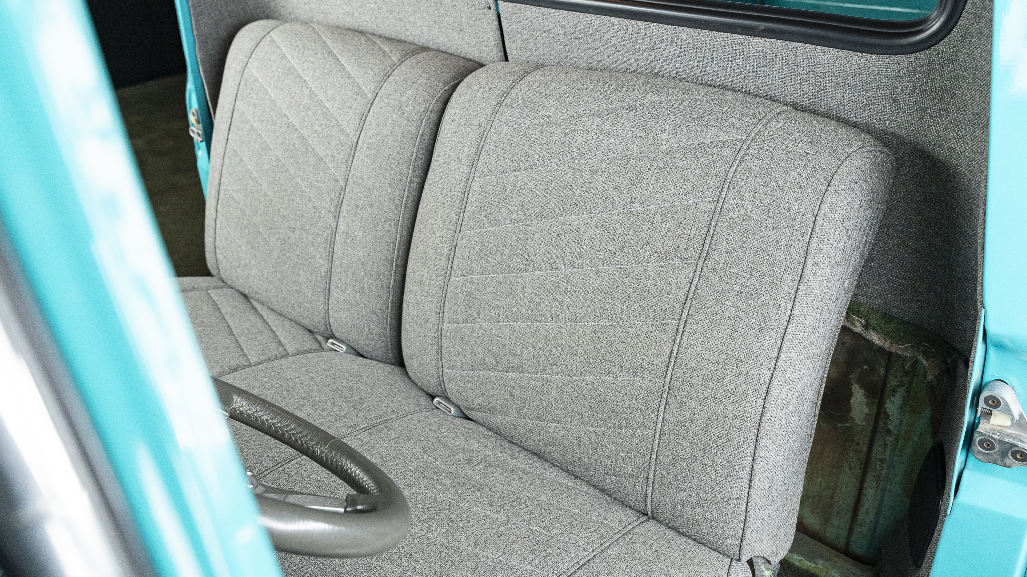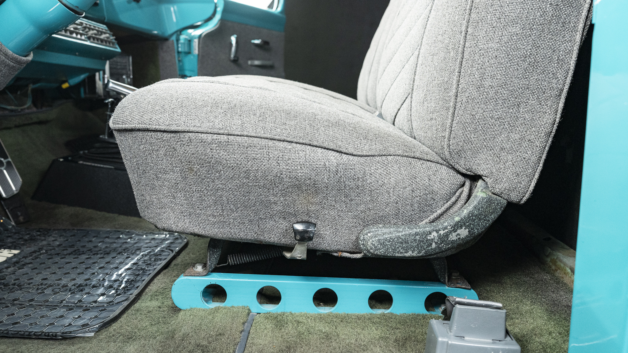 This 1956 Ford F-100 pickup was the subject of a custom build   that involved the installation of a Chevrolet 350ci V8, a TH350 three-speed automatic transmission, and a 10-bolt rear end as well as an independent front suspension assembly from a later GM passenger car. The body is finished in teal and features a tilt hood, smoothed bumpers, running boards, aftermarket taillights, and a wood-lined bed with hidden tailgate latches fashioned from GM seatbelt buckles. Inside the cab, gray cloth upholstery covers the bench seat, headliner, door and trim panels, and appointments include an under-dash air conditioner, a digital stereo unit, a B&M shifter, an alarm system, and power door locks. Additional equipment includes power steering, power-assisted front disc brakes, 15″ Rally wheels, an Edelbrock intake manifold and carburetor, and a dual exhaust system with coated headers and Flowmaster mufflers.