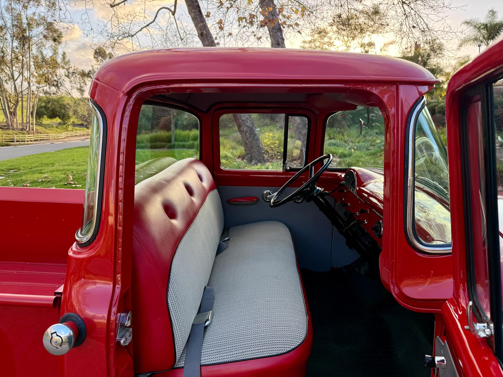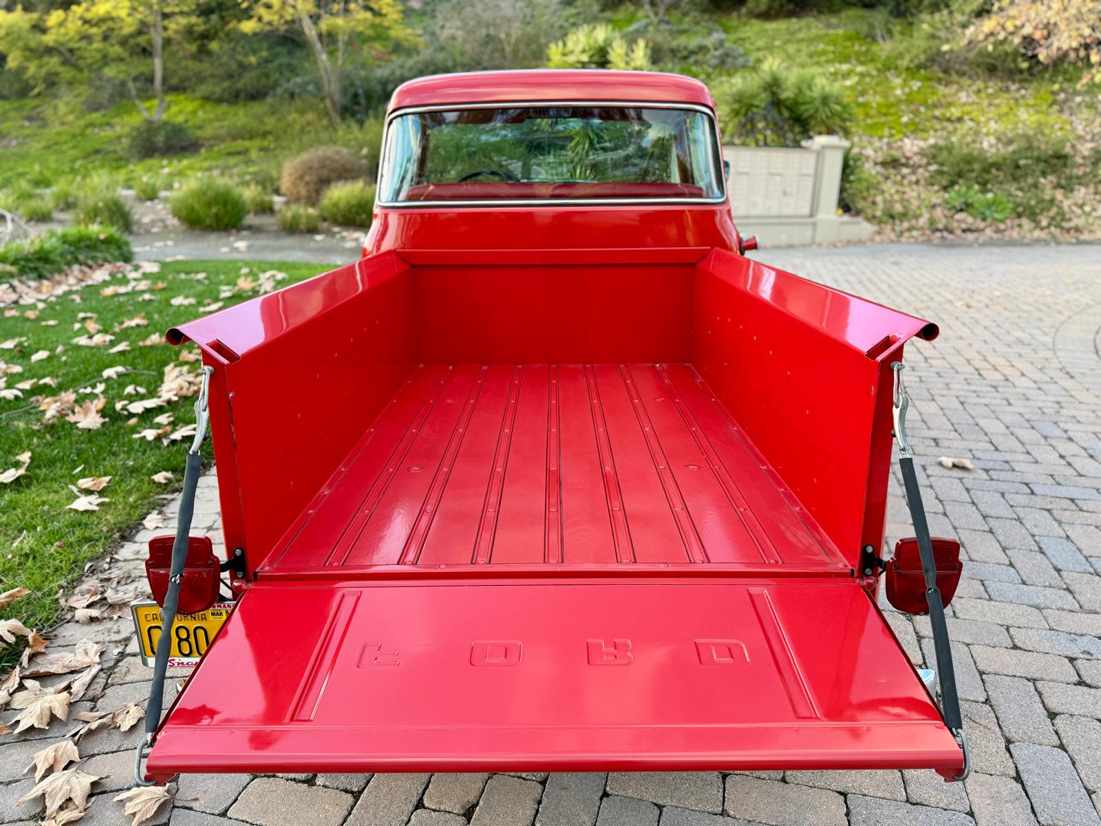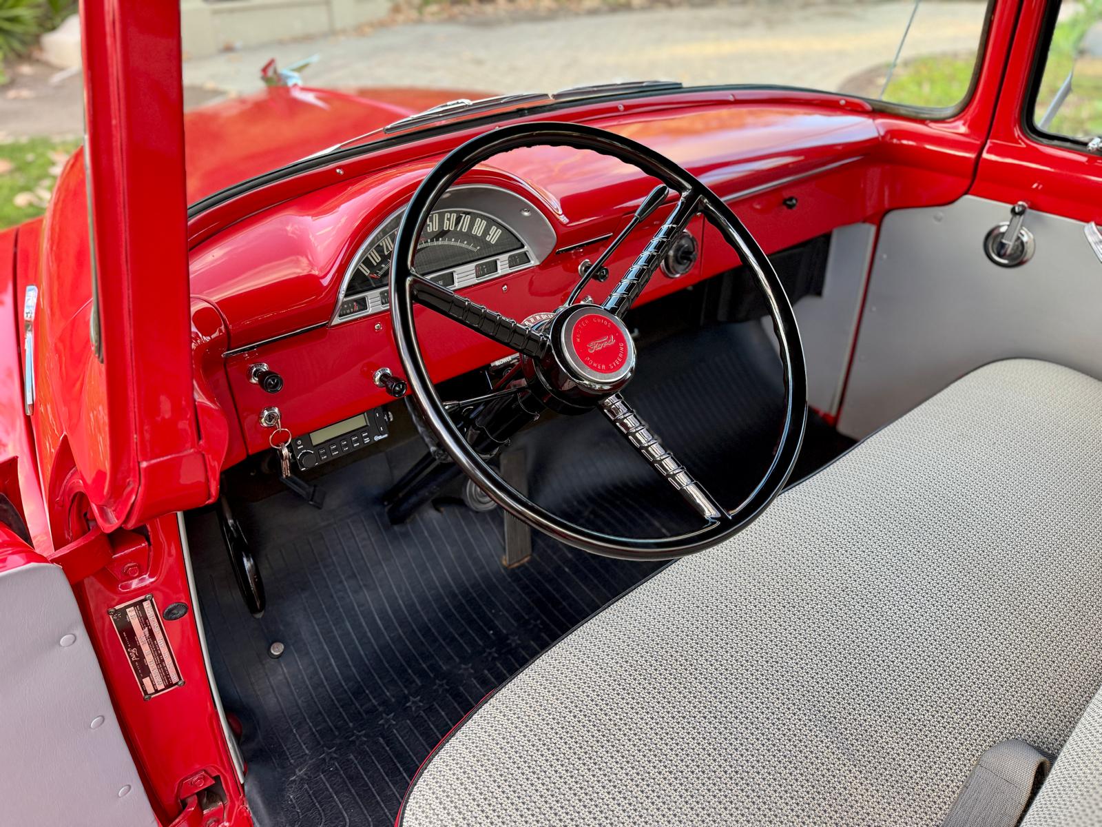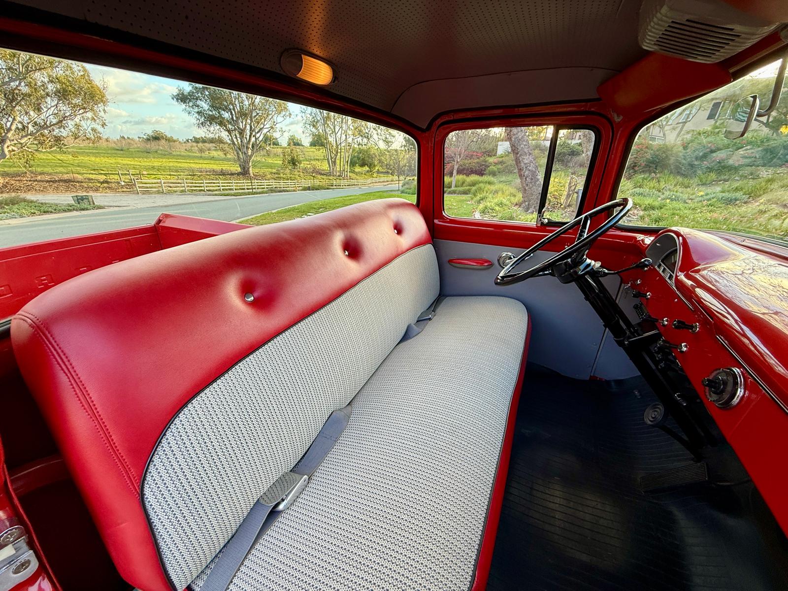 The truck is finished in red over red and gray upholstery and is powered by a 272ci Power King Y-block V8 paired with a three-speed automatic transmission. Equipment includes 15″ steel wheels, a wood bed floor, a wraparound windshield and rear window, a Custom Autosound stereo, and a heater.