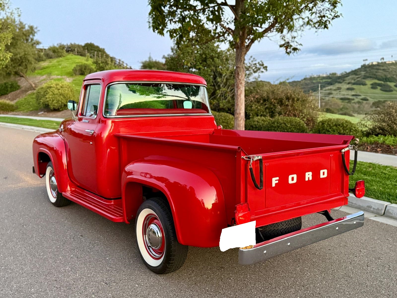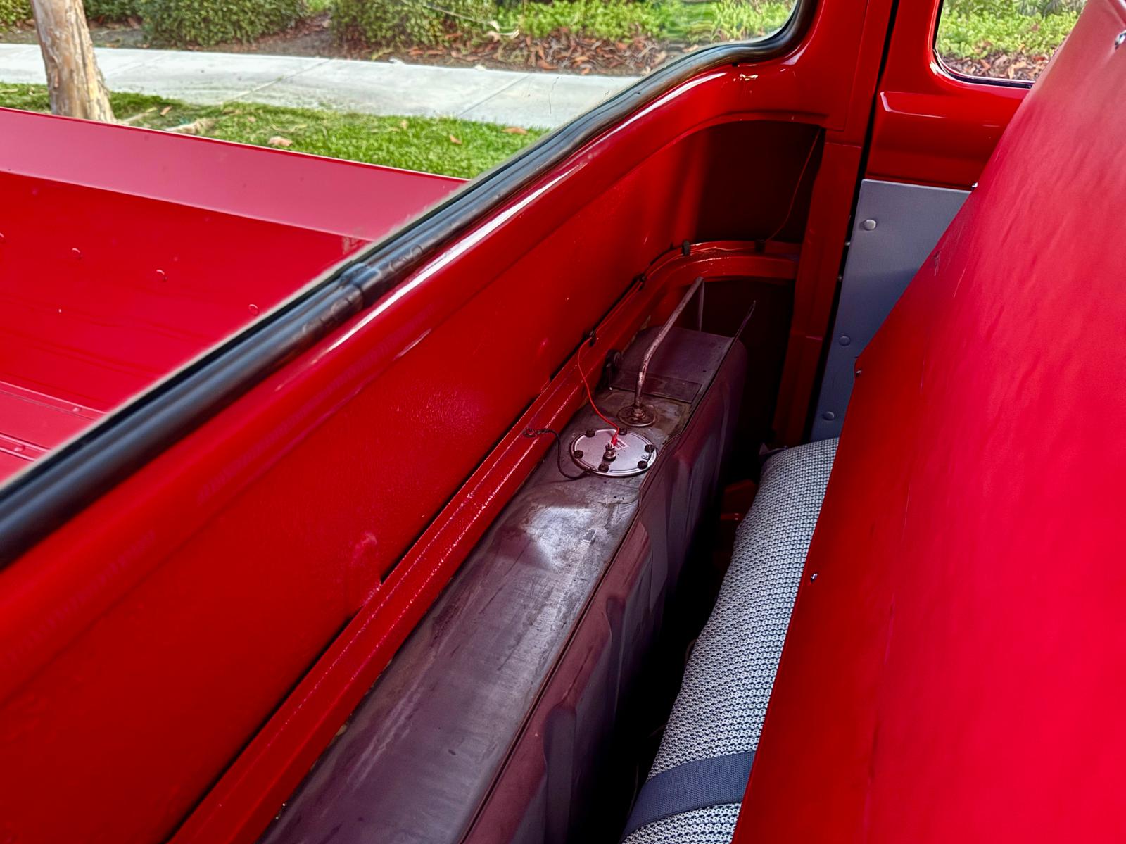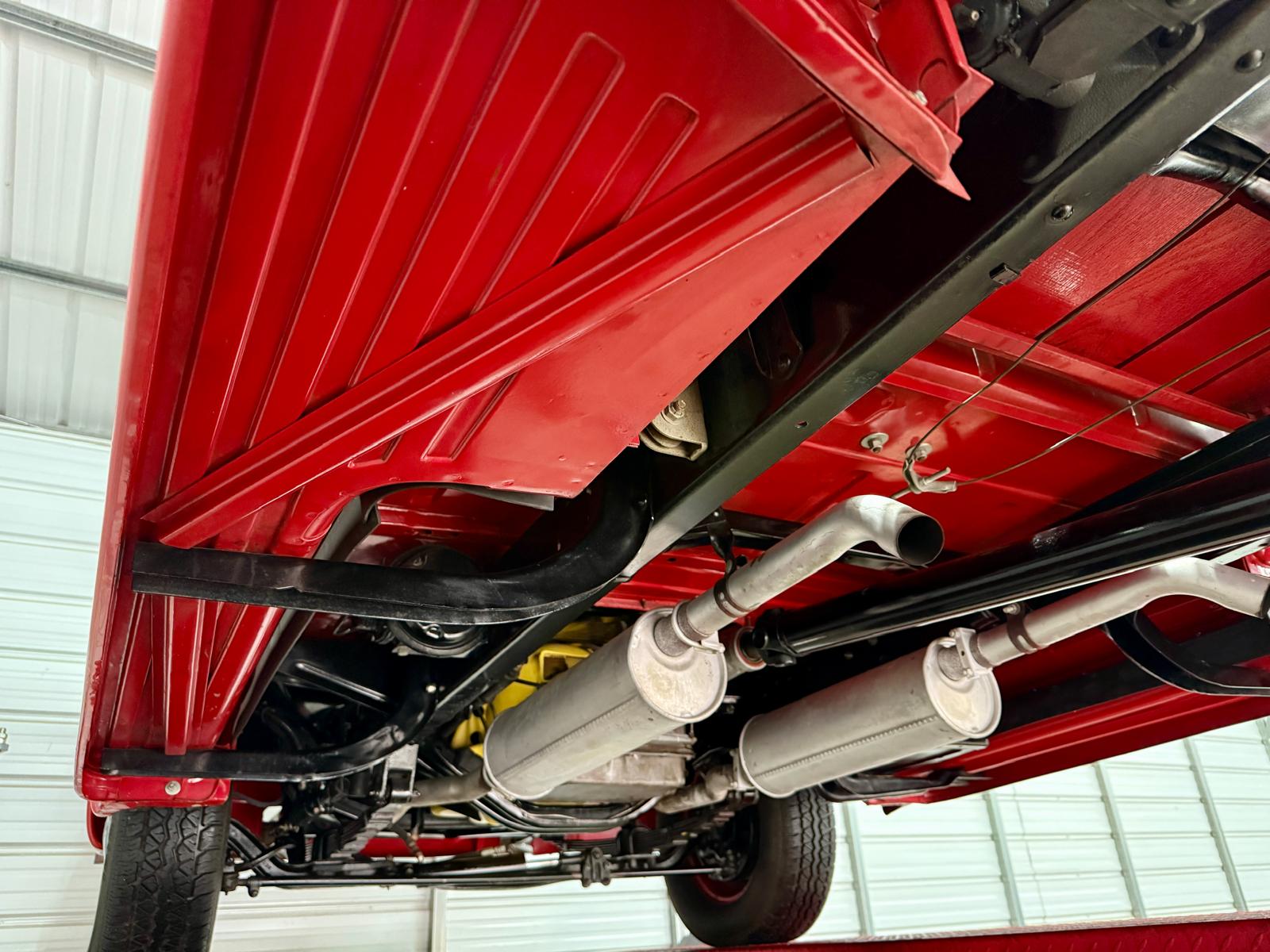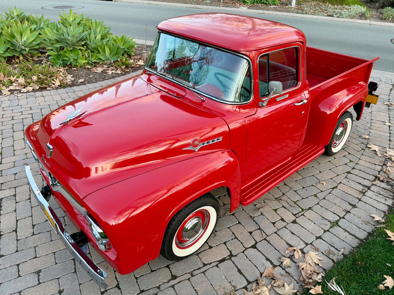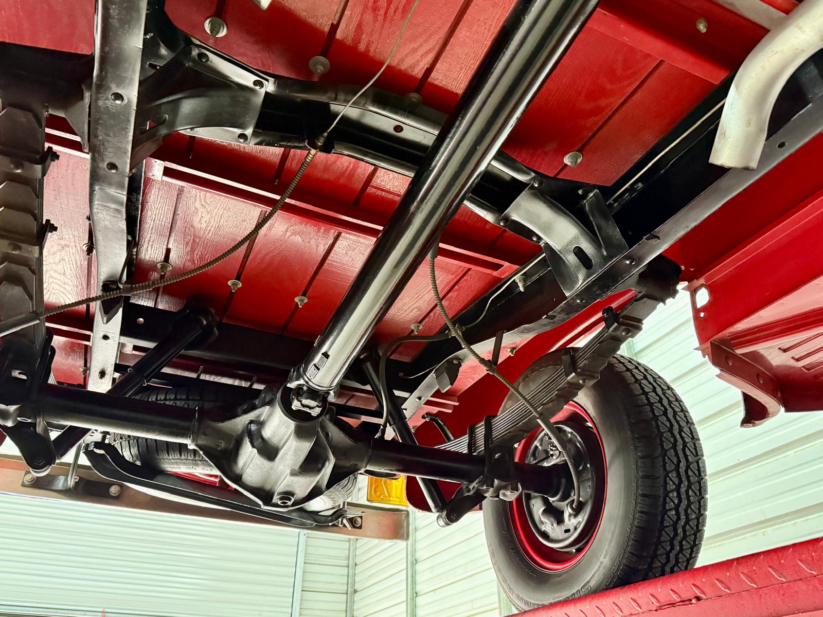 The truck is finished in red over red and gray upholstery and is powered by a 272ci Power King Y-block V8 paired with a three-speed automatic transmission. Equipment includes 15″ steel wheels, a wood bed floor, a wraparound windshield and rear window, a Custom Autosound stereo, and a heater.