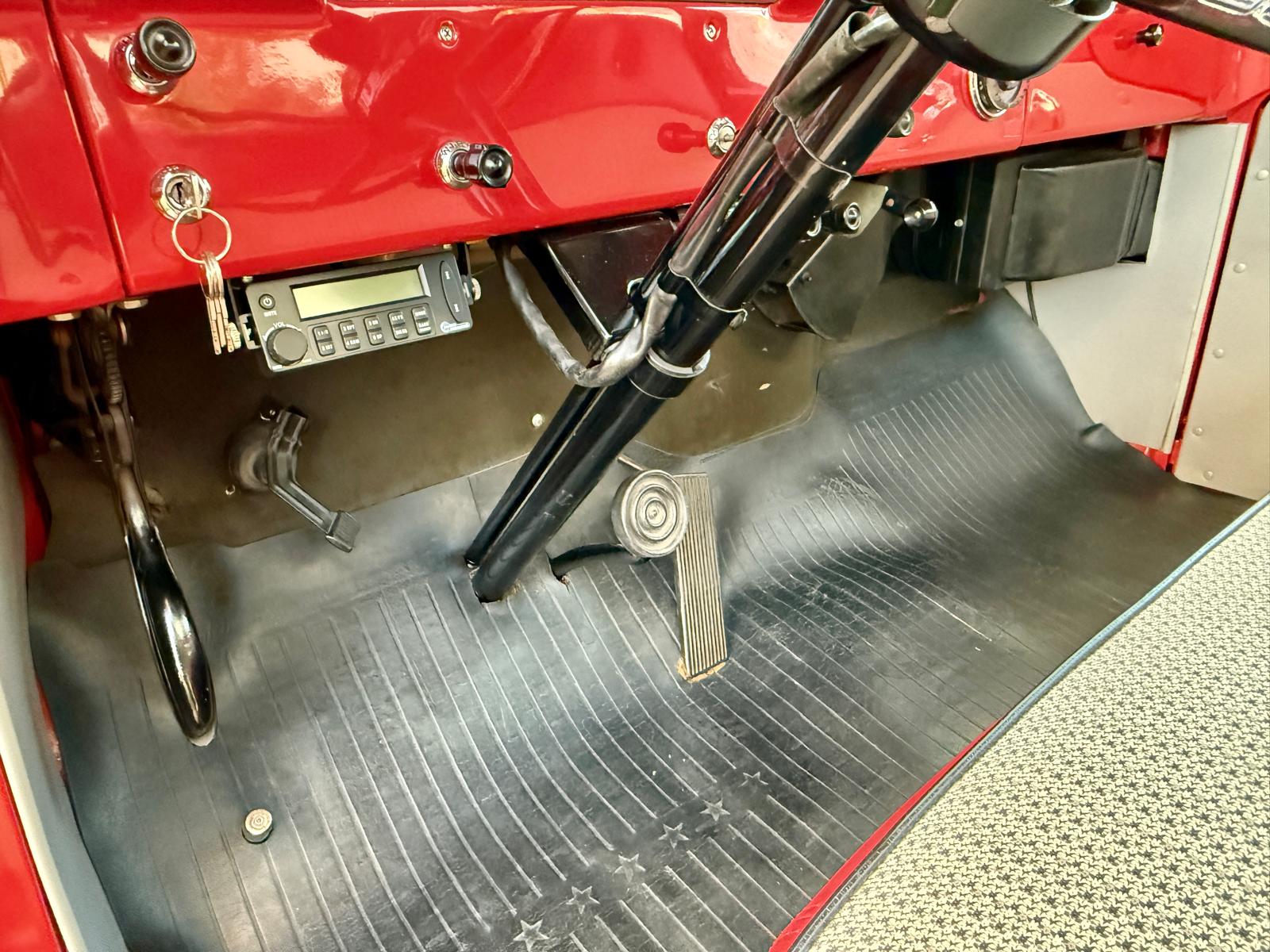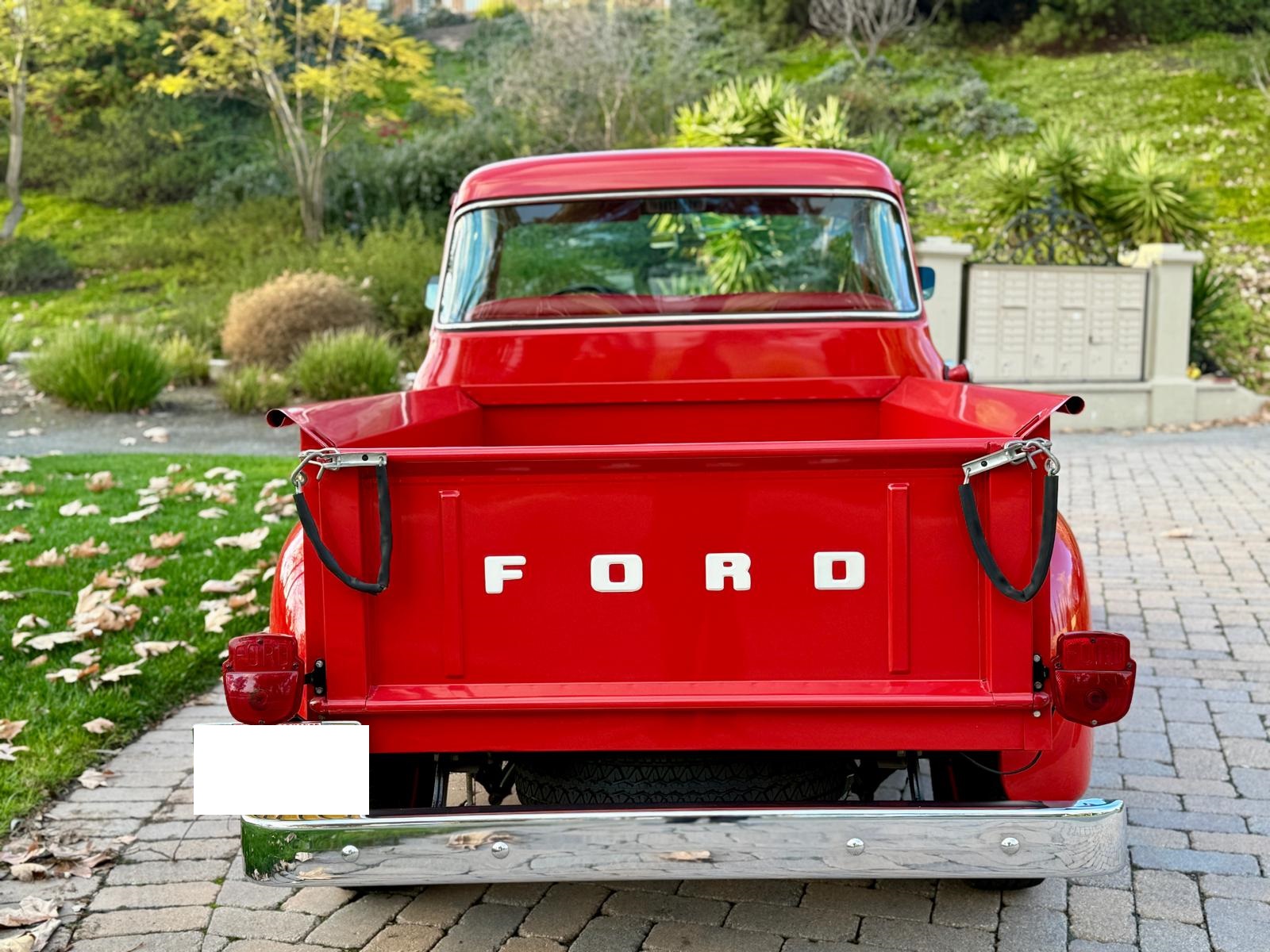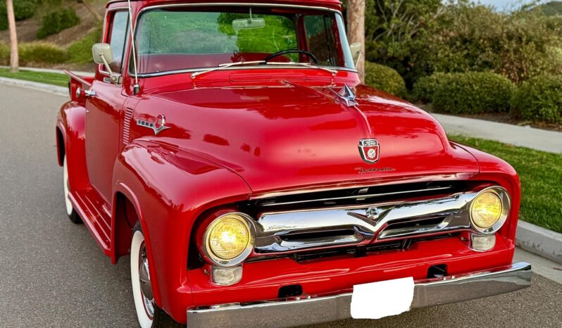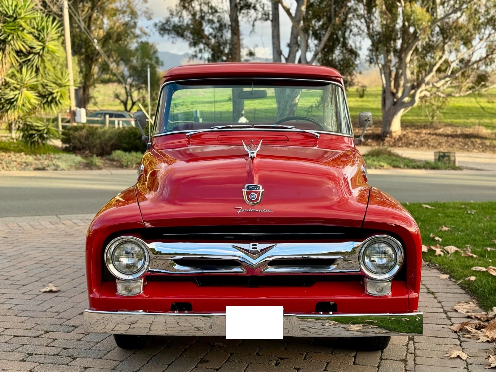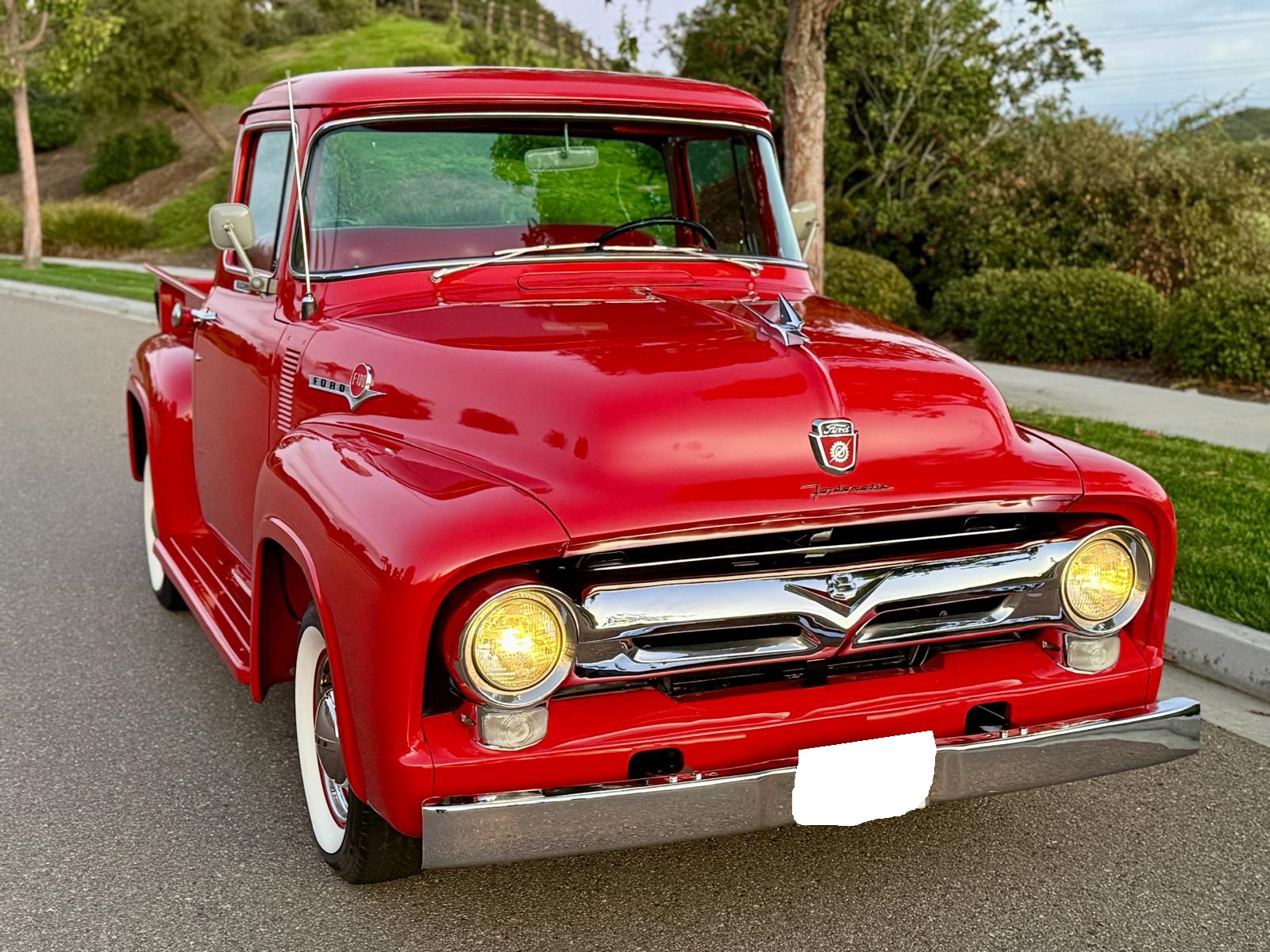The truck is finished in red over red and gray upholstery and is powered by a 272ci Power King Y-block V8 paired with a three-speed automatic transmission. Equipment includes 15″ steel wheels, a wood bed floor, a wraparound windshield and rear window, a Custom Autosound stereo, and a heater.