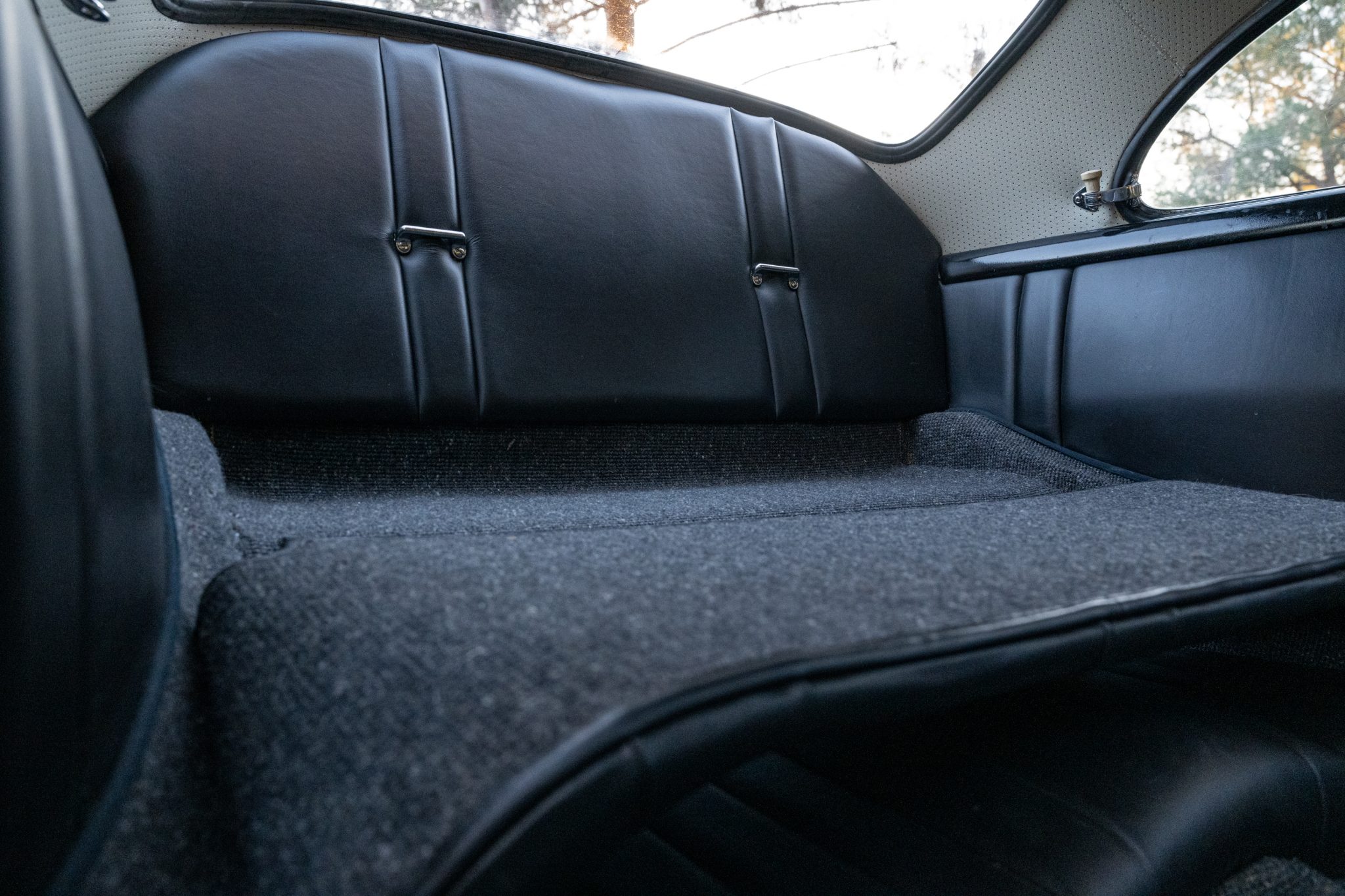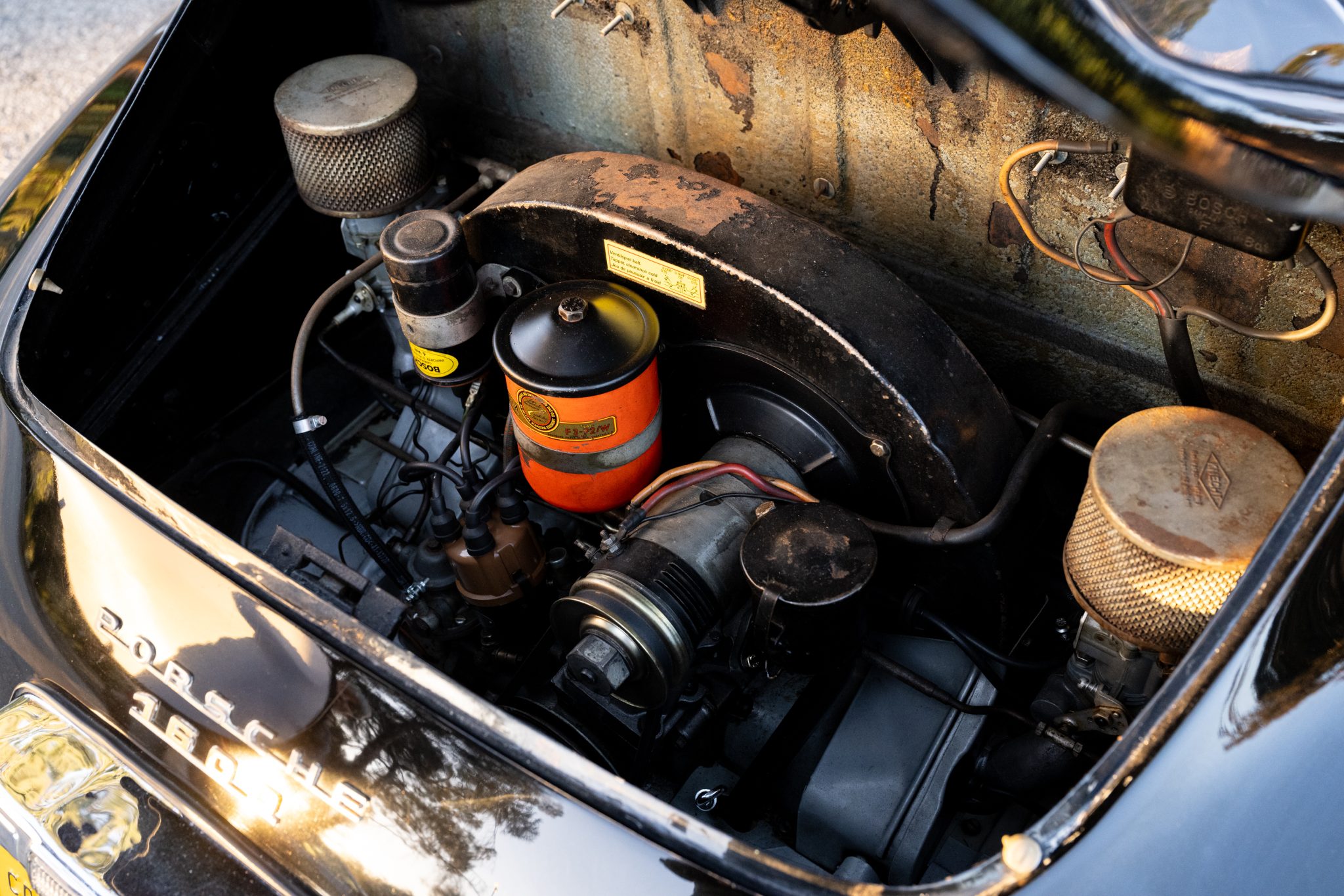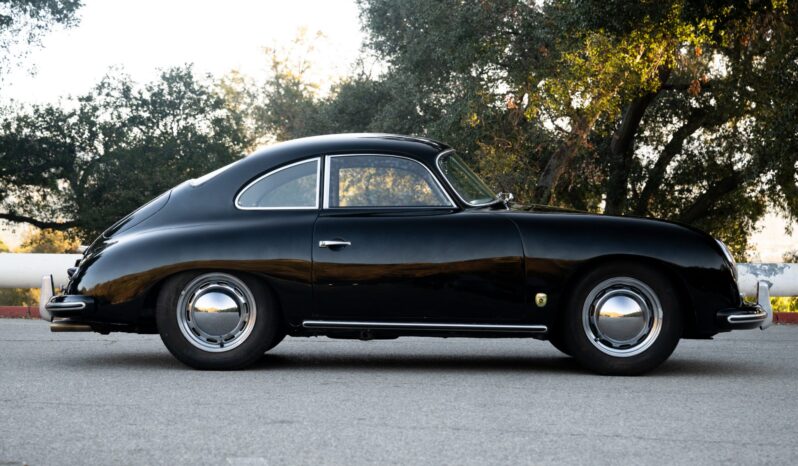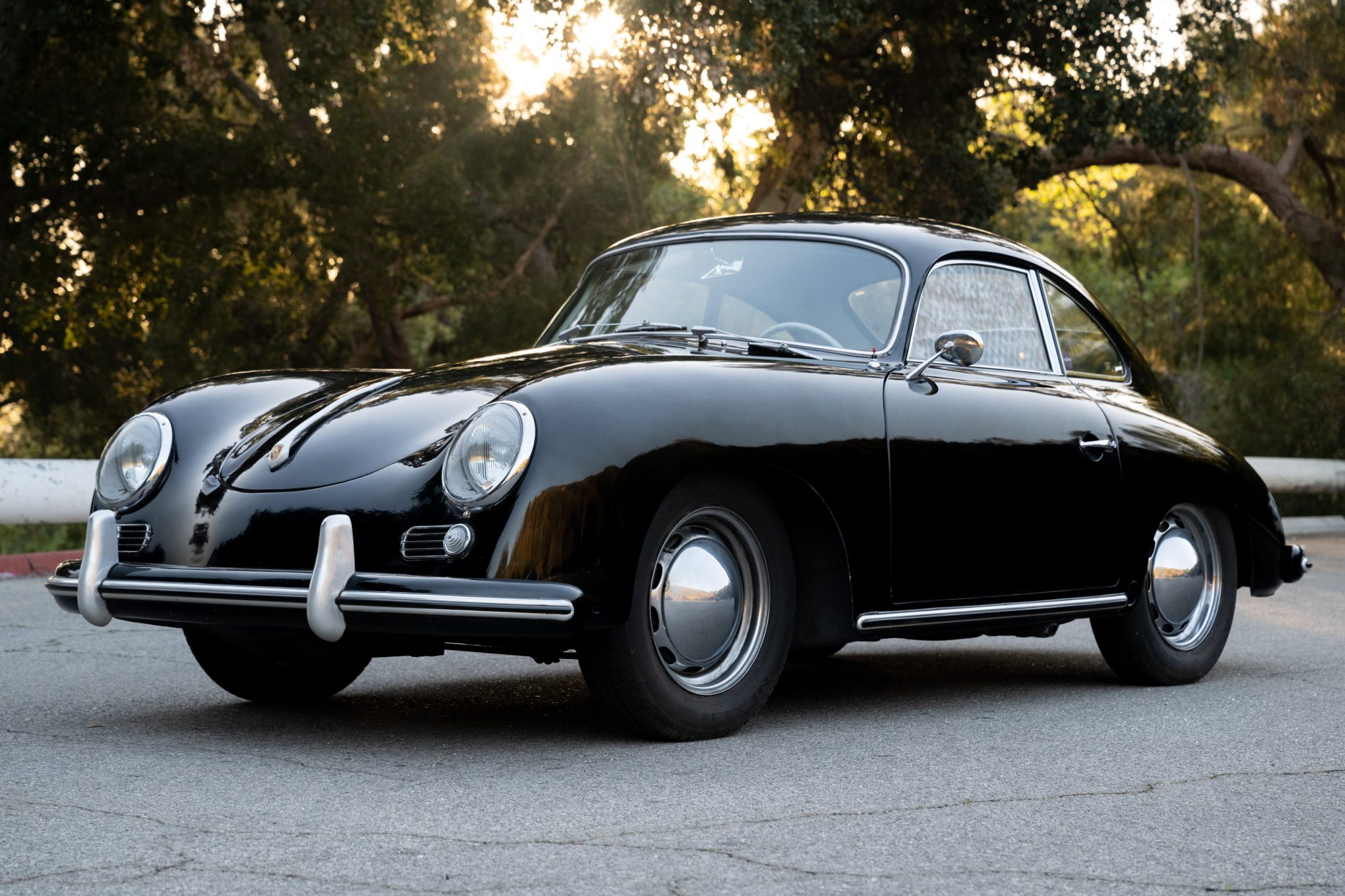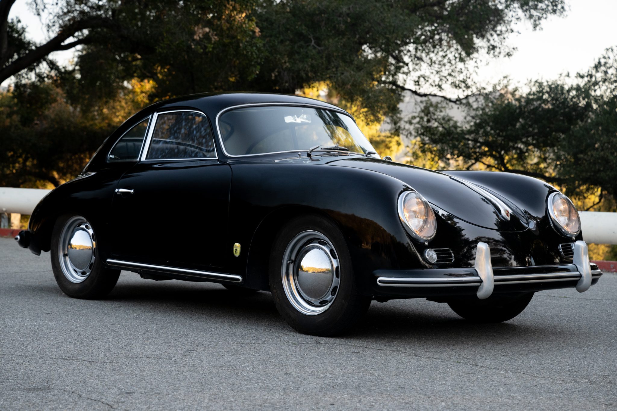 This 1956 Porsche 356A coupe is finished in black over black leather. The car is powered by a 1.6-liter flat-four paired with a four-speed manual transaxle, and features include 15″ ventilated steel wheels, a driver-side mirror, body-color bumpers, a Blaupunkt AM/FM radio, a cabin heater, and bucket seats.
