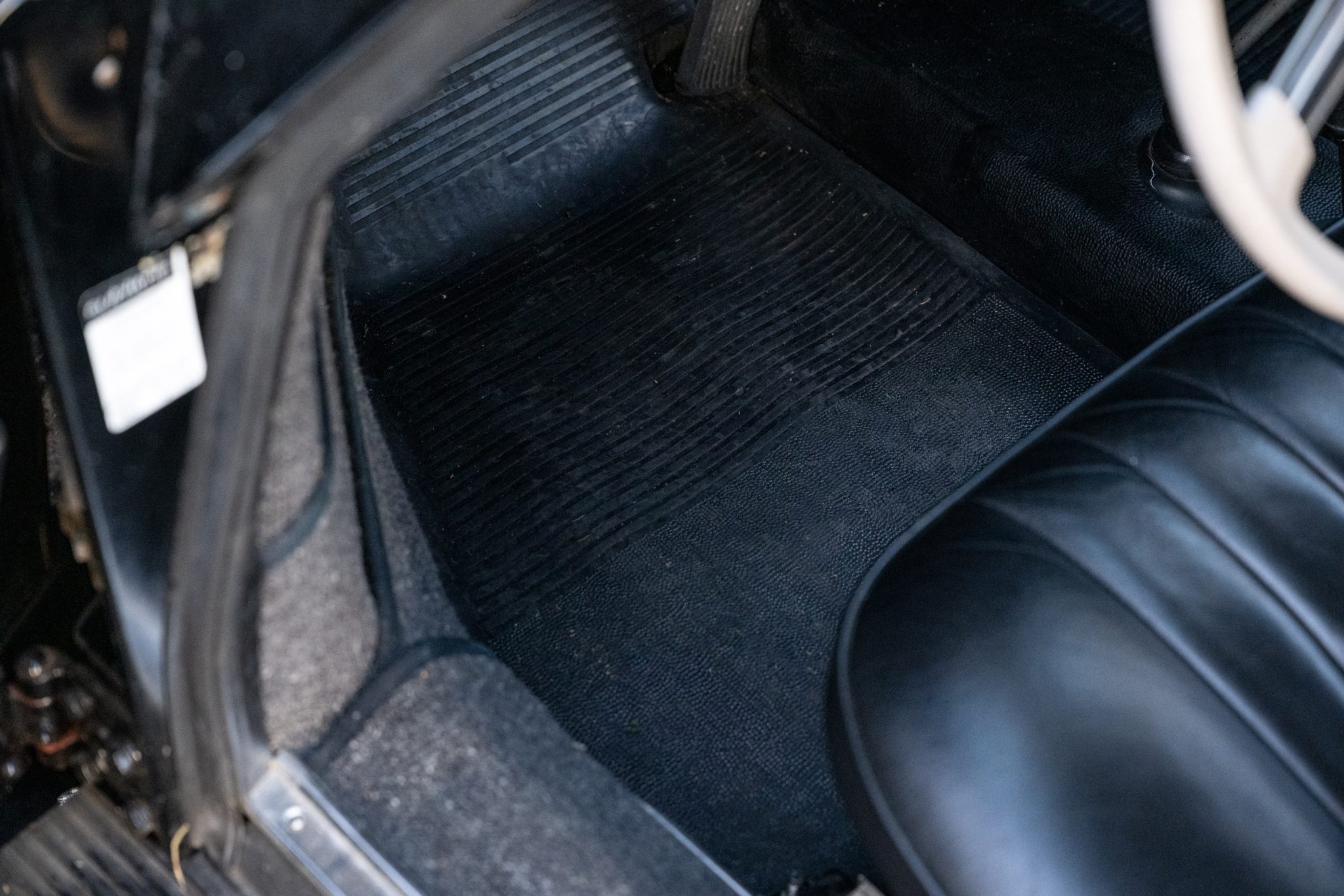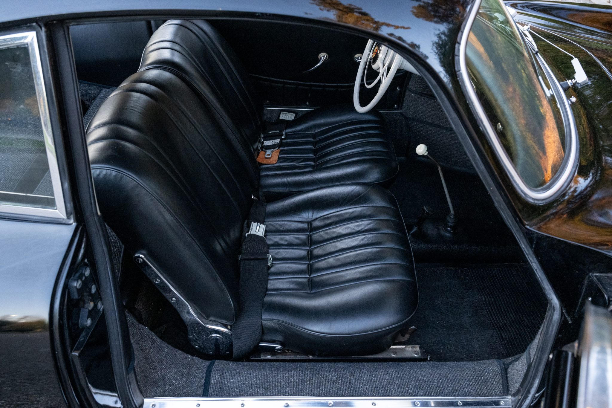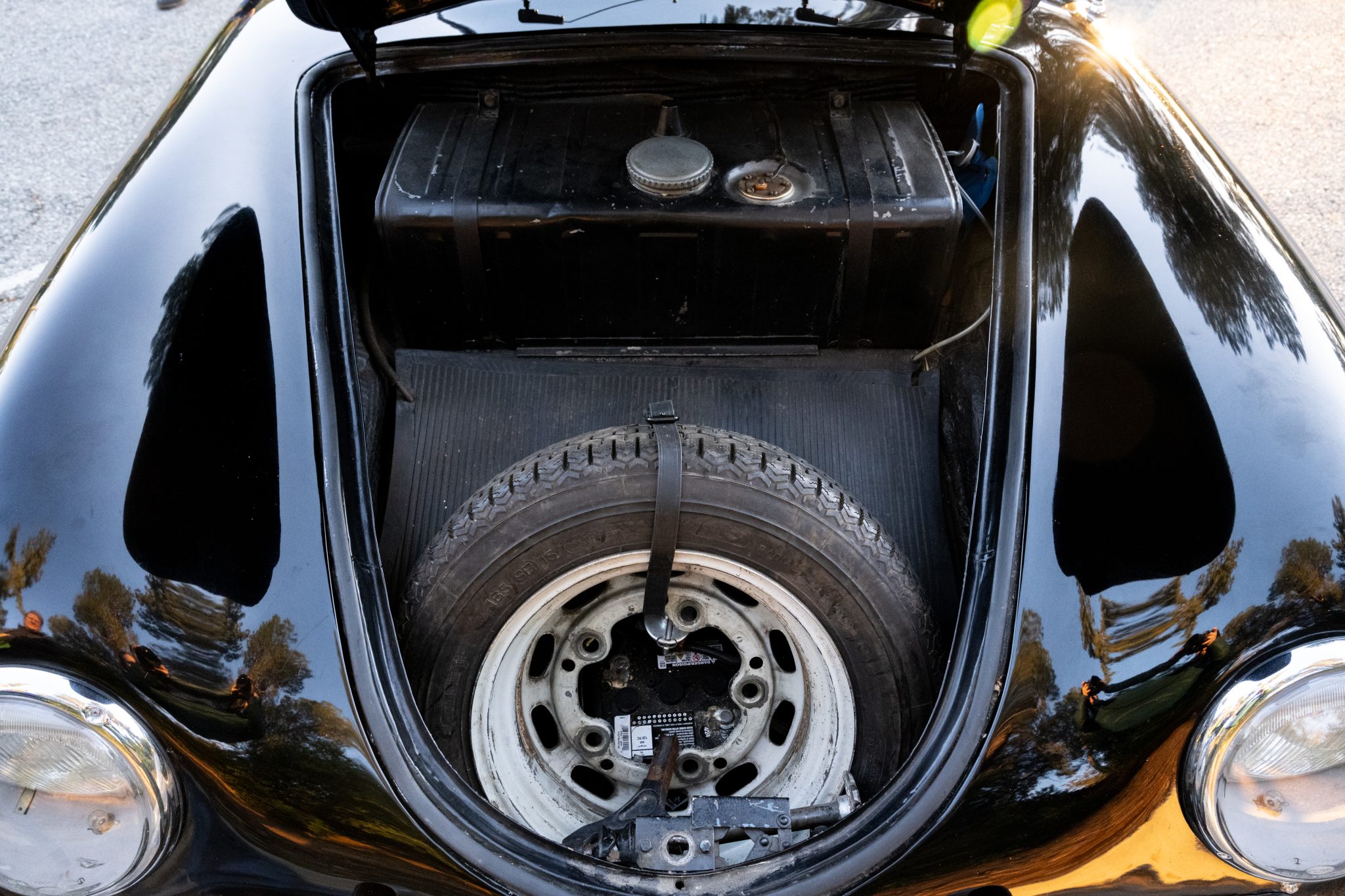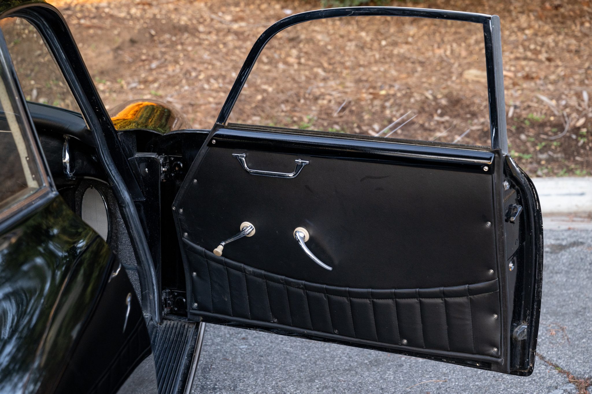 This 1956 Porsche 356A coupe is finished in black over black leather. The car is powered by a 1.6-liter flat-four paired with a four-speed manual transaxle, and features include 15″ ventilated steel wheels, a driver-side mirror, body-color bumpers, a Blaupunkt AM/FM radio, a cabin heater, and bucket seats.