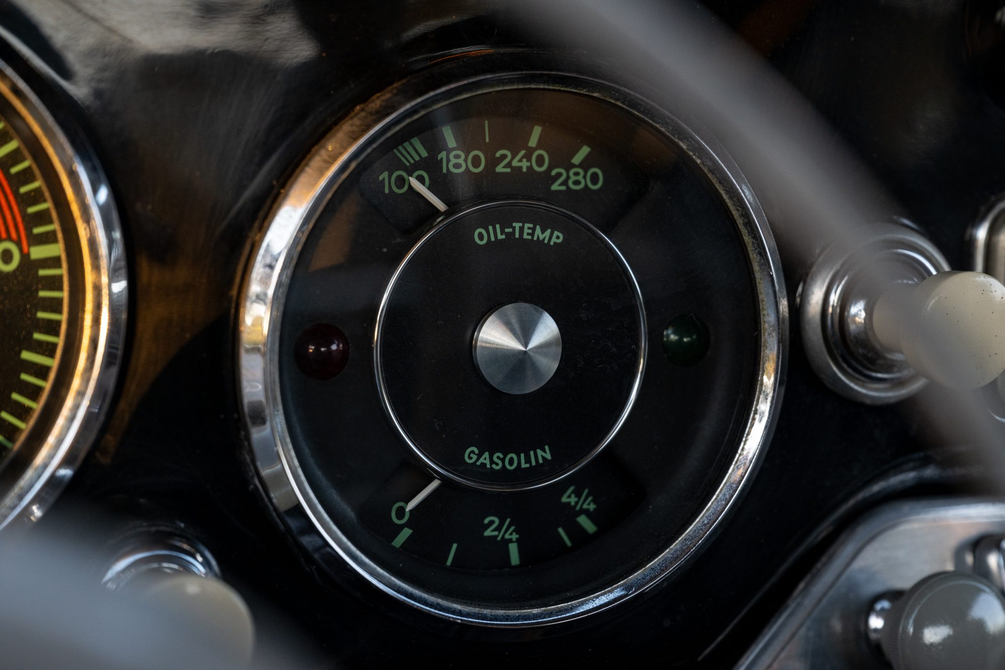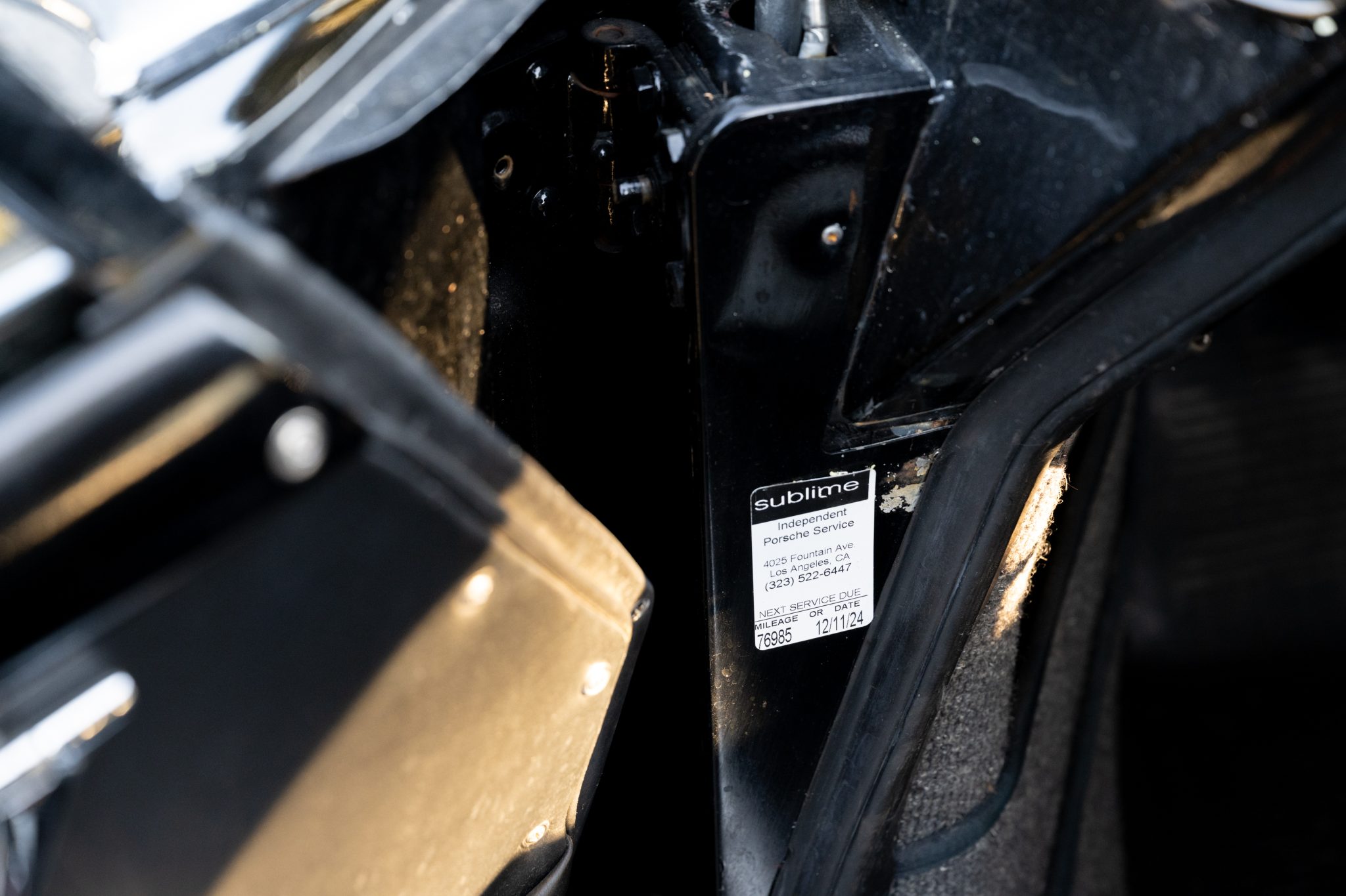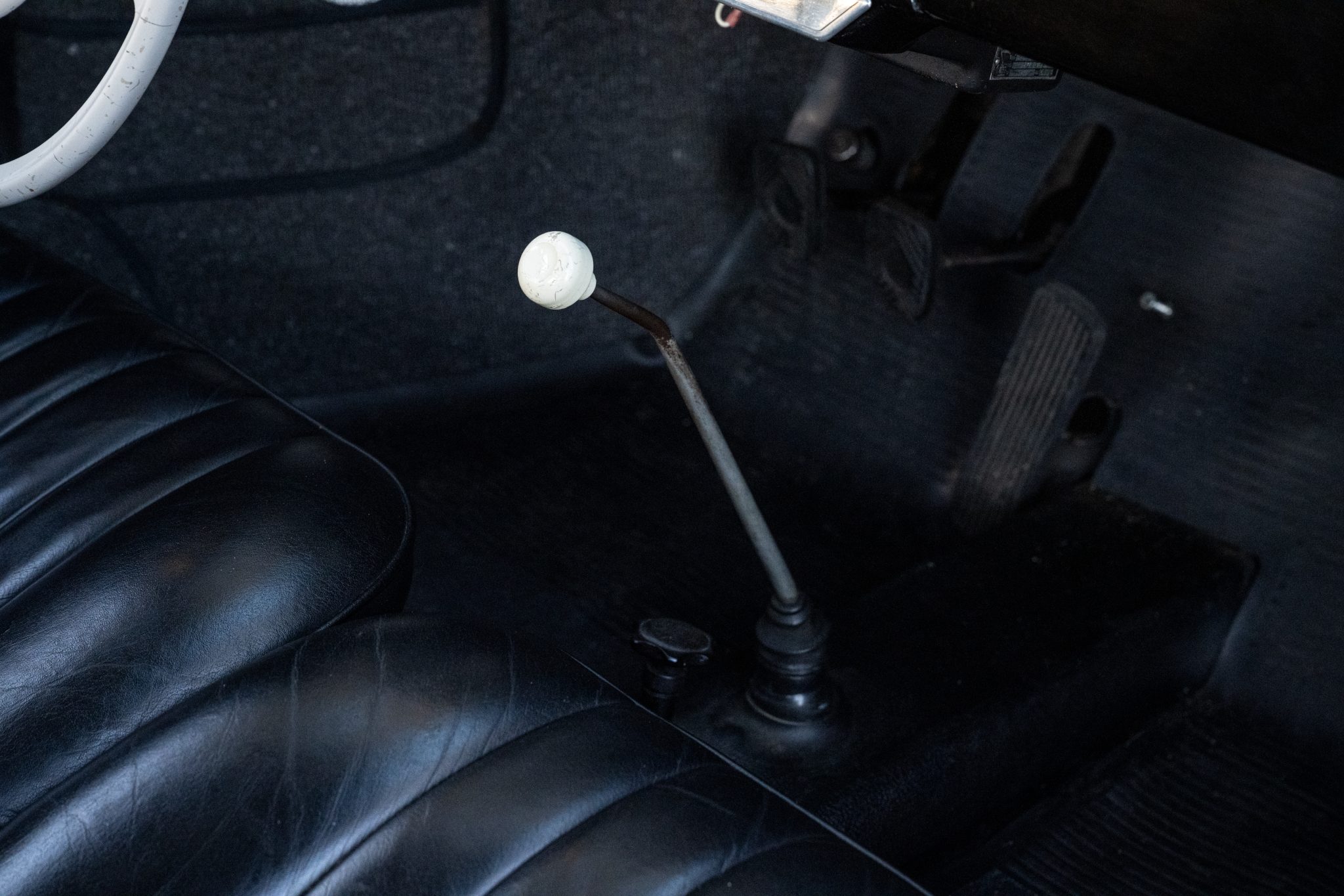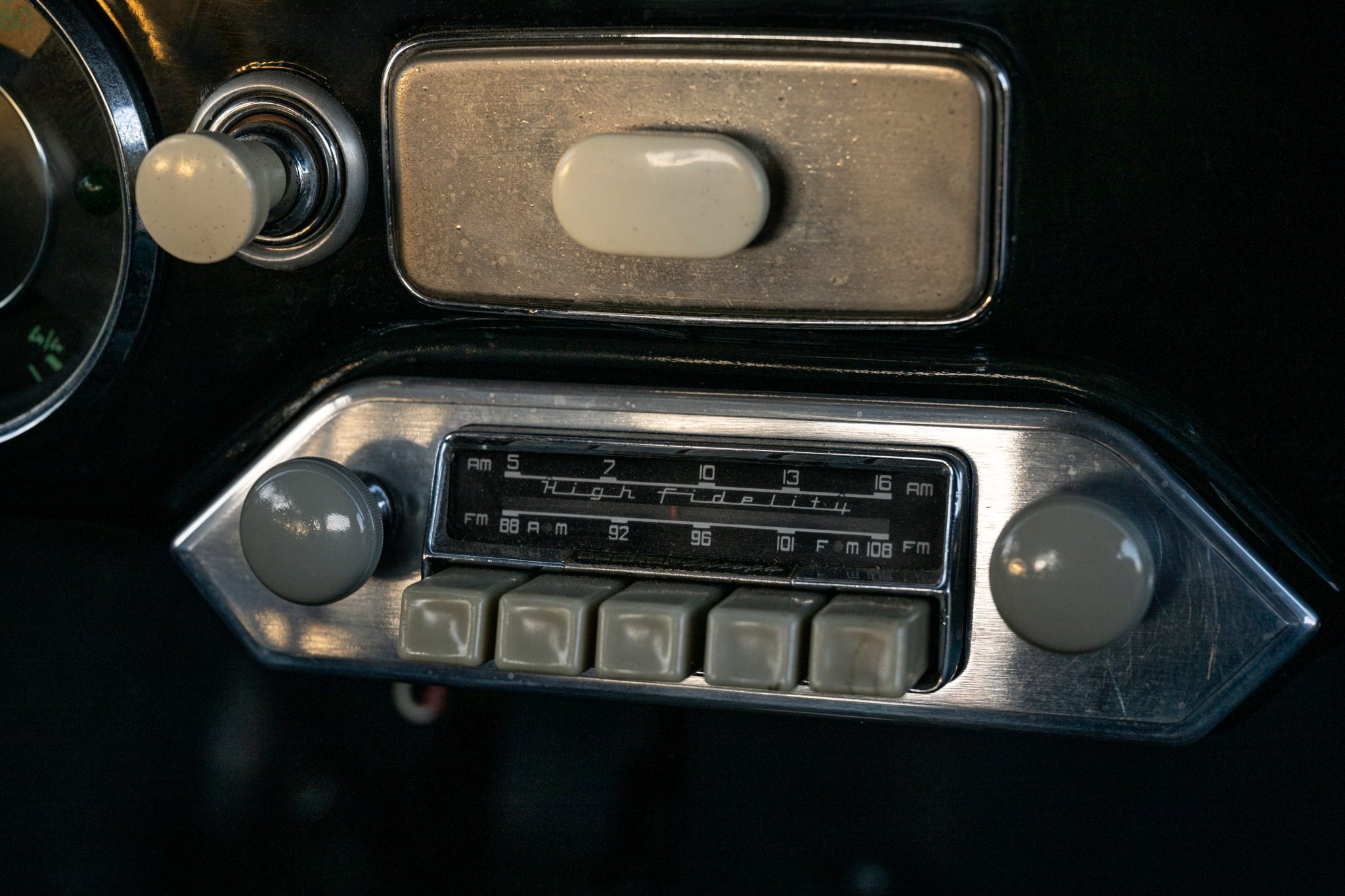 This 1956 Porsche 356A coupe is finished in black over black leather. The car is powered by a 1.6-liter flat-four paired with a four-speed manual transaxle, and features include 15″ ventilated steel wheels, a driver-side mirror, body-color bumpers, a Blaupunkt AM/FM radio, a cabin heater, and bucket seats.