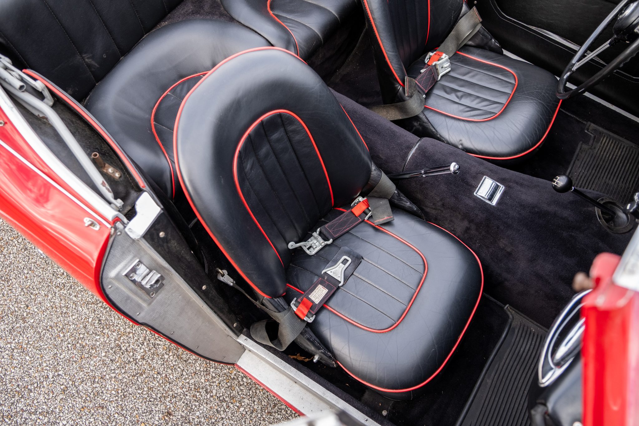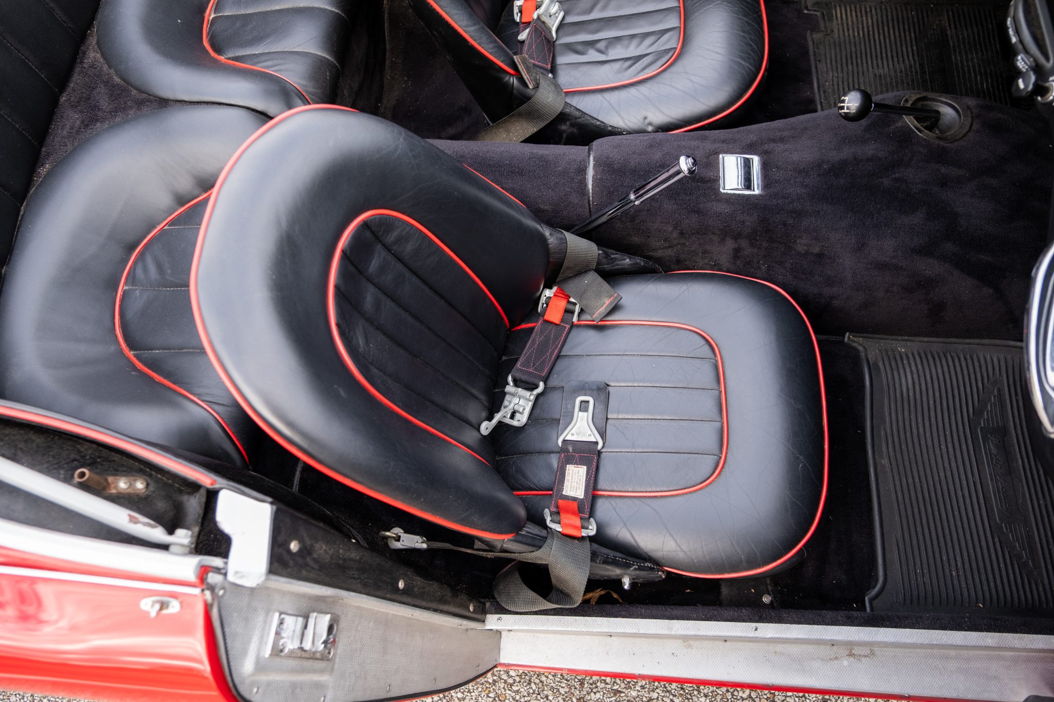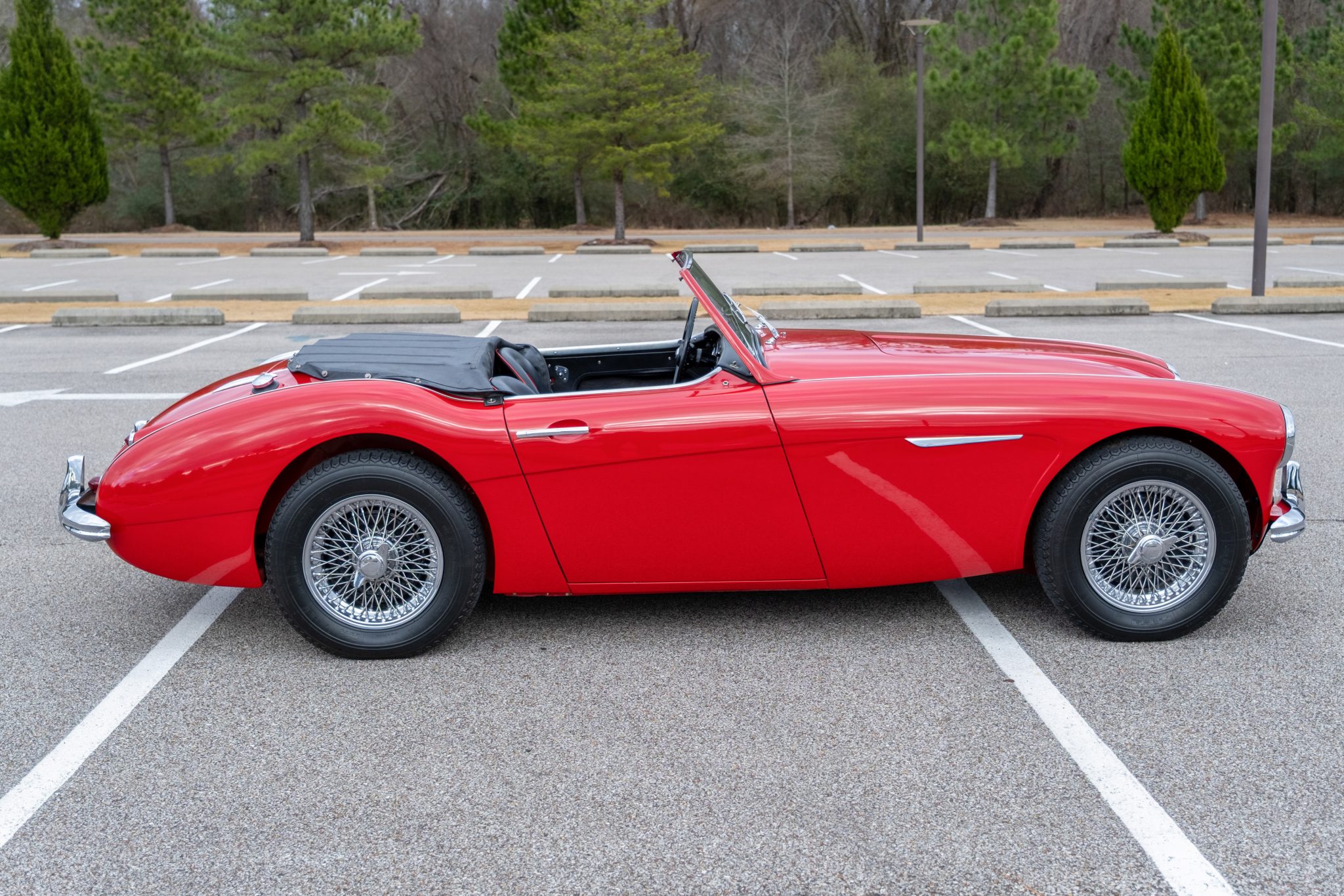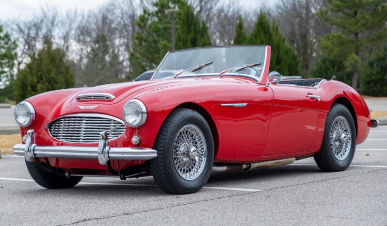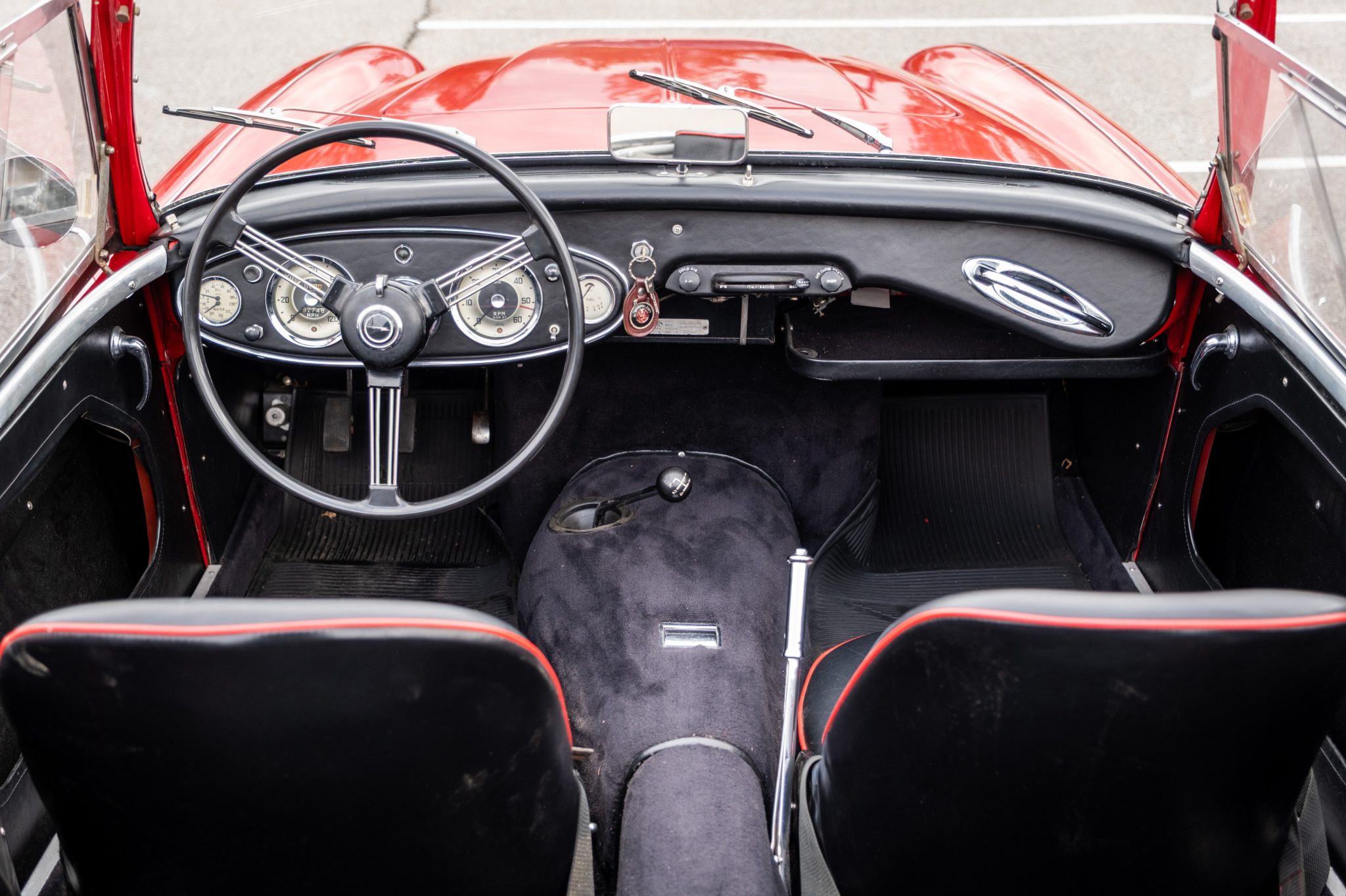 This 1957 Austin-Healey 100-6 BN4 roadster is finished in red over black vinyl and is powered by a 2.6-liter inline-six paired with a four-speed manual transmission with overdrive. Equipment includes a removable black soft top, 15″ knock-off wire wheels, a tonneau cover, and removable side curtains.