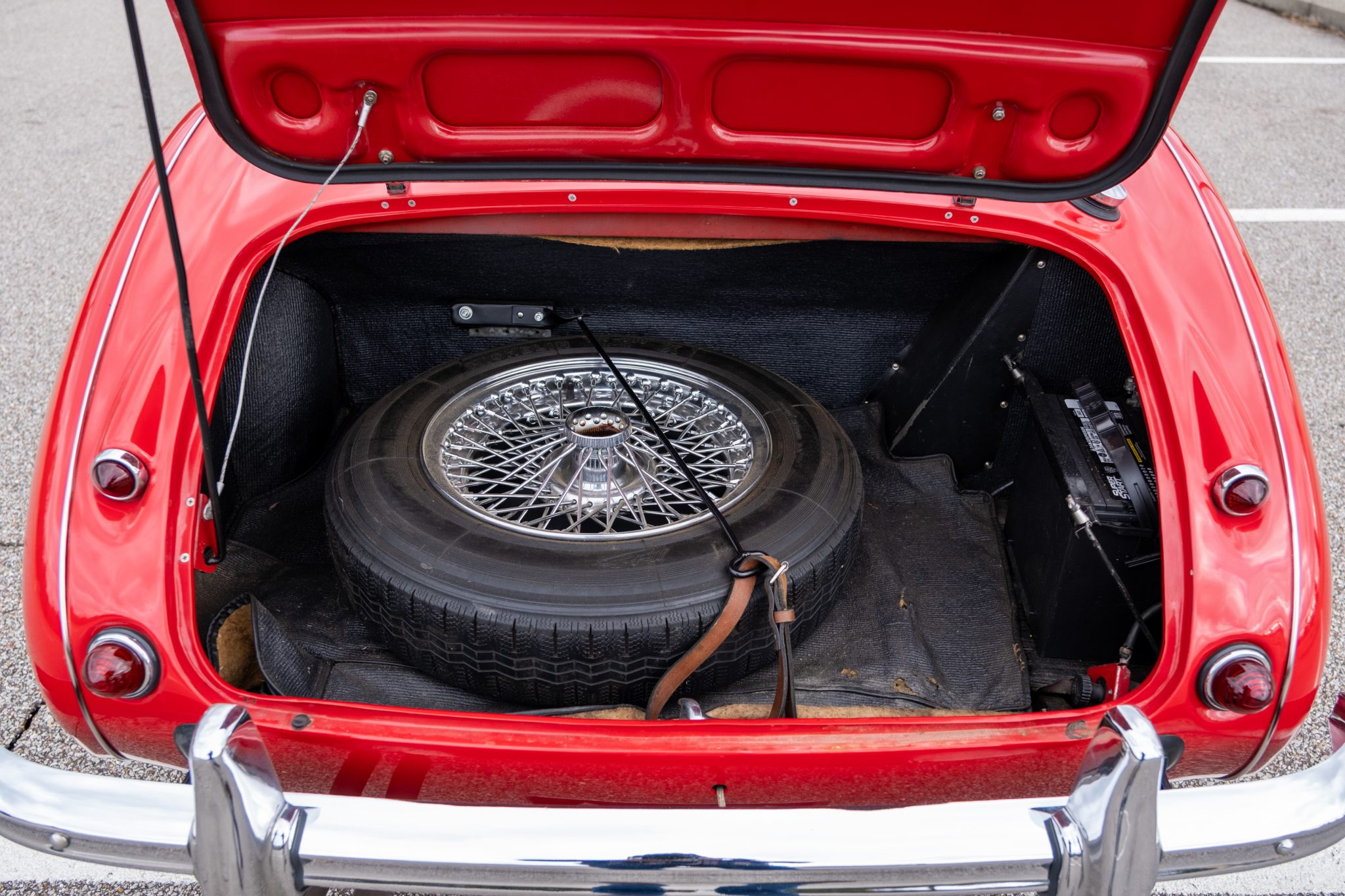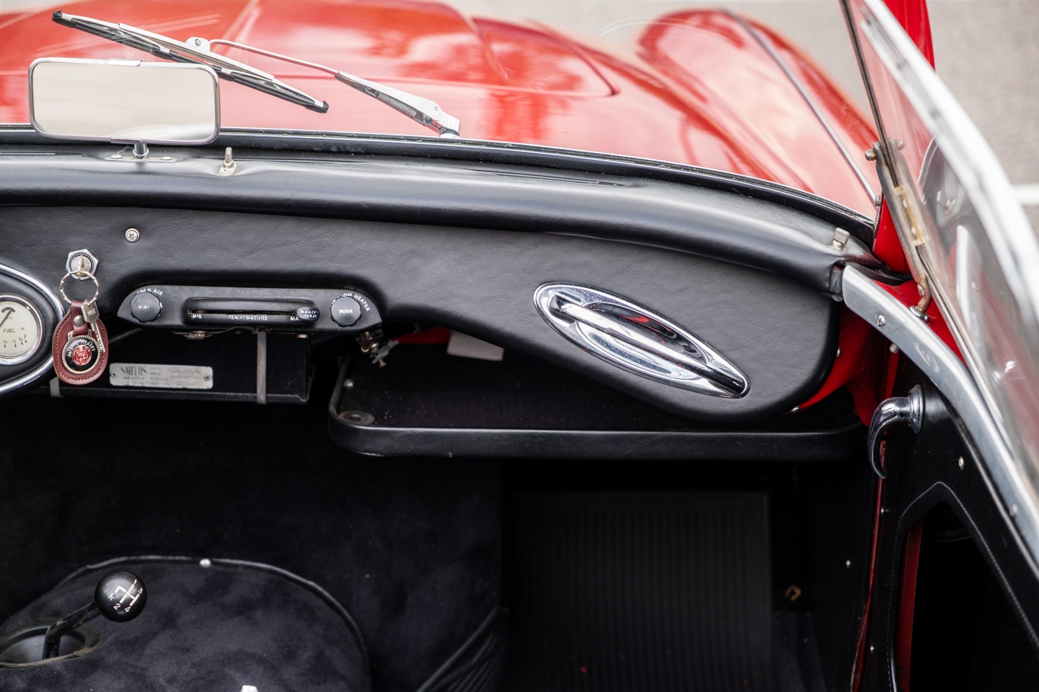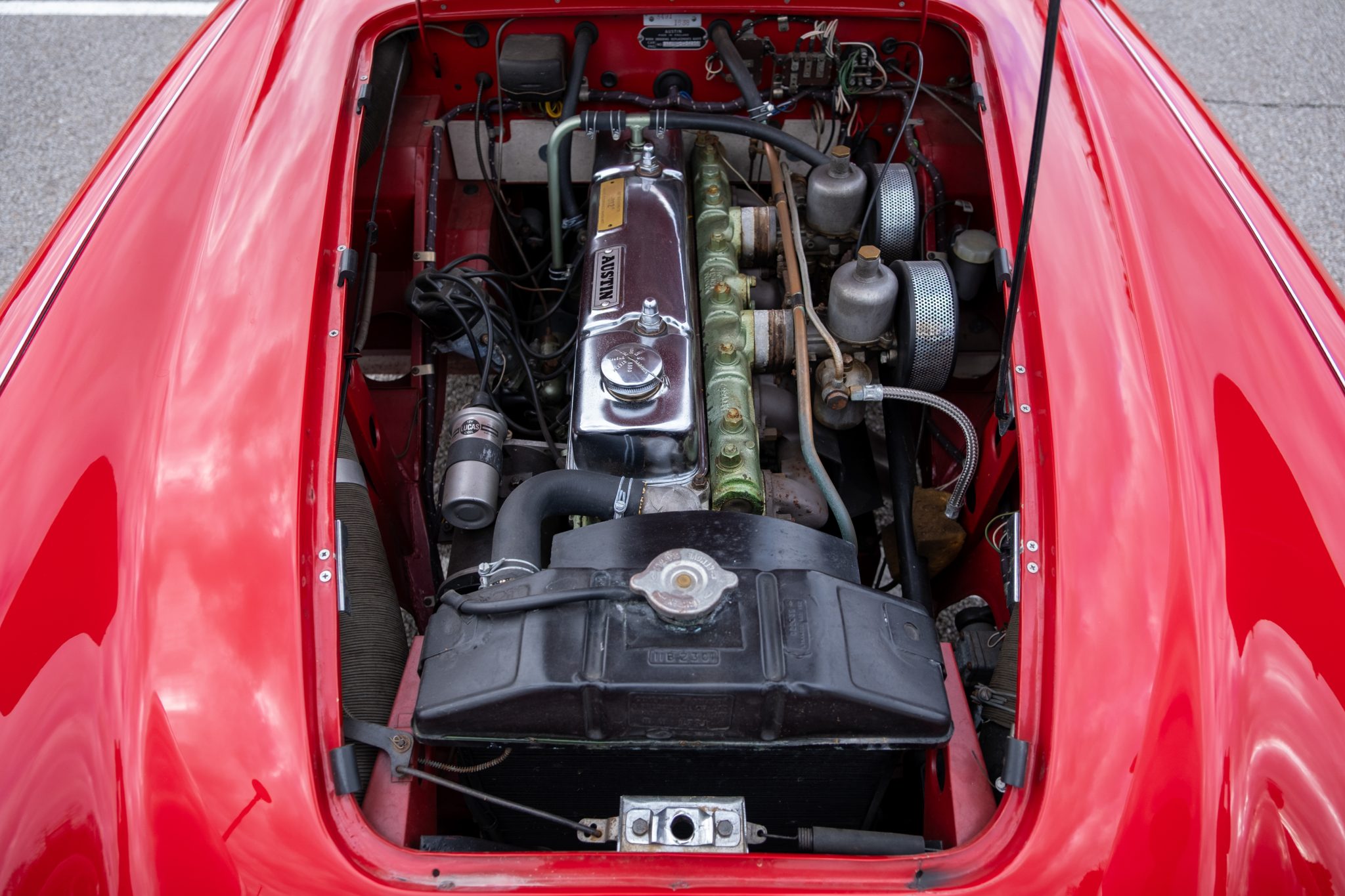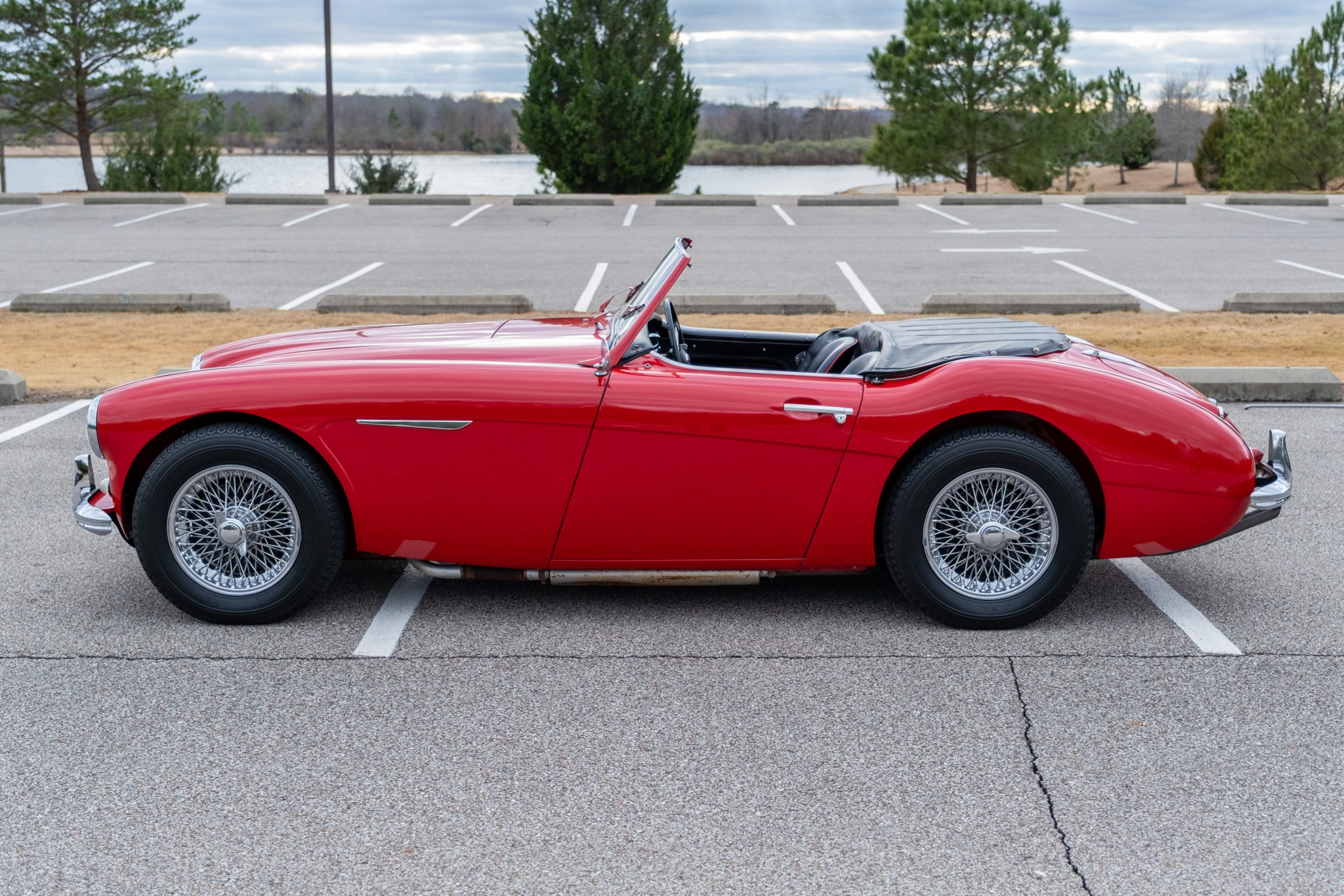 This 1957 Austin-Healey 100-6 BN4 roadster is finished in red over black vinyl and is powered by a 2.6-liter inline-six paired with a four-speed manual transmission with overdrive. Equipment includes a removable black soft top, 15″ knock-off wire wheels, a tonneau cover, and removable side curtains.