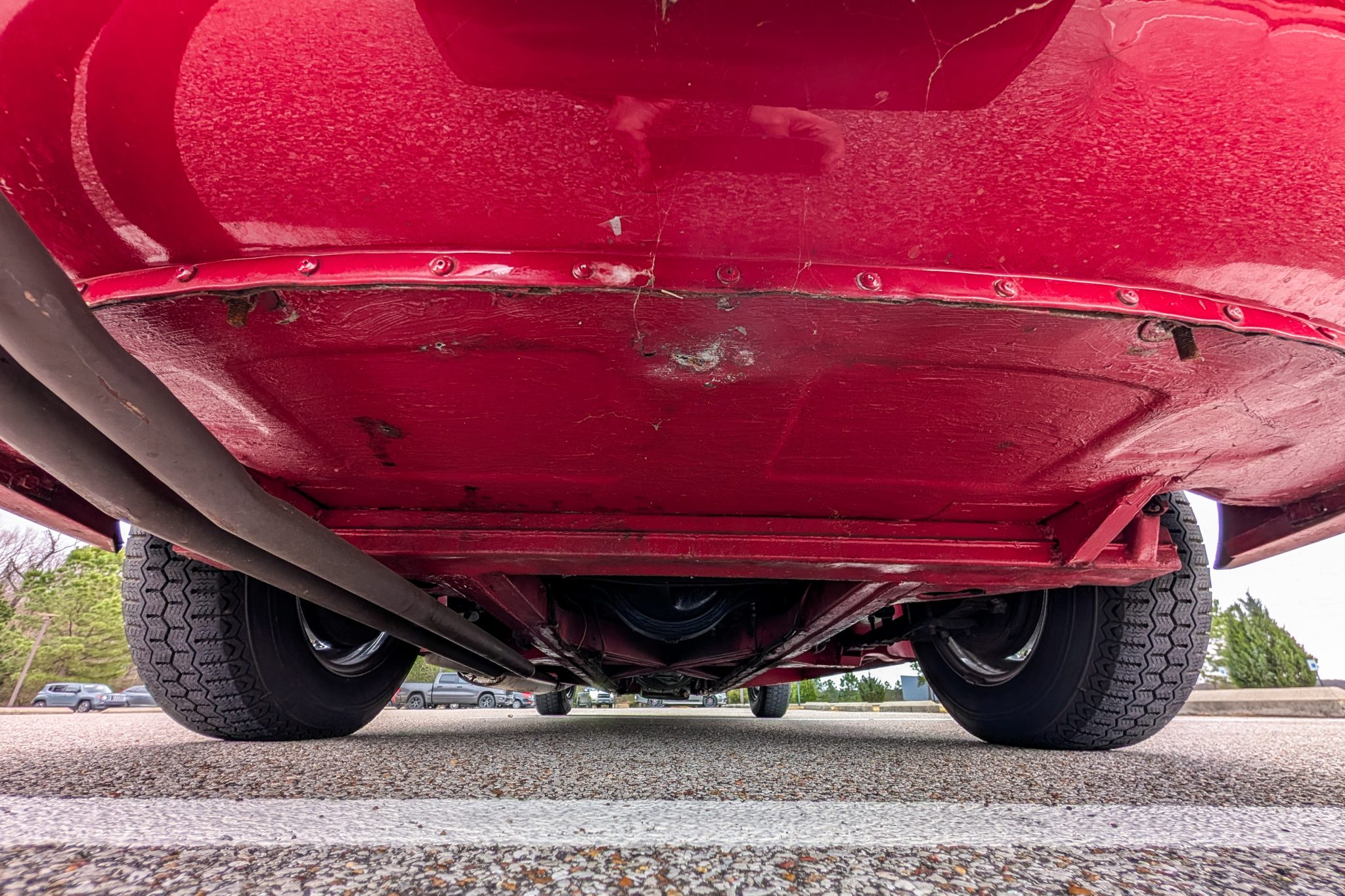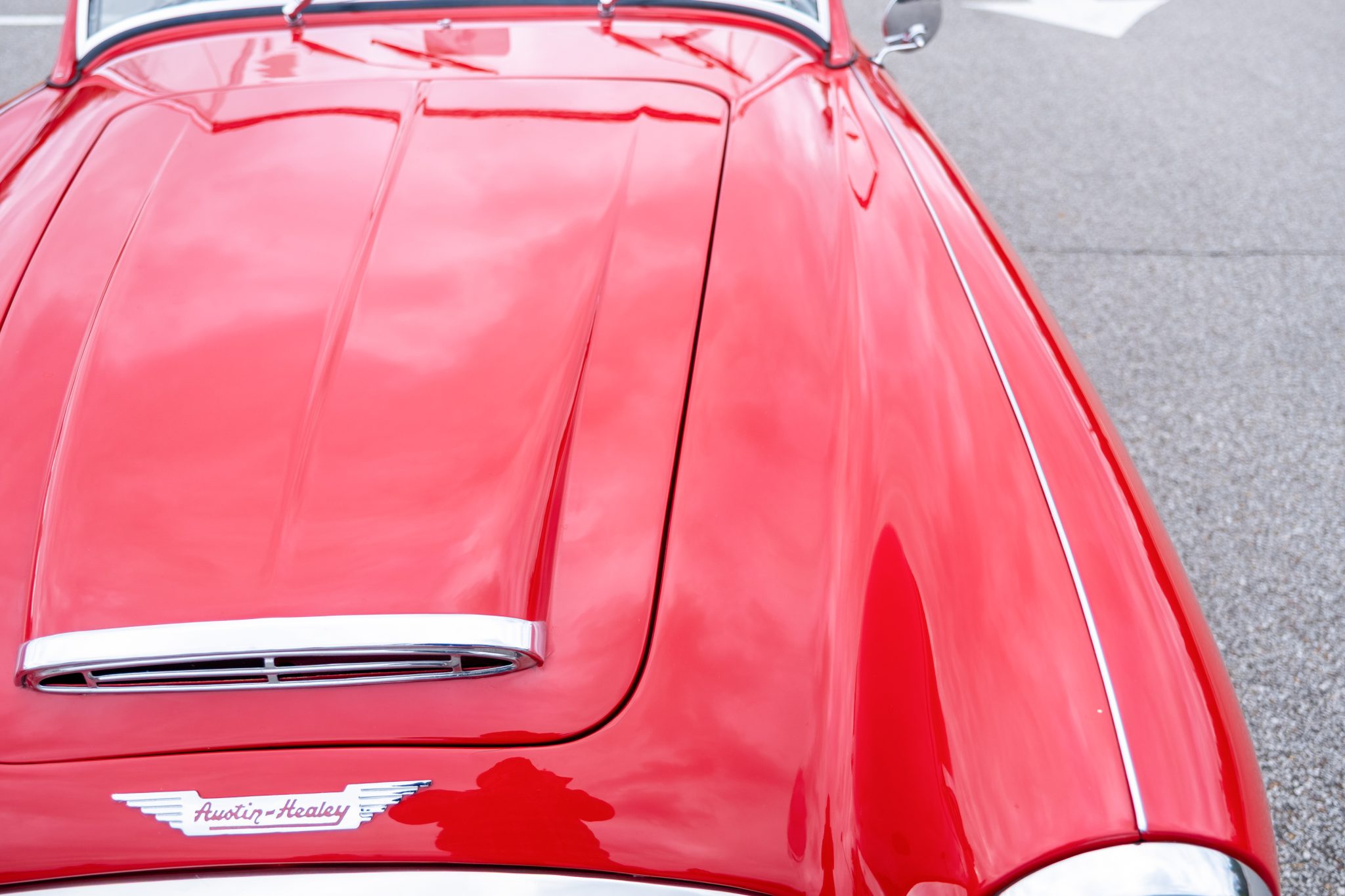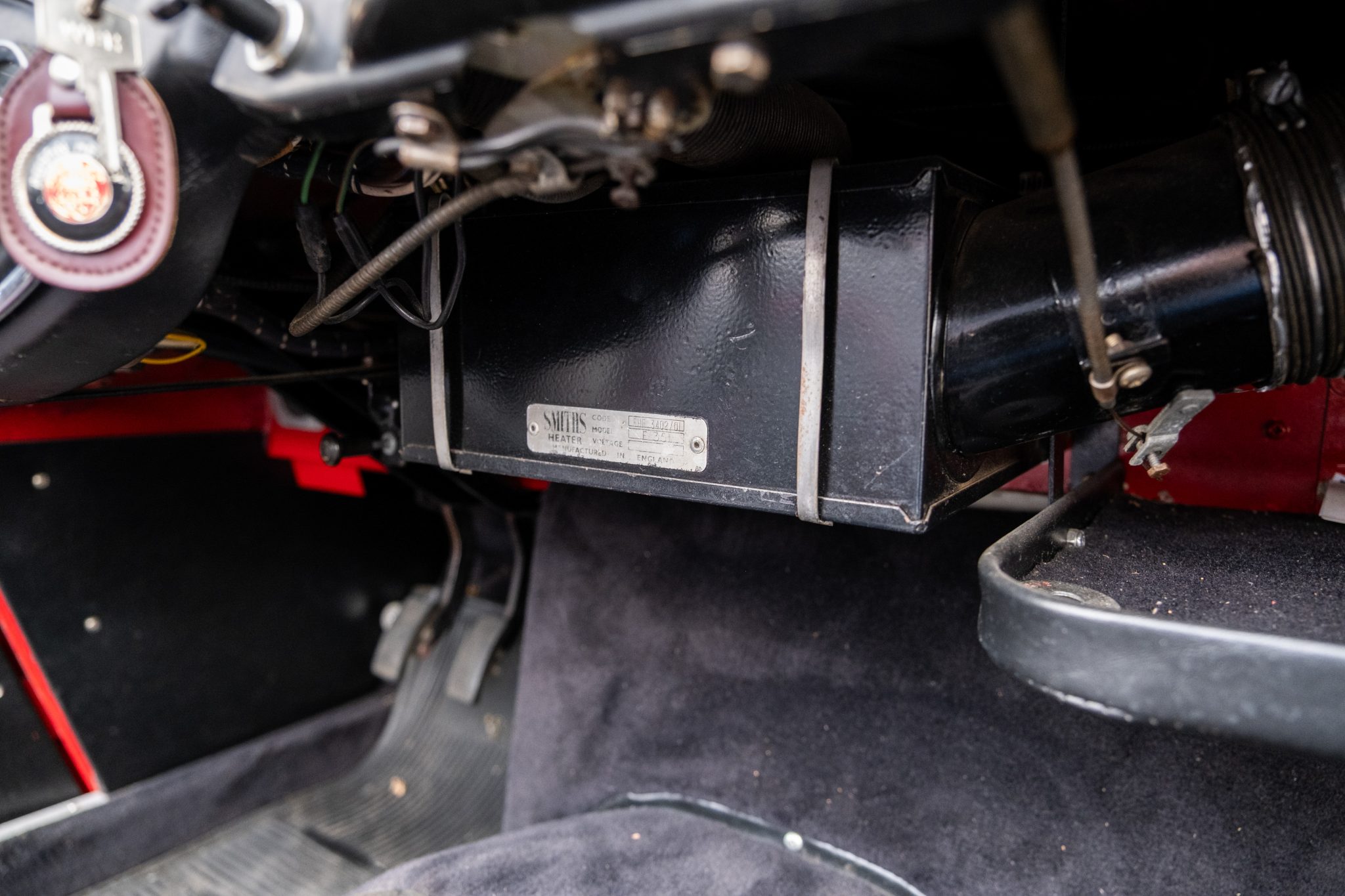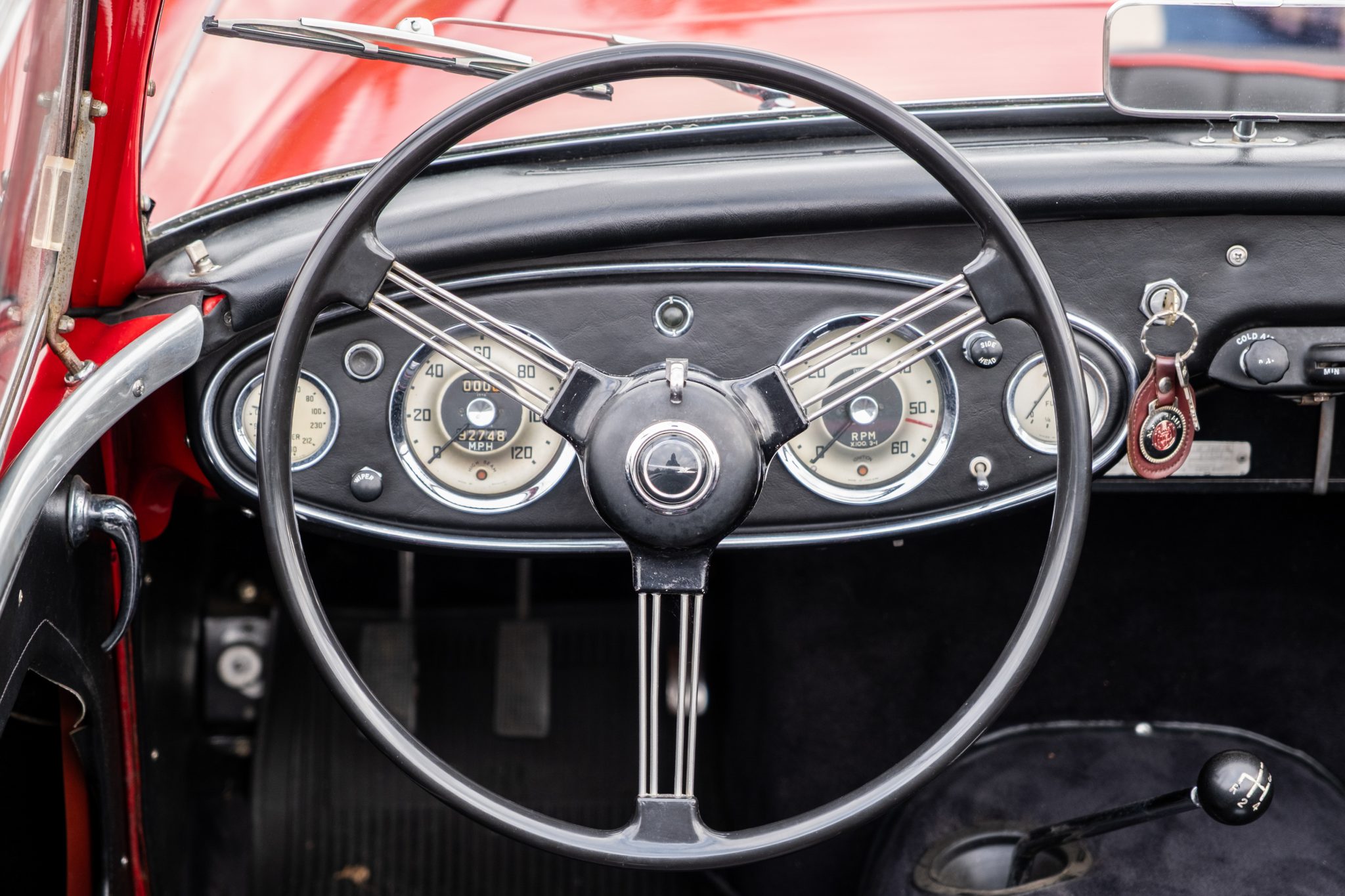 This 1957 Austin-Healey 100-6 BN4 roadster is finished in red over black vinyl and is powered by a 2.6-liter inline-six paired with a four-speed manual transmission with overdrive. Equipment includes a removable black soft top, 15″ knock-off wire wheels, a tonneau cover, and removable side curtains.