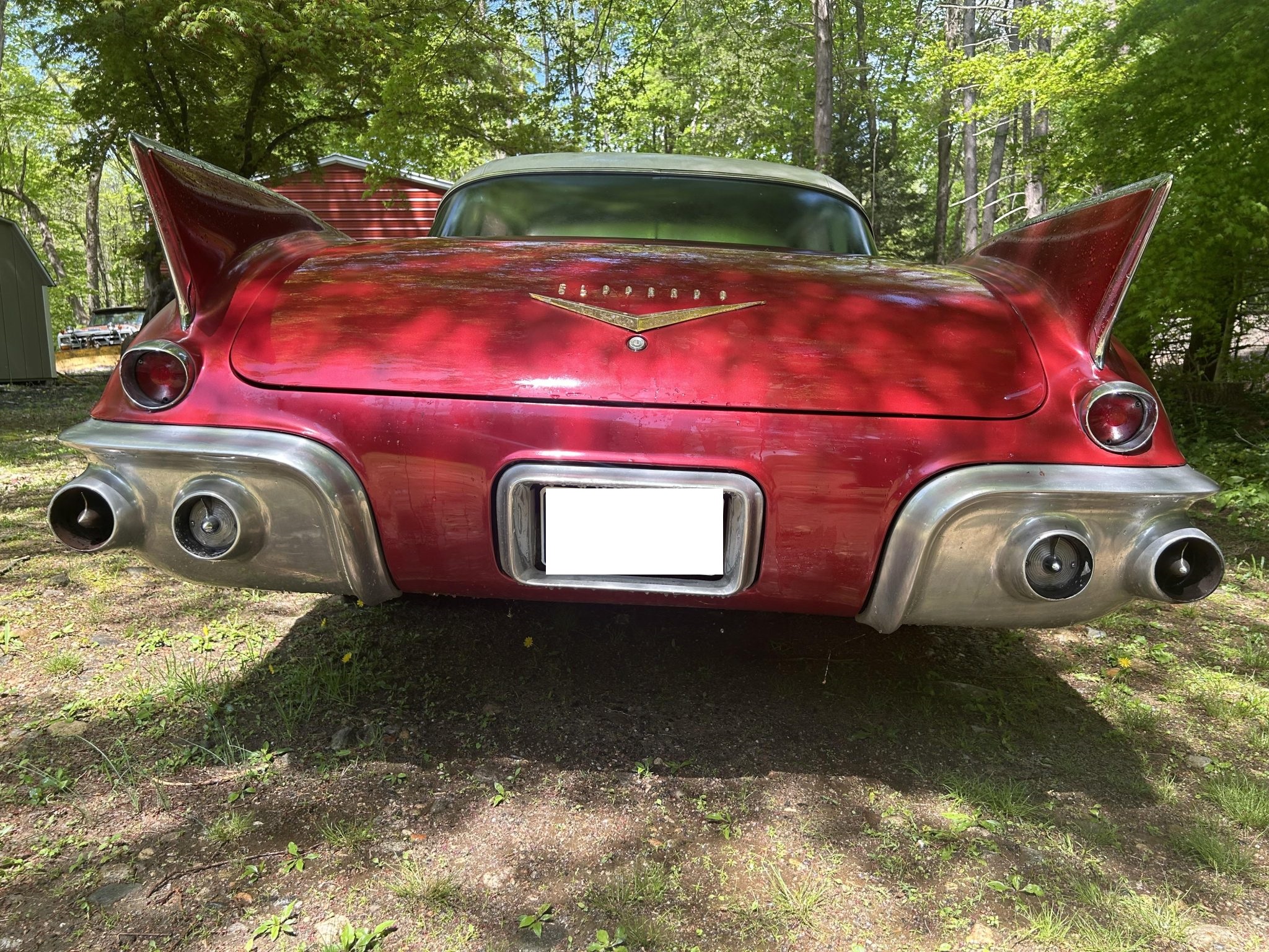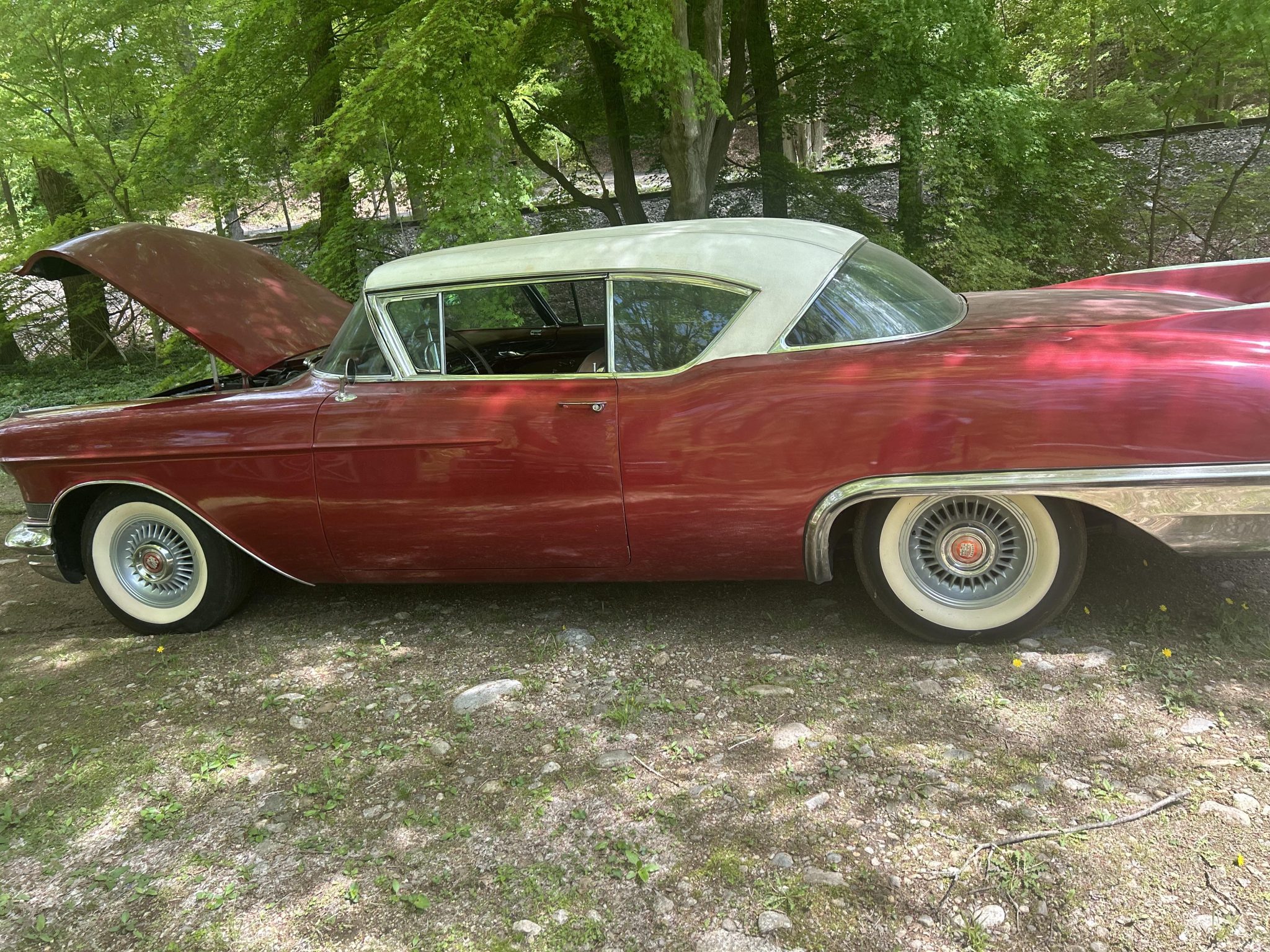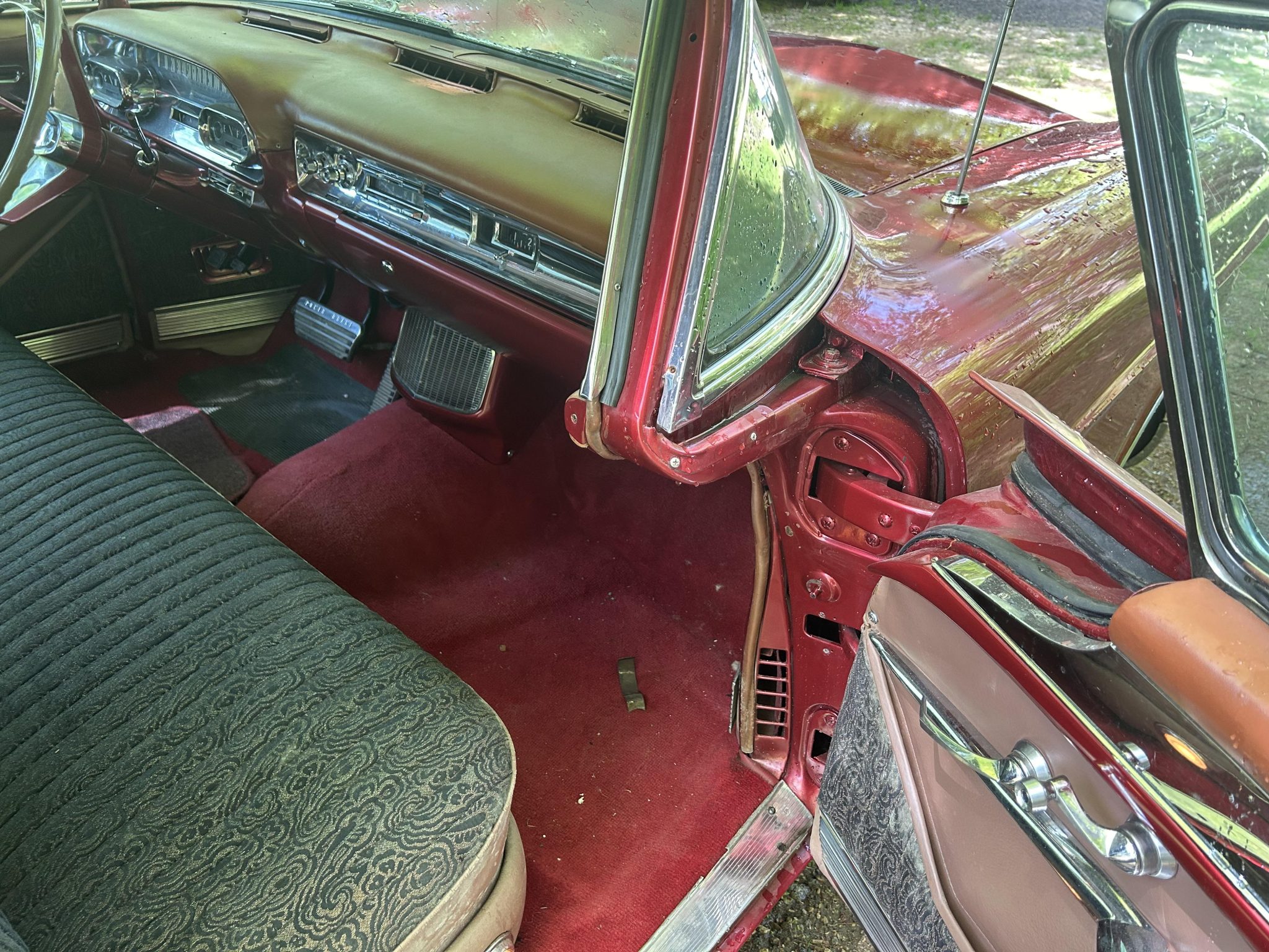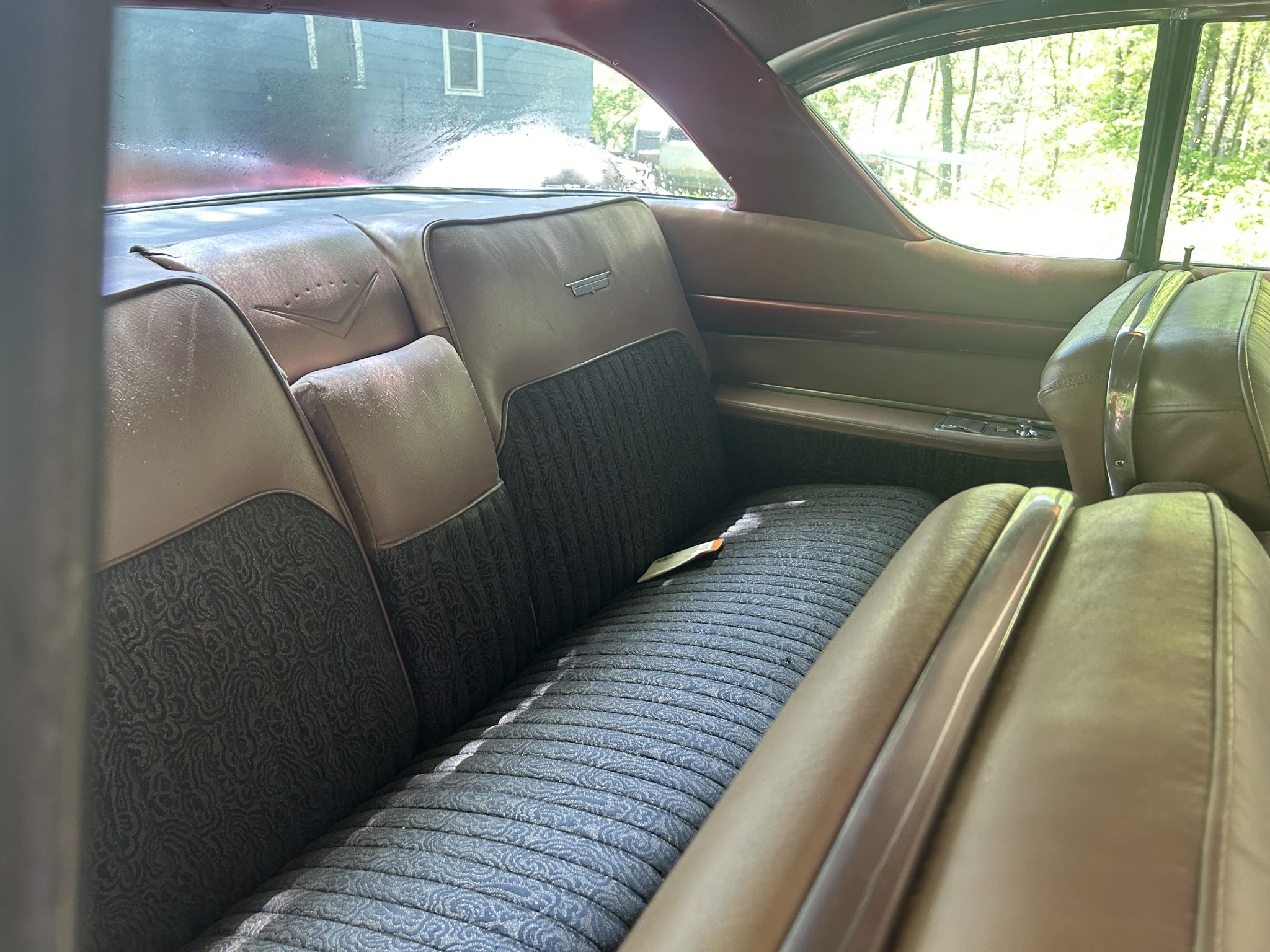 The body was refinished in red with a white vinyl roof, and the interior is said to have been re-trimmed in black paisley cloth and brown leather. Power is provided by a 365ci V8 paired with a four-speed automatic transmission, and the car is equipped with power steering and brakes. Additional features include an AM radio, a power-adjustable front seat, power windows, an Autronic-Eye headlight dimmer, air conditioning, and 15″ Sabre wheels wrapped in whitewall tires.
