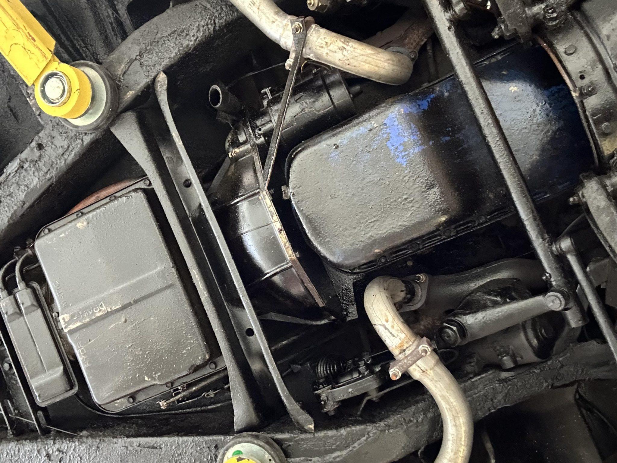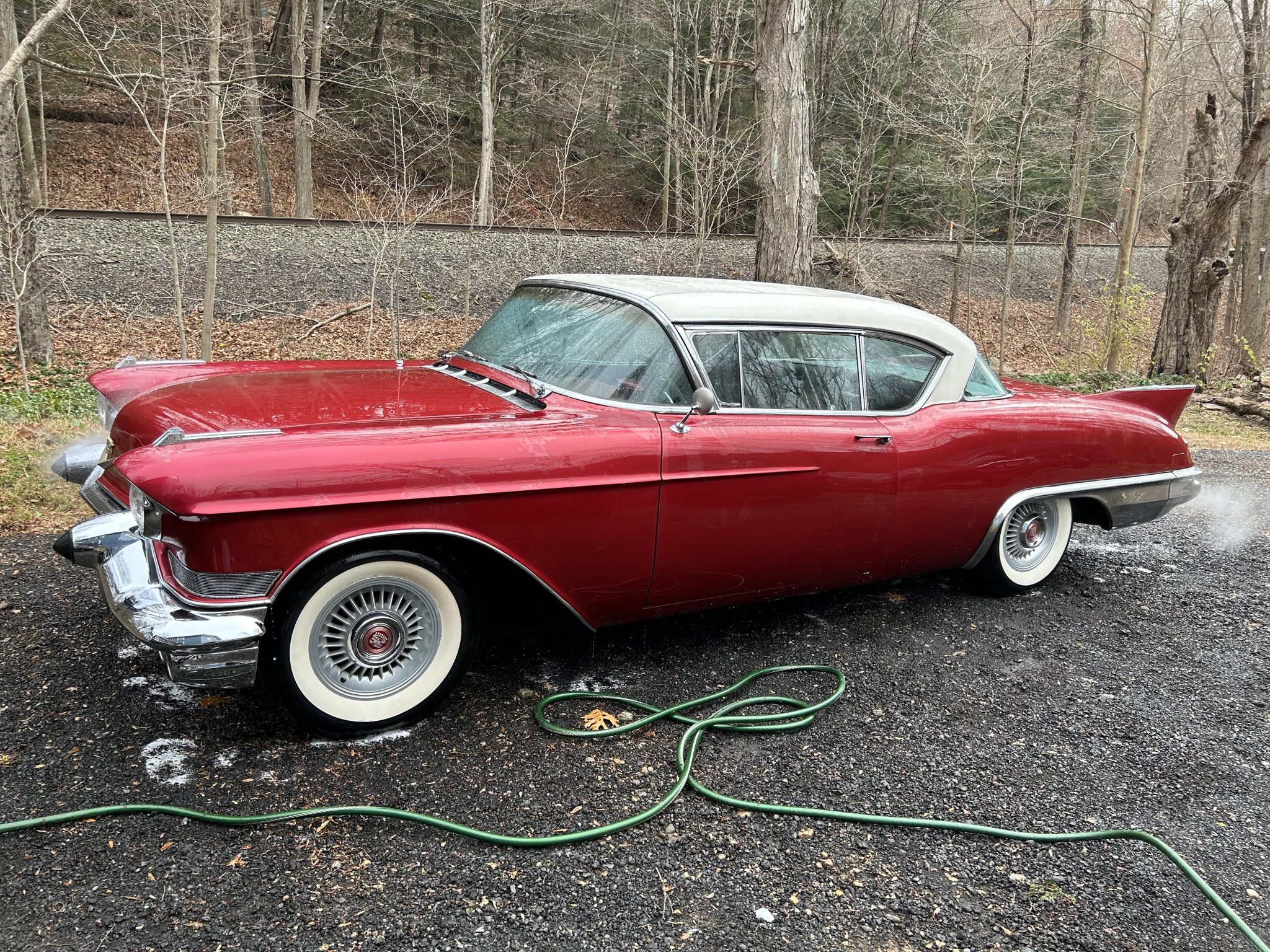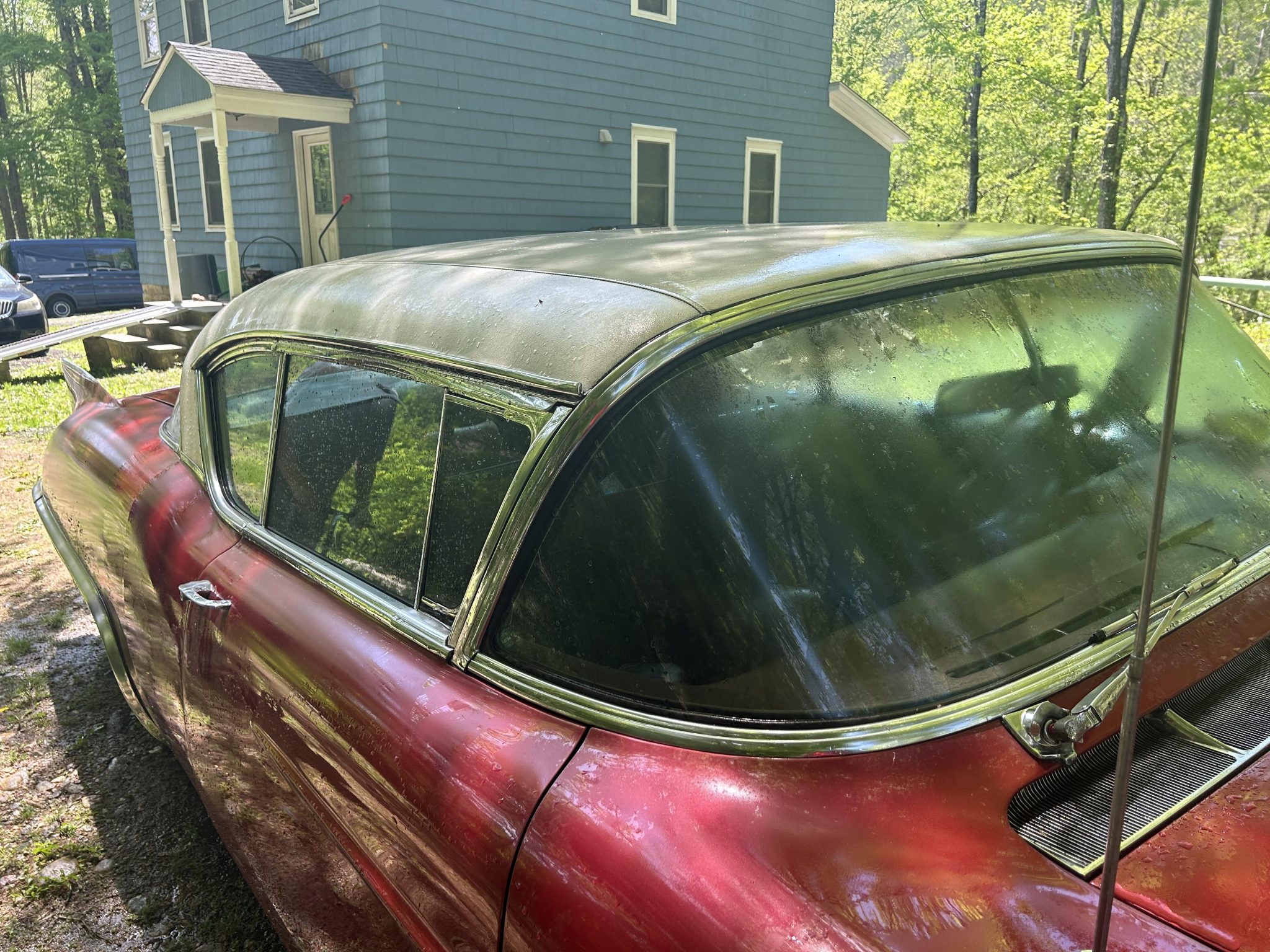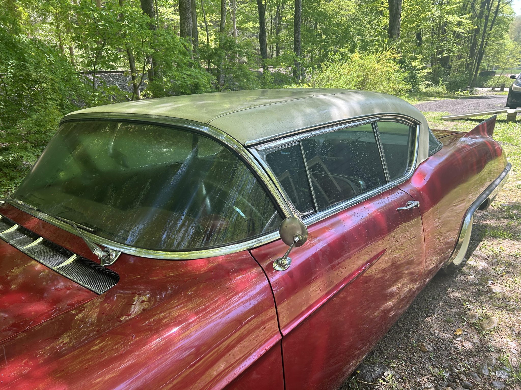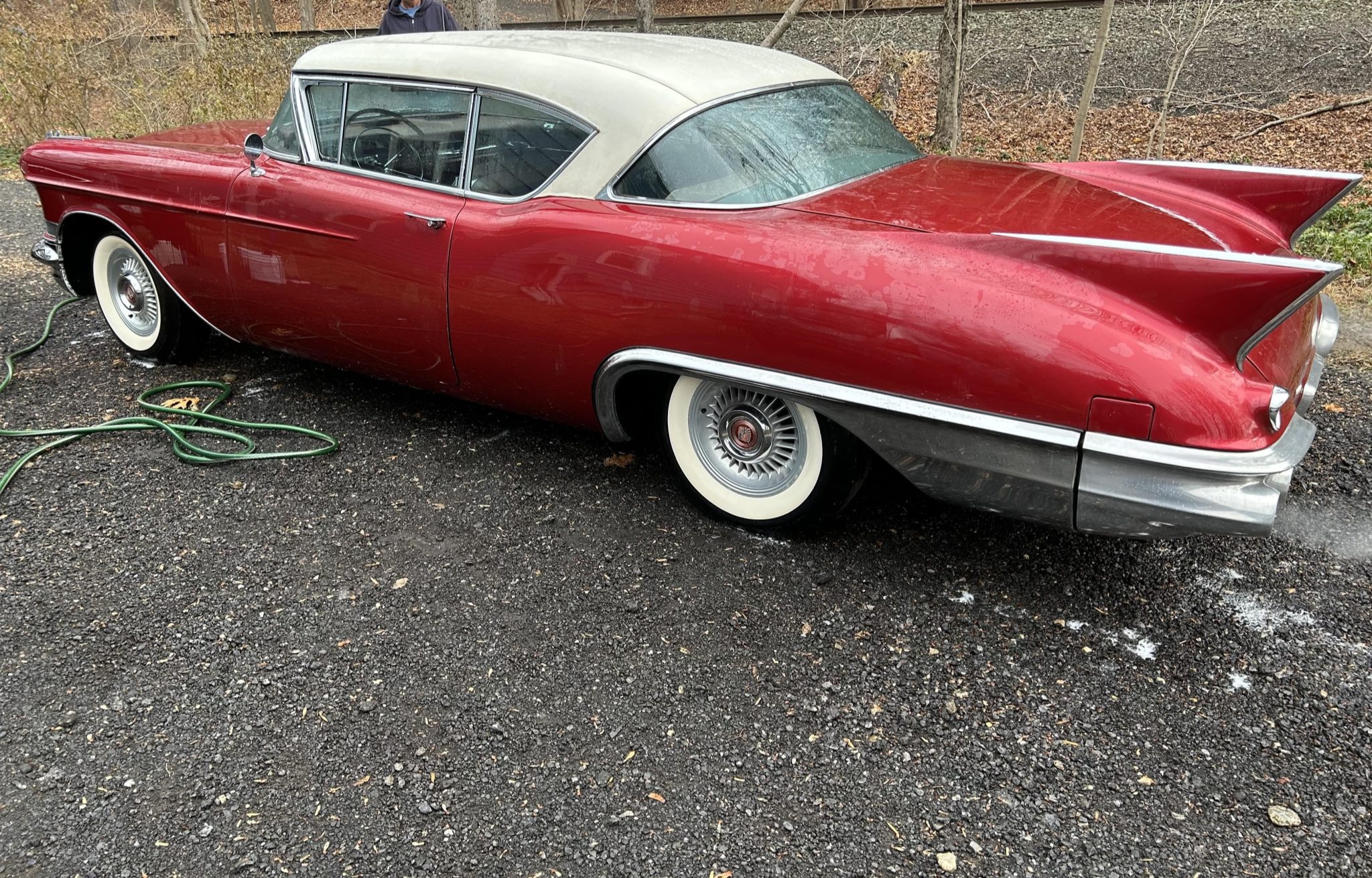 The body was refinished in red with a white vinyl roof, and the interior is said to have been re-trimmed in black paisley cloth and brown leather. Power is provided by a 365ci V8 paired with a four-speed automatic transmission, and the car is equipped with power steering and brakes. Additional features include an AM radio, a power-adjustable front seat, power windows, an Autronic-Eye headlight dimmer, air conditioning, and 15″ Sabre wheels wrapped in whitewall tires.
