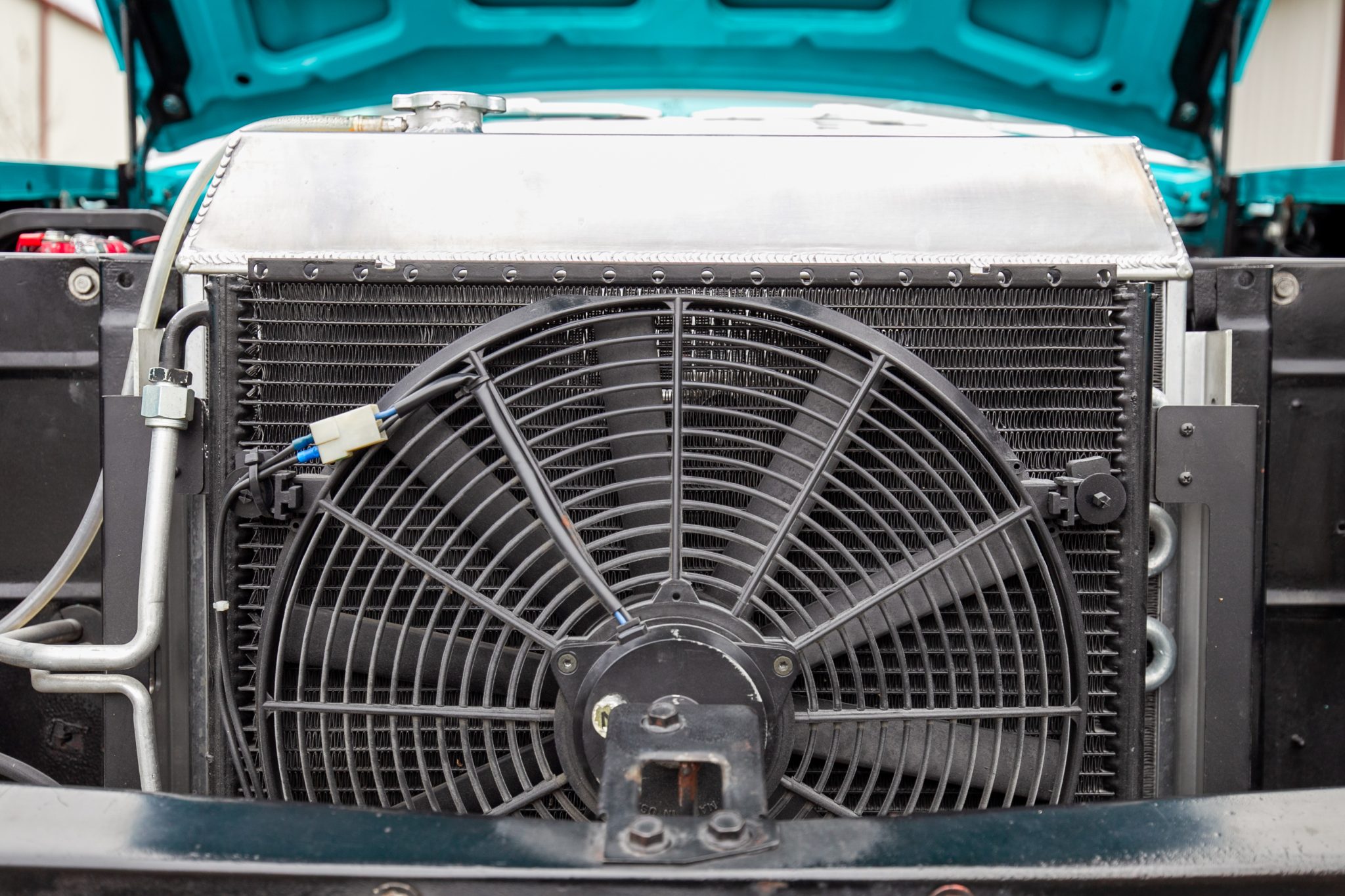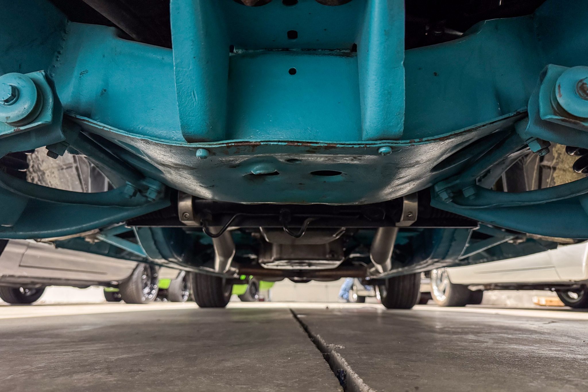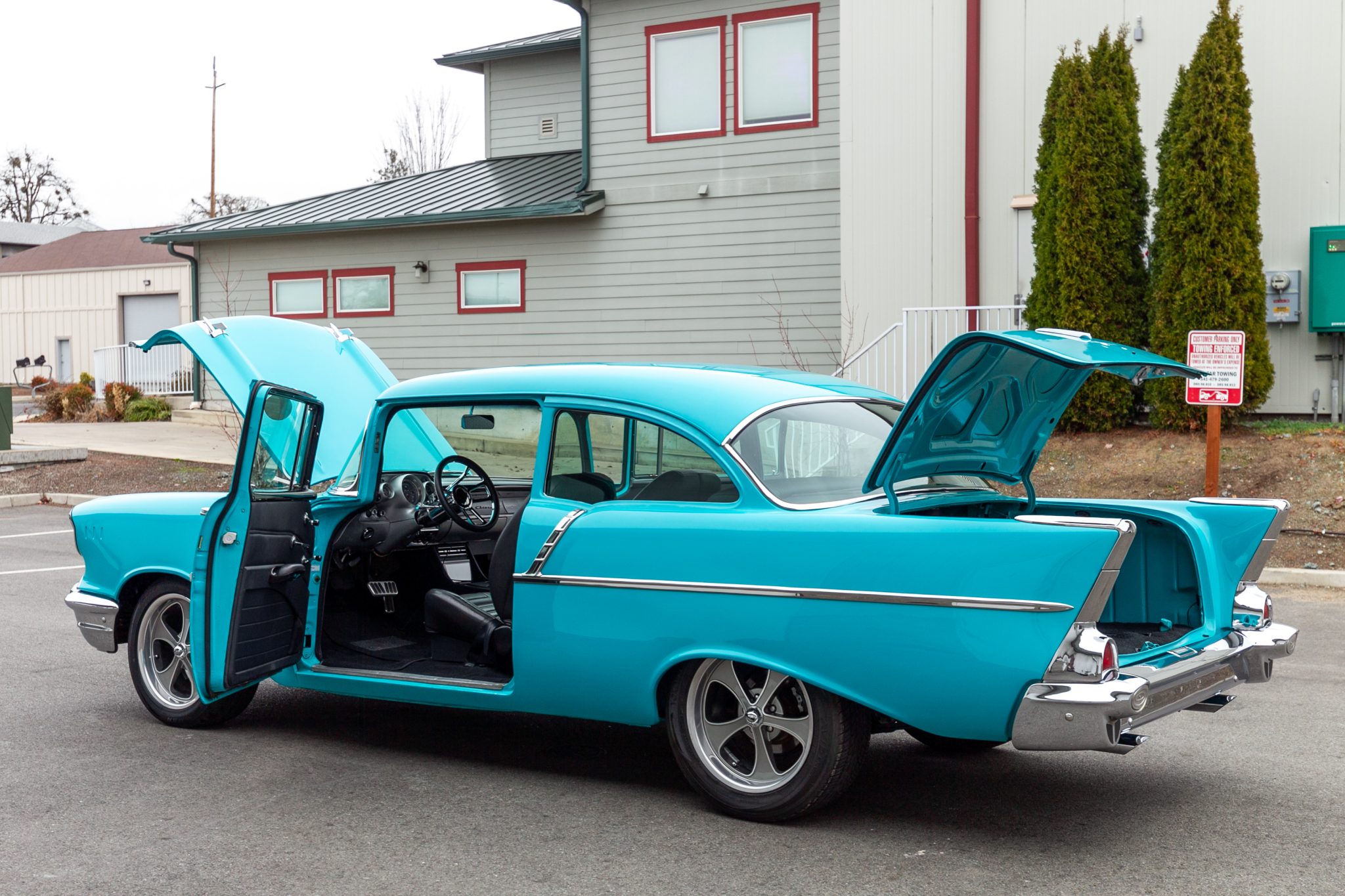 This 1957 Chevrolet 210 two-door sedan is powered by a BluePrint Engines 383ci stroker V8 that is linked with a 700R4 automatic transmission and a limited-slip differential The cabin is outfitted with black leather TMI Products seats, aftermarket air conditioning, Classic Instruments gauges, and a Kenwood touchscreen head unit. Further equipment includes a Holley Sniper EFI setup, 18″ Ridler wheels, four-wheel disc brakes, rack-and-pinion power steering, four-into-one headers, and a dual exhaust system.