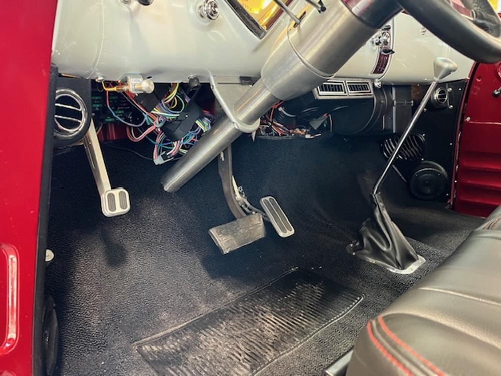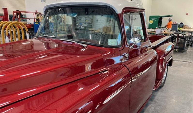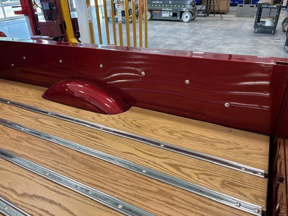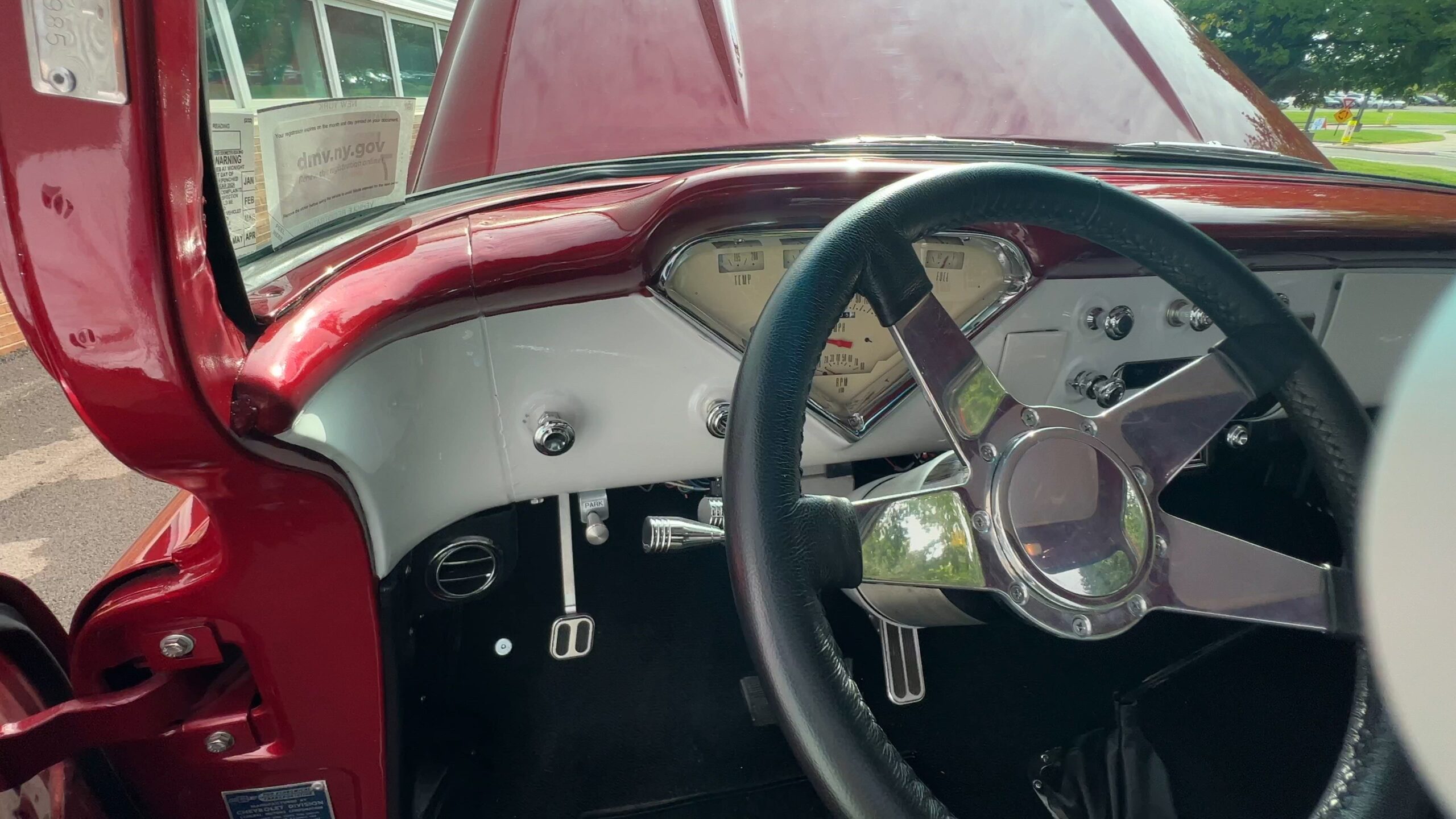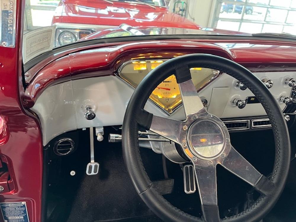 Work involved fitting an aftermarket cab, installing the bodywork on a Chevrolet S-10 frame, and rebuilding the 350ci V8. The engine is equipped with an Edelbrock carburetor and a CVF Racing serpentine belt system, and it is backed by a TH400 three-speed automatic transmission and a 10-bolt rear end. Refinished in maroon with white exterior and interior accents, the truck rides on 18″ Vision wheels and has front disc brakes, a wood-lined bed, chrome bumpers, and a wraparound rear window. Other build details include a refreshed cabin with a bench seat trimmed in black with red stitching along with a Lokar shifter, air conditioning, and a retro-look stereo.