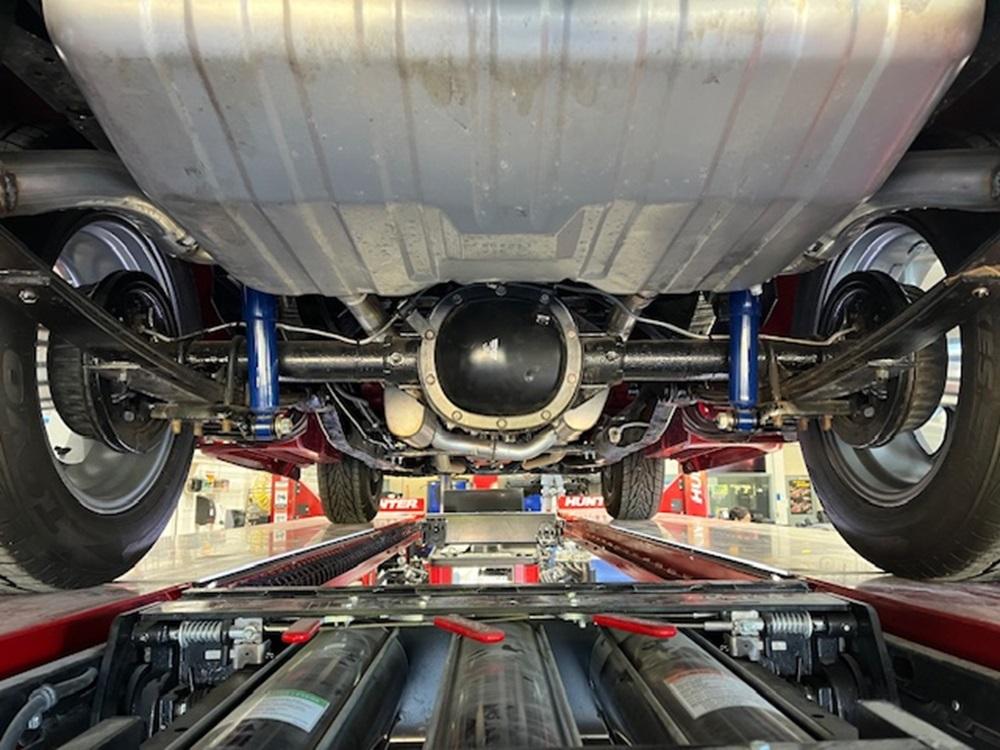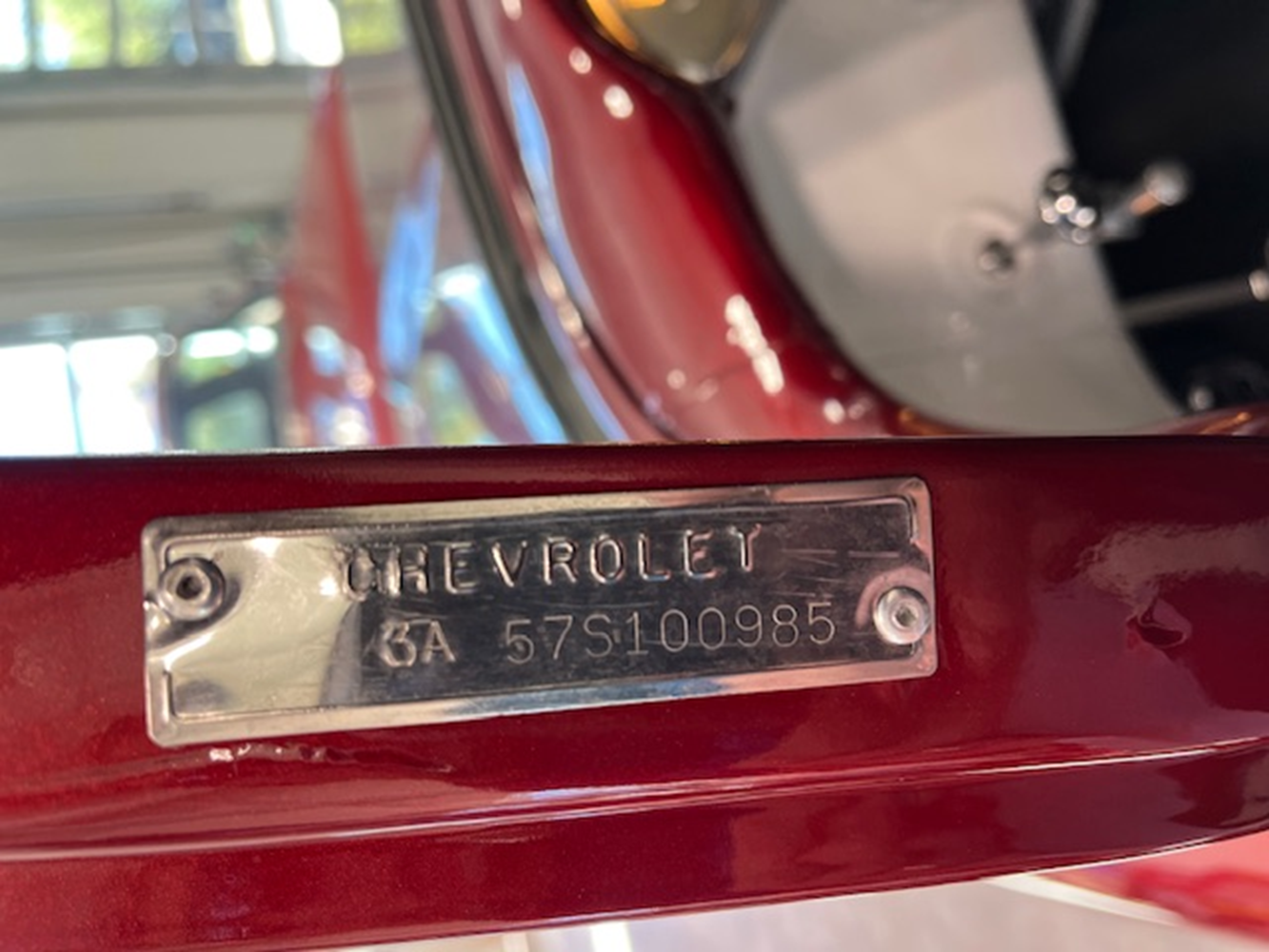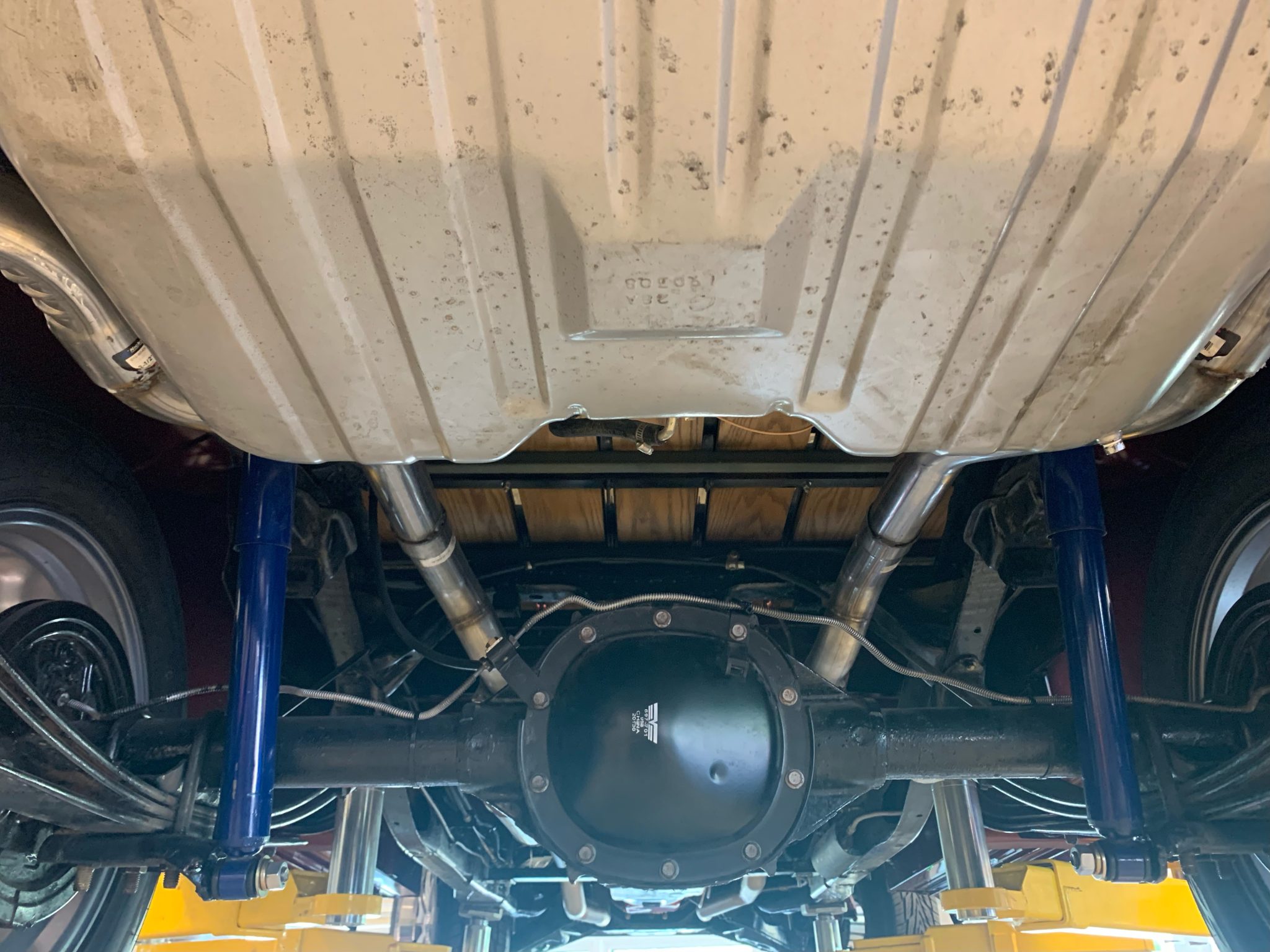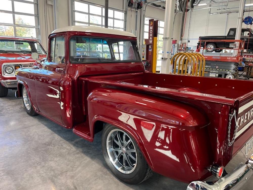 Work involved fitting an aftermarket cab, installing the bodywork on a Chevrolet S-10 frame, and rebuilding the 350ci V8. The engine is equipped with an Edelbrock carburetor and a CVF Racing serpentine belt system, and it is backed by a TH400 three-speed automatic transmission and a 10-bolt rear end. Refinished in maroon with white exterior and interior accents, the truck rides on 18″ Vision wheels and has front disc brakes, a wood-lined bed, chrome bumpers, and a wraparound rear window. Other build details include a refreshed cabin with a bench seat trimmed in black with red stitching along with a Lokar shifter, air conditioning, and a retro-look stereo.