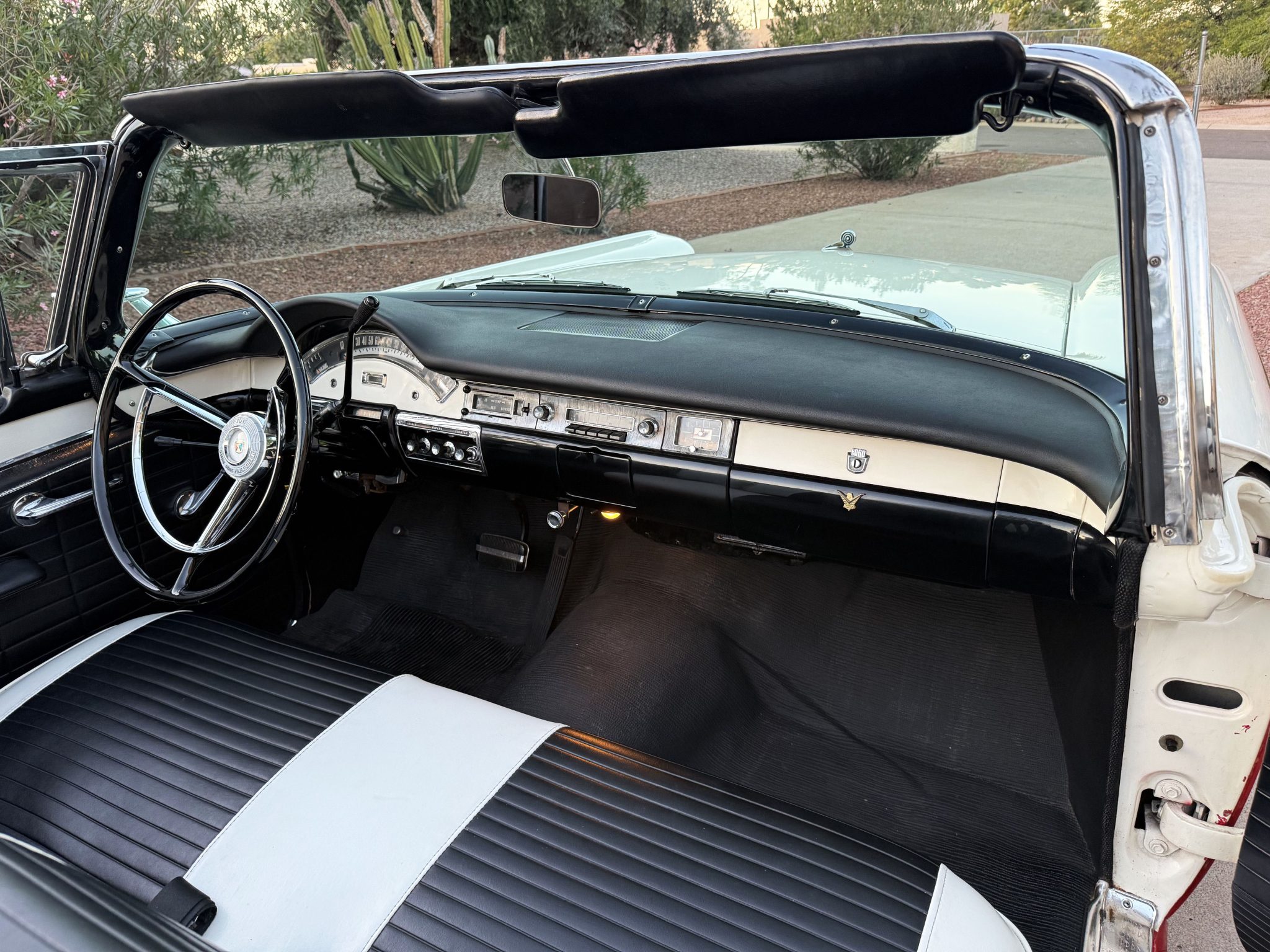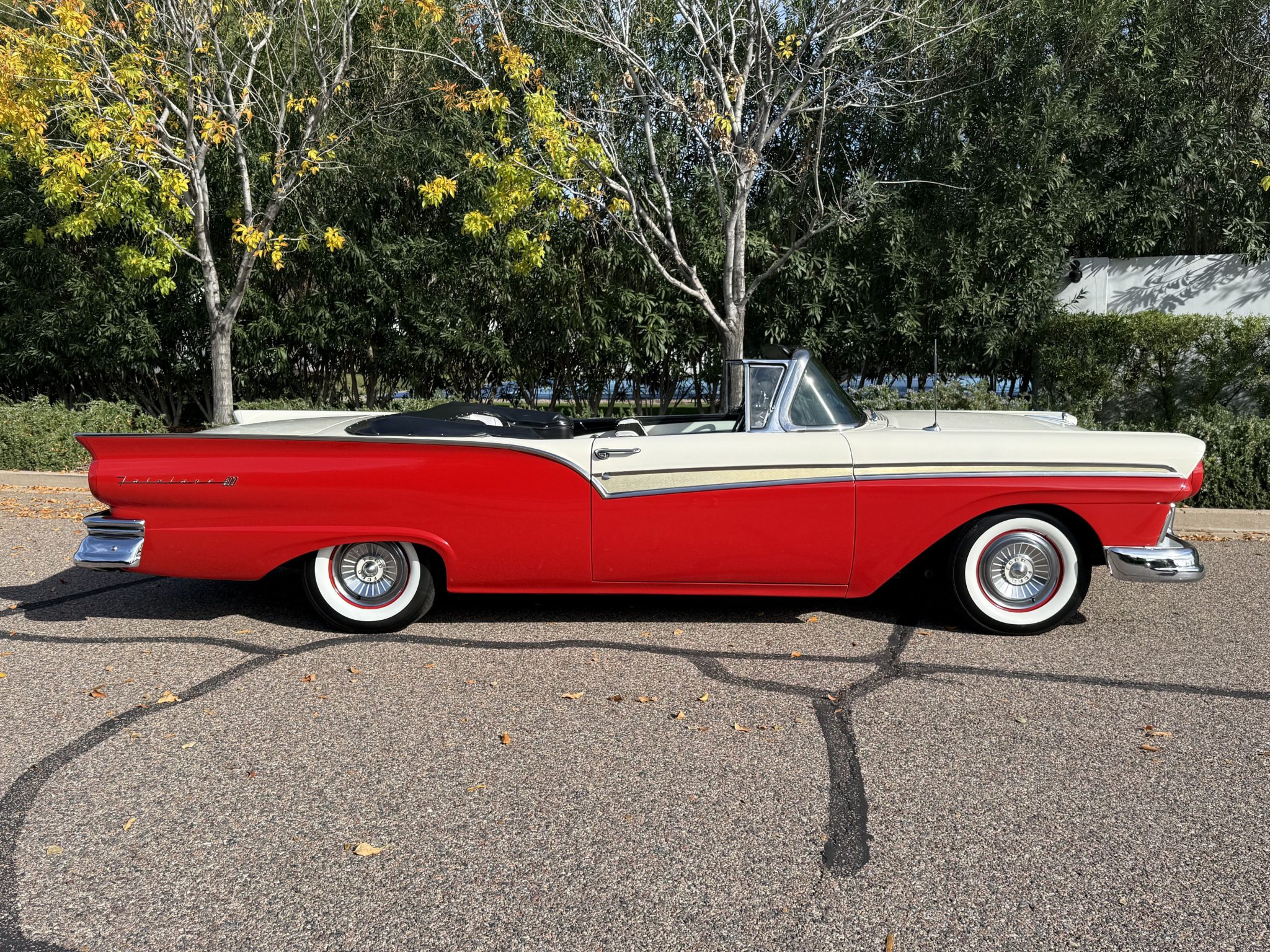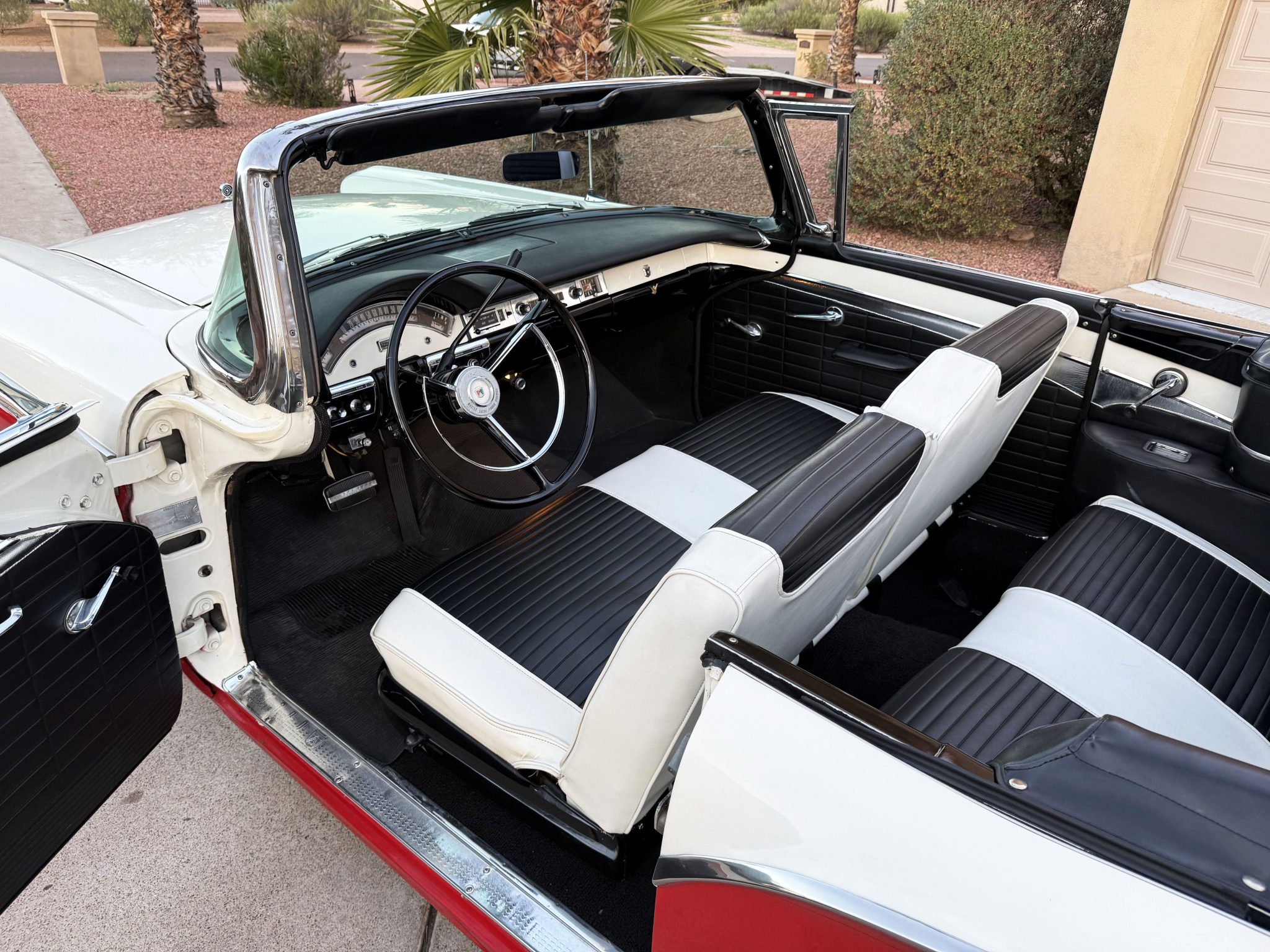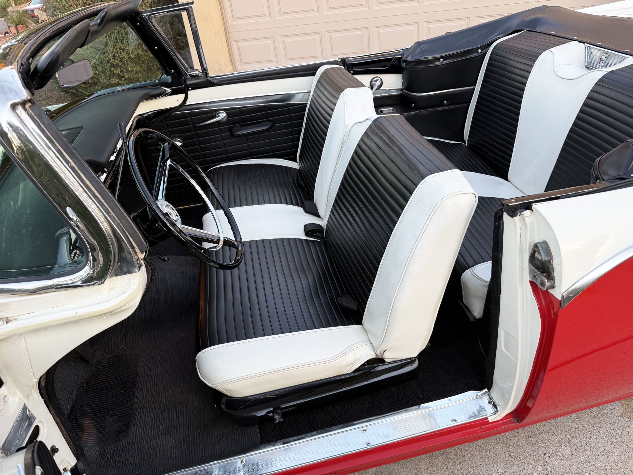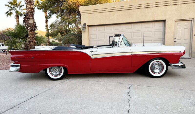 It is powered by a 312ci V8 paired with a Ford-O-Matic three-speed automatic transmission, and additional equipment includes a dual exhaust system, power steering, power-assisted drum brakes, a power-operated white soft top, and hooded headlights.