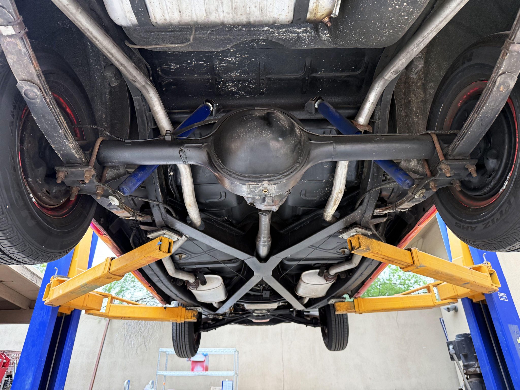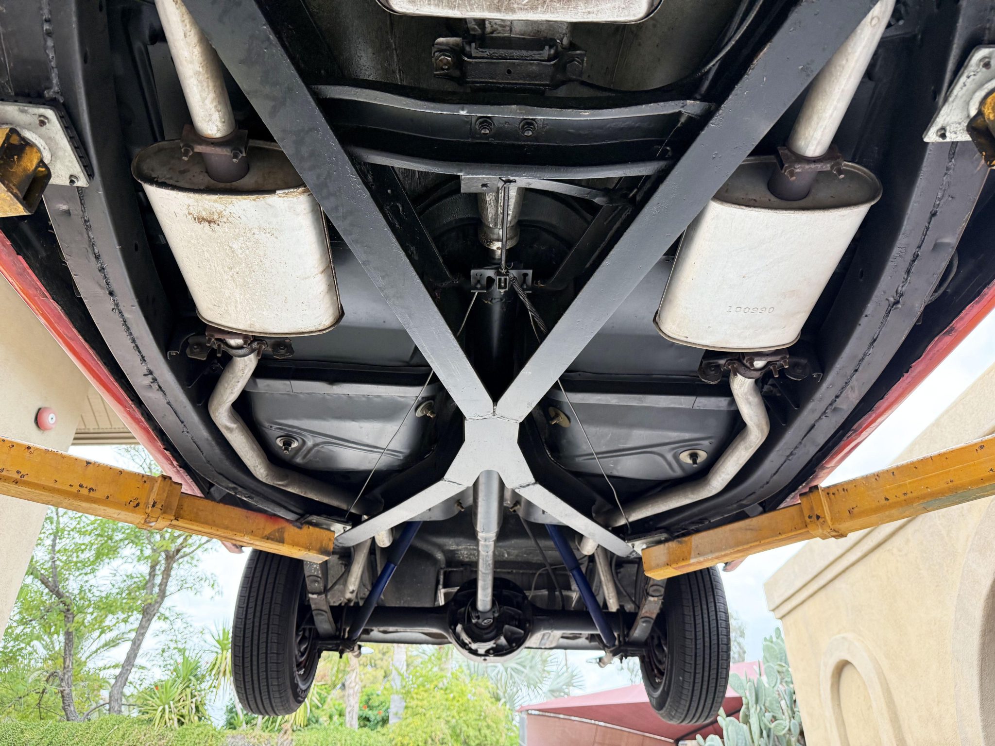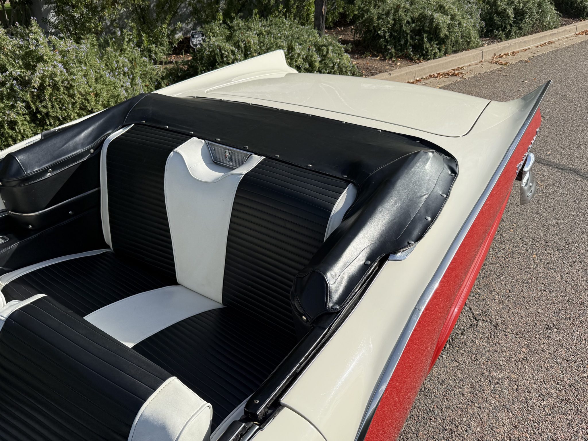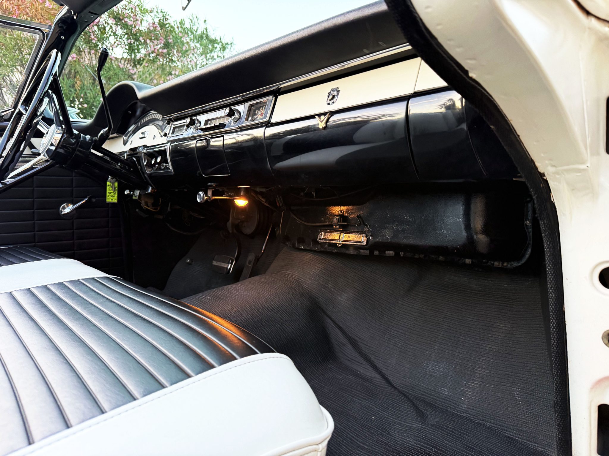 It is powered by a 312ci V8 paired with a Ford-O-Matic three-speed automatic transmission, and additional equipment includes a dual exhaust system, power steering, power-assisted drum brakes, a power-operated white soft top, and hooded headlights.