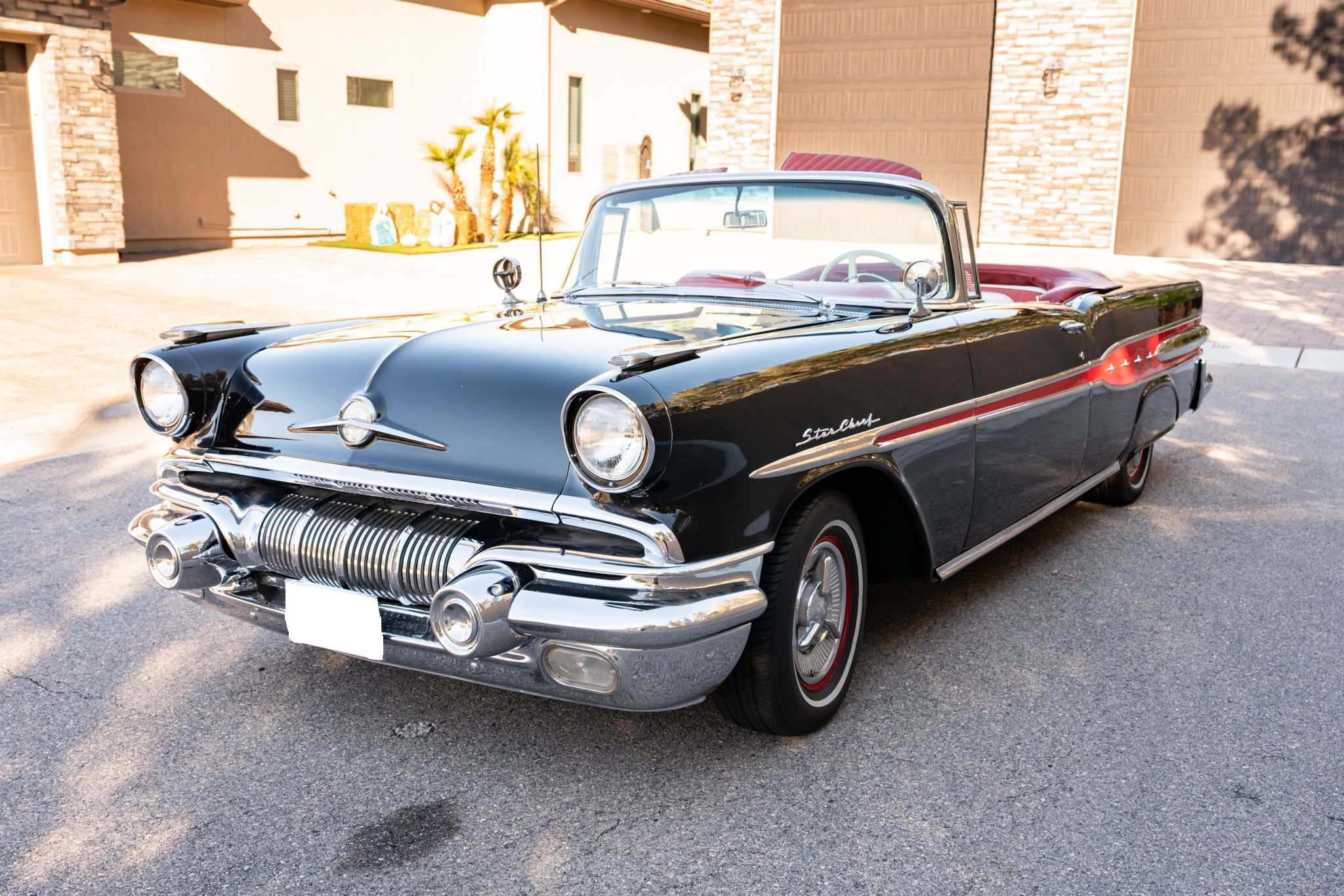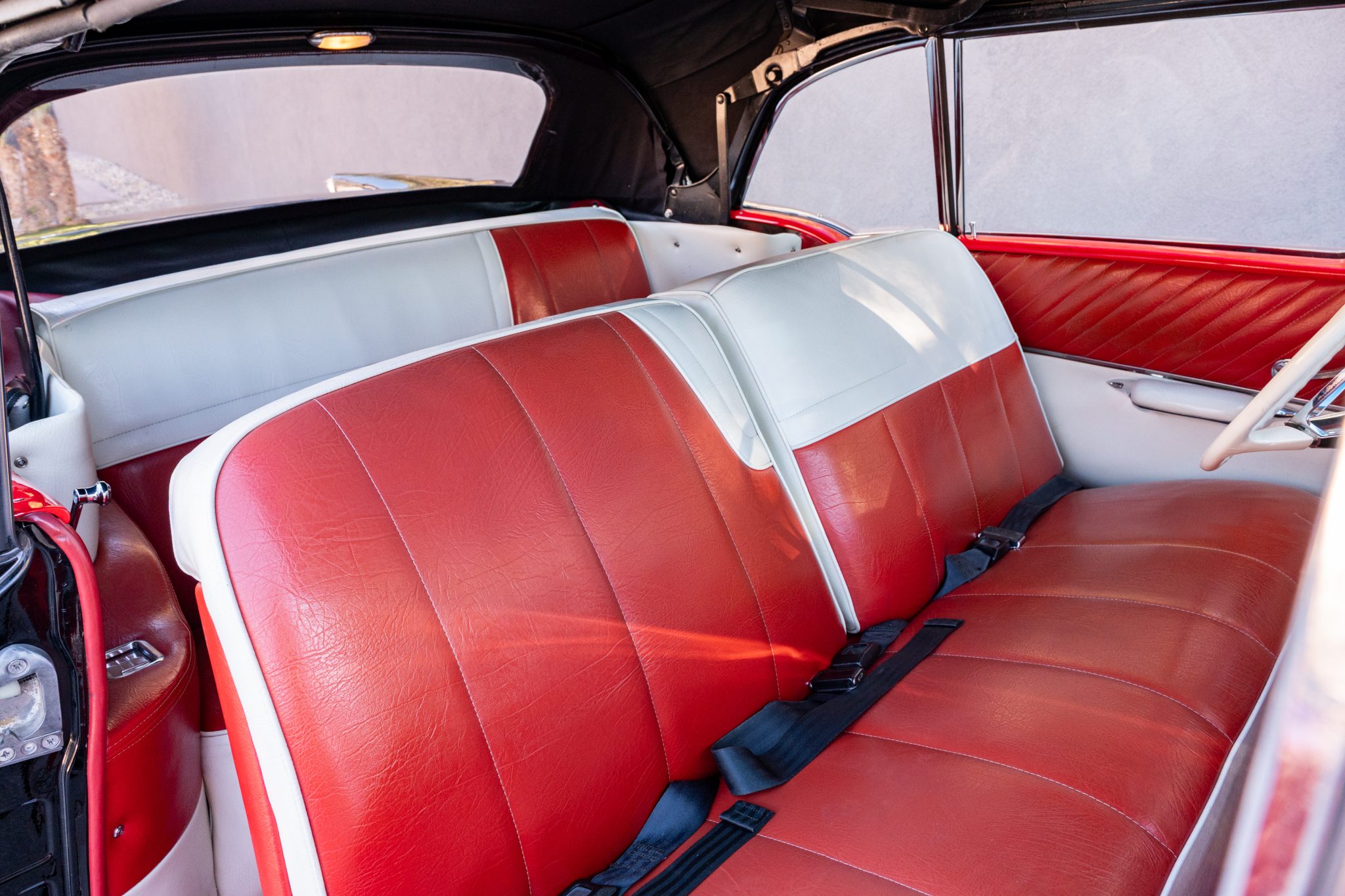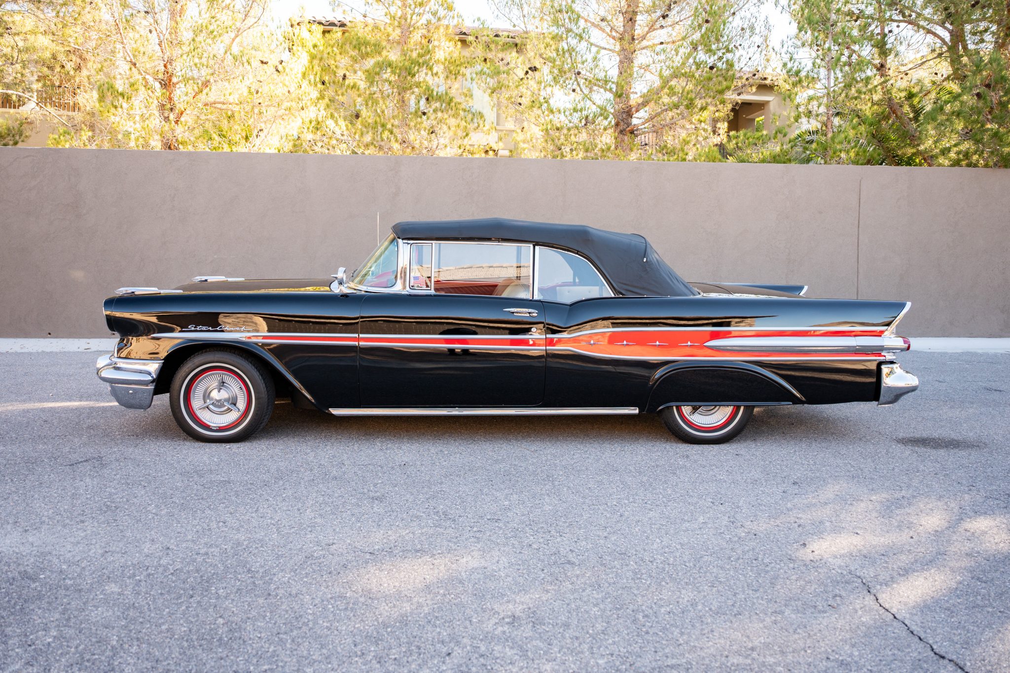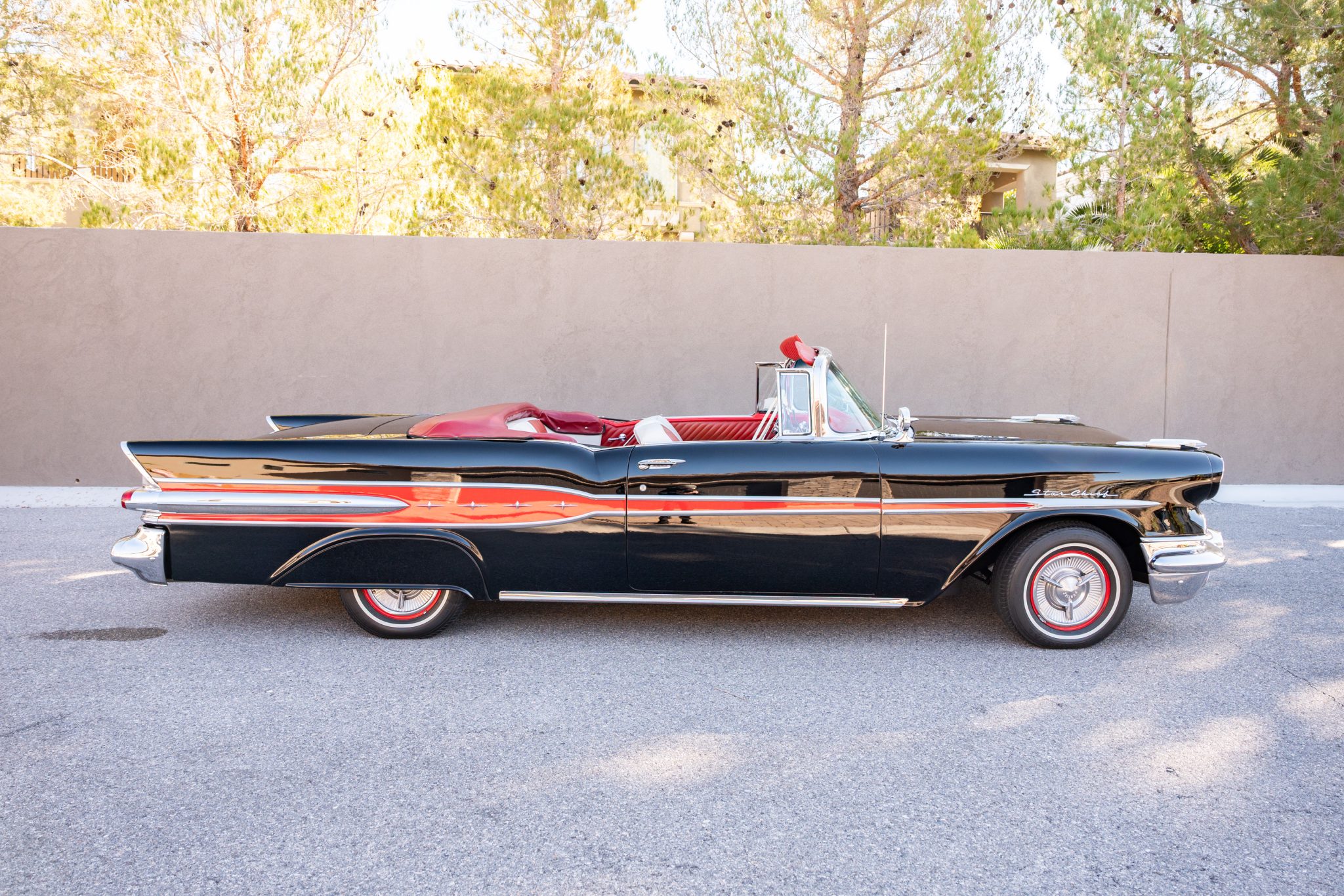 Refurbishment work was performed over the years, and the car has been refinished in black with red accents over a red and white interior. Power is provided by a 347ci V8 linked with a four-speed automatic transmission. Equipment includes a black convertible top, a red top boot, 14″ wheels, front disc brakes, power steering, lap belts, and air conditioning.