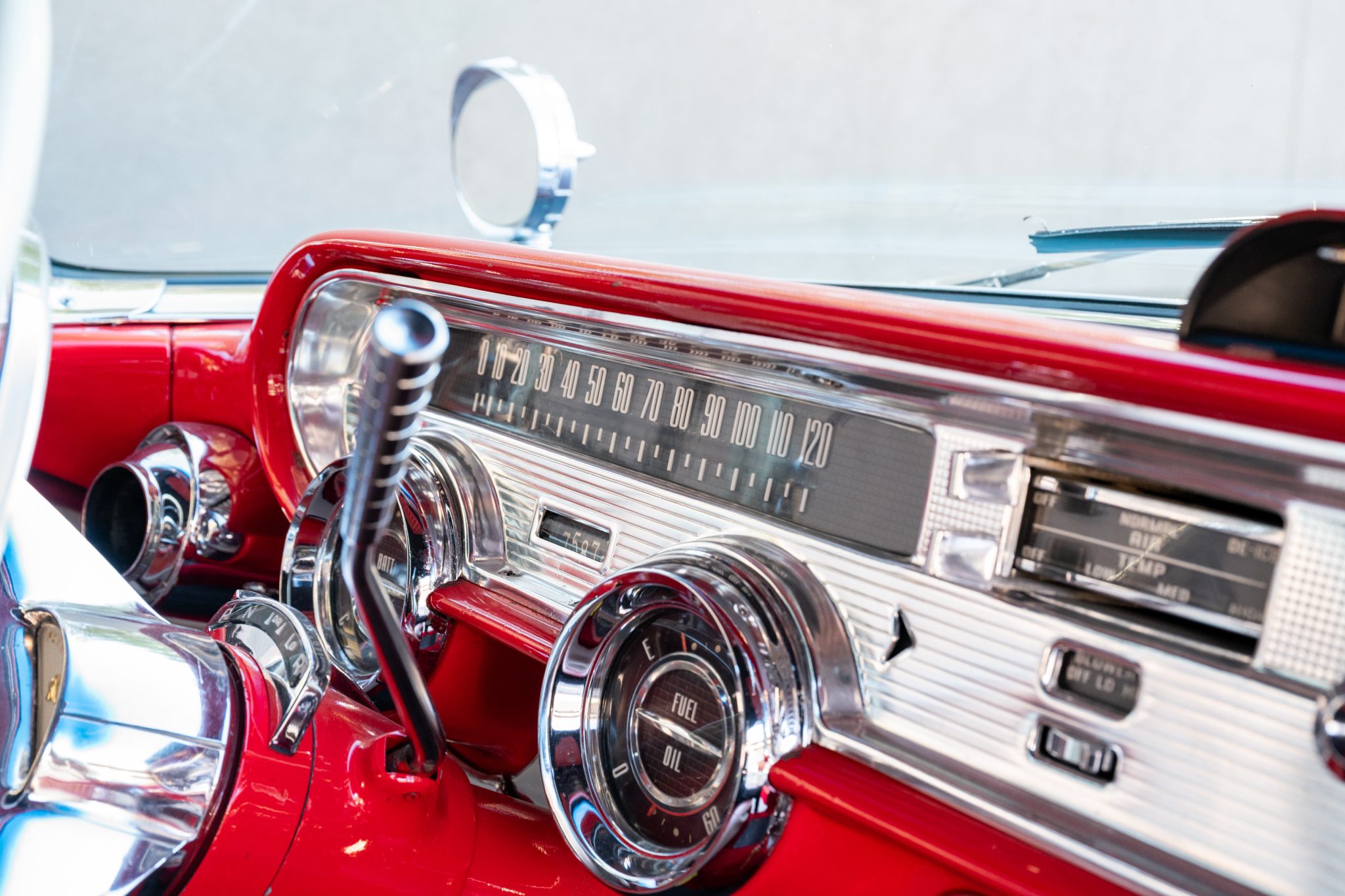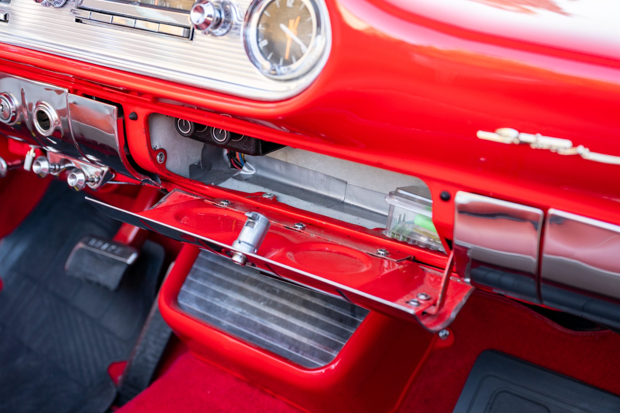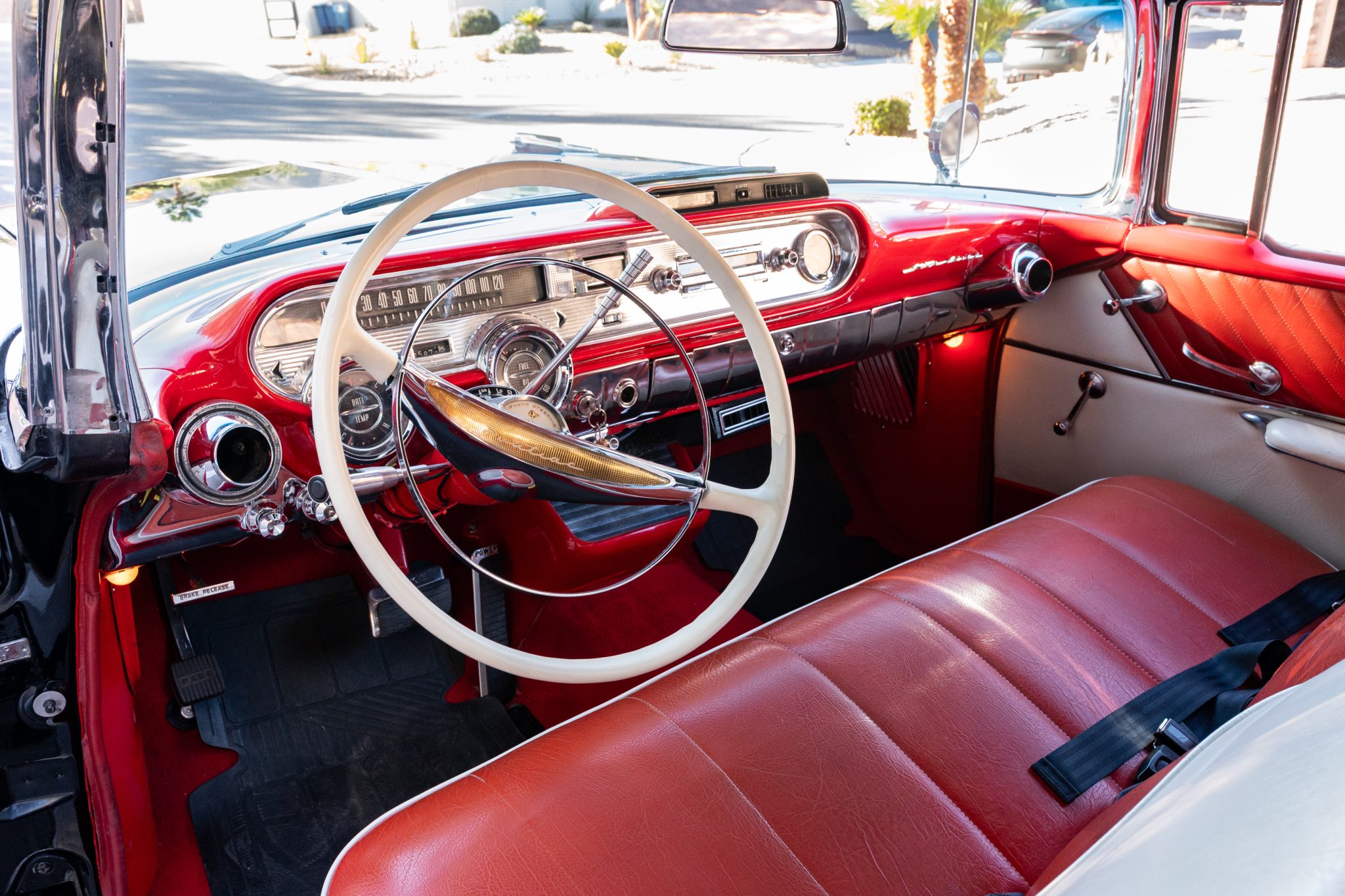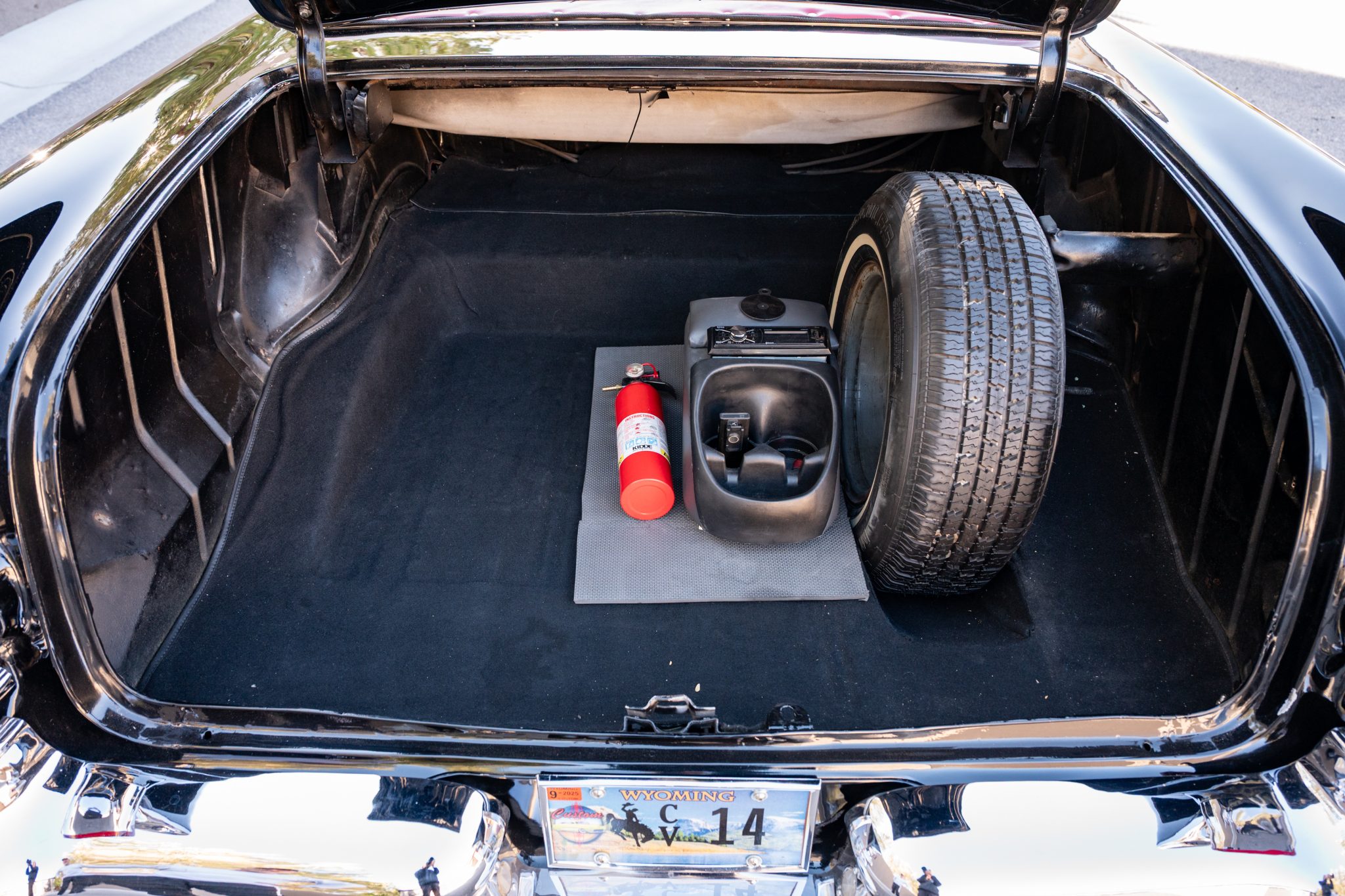 Refurbishment work was performed over the years, and the car has been refinished in black with red accents over a red and white interior. Power is provided by a 347ci V8 linked with a four-speed automatic transmission. Equipment includes a black convertible top, a red top boot, 14″ wheels, front disc brakes, power steering, lap belts, and air conditioning.
