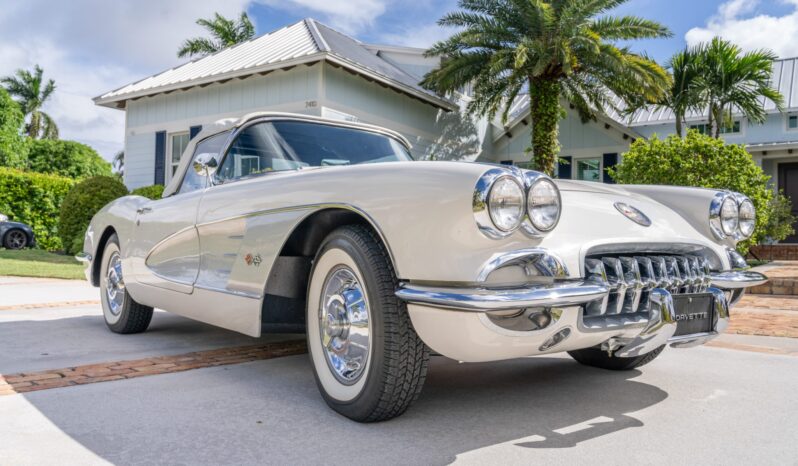 This 1958 Chevrolet Corvette is finished in white with silver coves over Charcoal vinyl and is powered by a 283ci V8 paired with a three-speed manual transmission. Features include a removable body-color hardtop, 15″ steel wheels, windshield washers, and a dash-mounted rearview mirror.