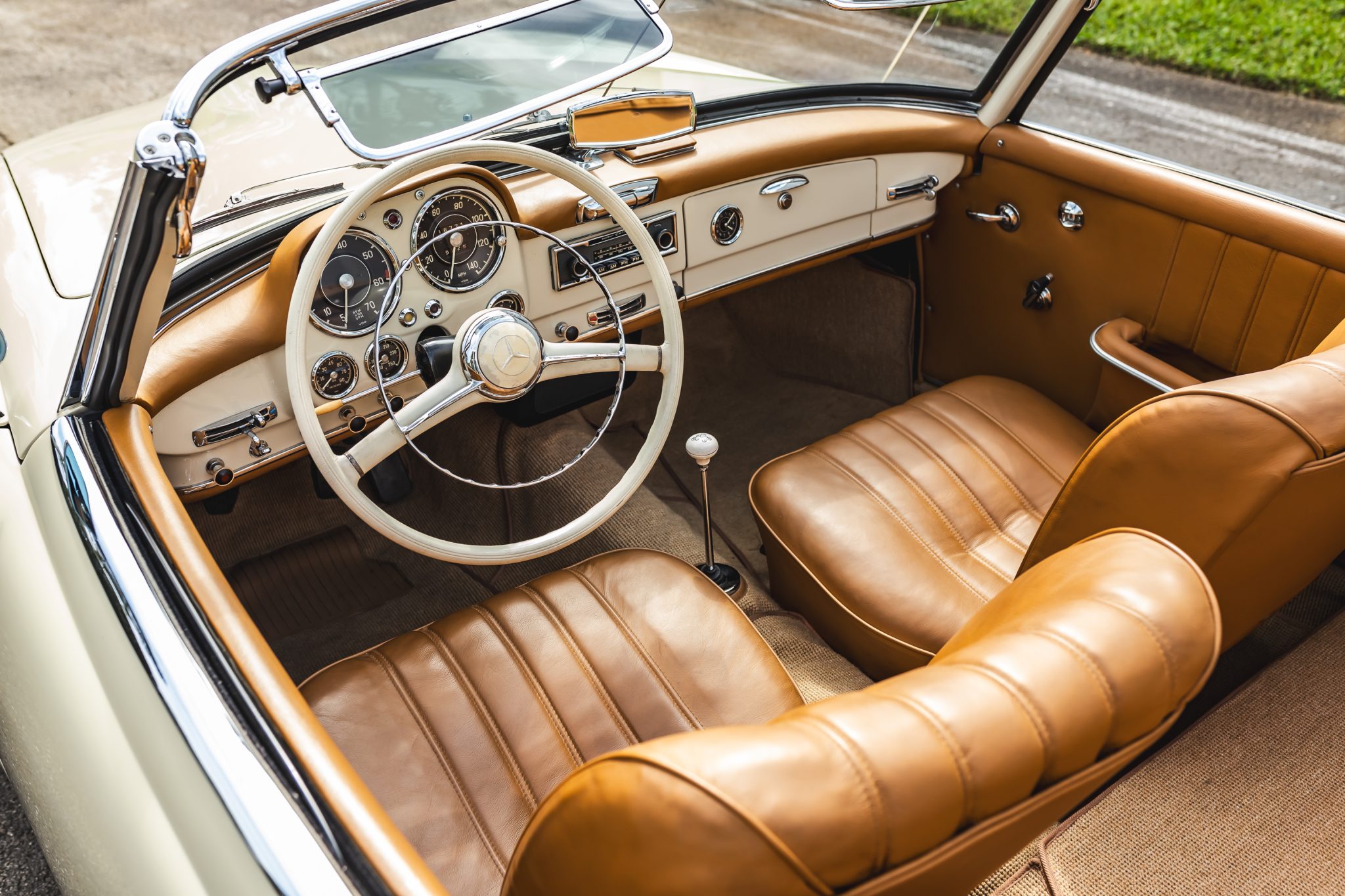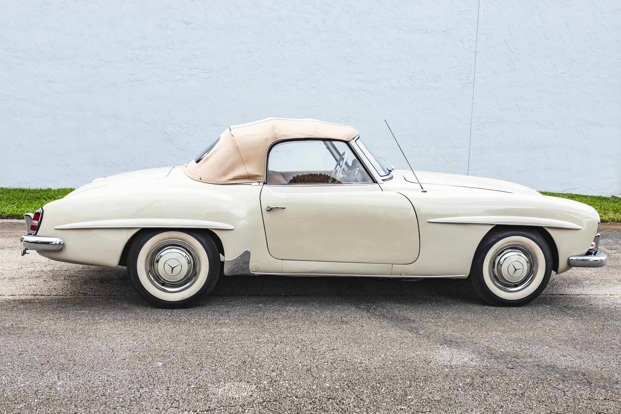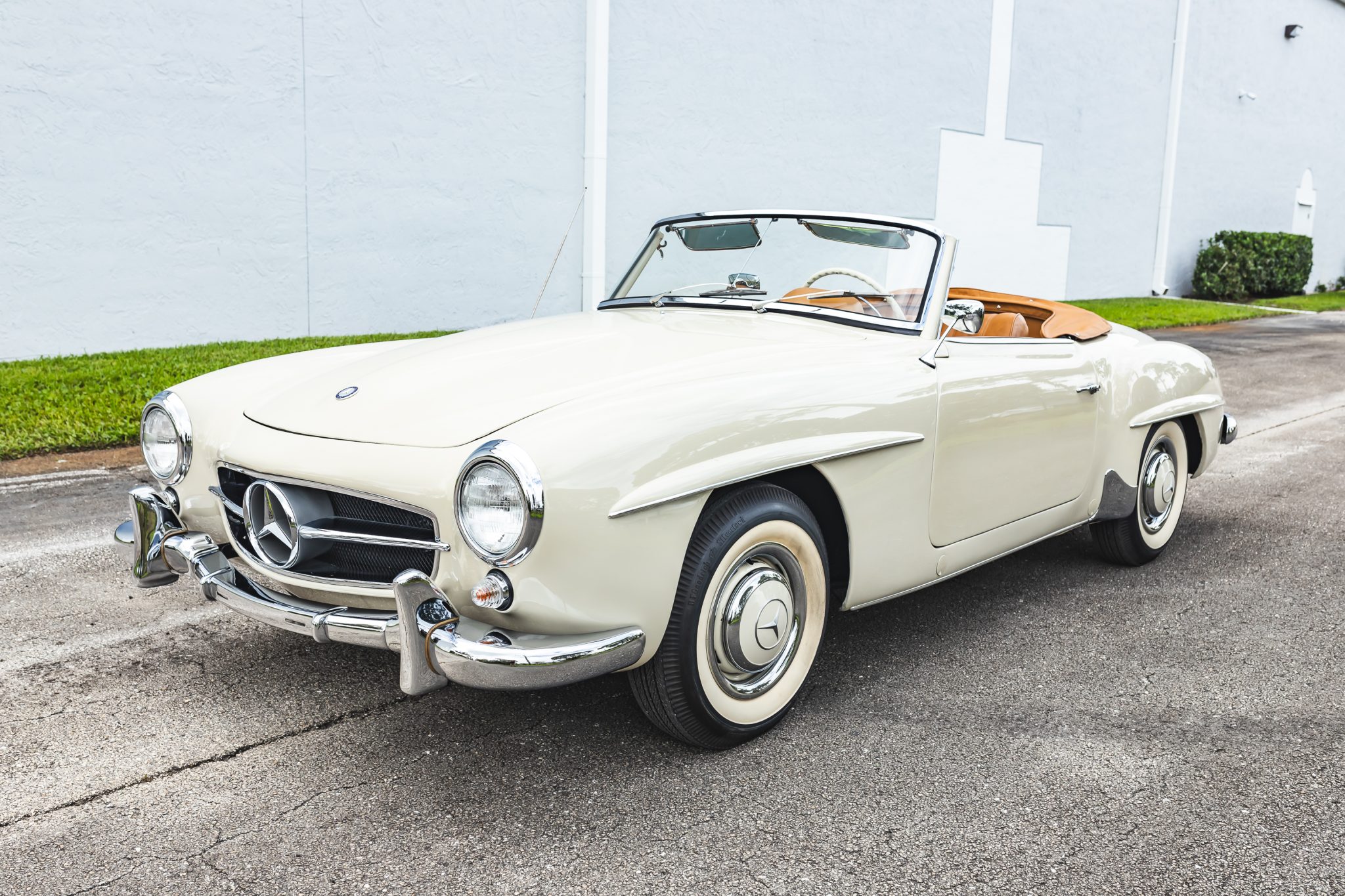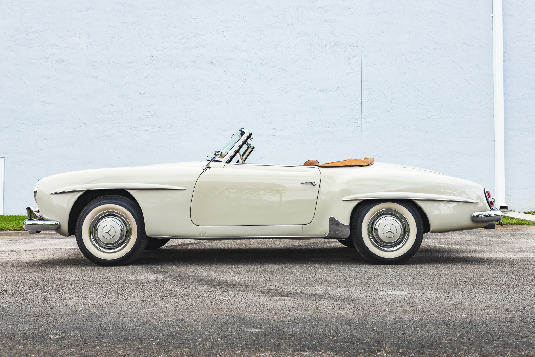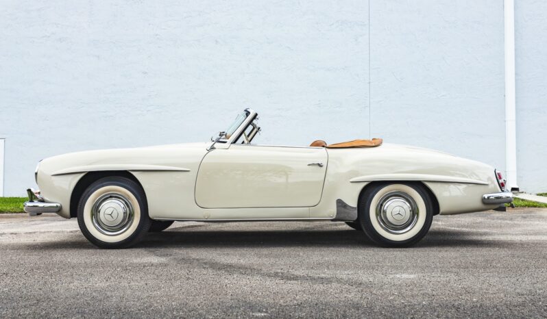 This 1958 Mercedes-Benz 190SL is powered by a 1.9-liter inline-four paired with a four-speed manual transmission and is finished in White Gray over tan leather. Equipment includes a beige soft top, 13″ steel wheels with body-color hubcaps, and a Becker radio.