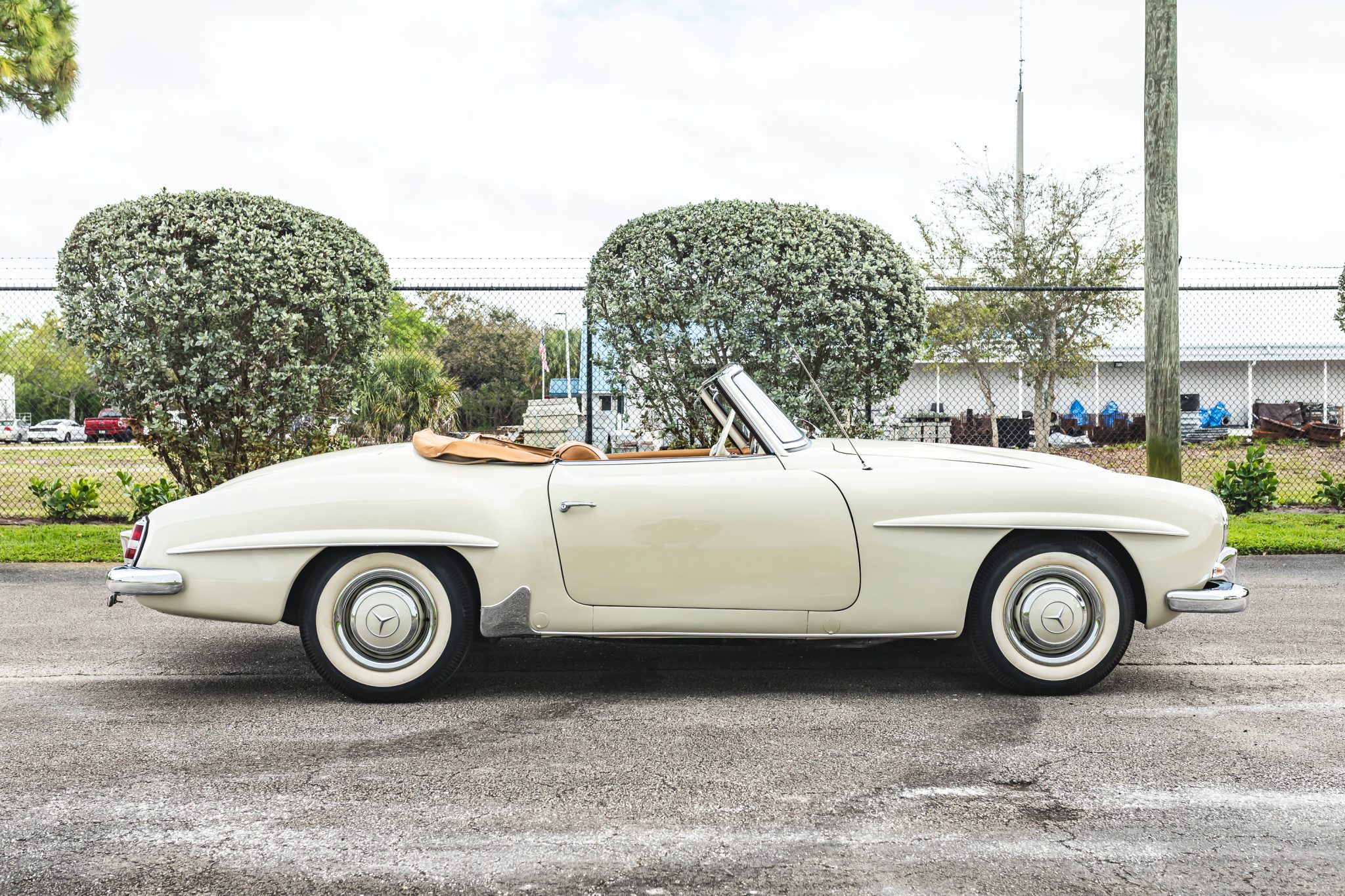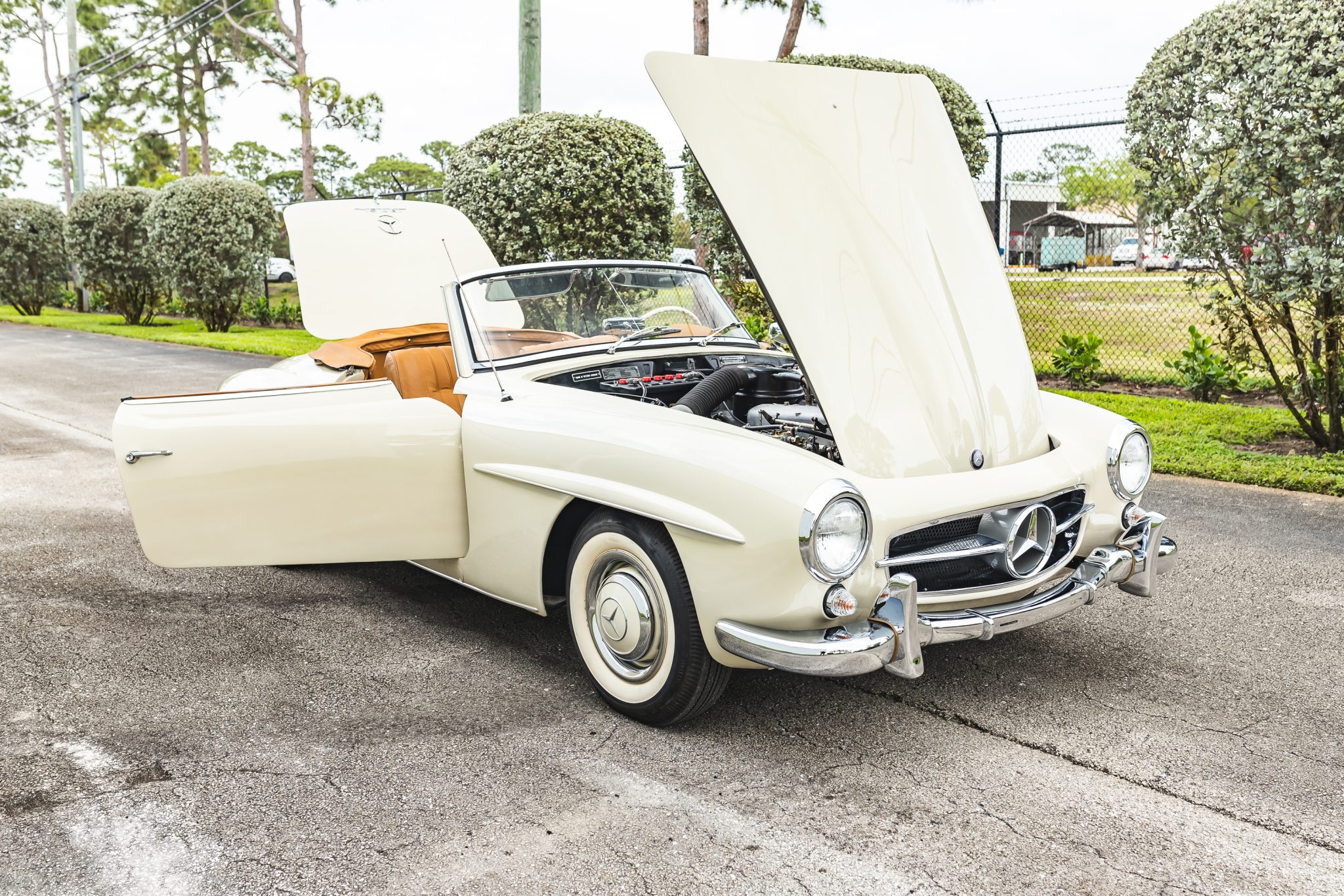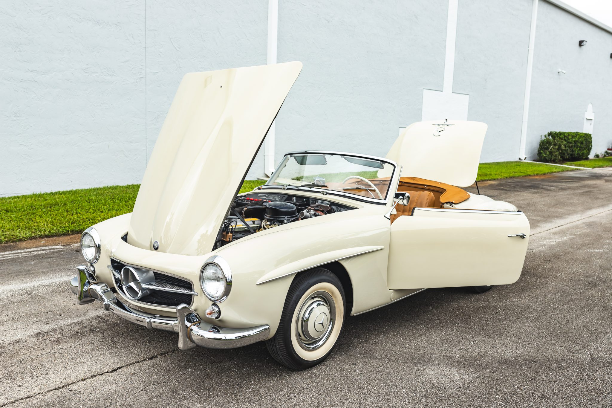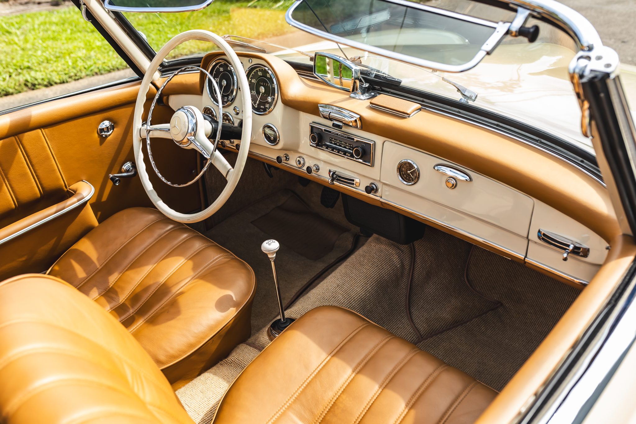 This 1958 Mercedes-Benz 190SL is powered by a 1.9-liter inline-four paired with a four-speed manual transmission and is finished in White Gray over tan leather. Equipment includes a beige soft top, 13″ steel wheels with body-color hubcaps, and a Becker radio.