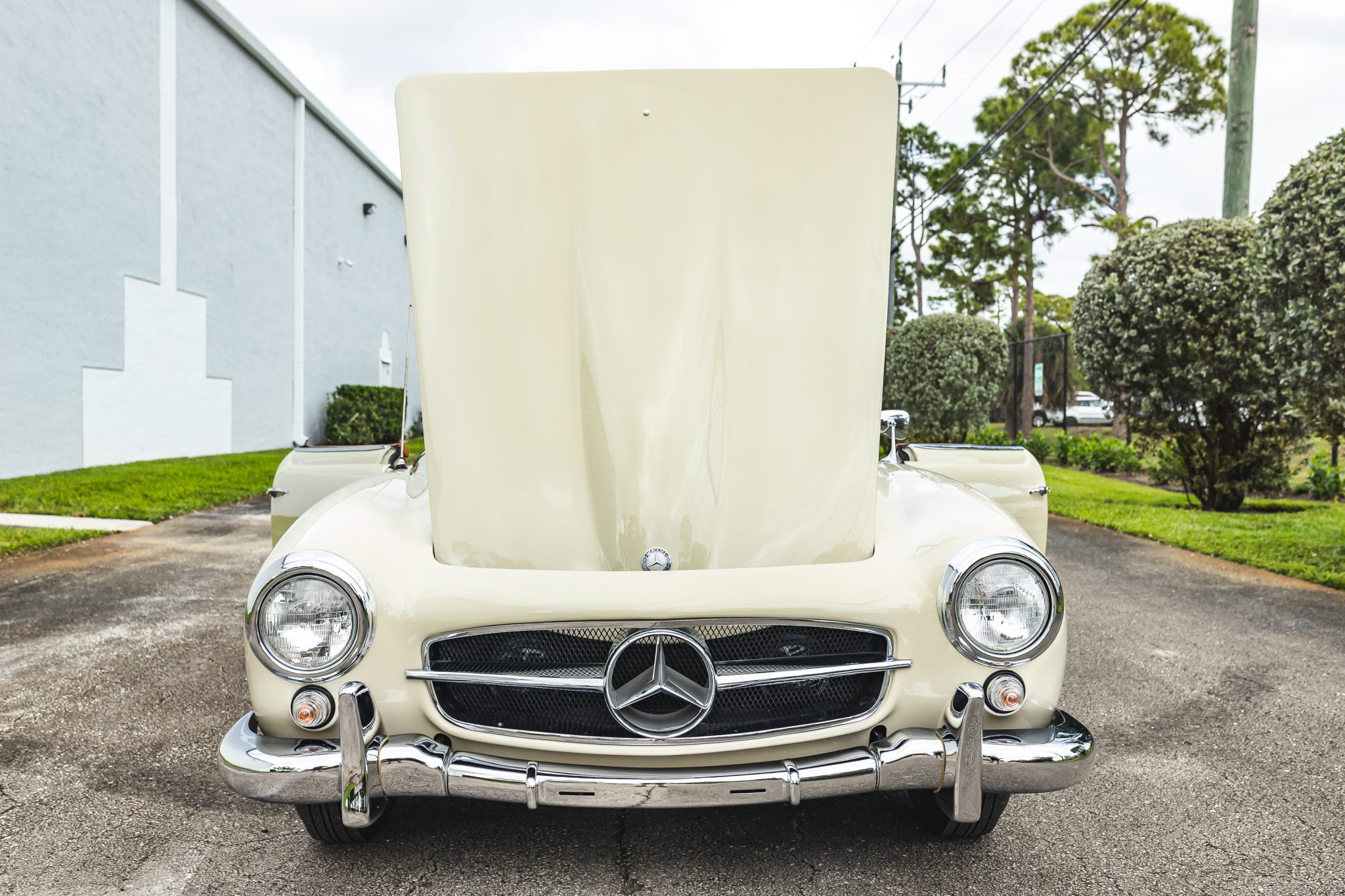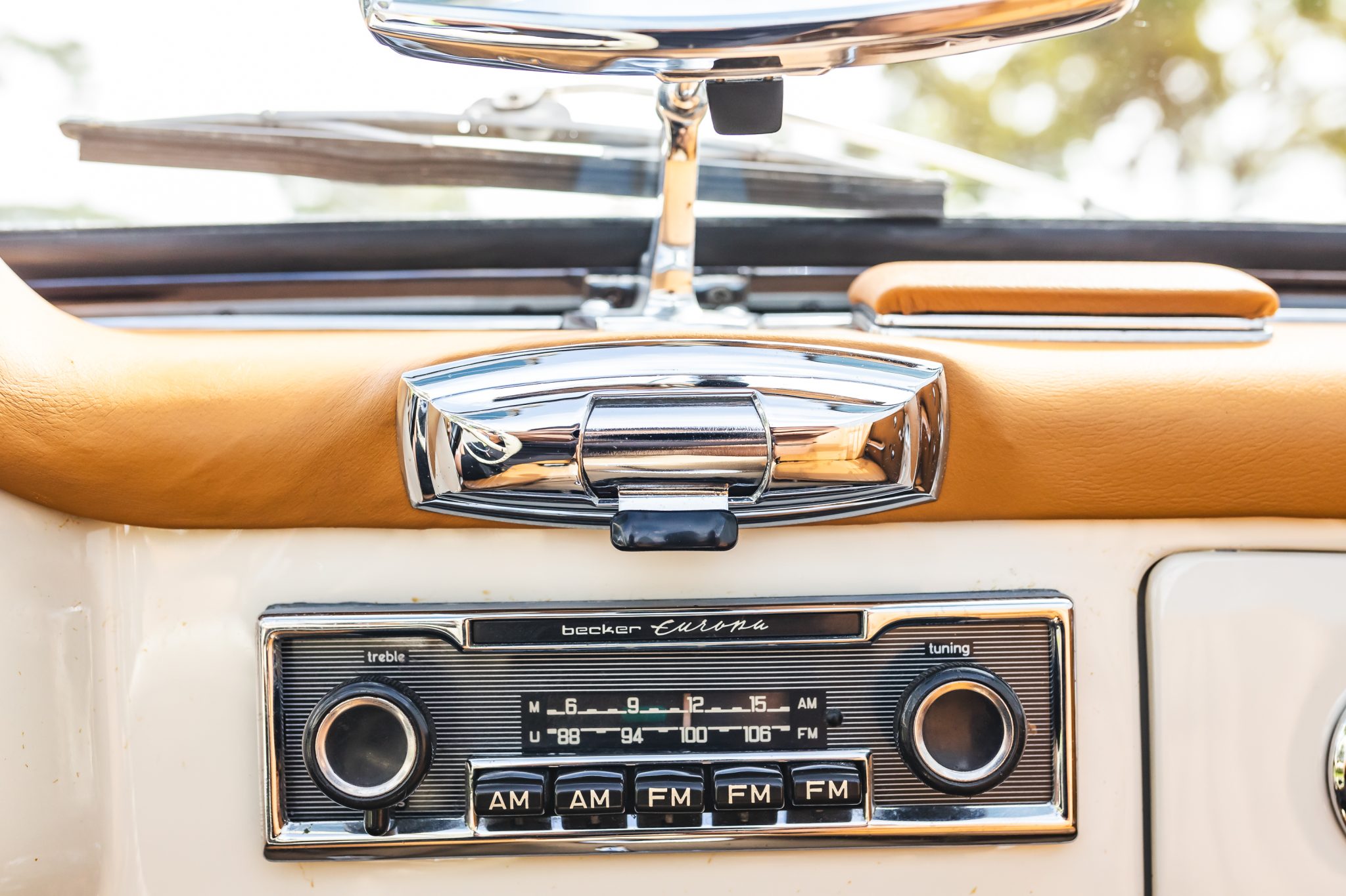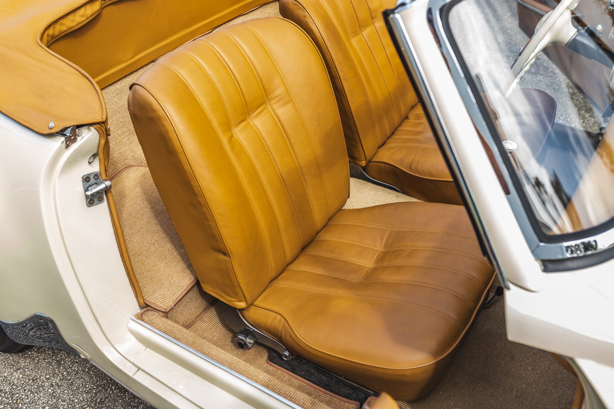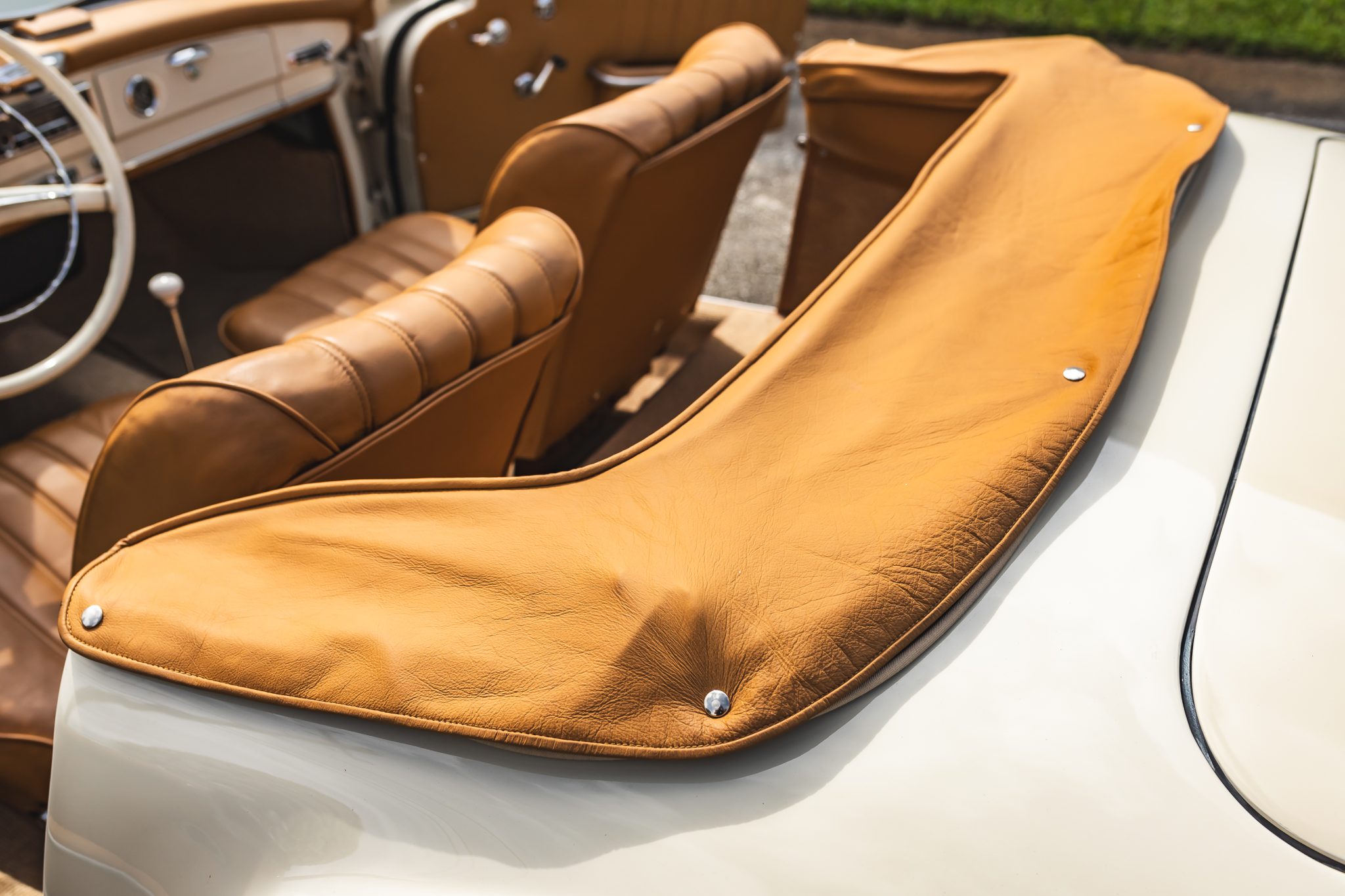 This 1958 Mercedes-Benz 190SL is powered by a 1.9-liter inline-four paired with a four-speed manual transmission and is finished in White Gray over tan leather. Equipment includes a beige soft top, 13″ steel wheels with body-color hubcaps, and a Becker radio.