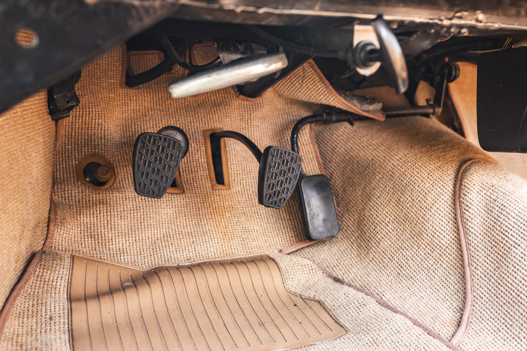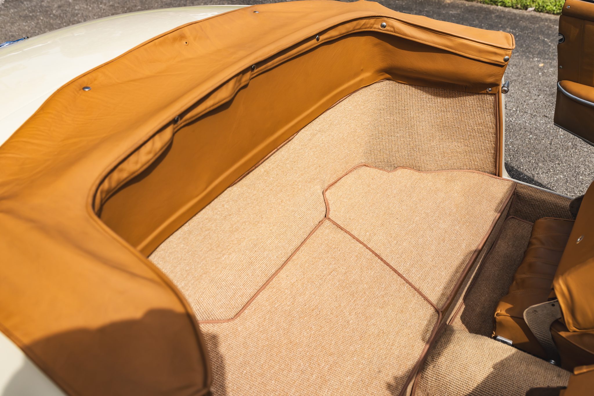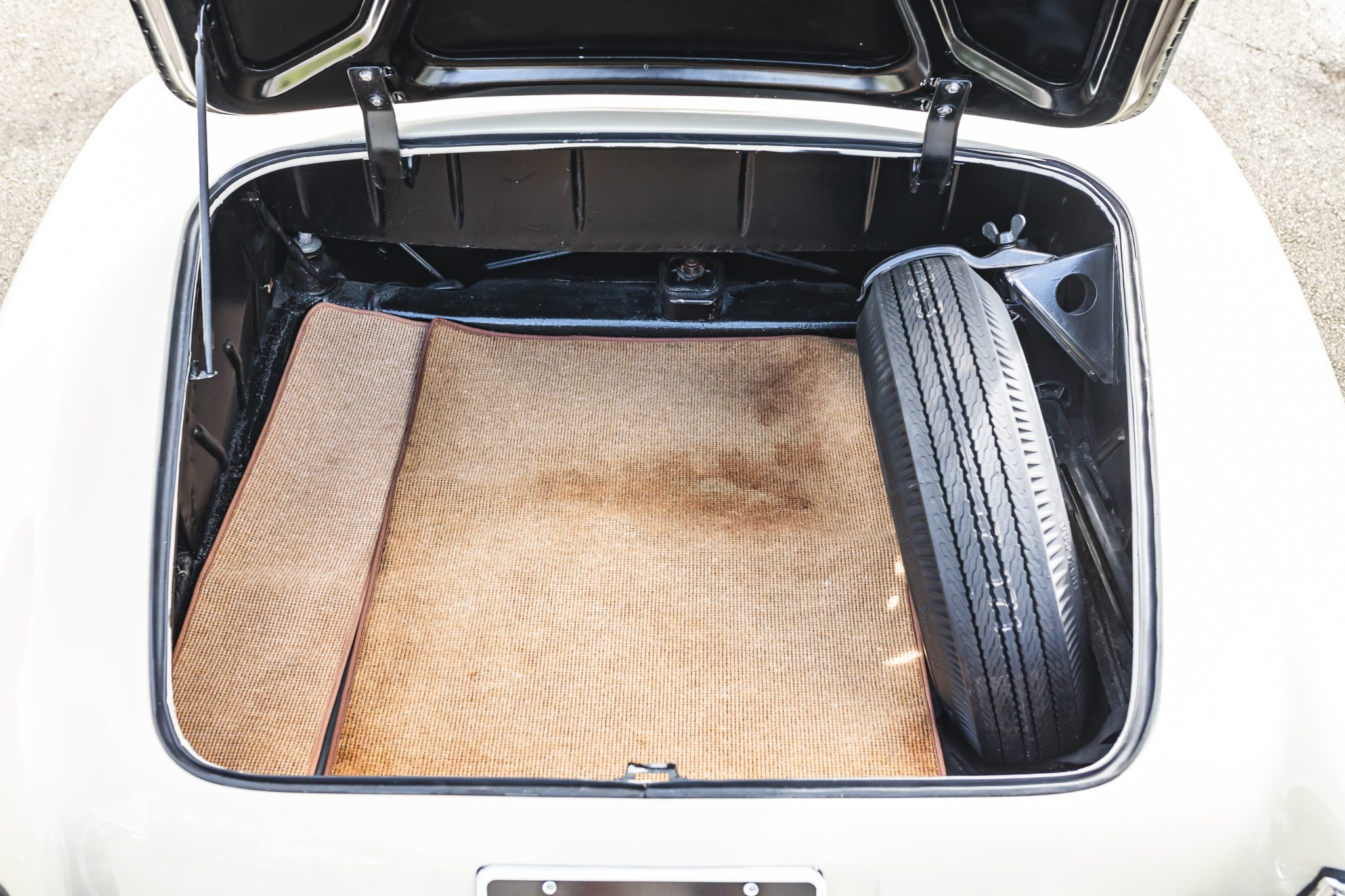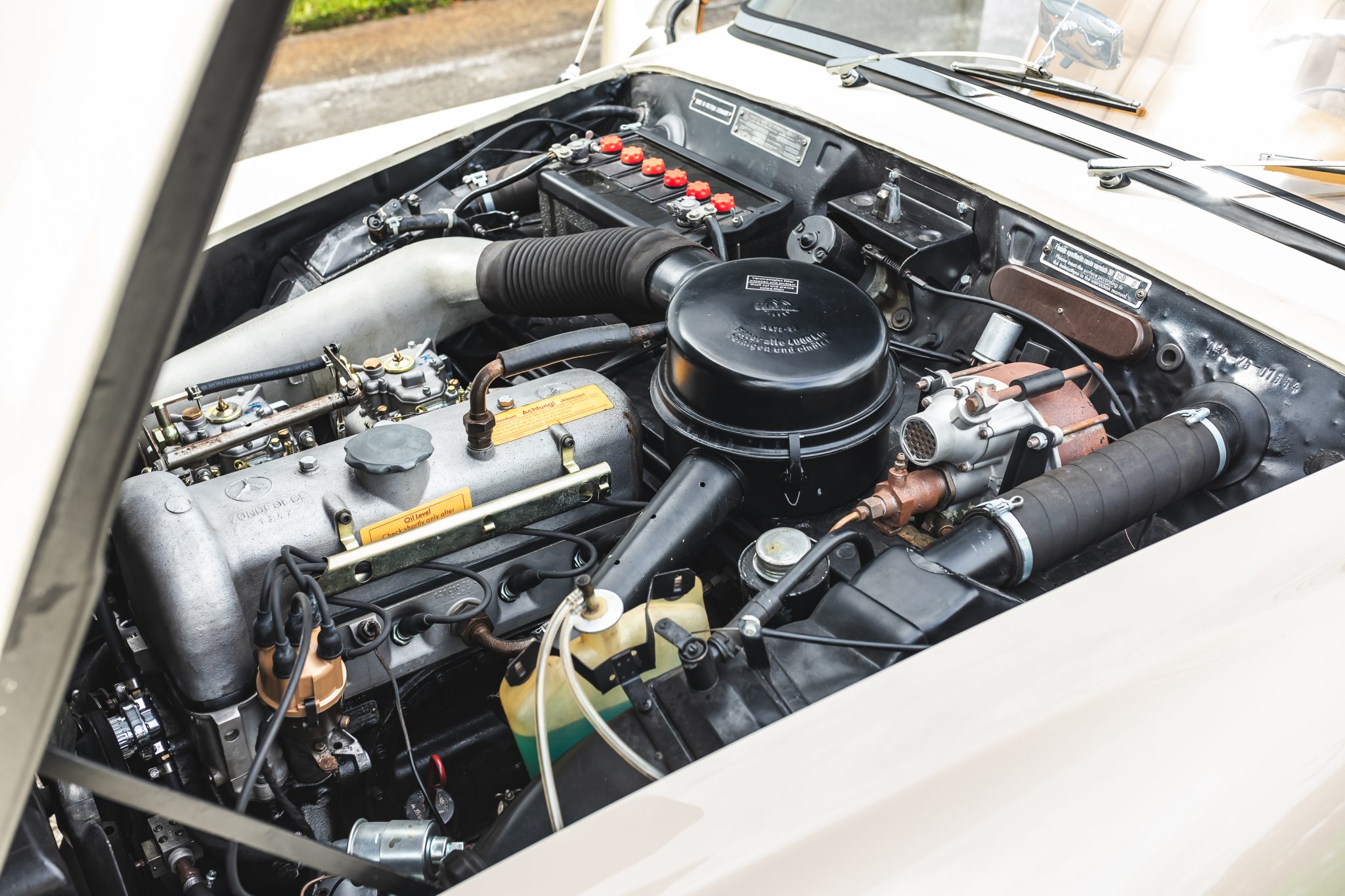 This 1958 Mercedes-Benz 190SL is powered by a 1.9-liter inline-four paired with a four-speed manual transmission and is finished in White Gray over tan leather. Equipment includes a beige soft top, 13″ steel wheels with body-color hubcaps, and a Becker radio.