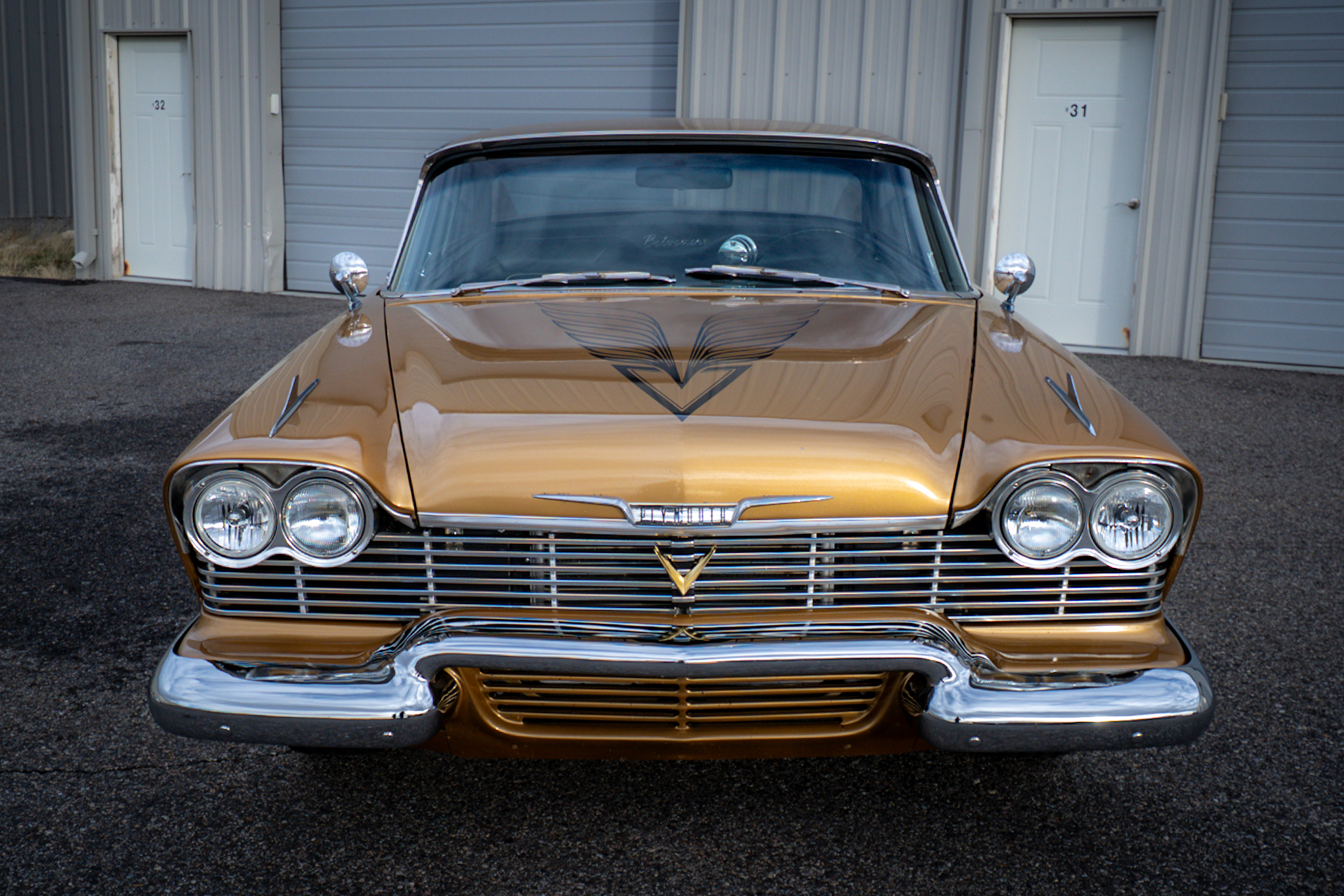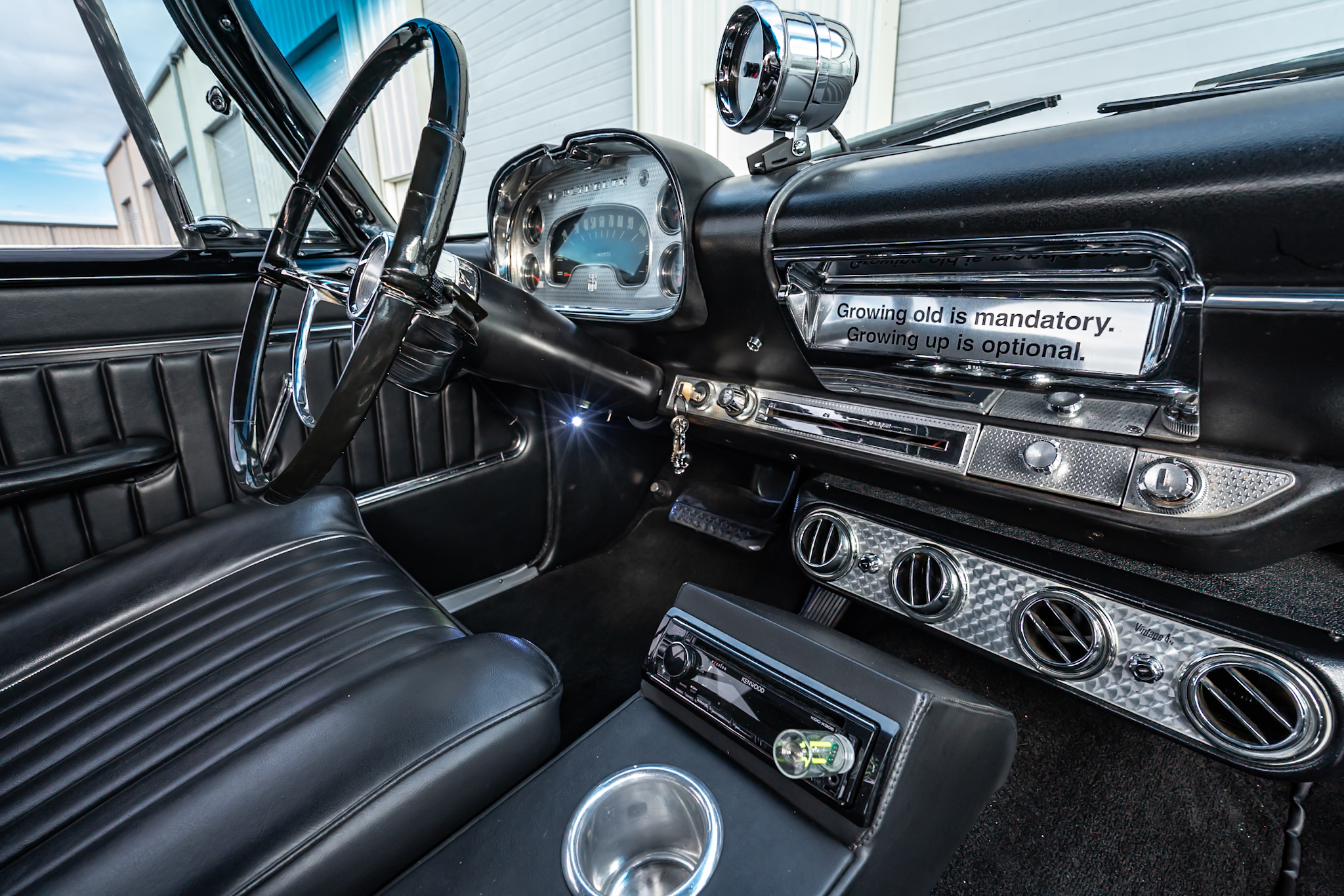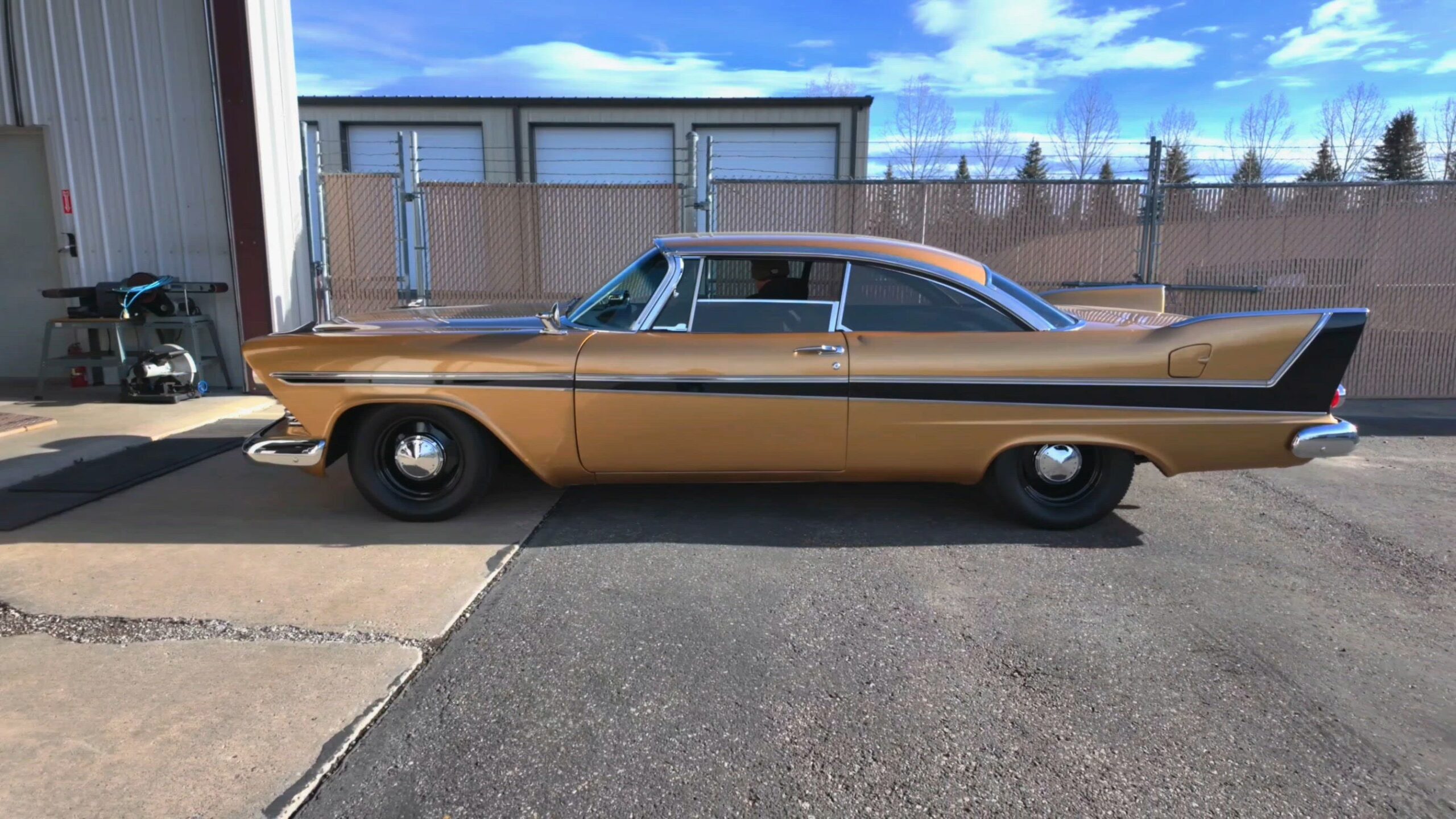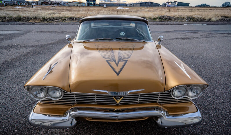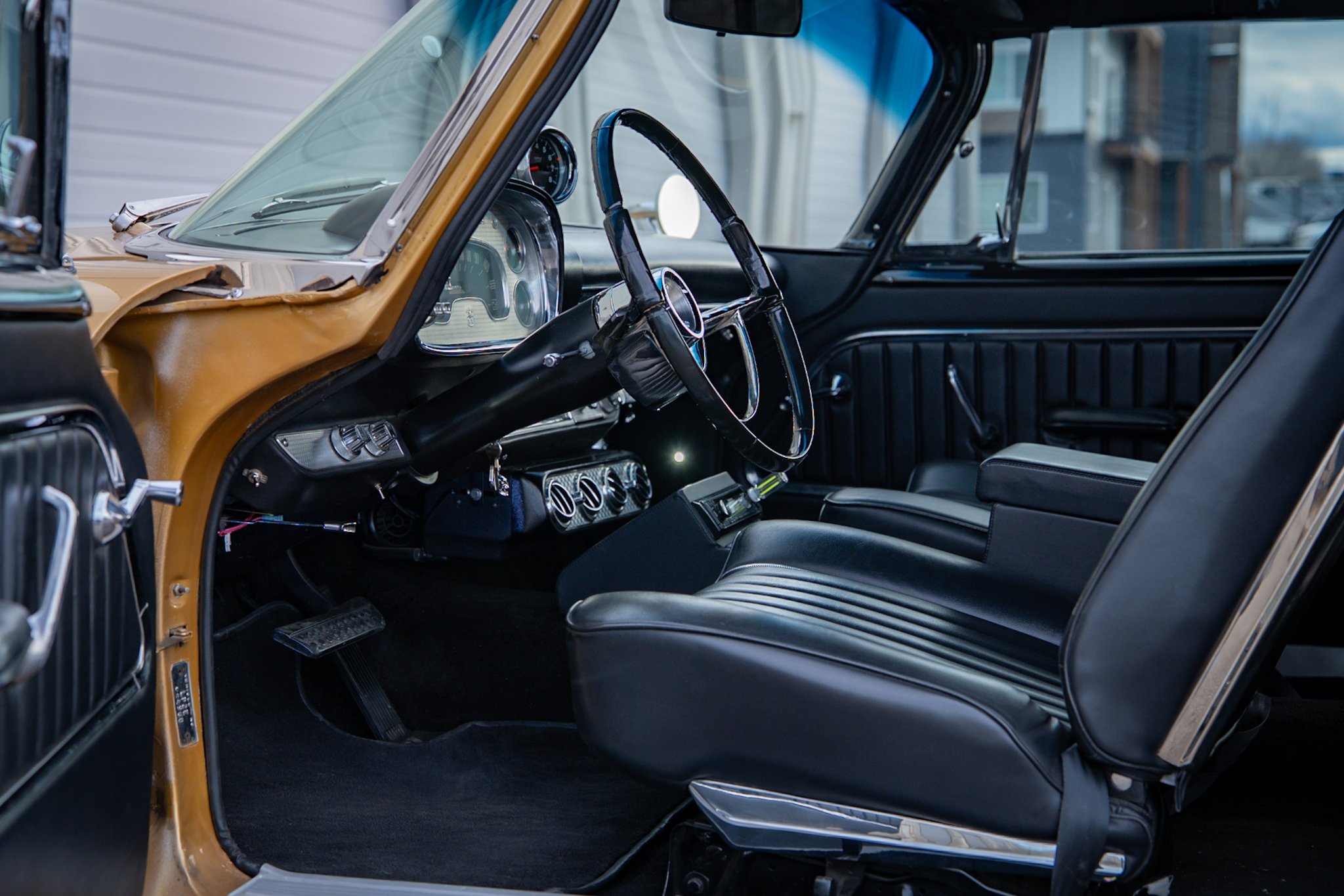 Work included installing a replacement 512ci V8, overhauling the three-speed automatic transmission, replacing the wheels and tires, retrofitting a front disc brake setup, and refreshing the black vinyl interior. The body is finished in gold with black accents on the hood and bodysides, and the cabin is outfitted with Vintage Air climate control, a custom center console, and a Kenwood CD stereo. Additional equipment includes a limited-slip differential, black 15” steel wheels, chrome hubcaps, power steering, long-tube headers, and an X-pipe exhaust with MagnaFlow mufflers.