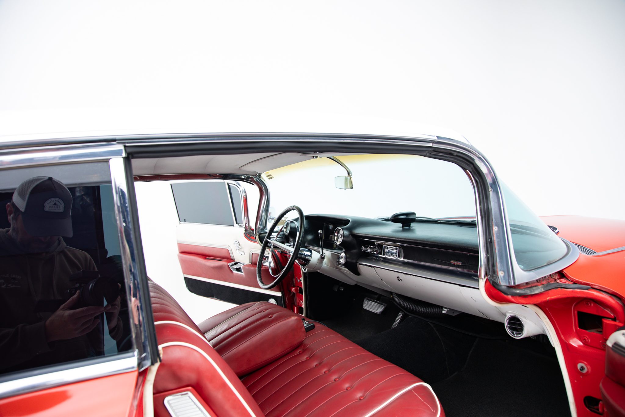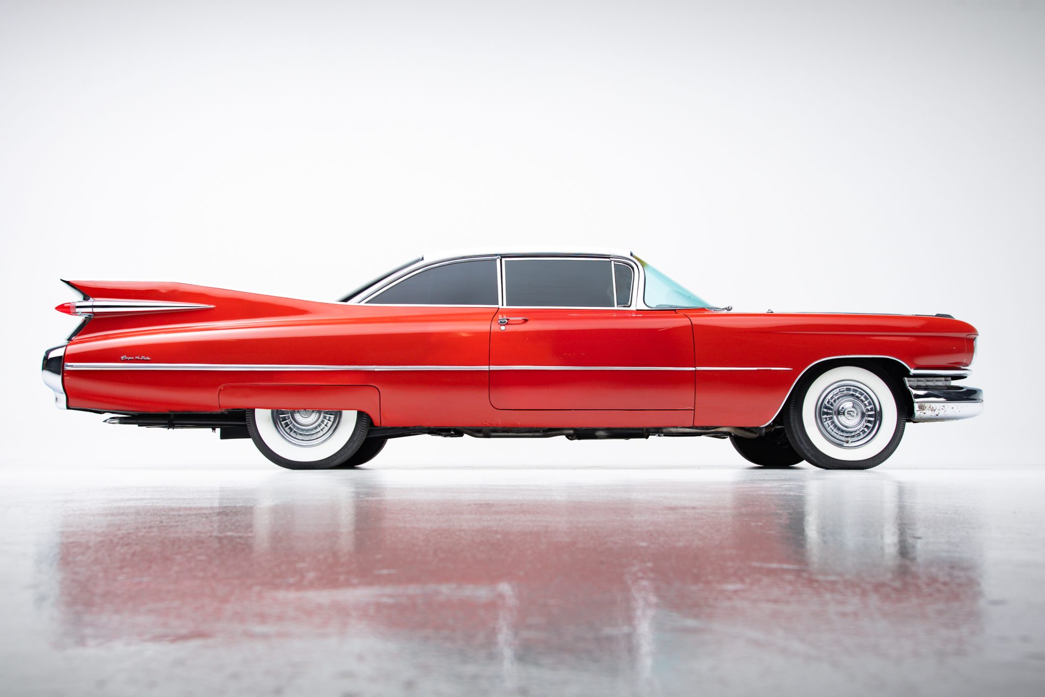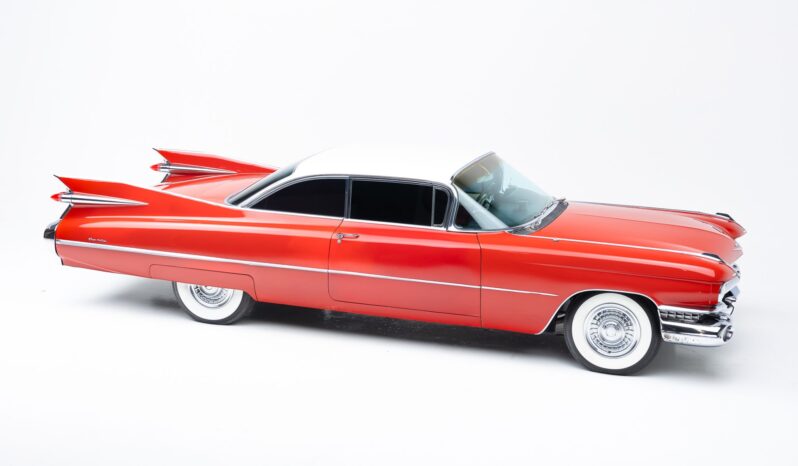 This 1959 Cadillac Coupe DeVille is powered by a 390ci V8 with Holley Sniper fuel injection, and its rear wheels are driven through a four-speed Hydra-Matic automatic transmission. The car wears a repaint in red with a white roof, and equipment includes power steering, power-assisted brakes, LED rear lighting, tinted windows, 15″ steel wheels, Cadillac-crest wheel covers, power windows, and a Cadillac-branded radio. The current owner purchased the car seven years ago out of an Arizona collection, and subsequent work has included brake service, overhauling the suspension system, and replacing the weather seals, window felts, and several window motors.