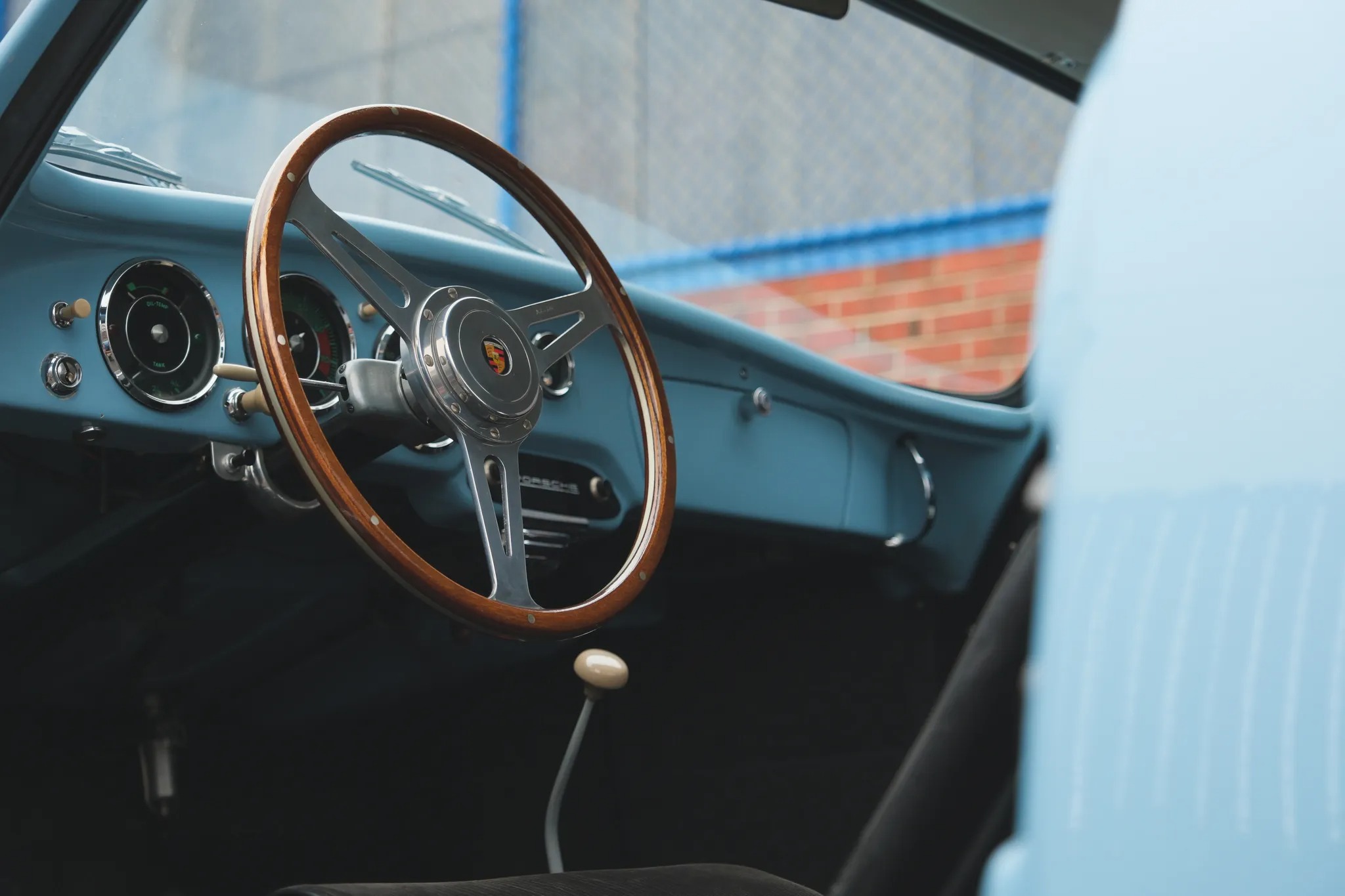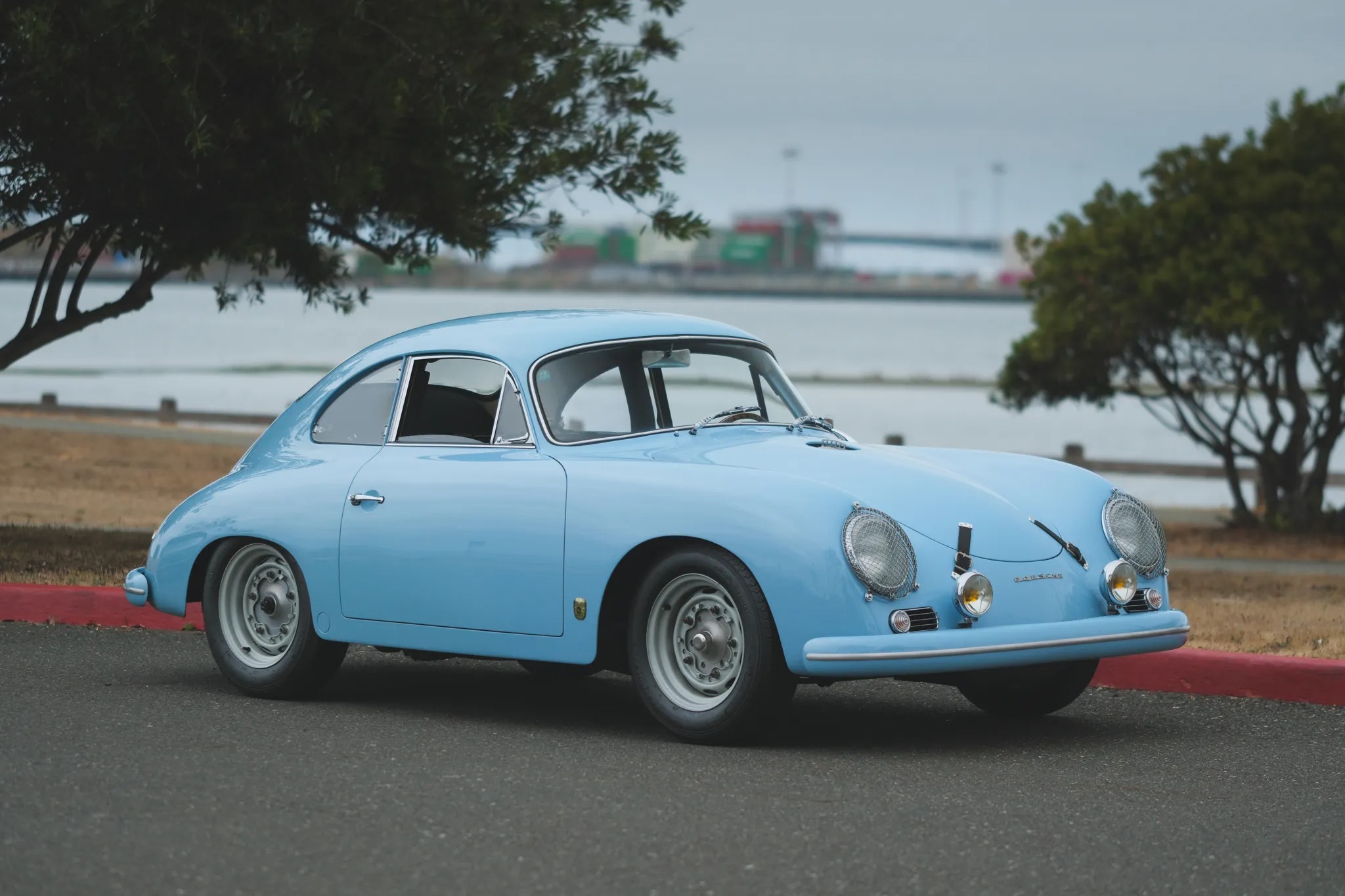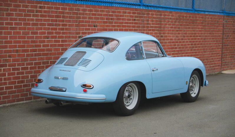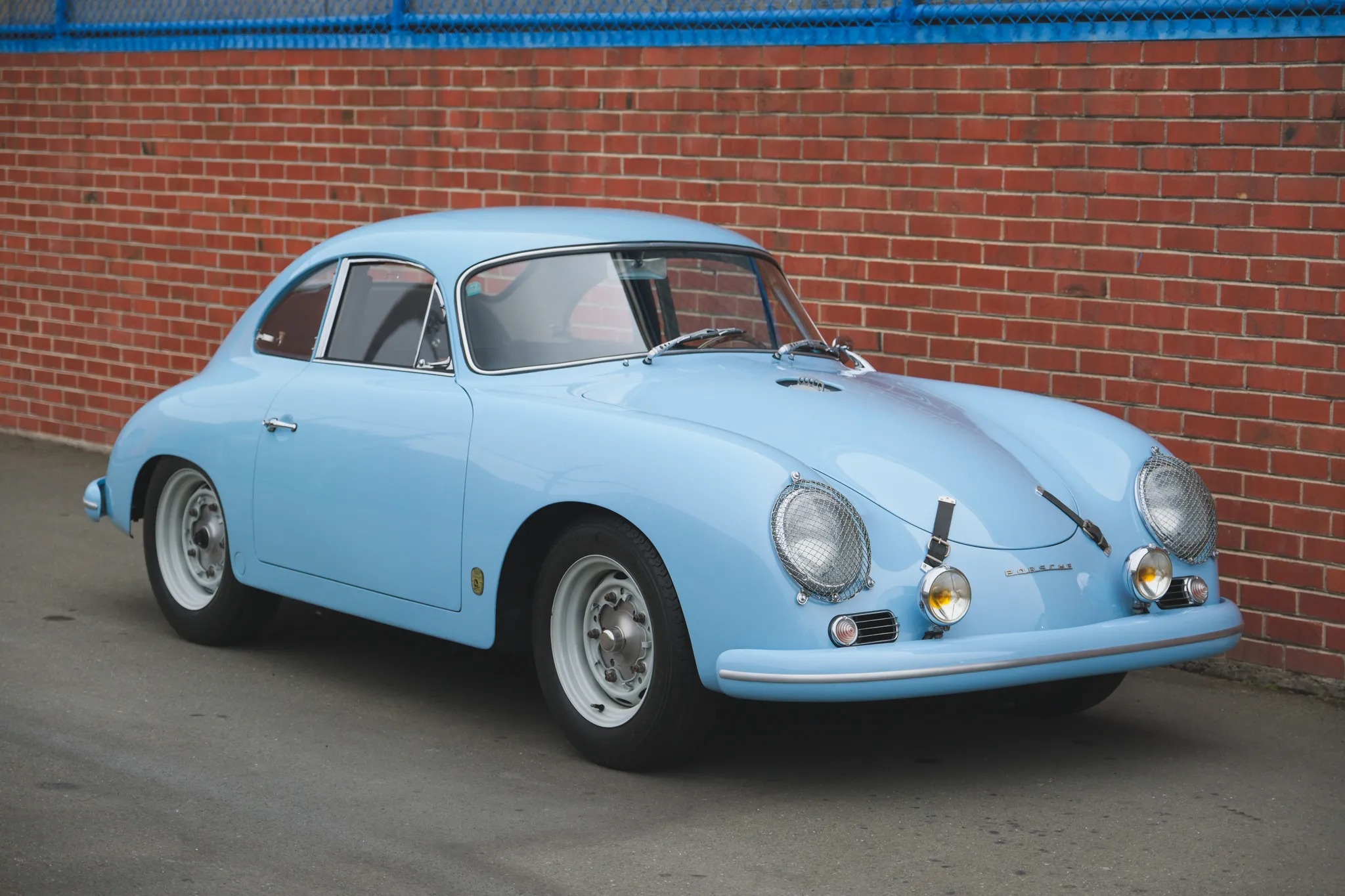This 1959 Porsche 356A coupe was refurbished and modified in the early 2000s, including a repaint in Meissen Blue and the installation of an aluminum hood and vented decklid, GT-style bumpers, Lexan side windows, and a Le Mans-style fuel filler. Power is supplied by a replacement 1,720cc flat-four fitted with twin-plug cylinder heads and upgraded internals linked with a four-speed manual transaxle. Front disc brakes and Koni shocks were also added, and additional modifications include a roll bar, low-back bucket seats with harnesses, leather hood straps, mesh headlamp covers, Marchal driving lamps, and 15″ alloy wide-five wheels