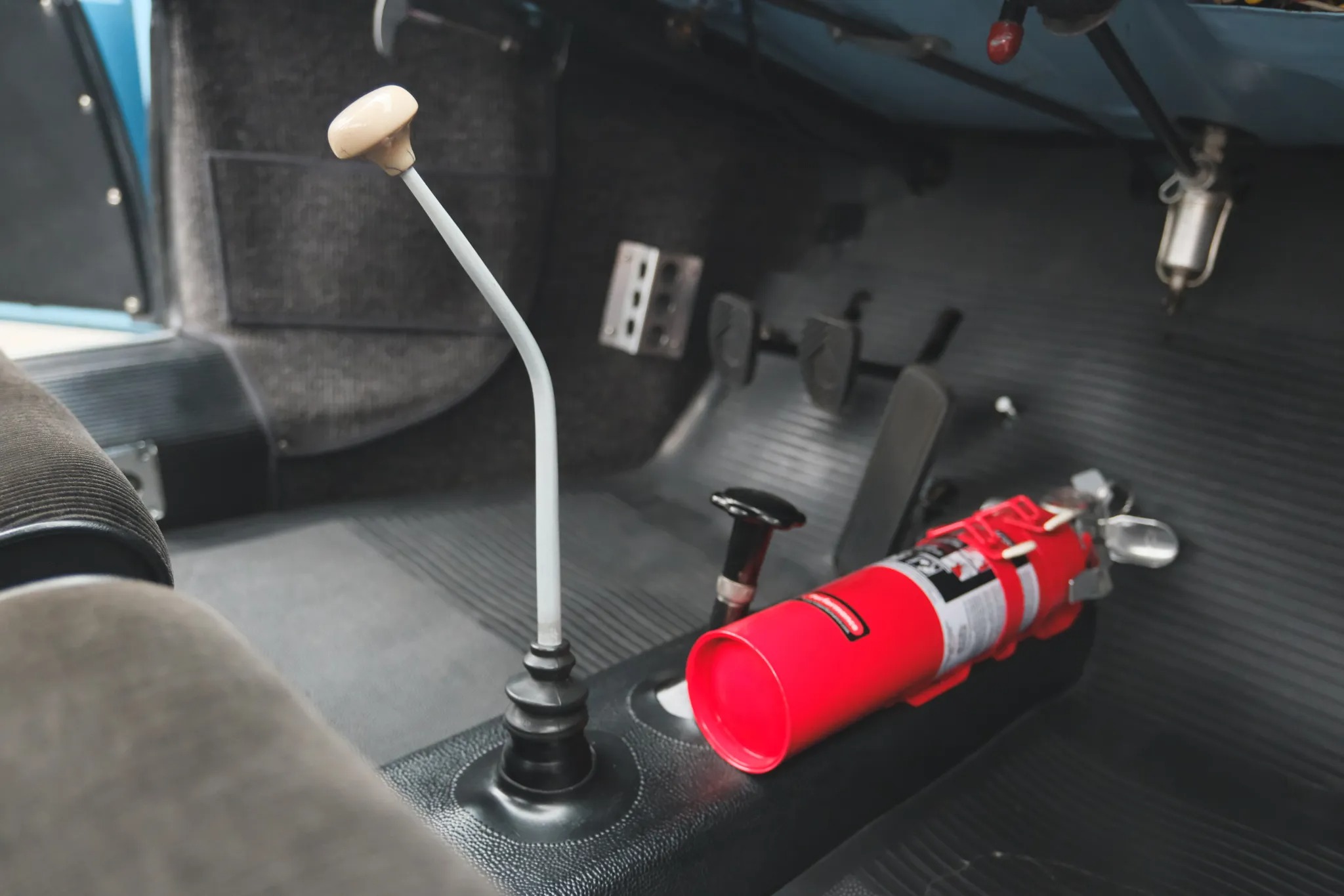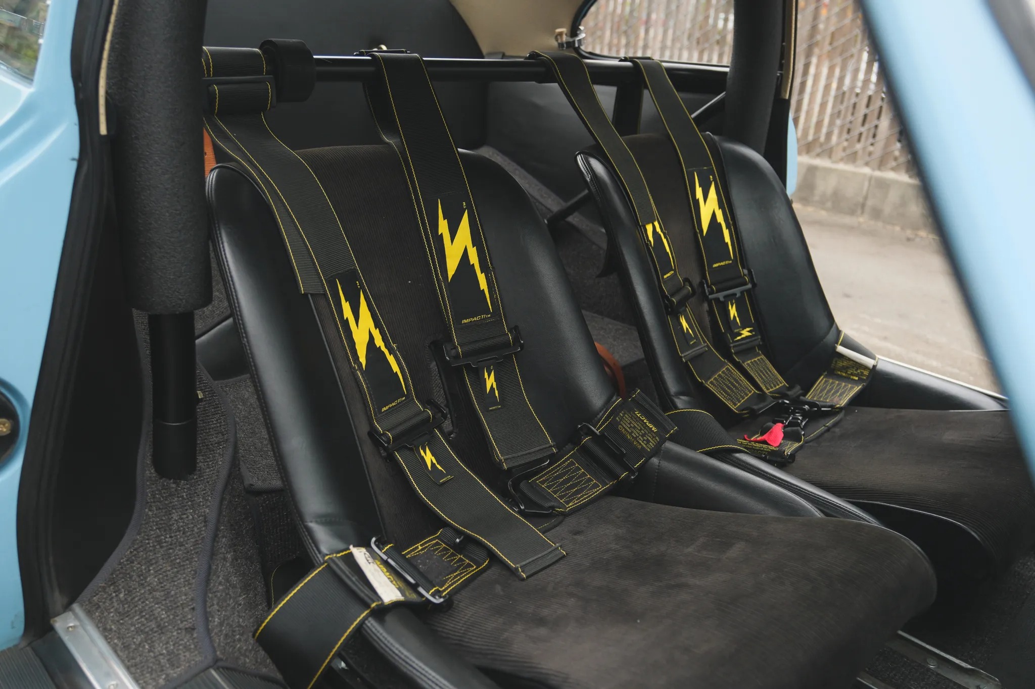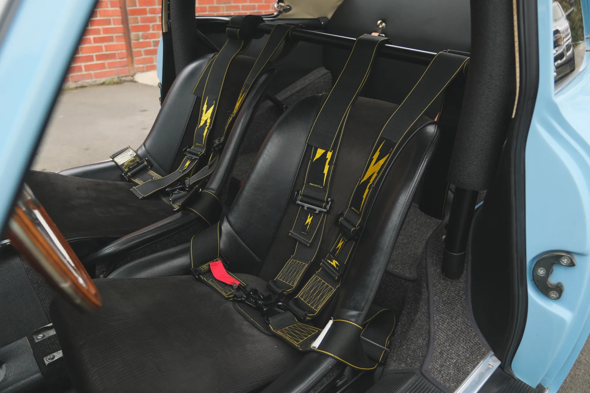This 1959 Porsche 356A coupe was refurbished and modified in the early 2000s, including a repaint in Meissen Blue and the installation of an aluminum hood and vented decklid, GT-style bumpers, Lexan side windows, and a Le Mans-style fuel filler. Power is supplied by a replacement 1,720cc flat-four fitted with twin-plug cylinder heads and upgraded internals linked with a four-speed manual transaxle. Front disc brakes and Koni shocks were also added, and additional modifications include a roll bar, low-back bucket seats with harnesses, leather hood straps, mesh headlamp covers, Marchal driving lamps, and 15″ alloy wide-five wheels