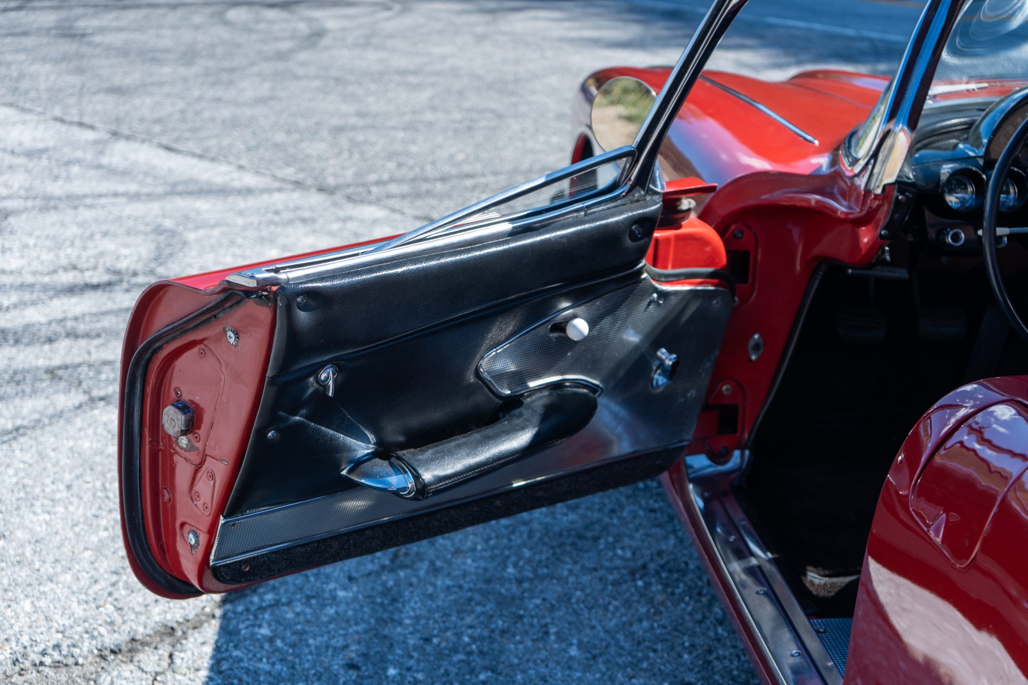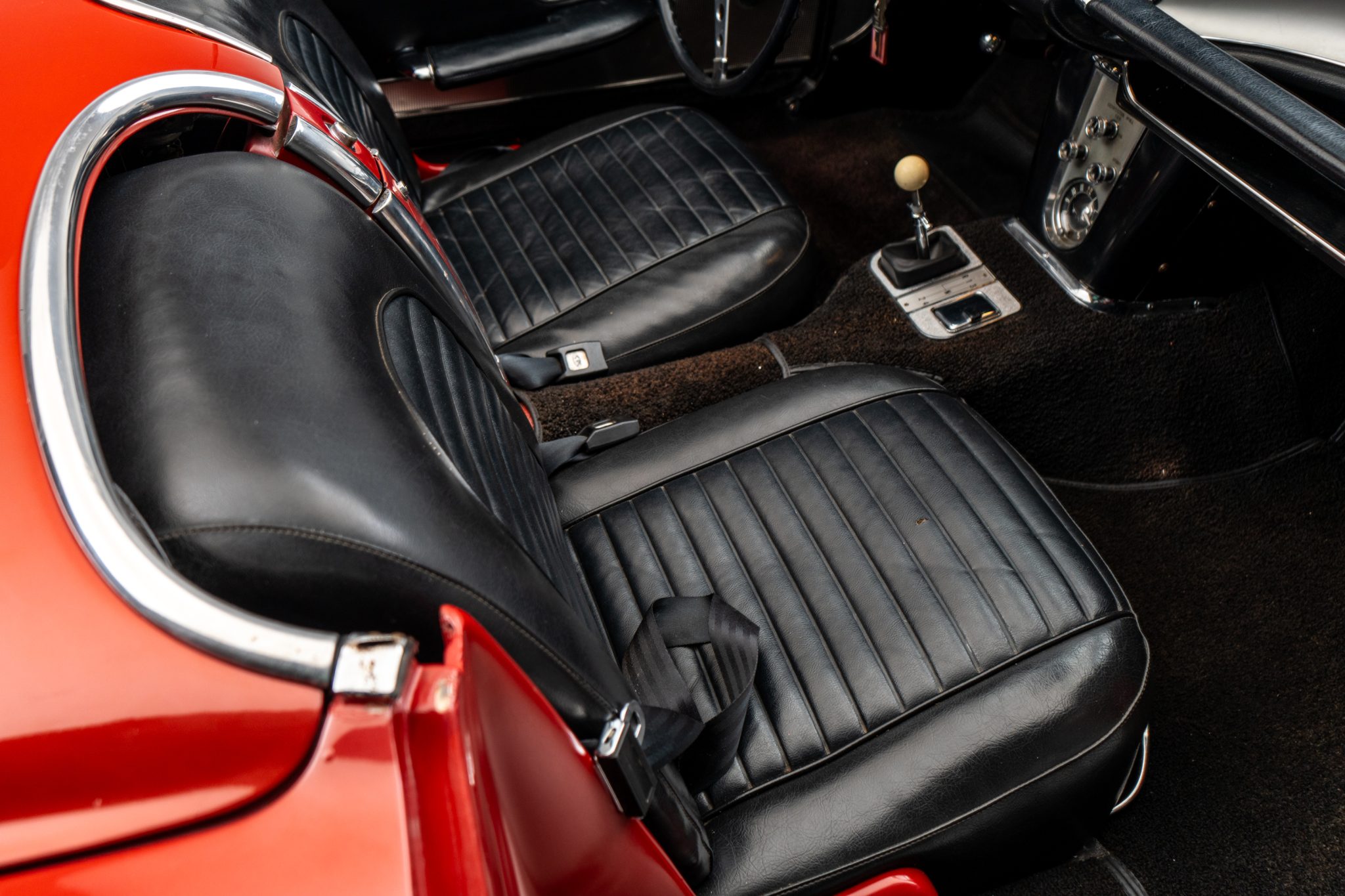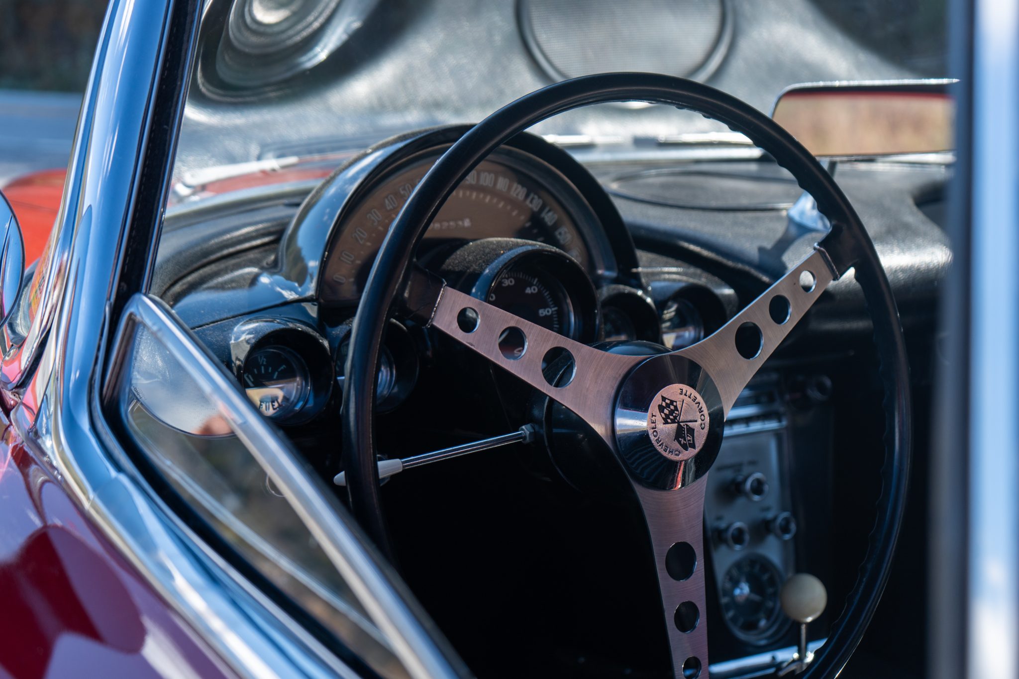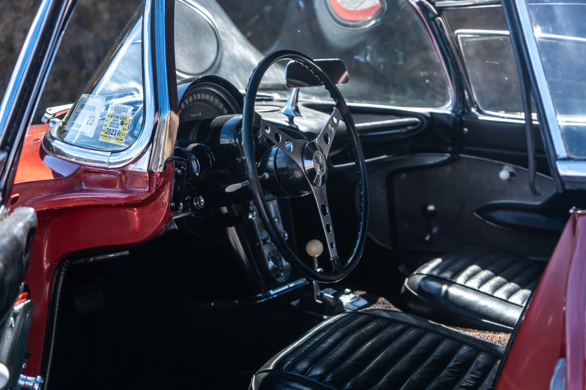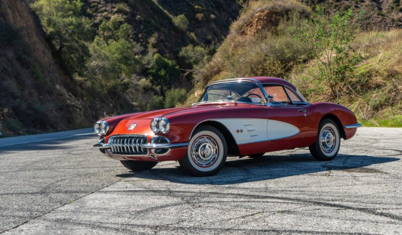 This 1960 Chevrolet Corvette was fitted with a replacement 283ci V8 and refinished in maroon Subsequent maintenance involved fluid changes and replacing the thermostat, spark plugs, motor mount bushings, fuel filter, and rear sway bar end links. Features include a black vinyl interior, a four-speed manual transmission, dual four-barrel carburetors, a removable body-color hardtop, 15″ steel wheels, windshield washers, and a dash-mounted rearview mirror