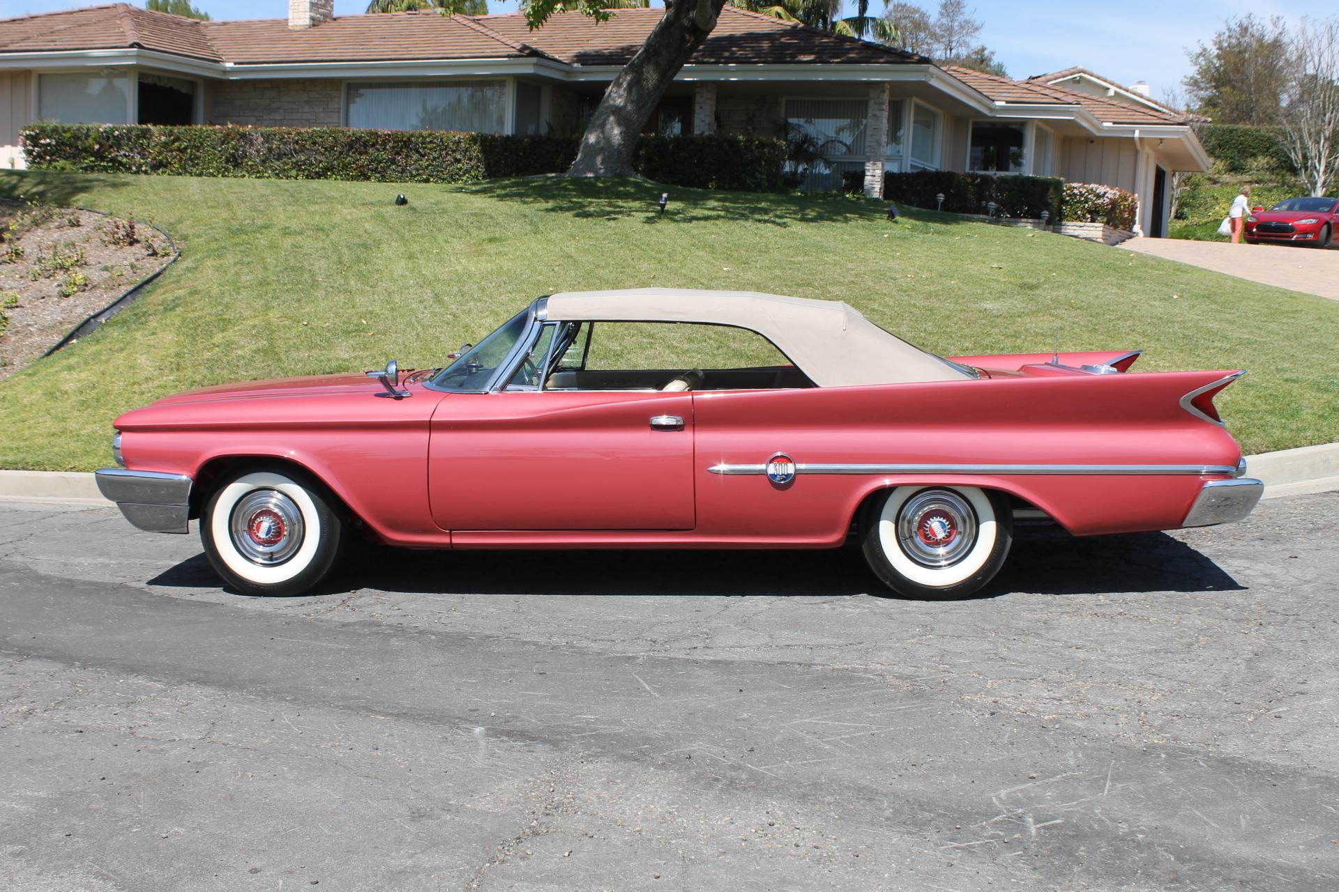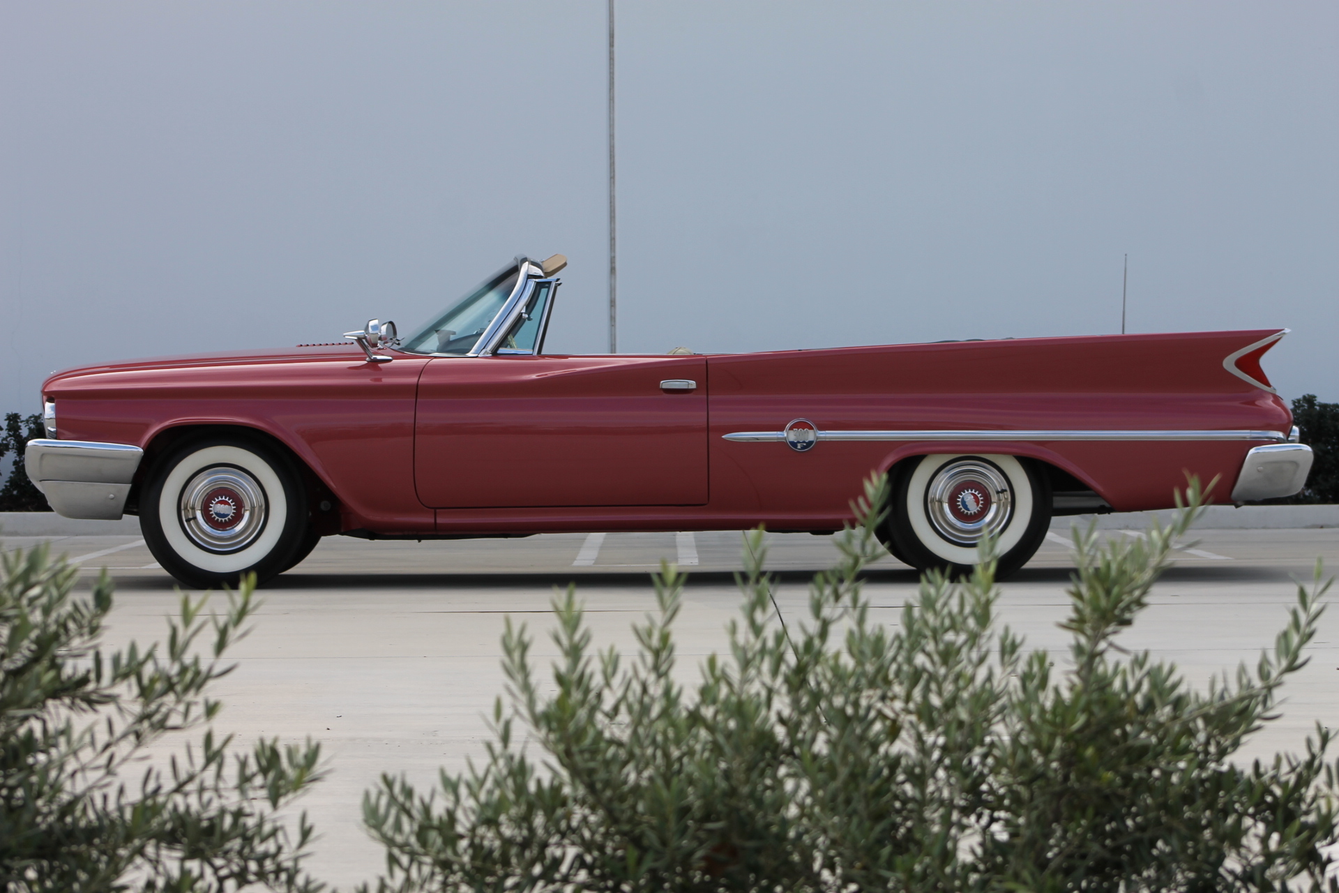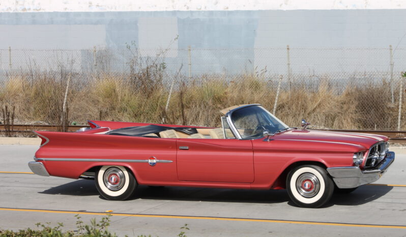 It is powered by a 413ci V8 linked with a push-button three-speed TorqueFlite automatic transmission, and it is refinished in Terra Cotta Metallic over beige leather. Equipment includes a power-operated beige convertible top, power steering, power-assisted brakes, 14″ steel wheels with chrome covers, an AstraDome instrument cluster, power-adjustable front bucket seats, power windows, an Electro Touch-Tuner AM radio, and a full-length center console with front and rear armrests.